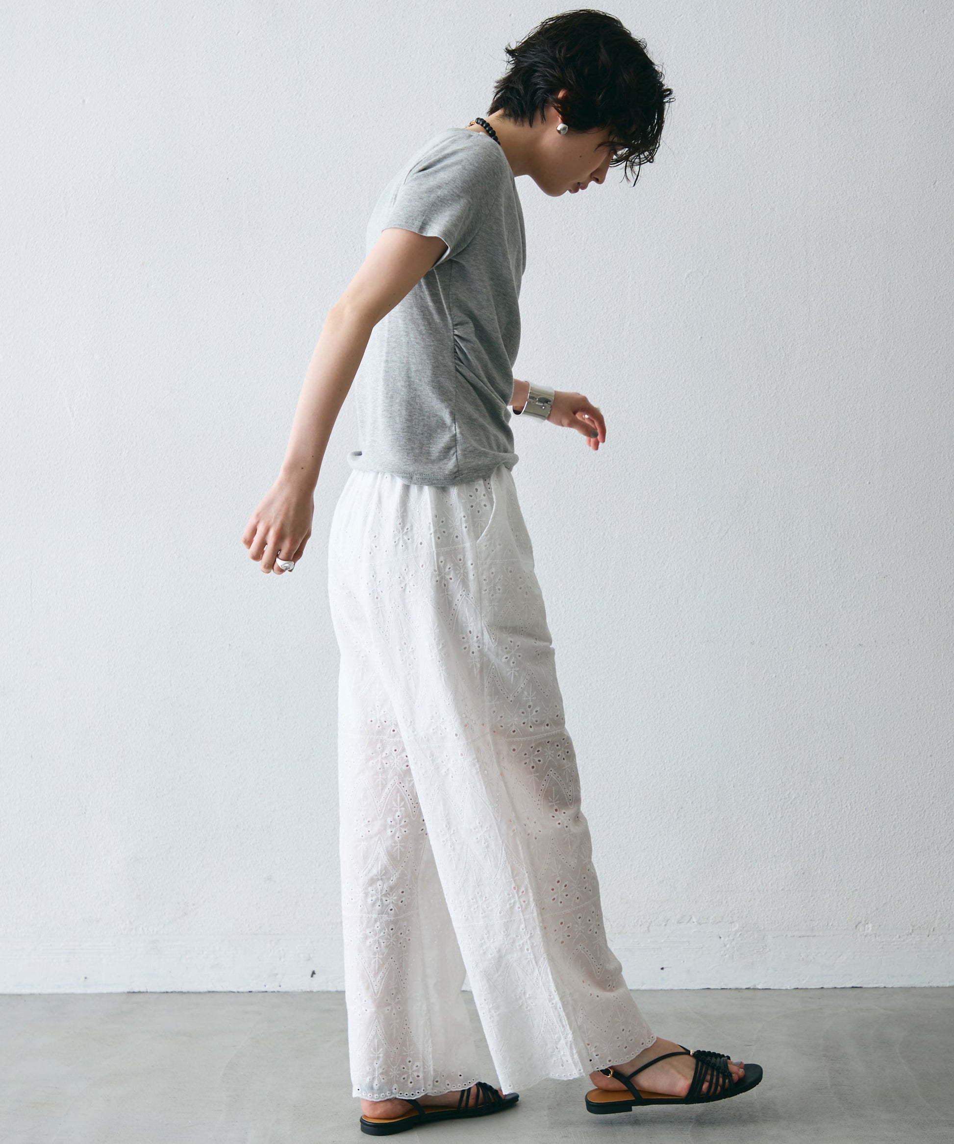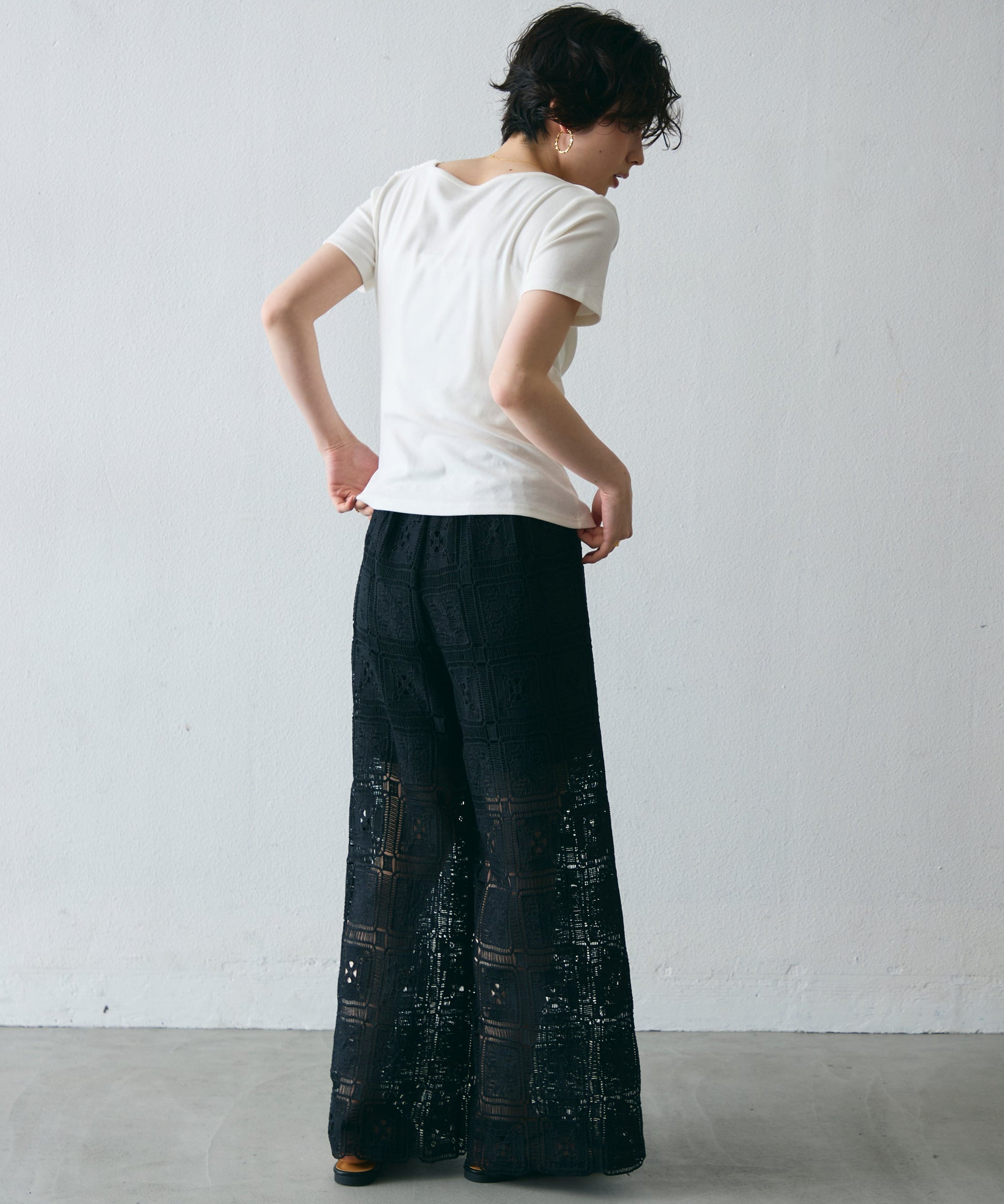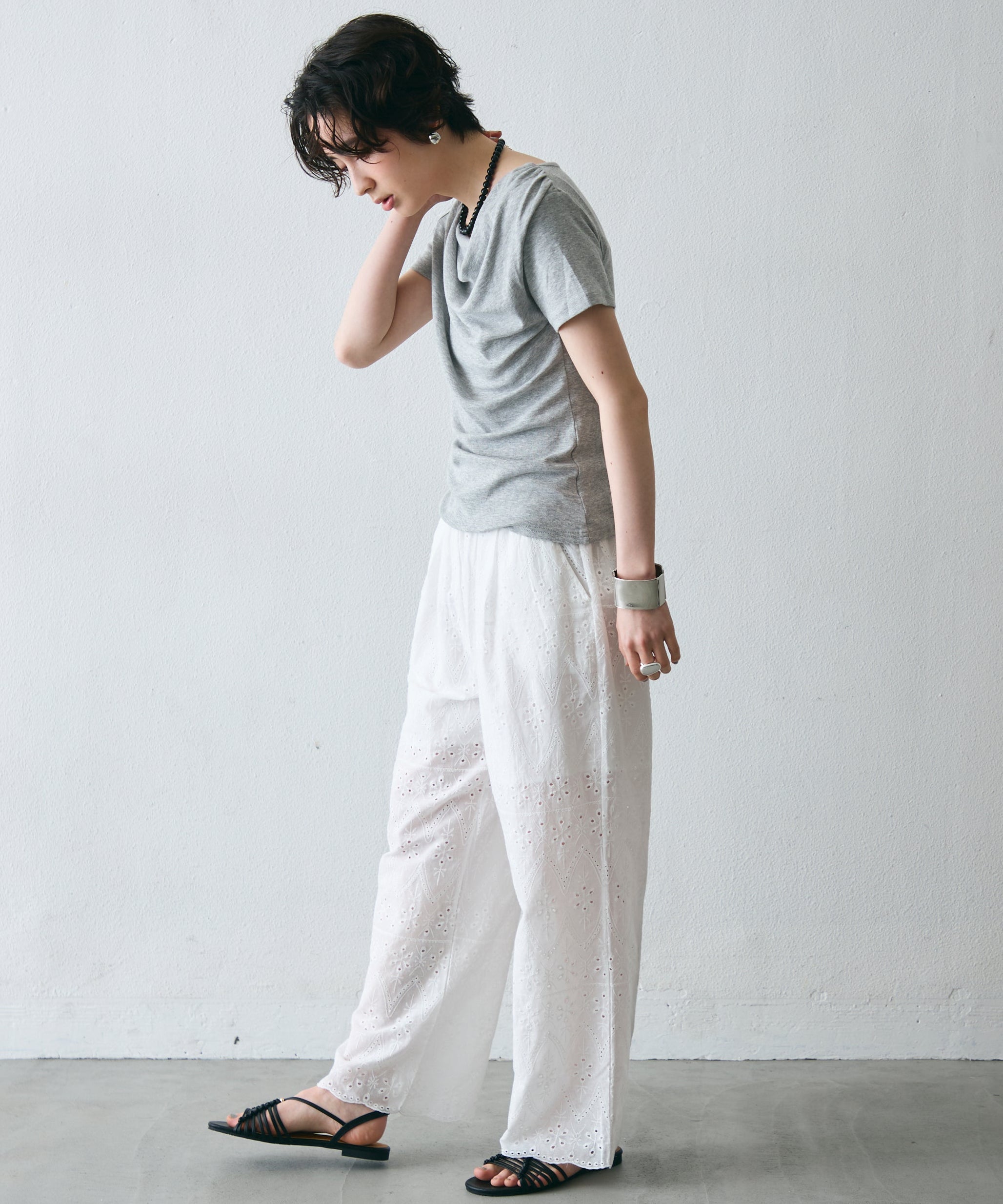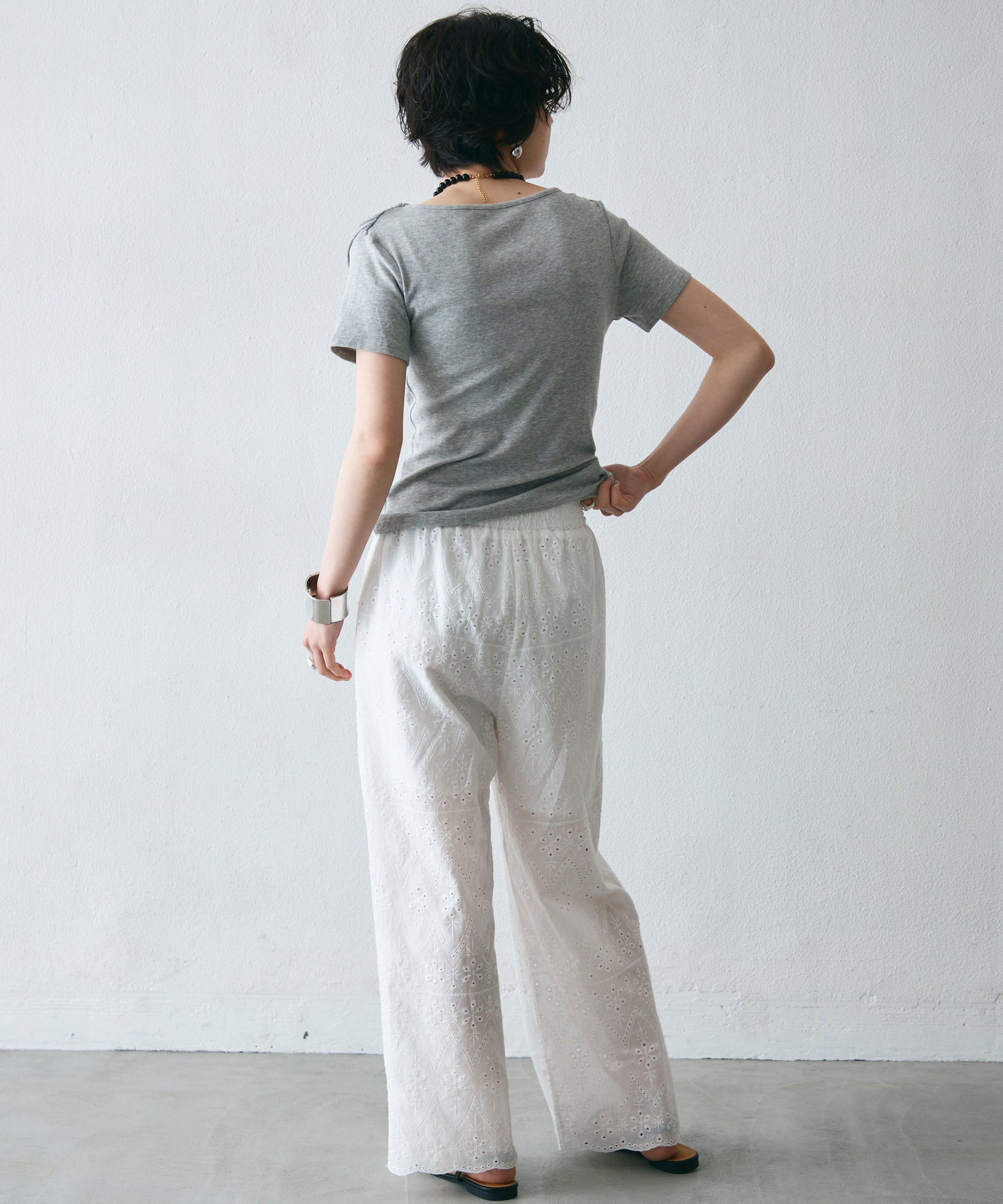 落ち感のある素材が体のラインを拾いすぎず、1枚でこなれたスタイルに。