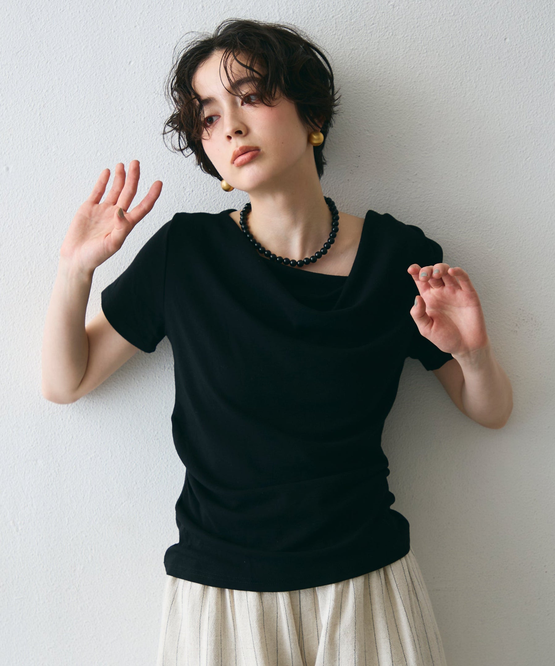 美しいドレープが上品な印象を与える半袖カットソー。