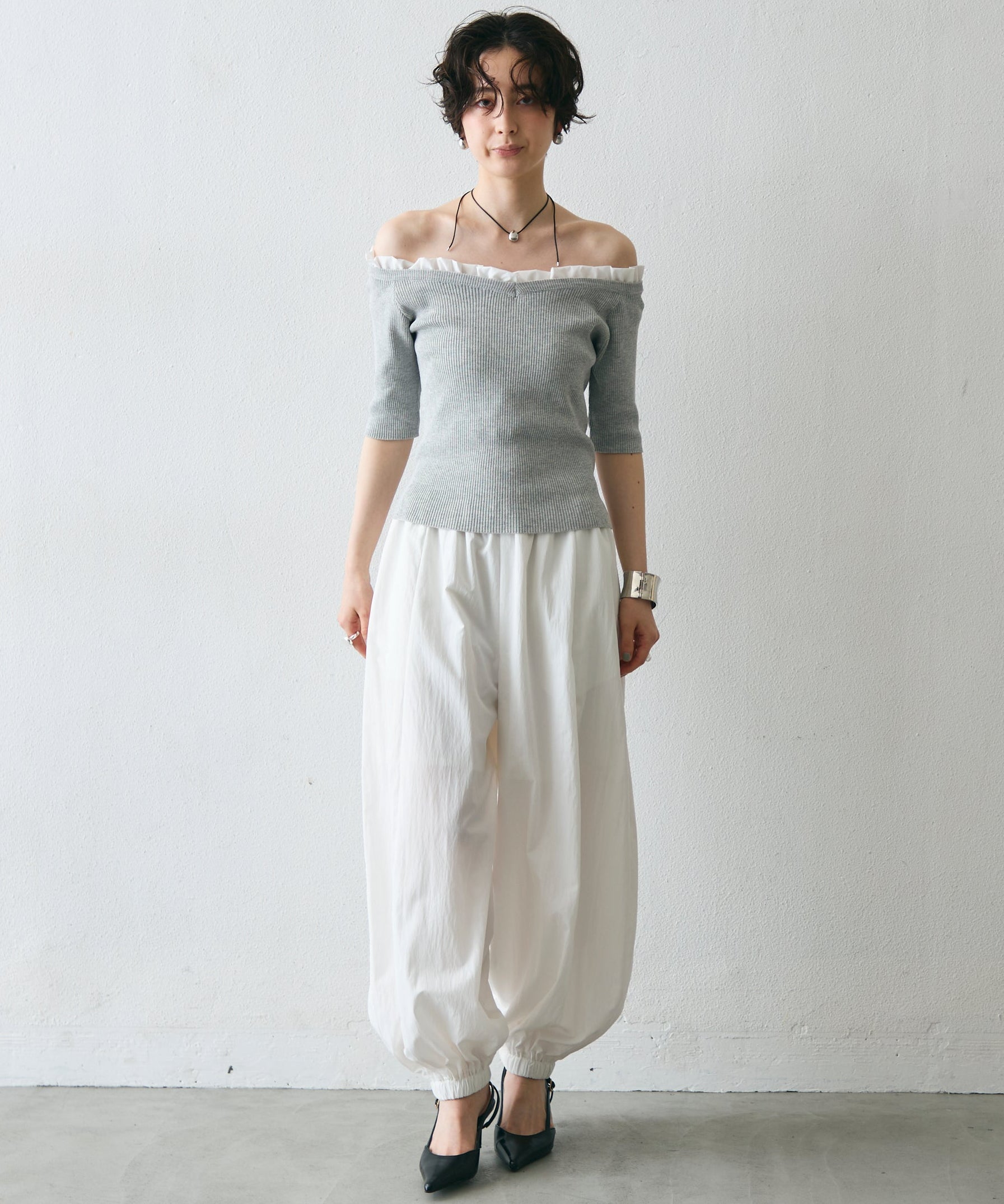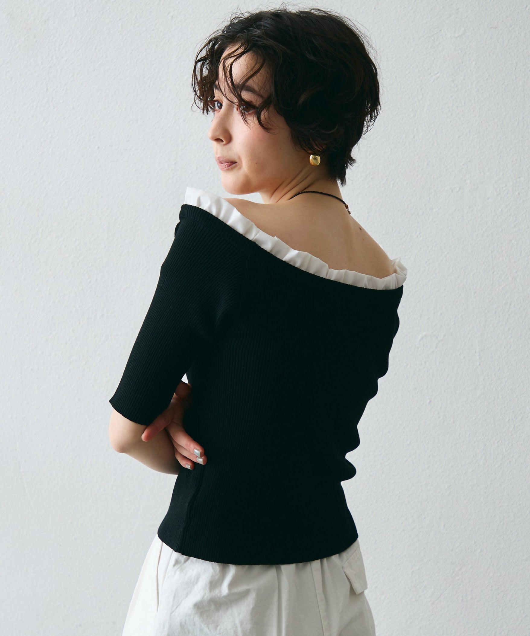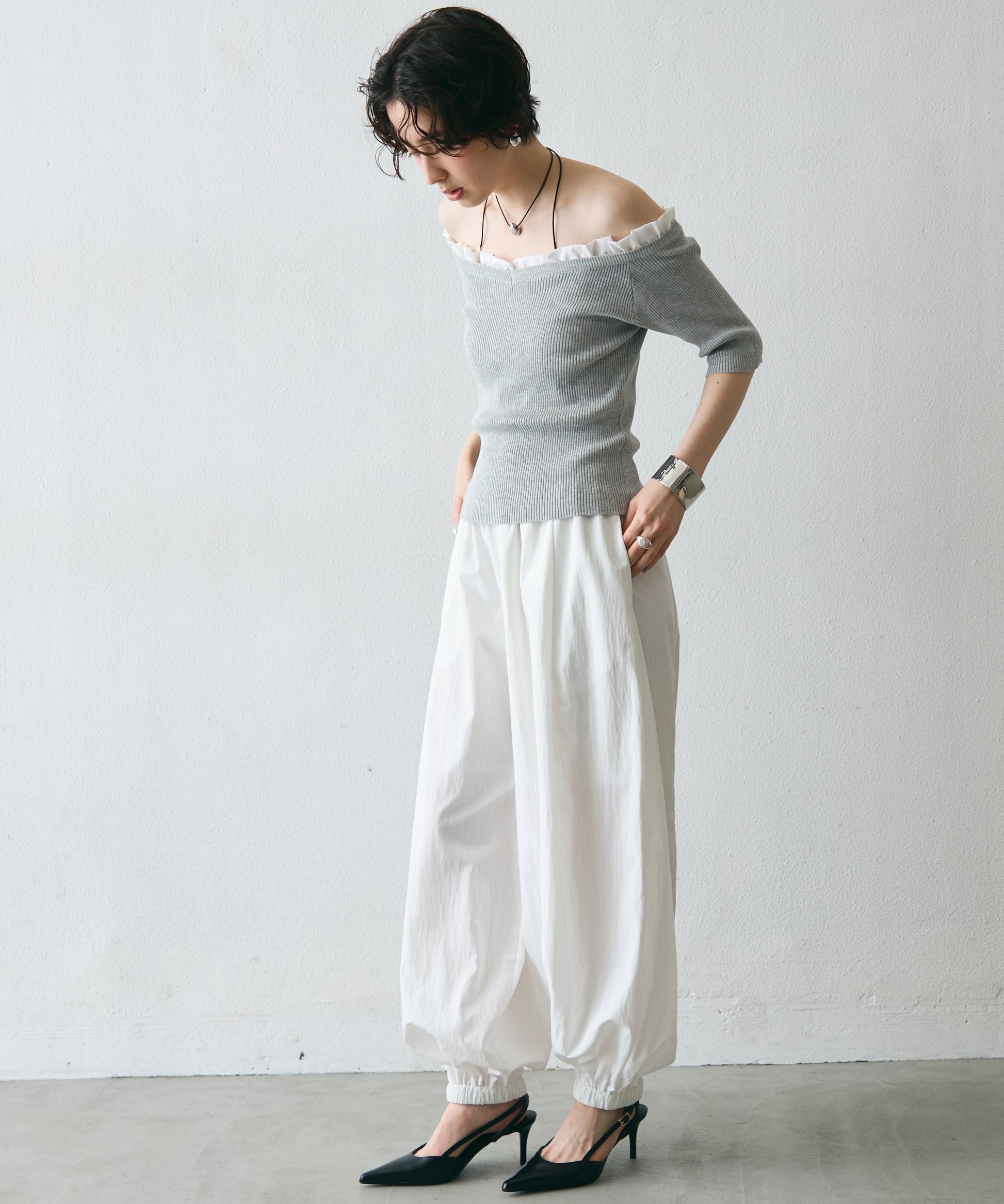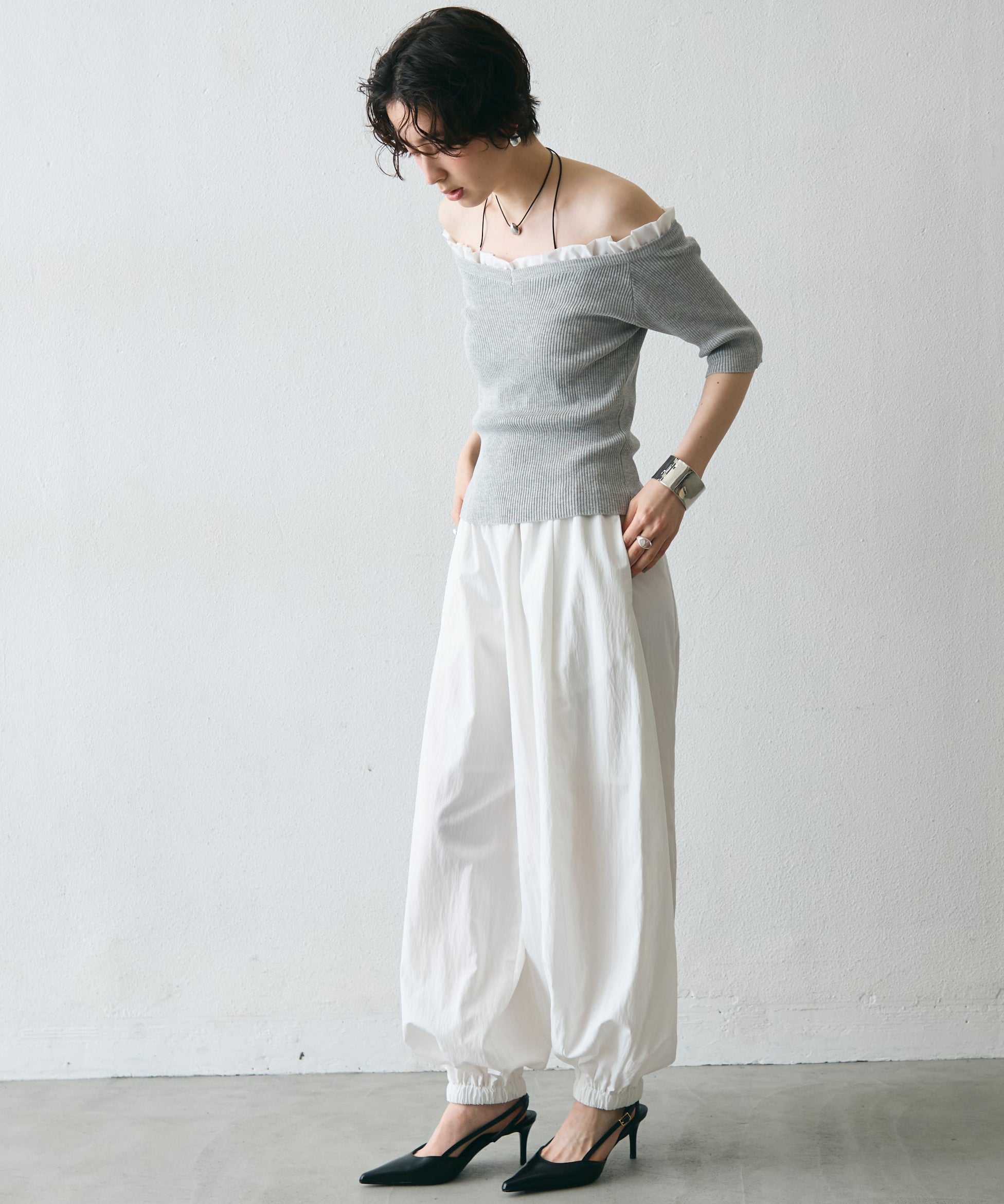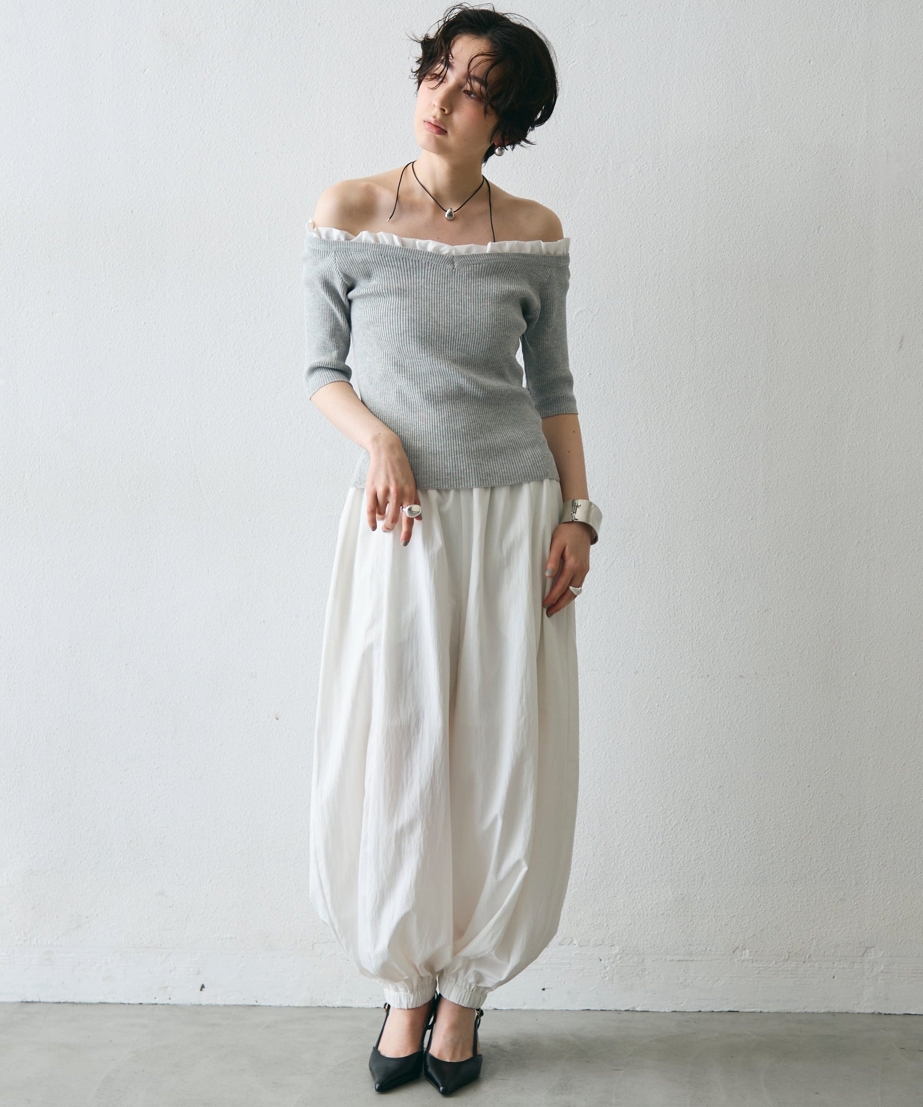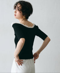 華やかなフリルが女性らしさを引き立てるオフショルプルオーバー。