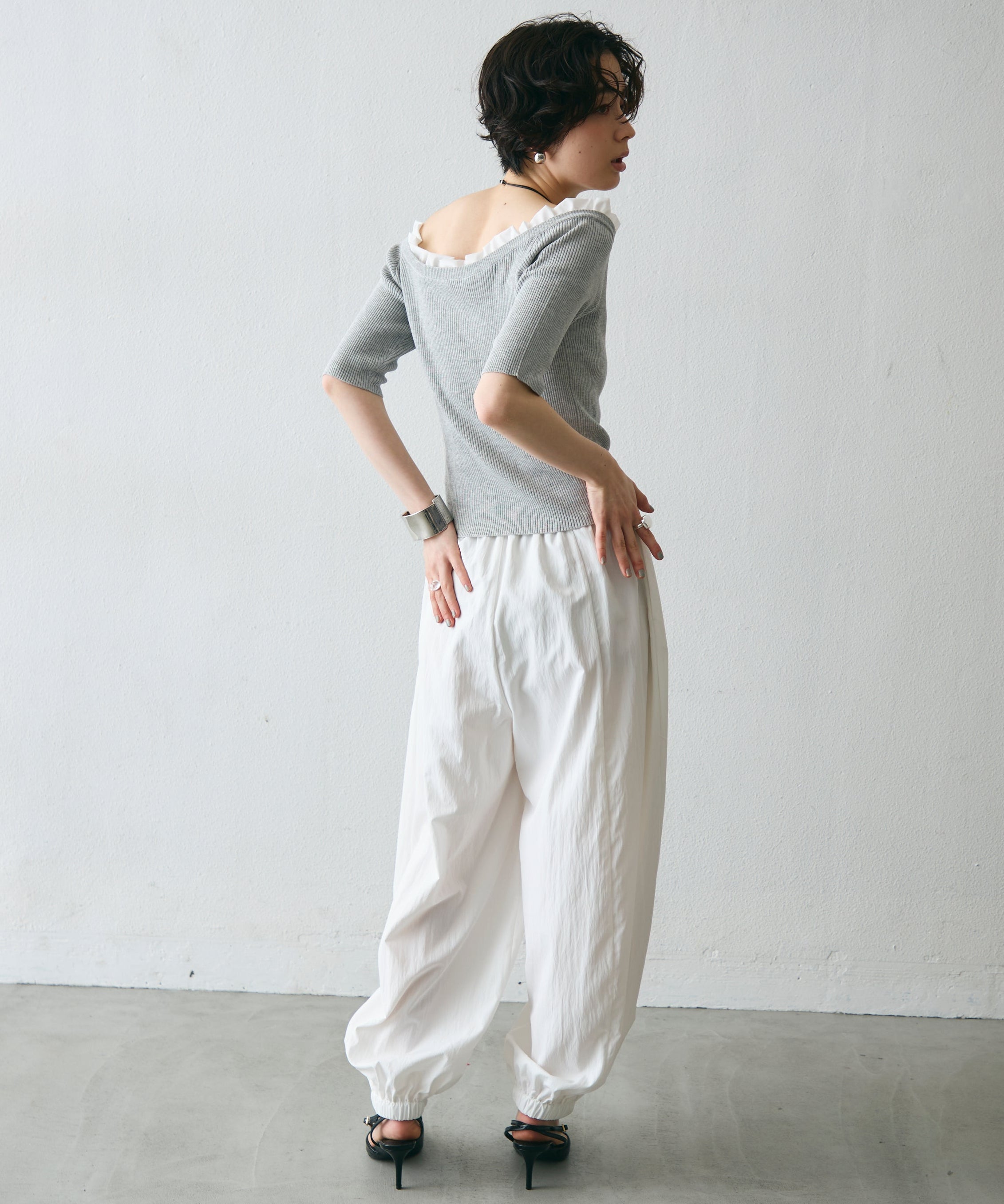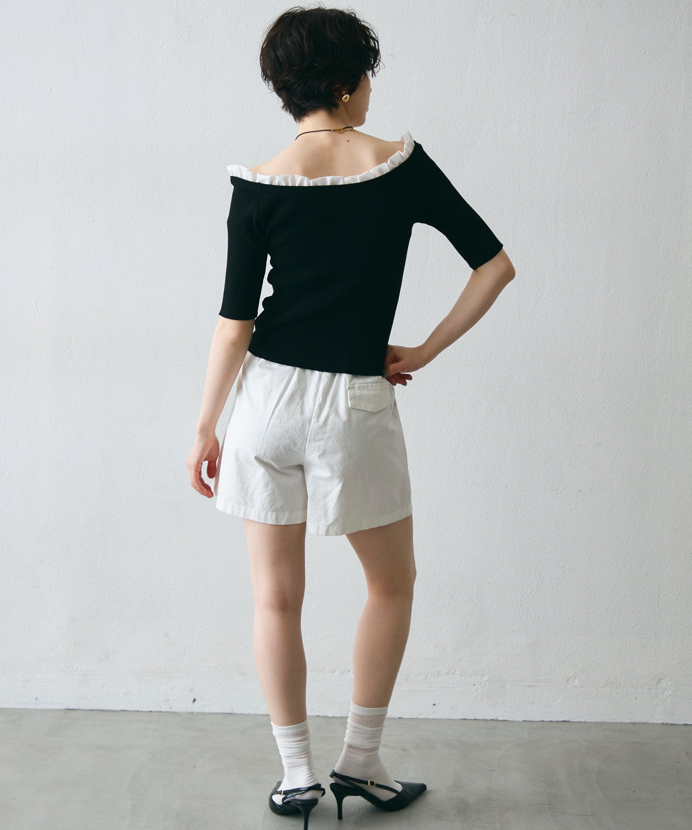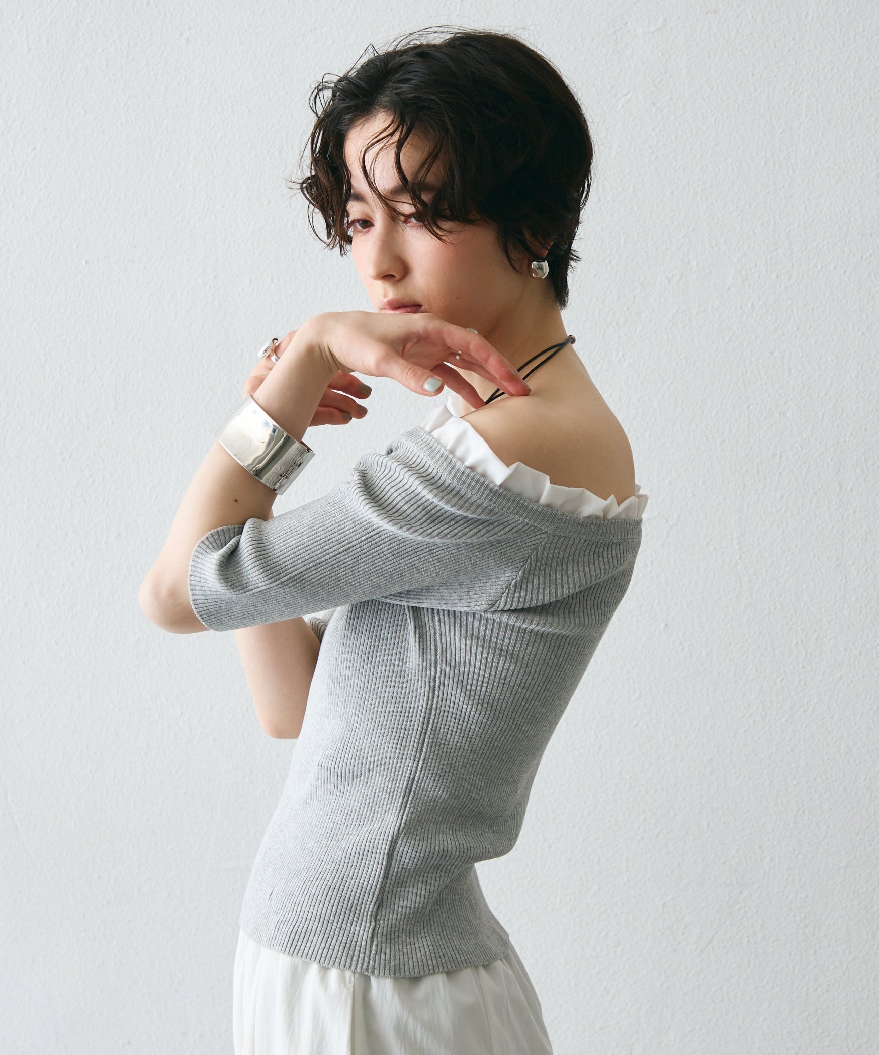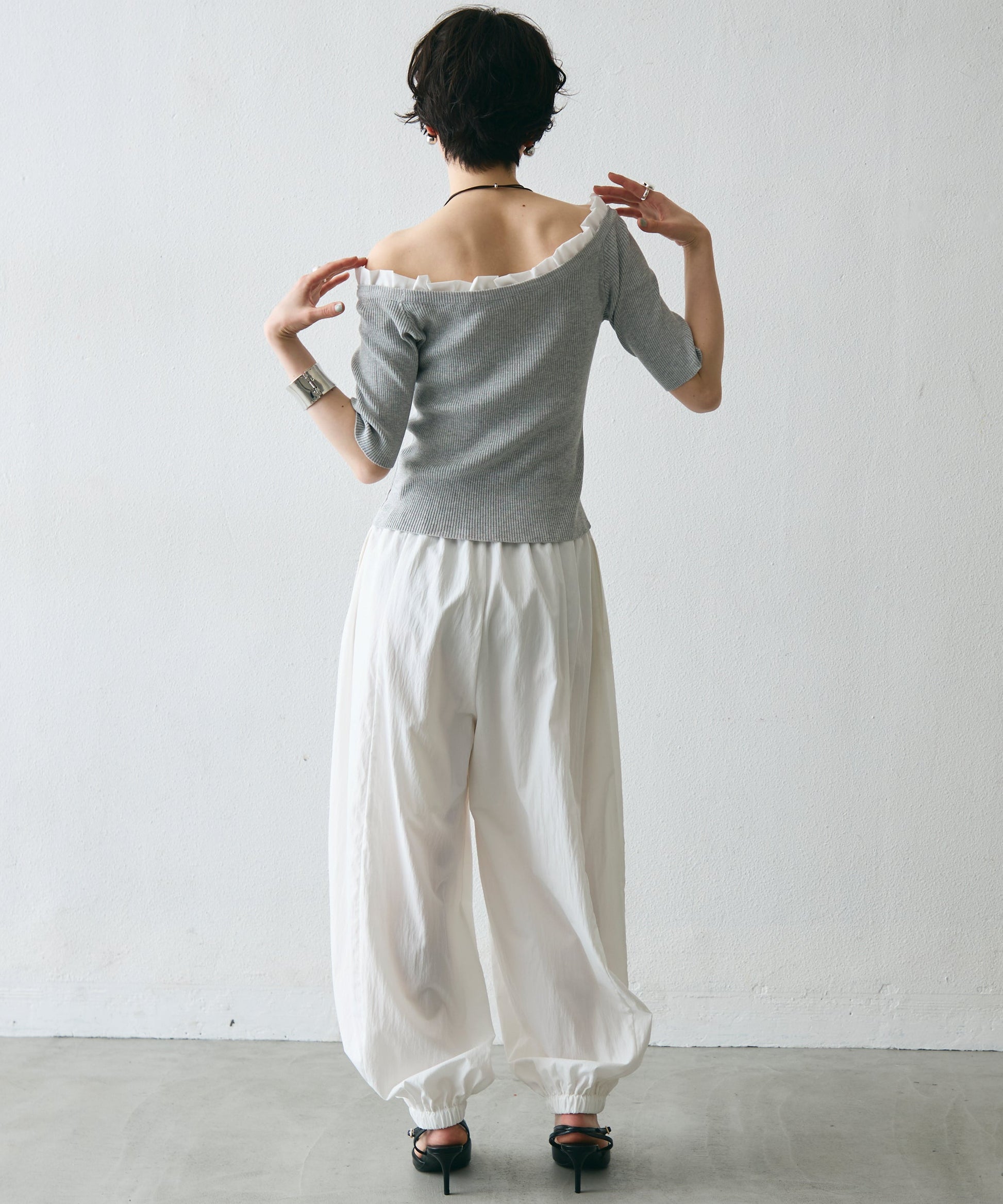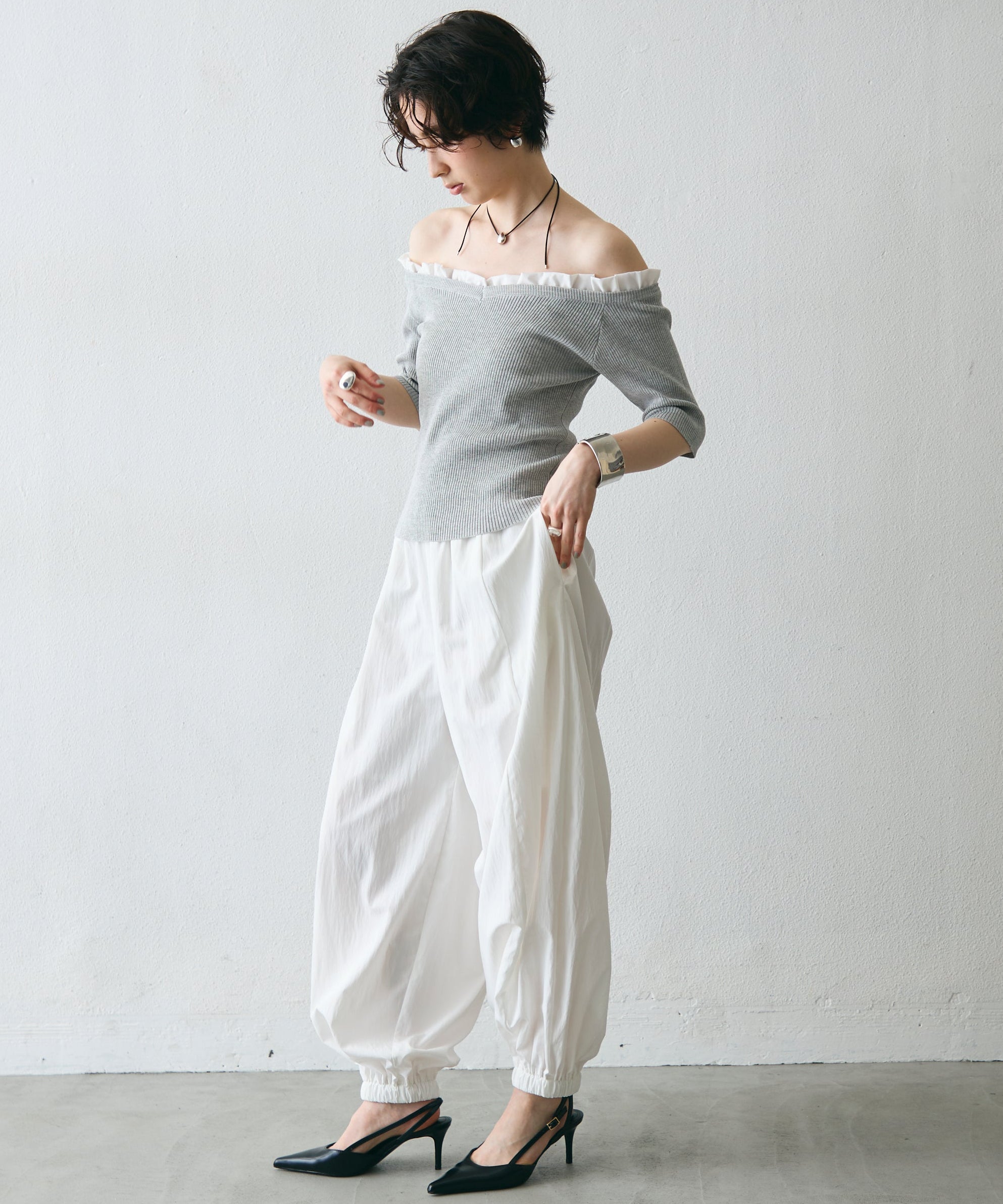華やかなフリルが女性らしさを引き立てるオフショルプルオーバー。