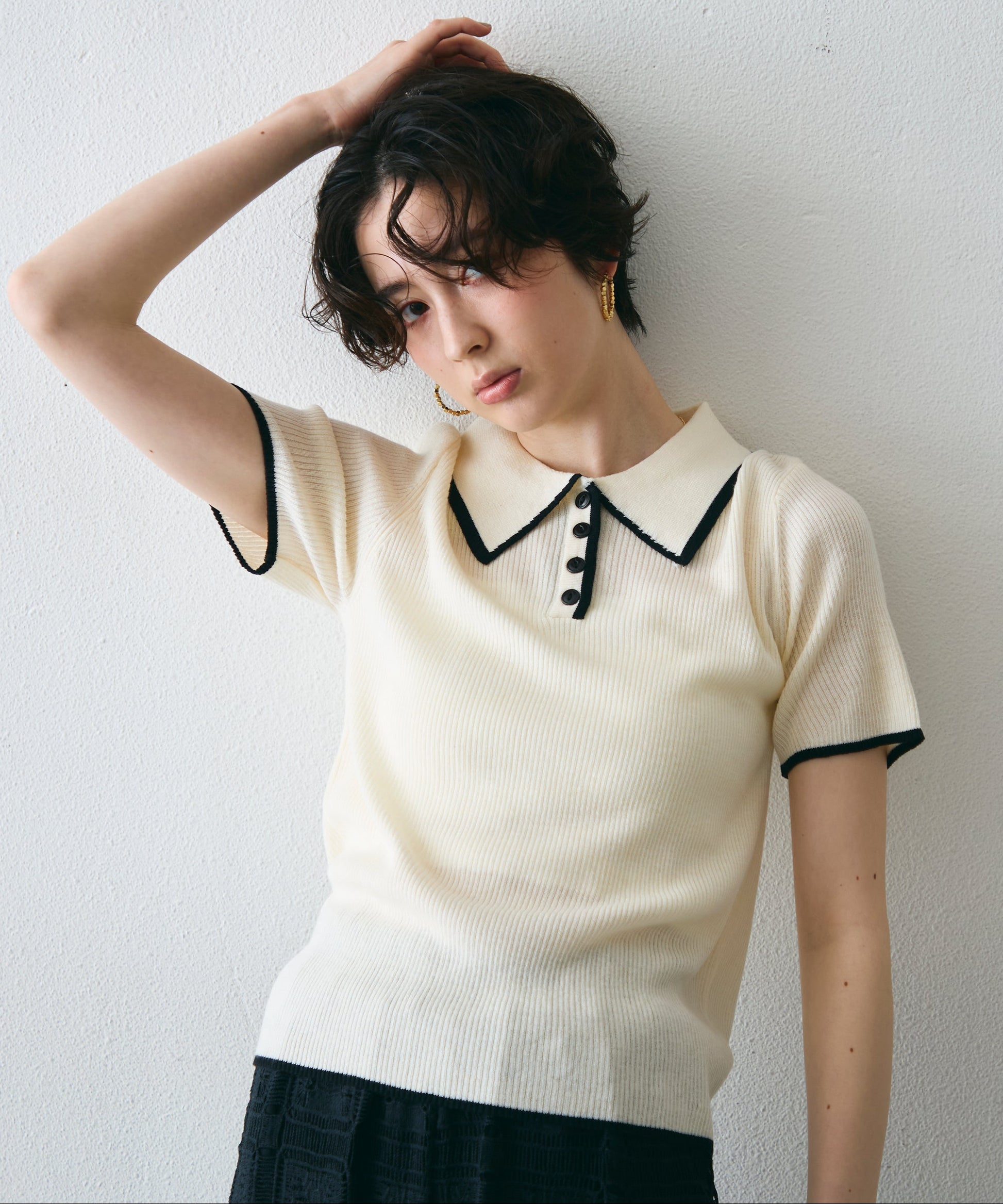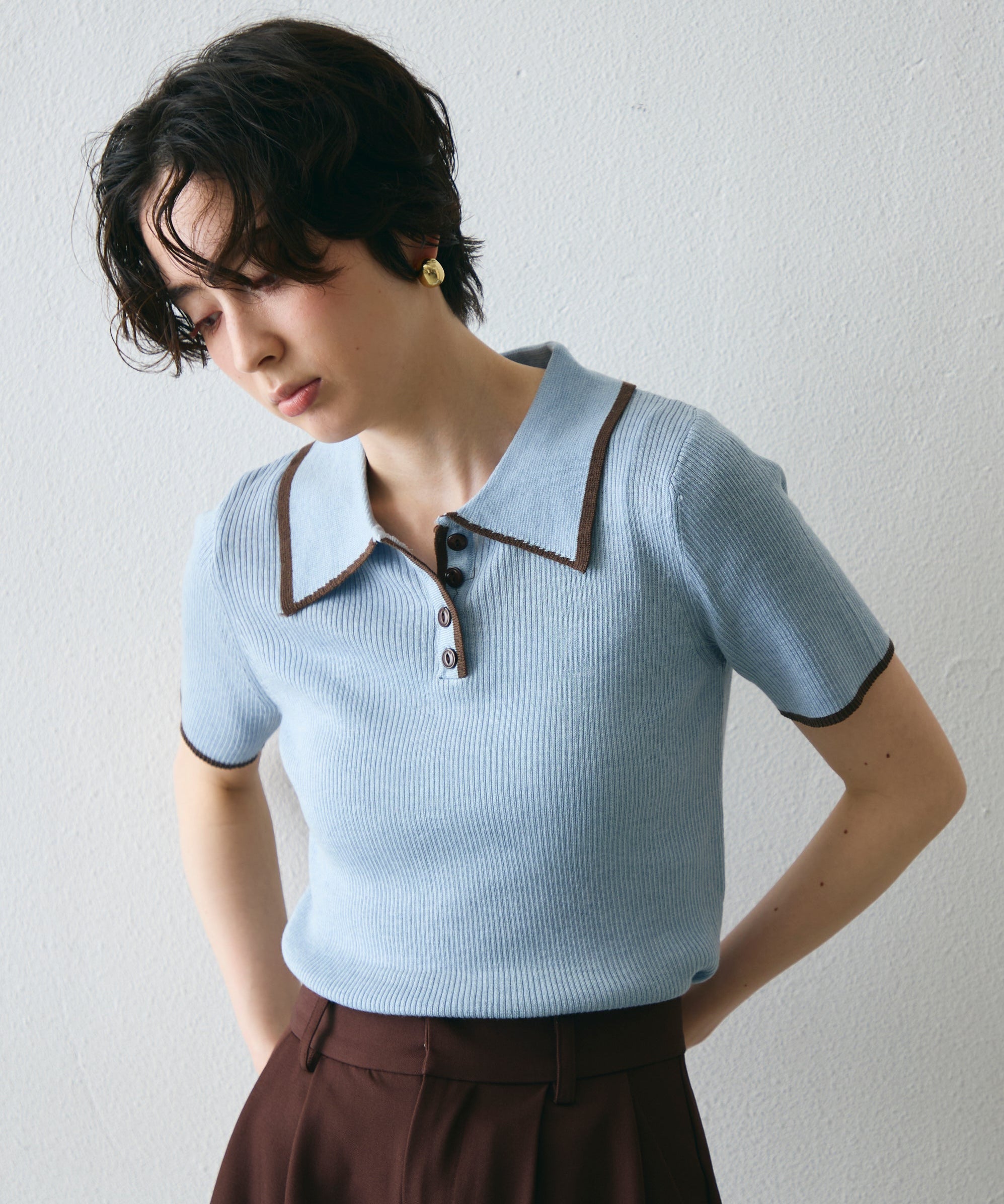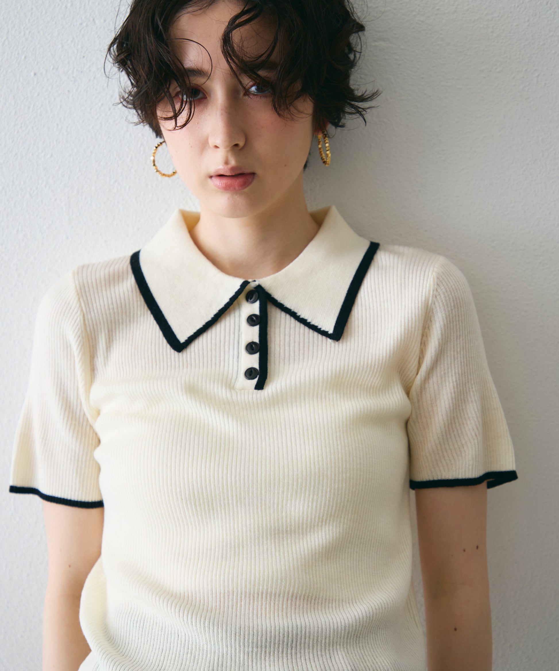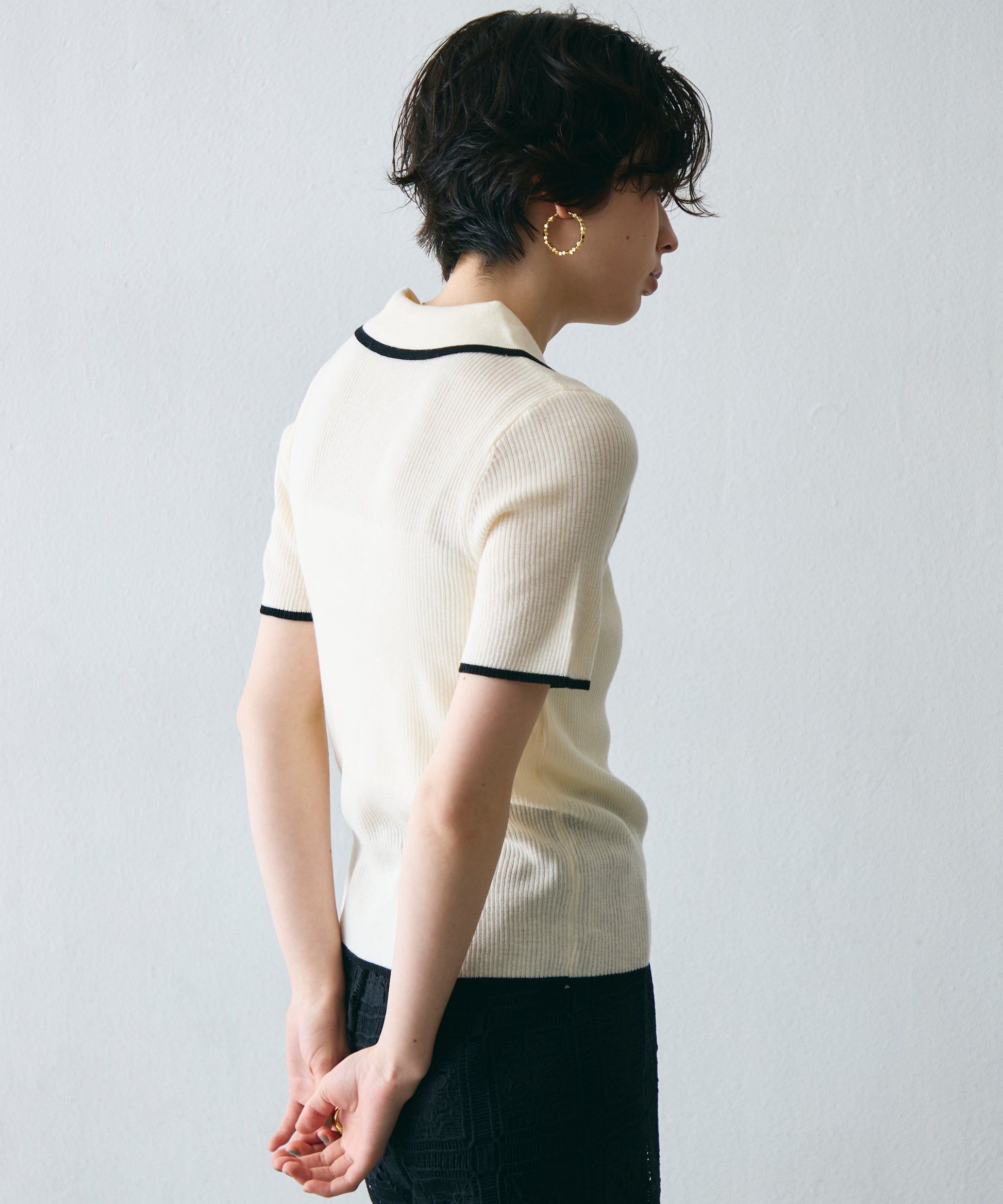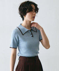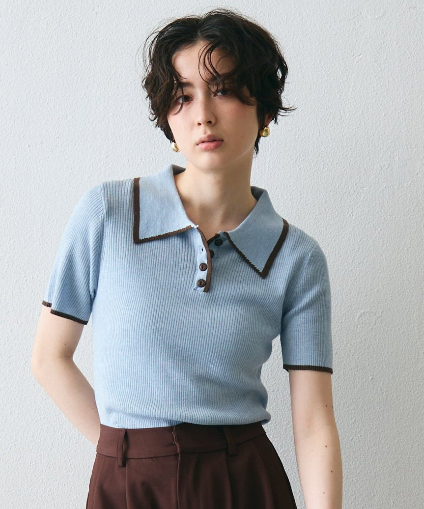 配色トリミングがアクセントになった、上品なポロ衿半袖ニット。