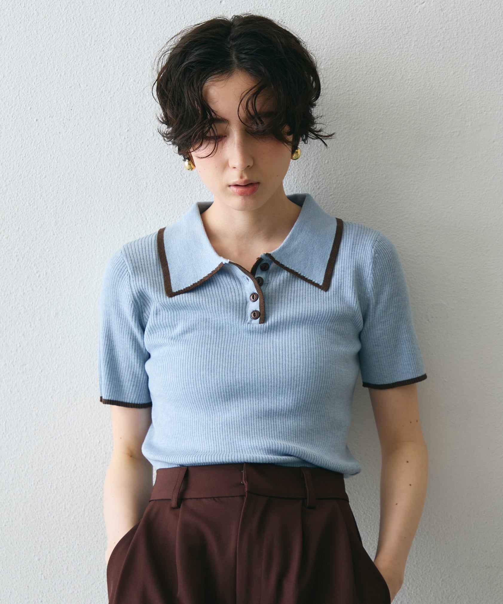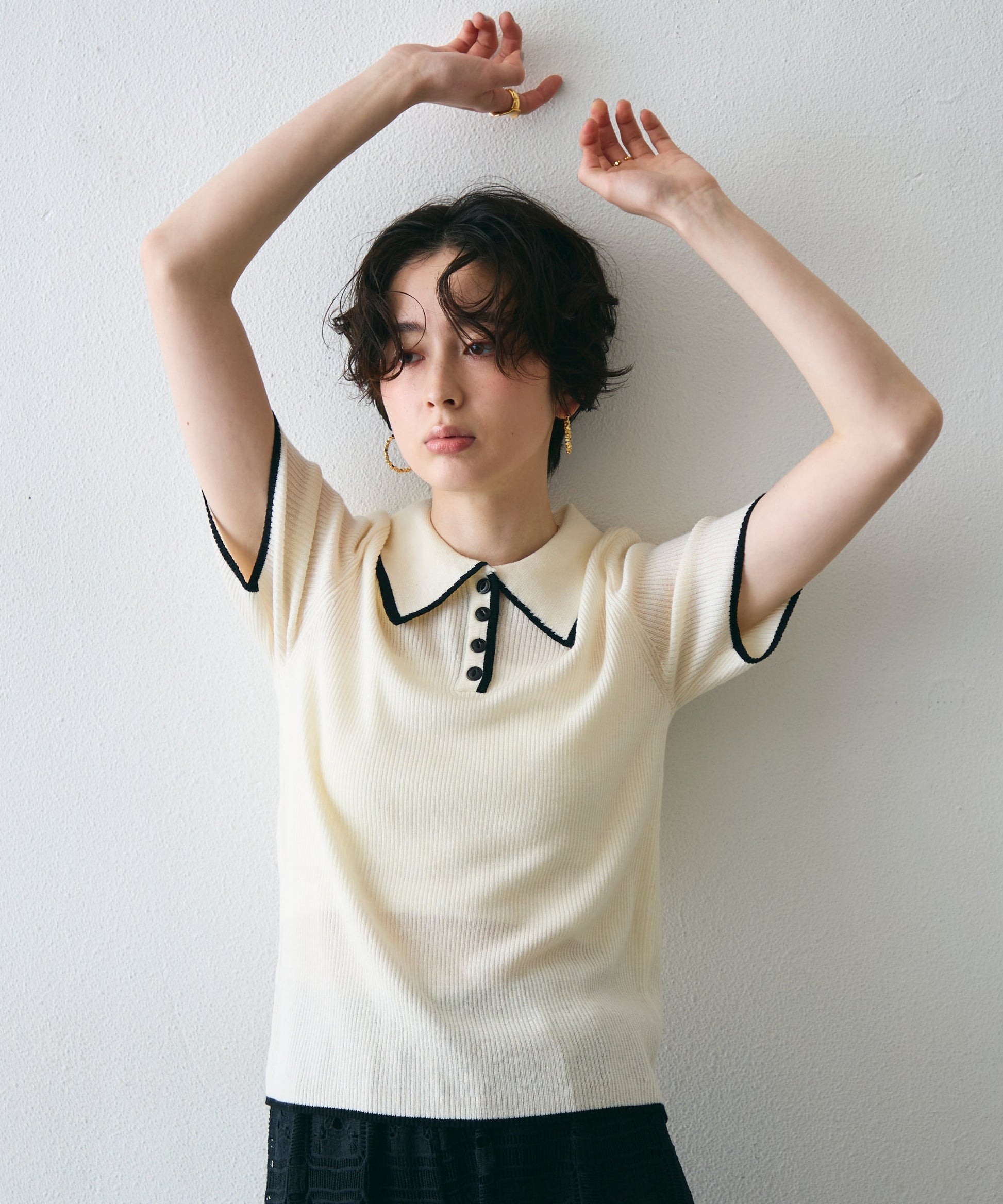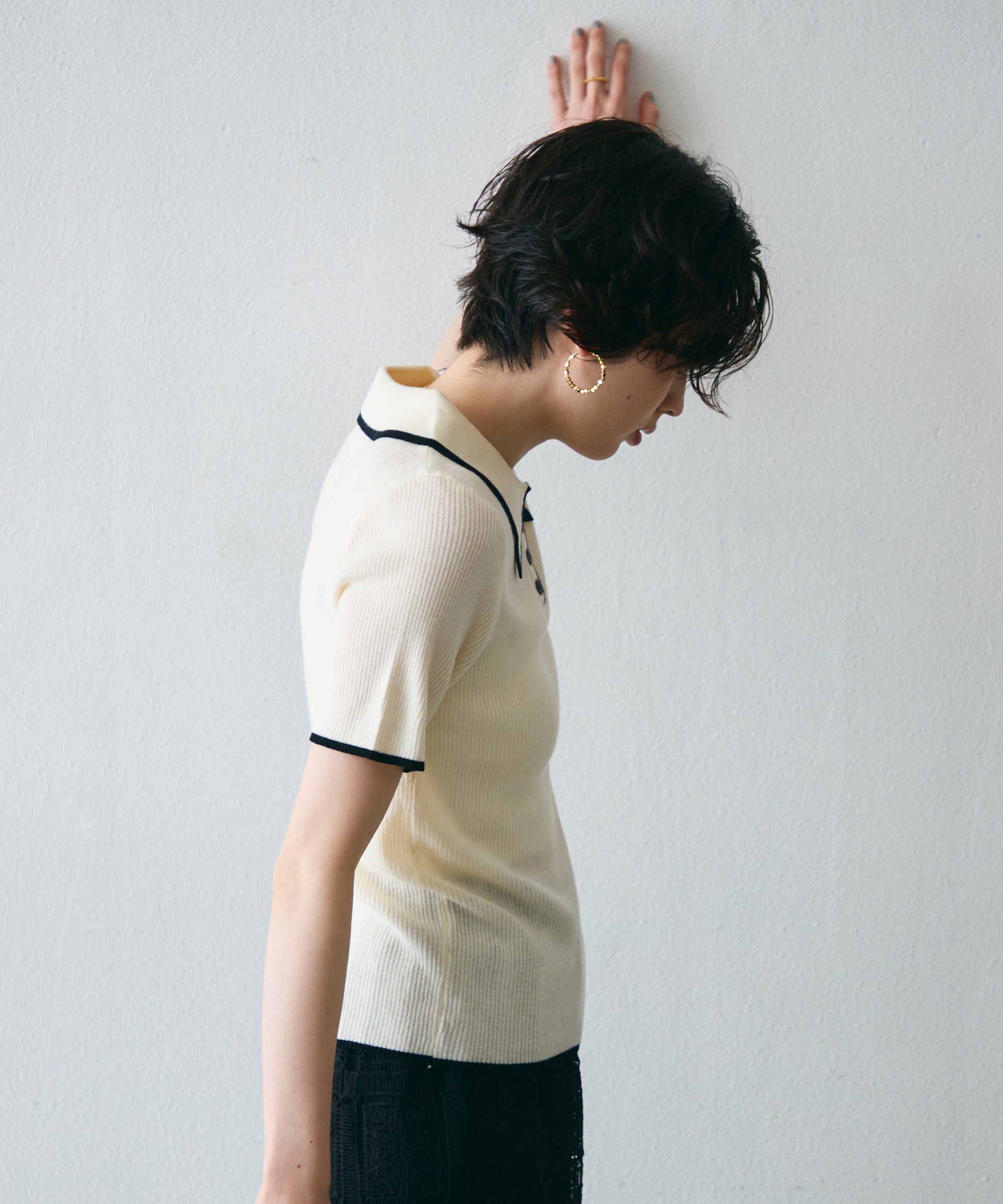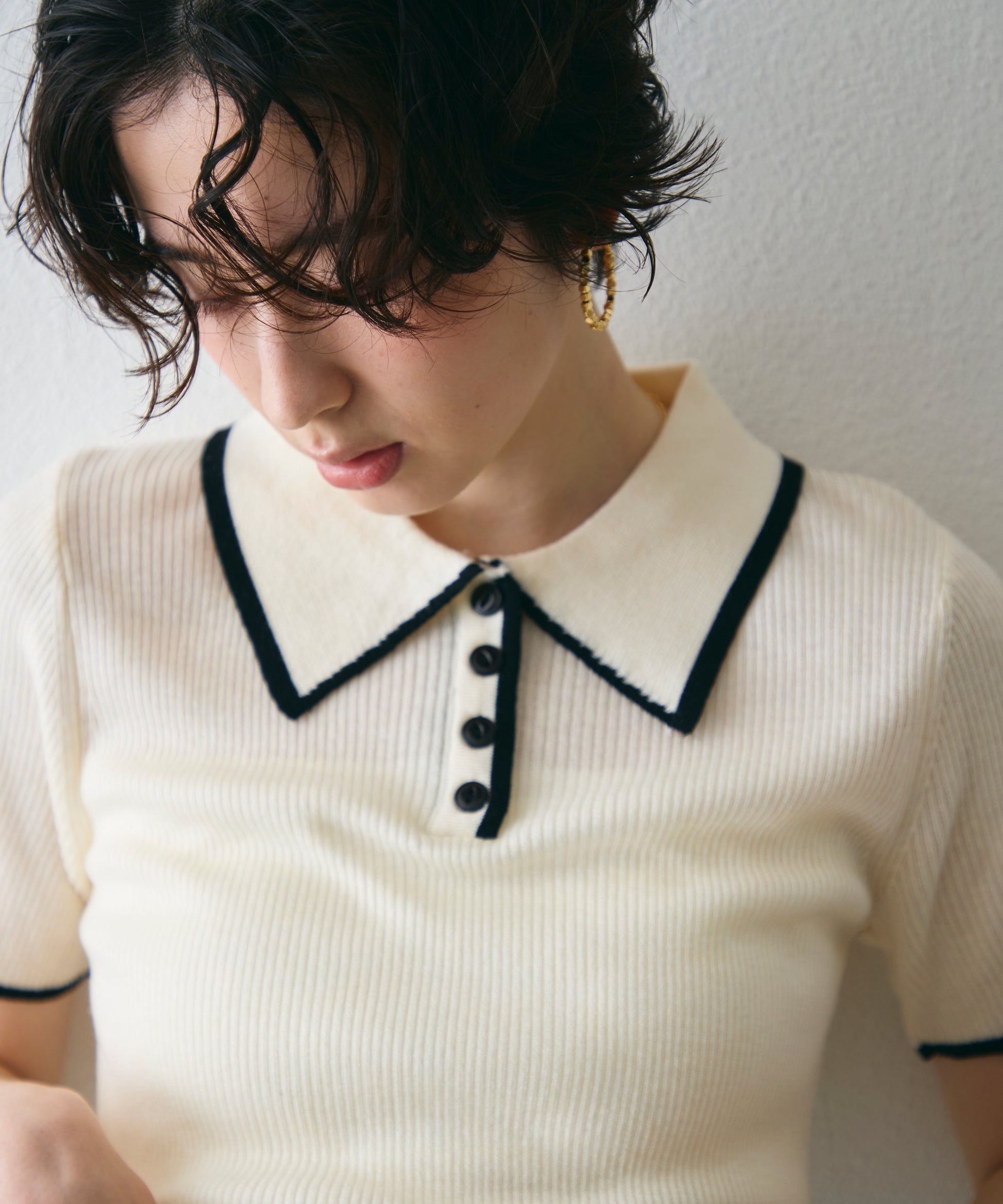 配色トリミングがアクセントになった、上品なポロ衿半袖ニット。
