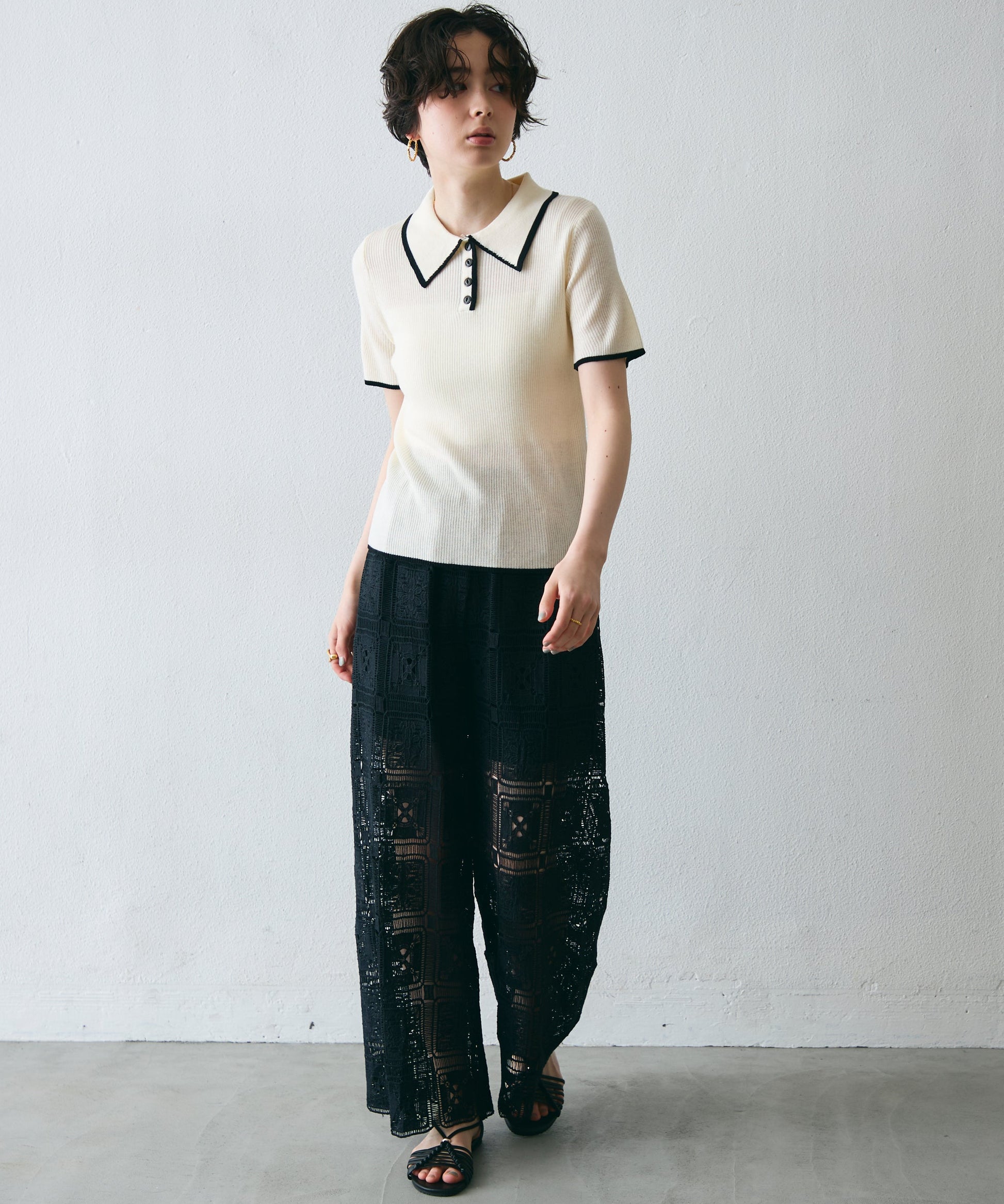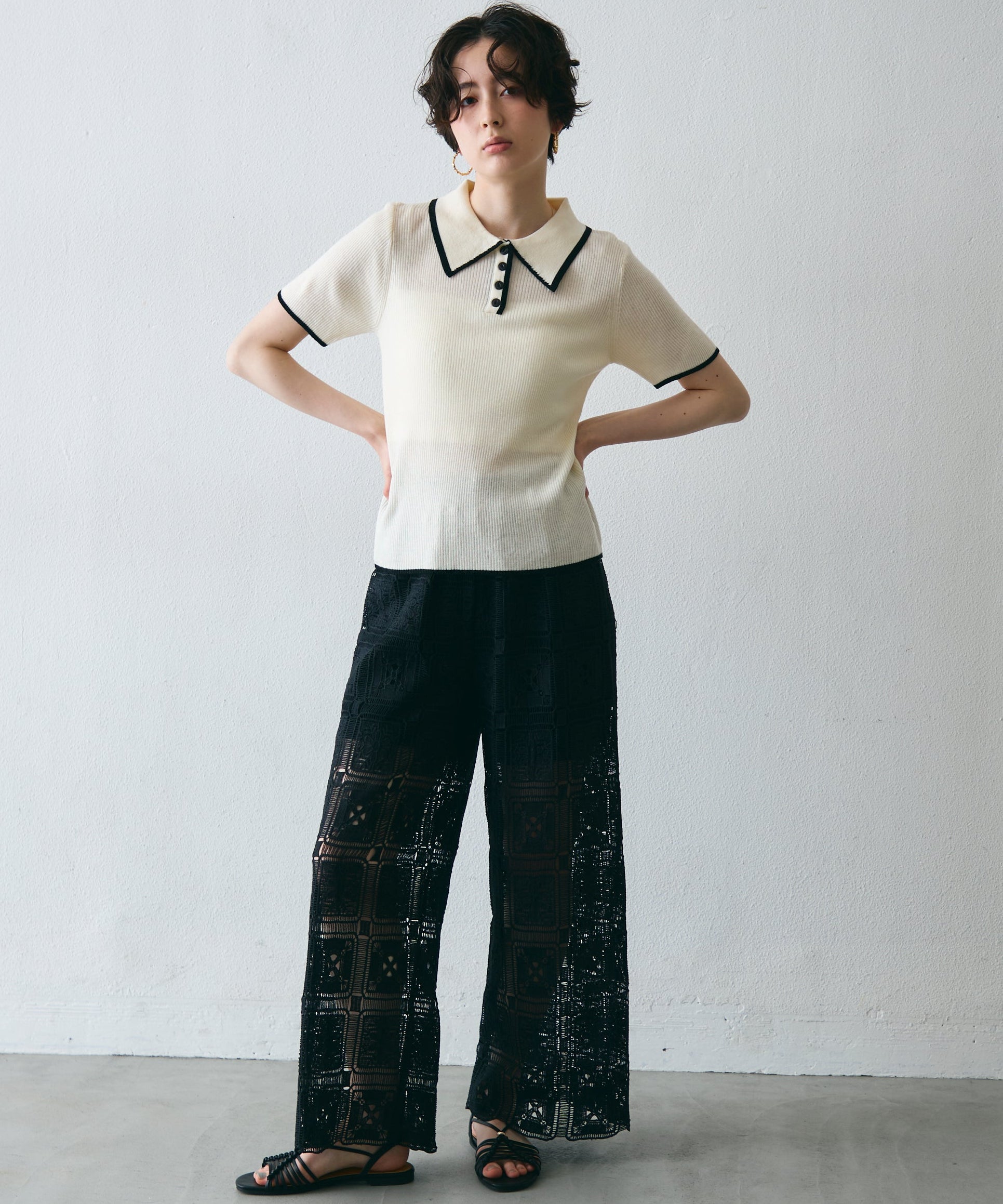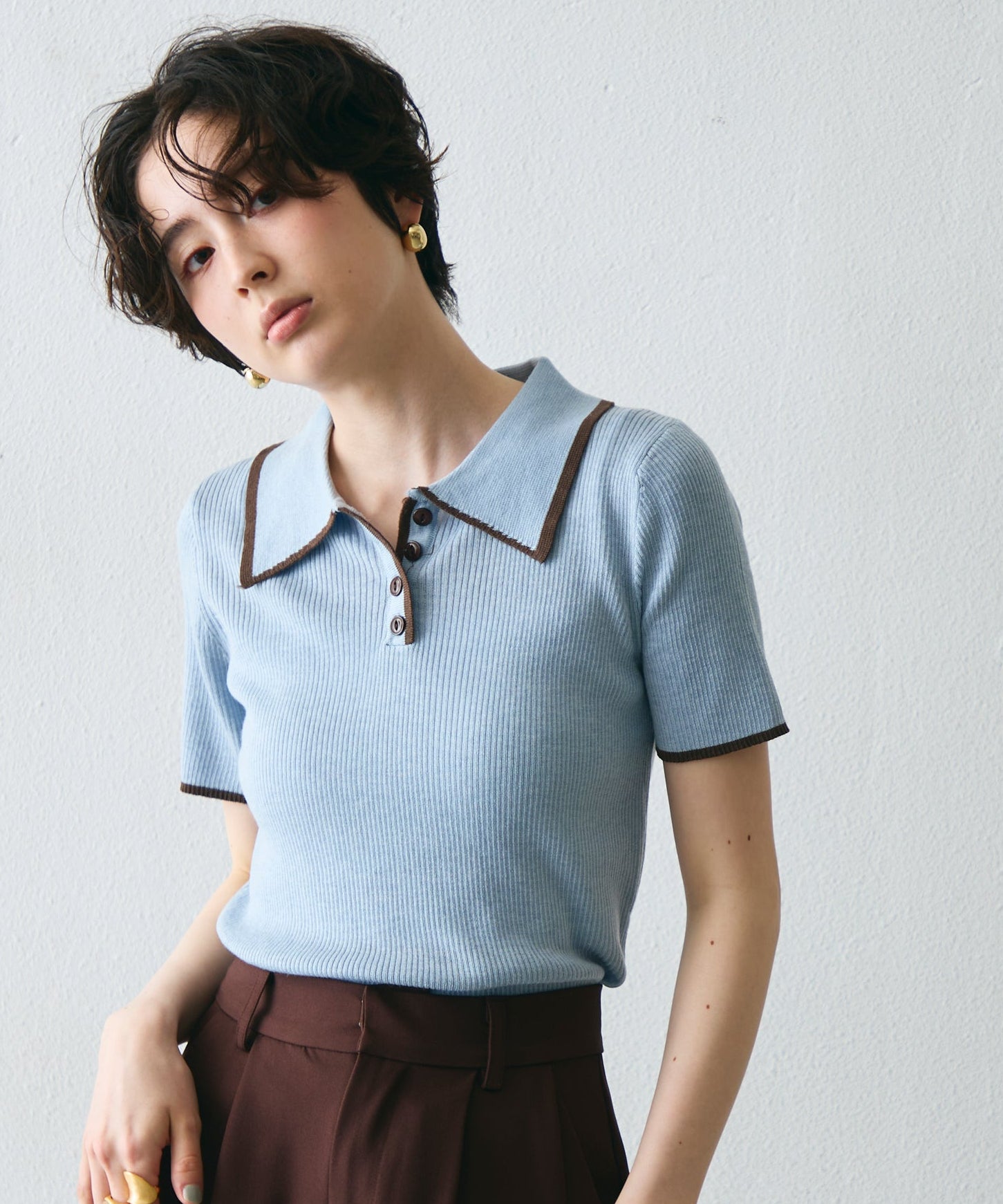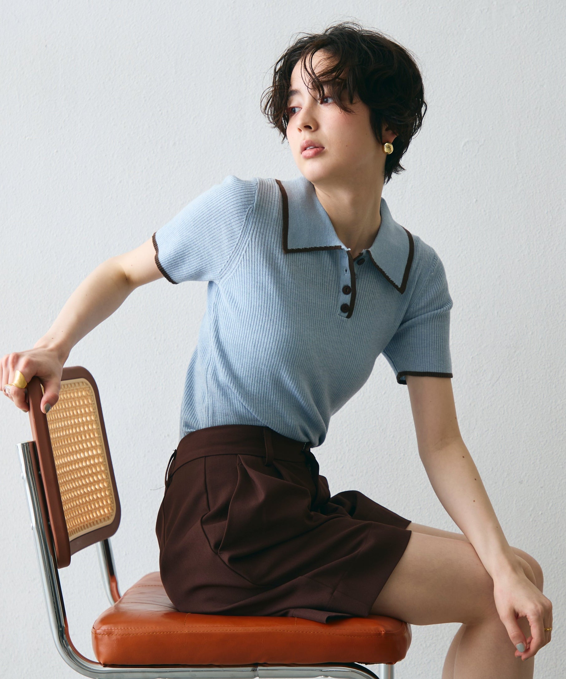 配色トリミングがアクセントになった、上品なポロ衿半袖ニット。