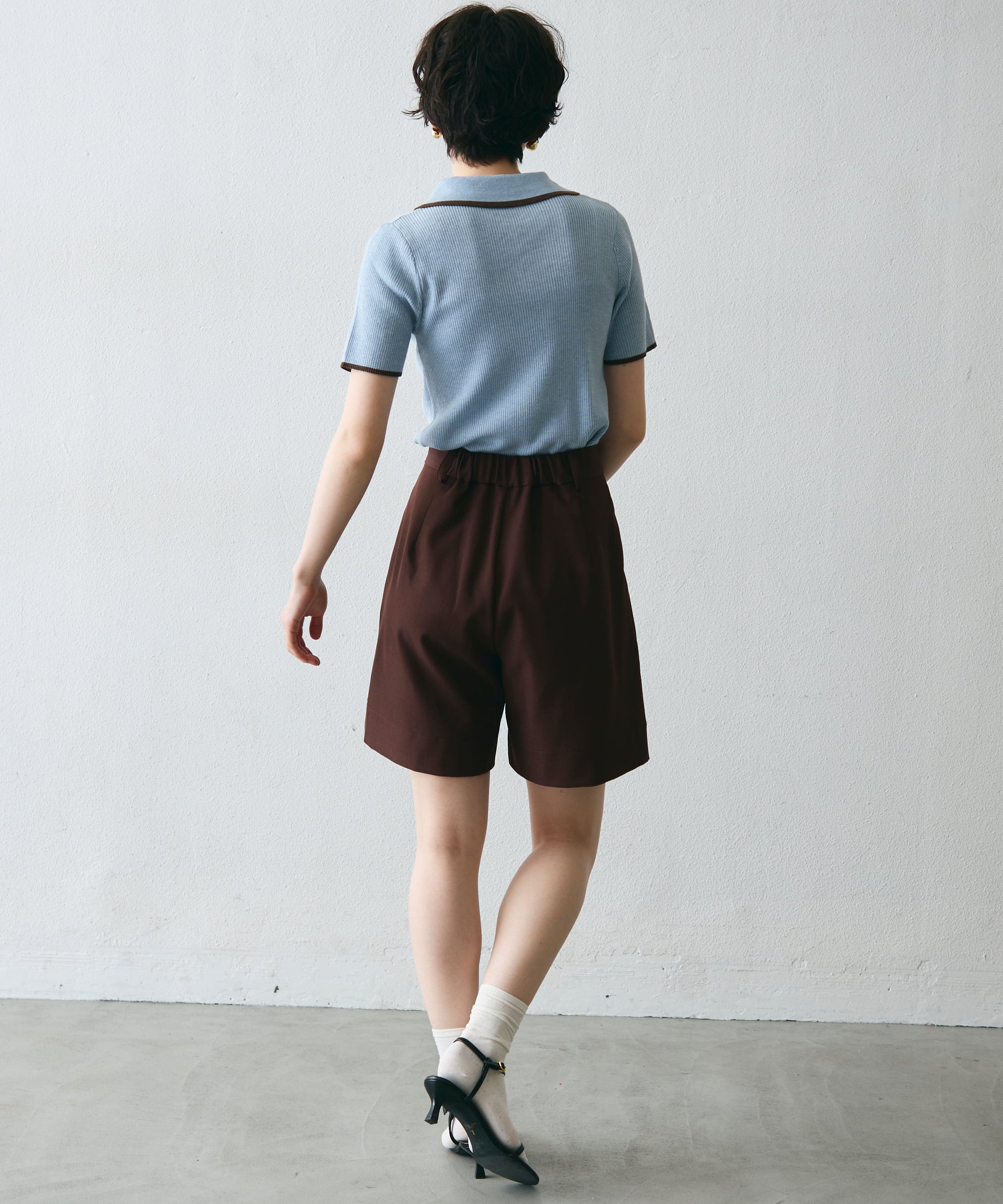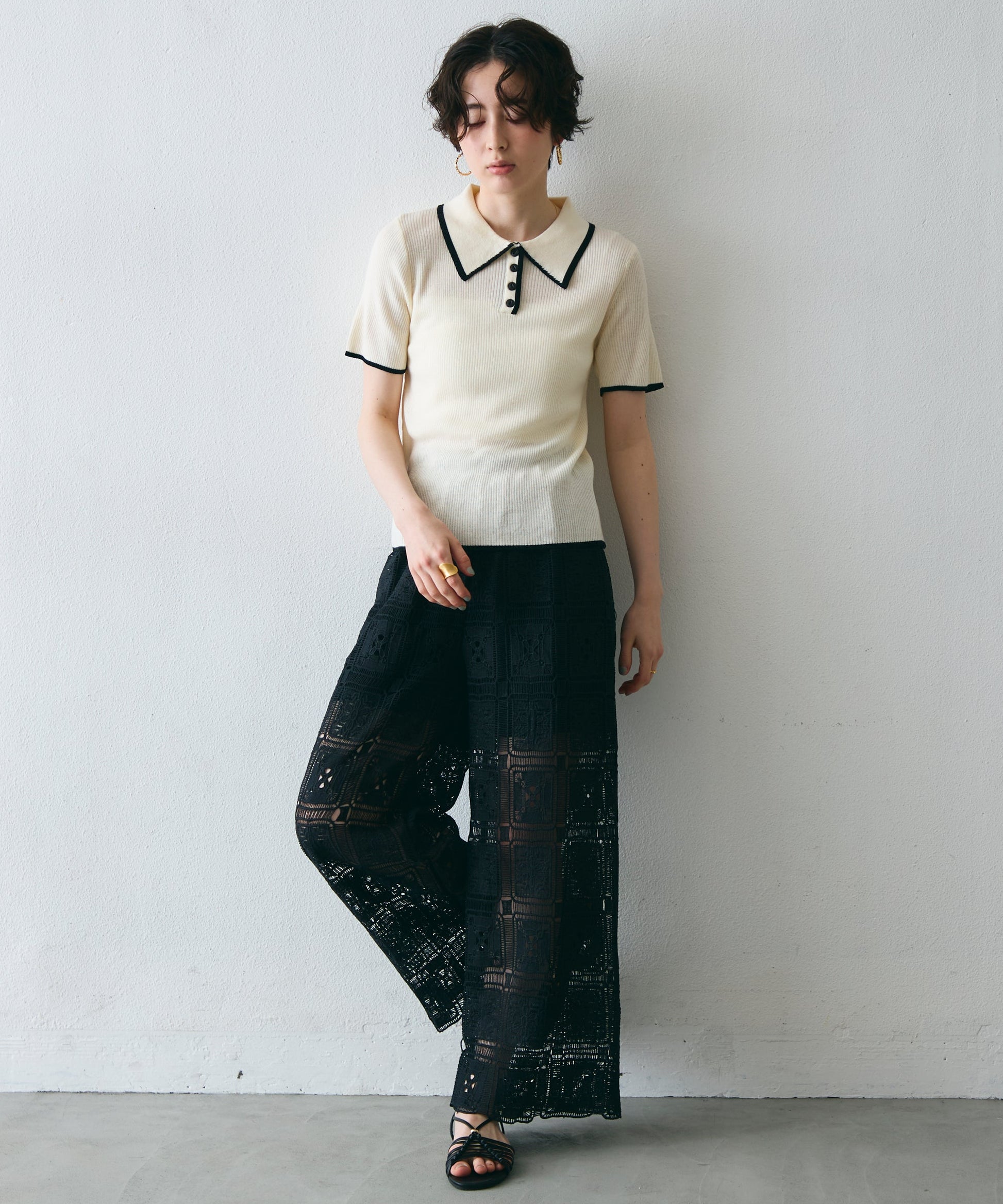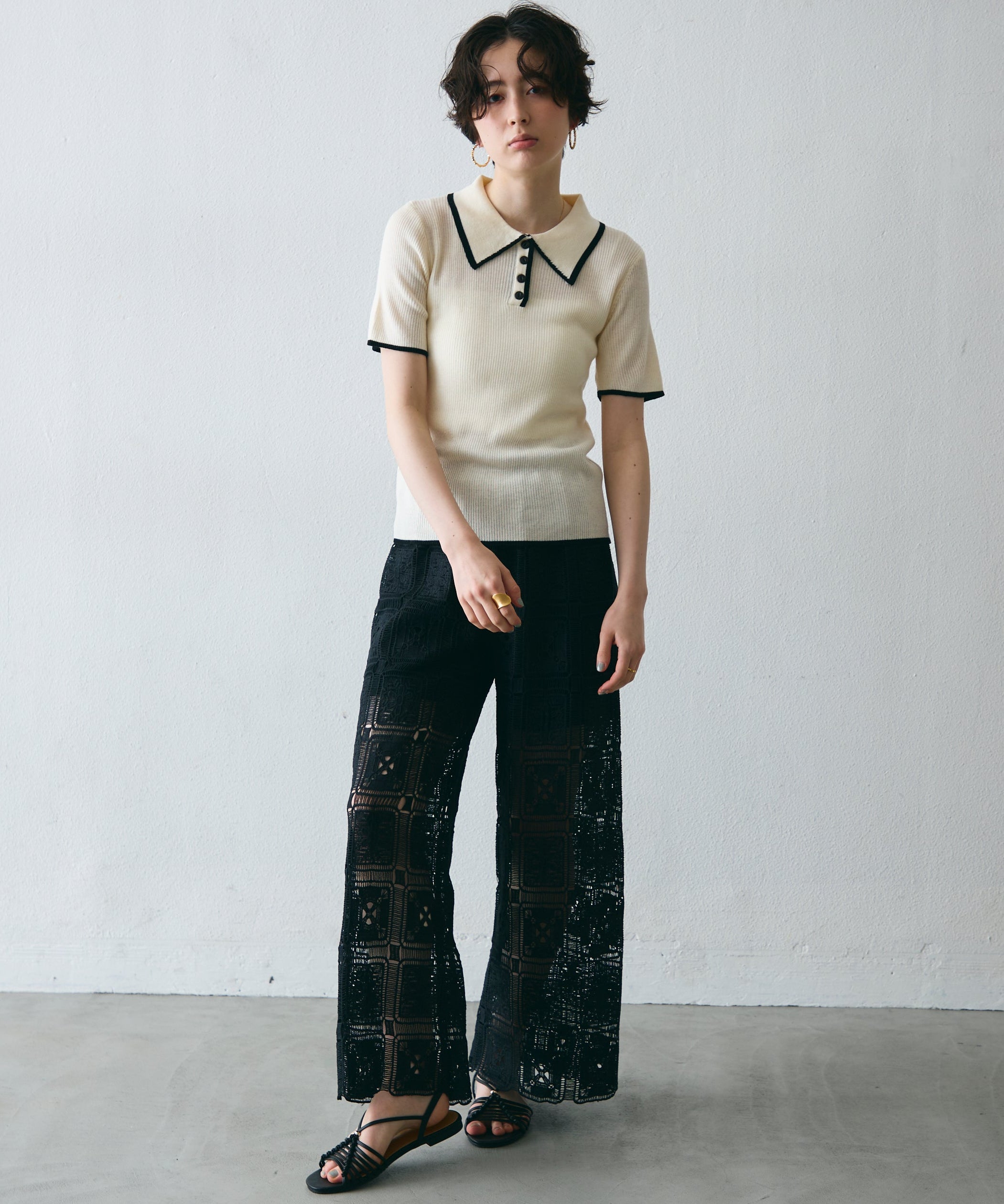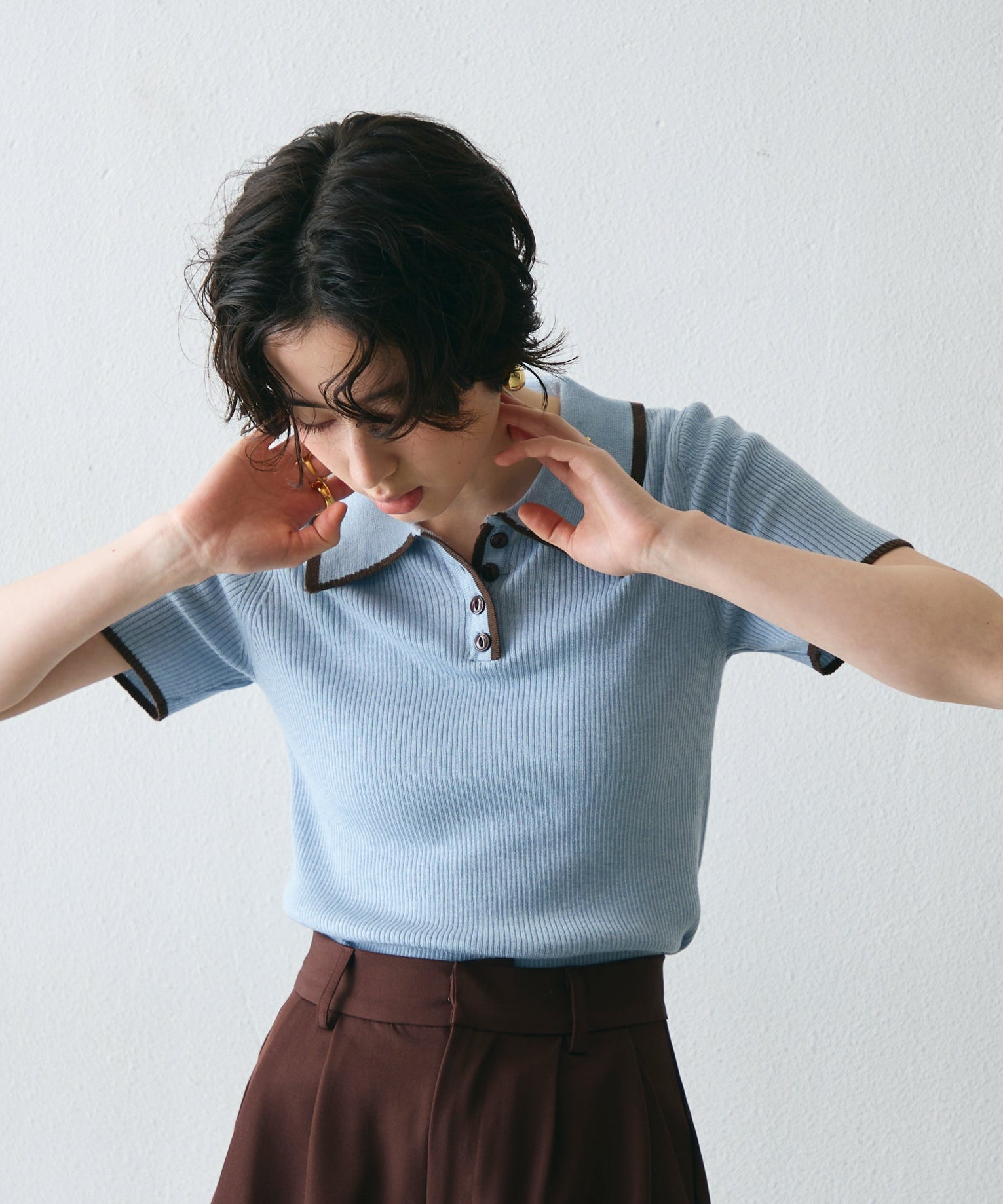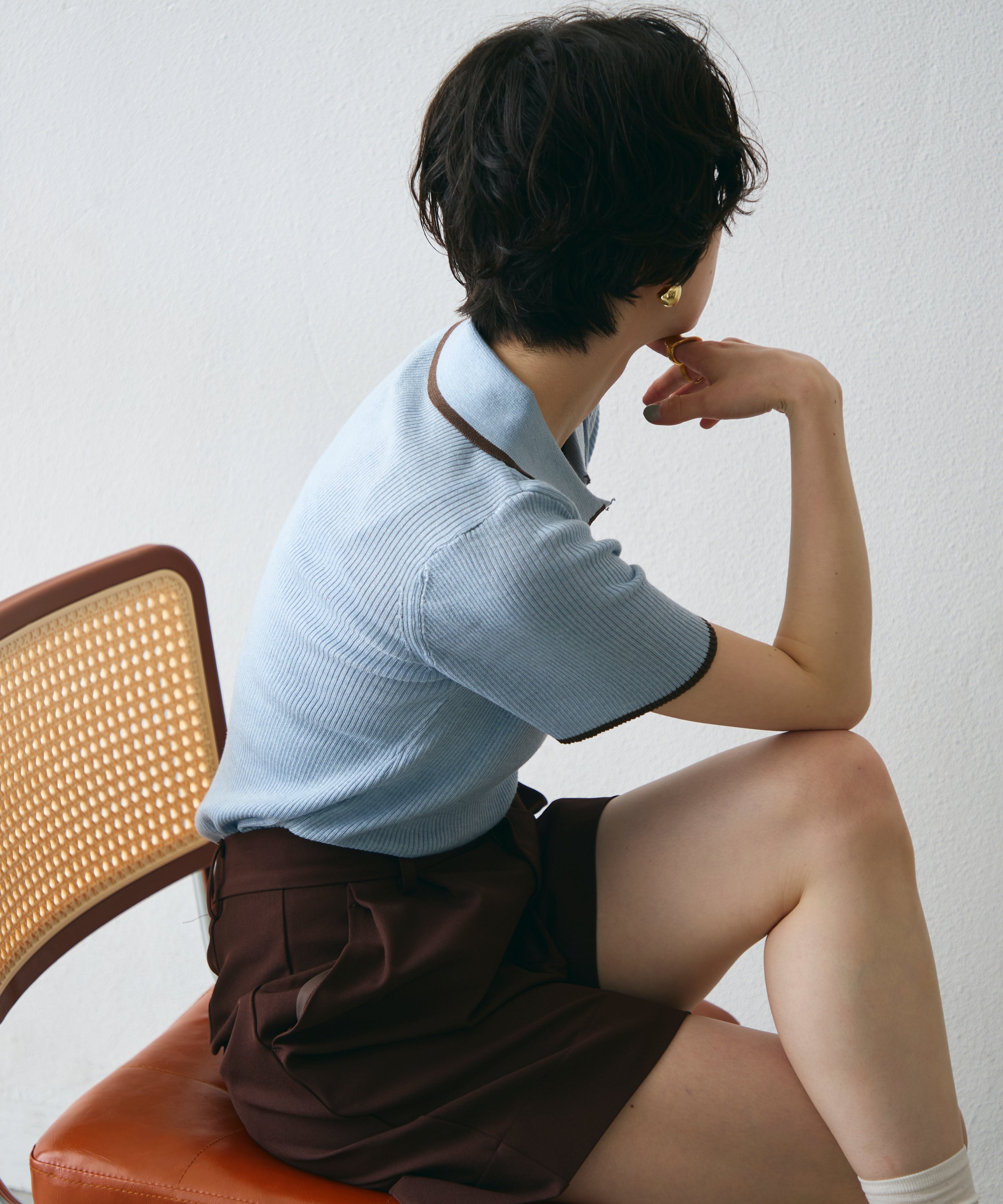 配色トリミングがアクセントになった、上品なポロ衿半袖ニット。
