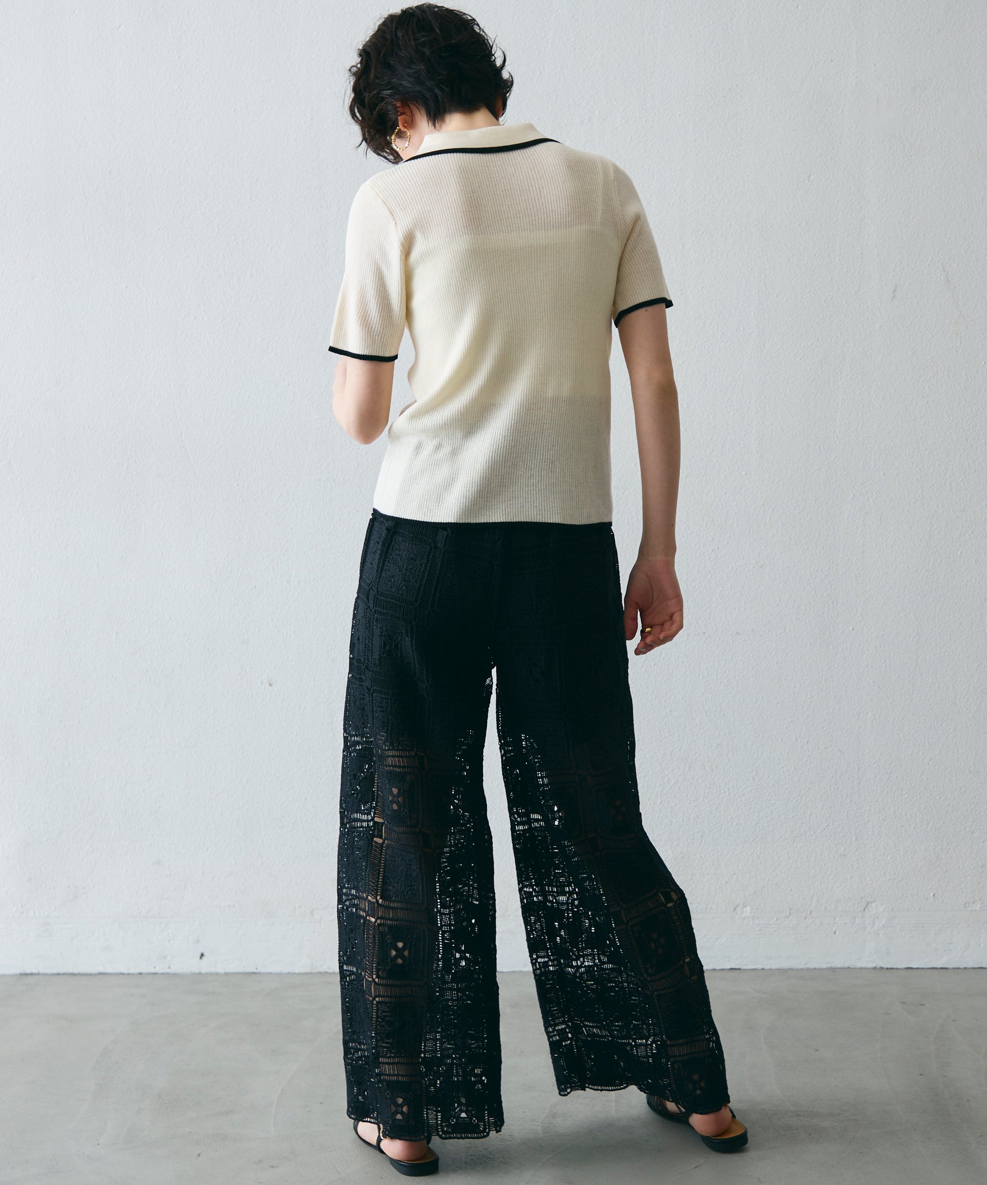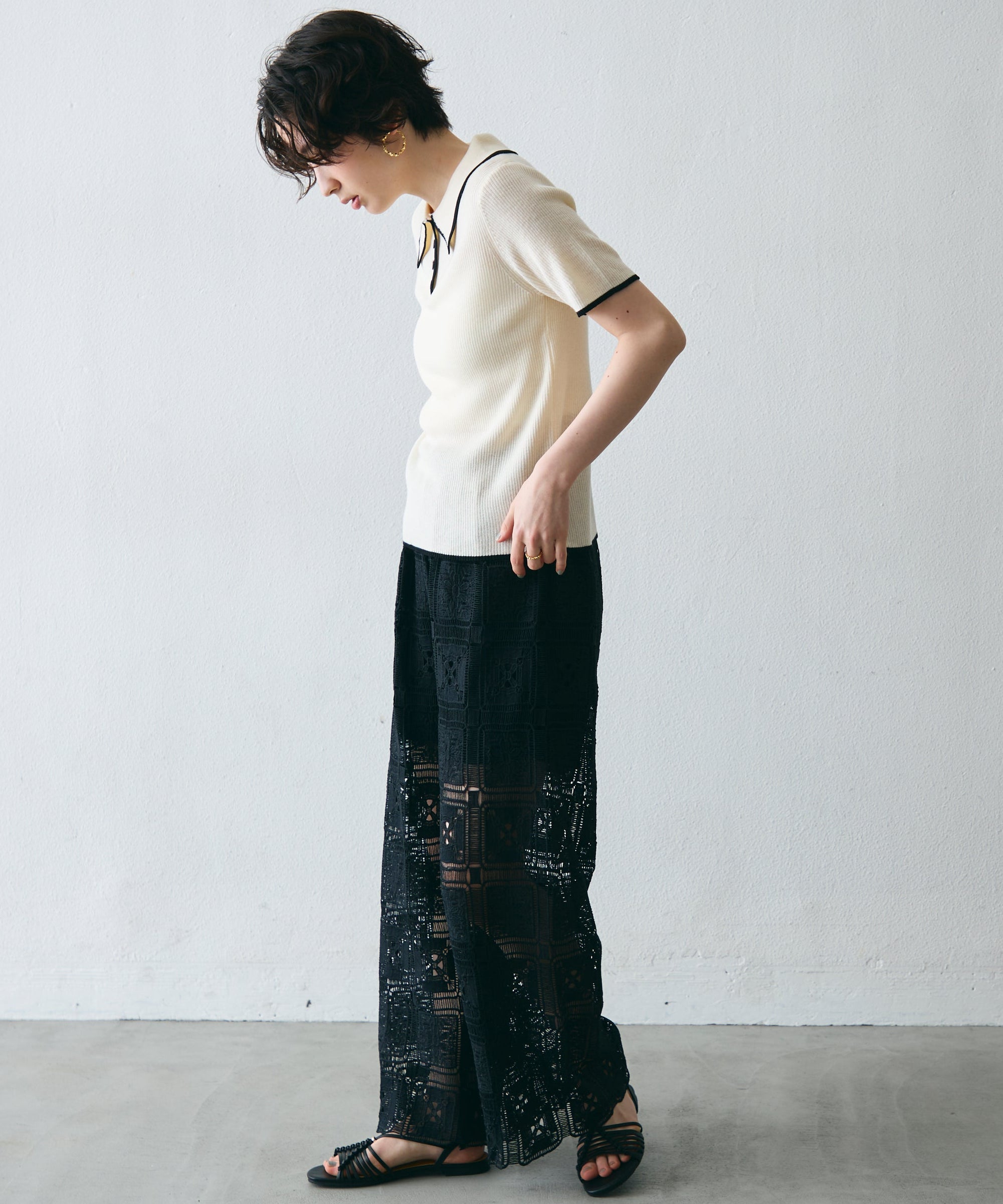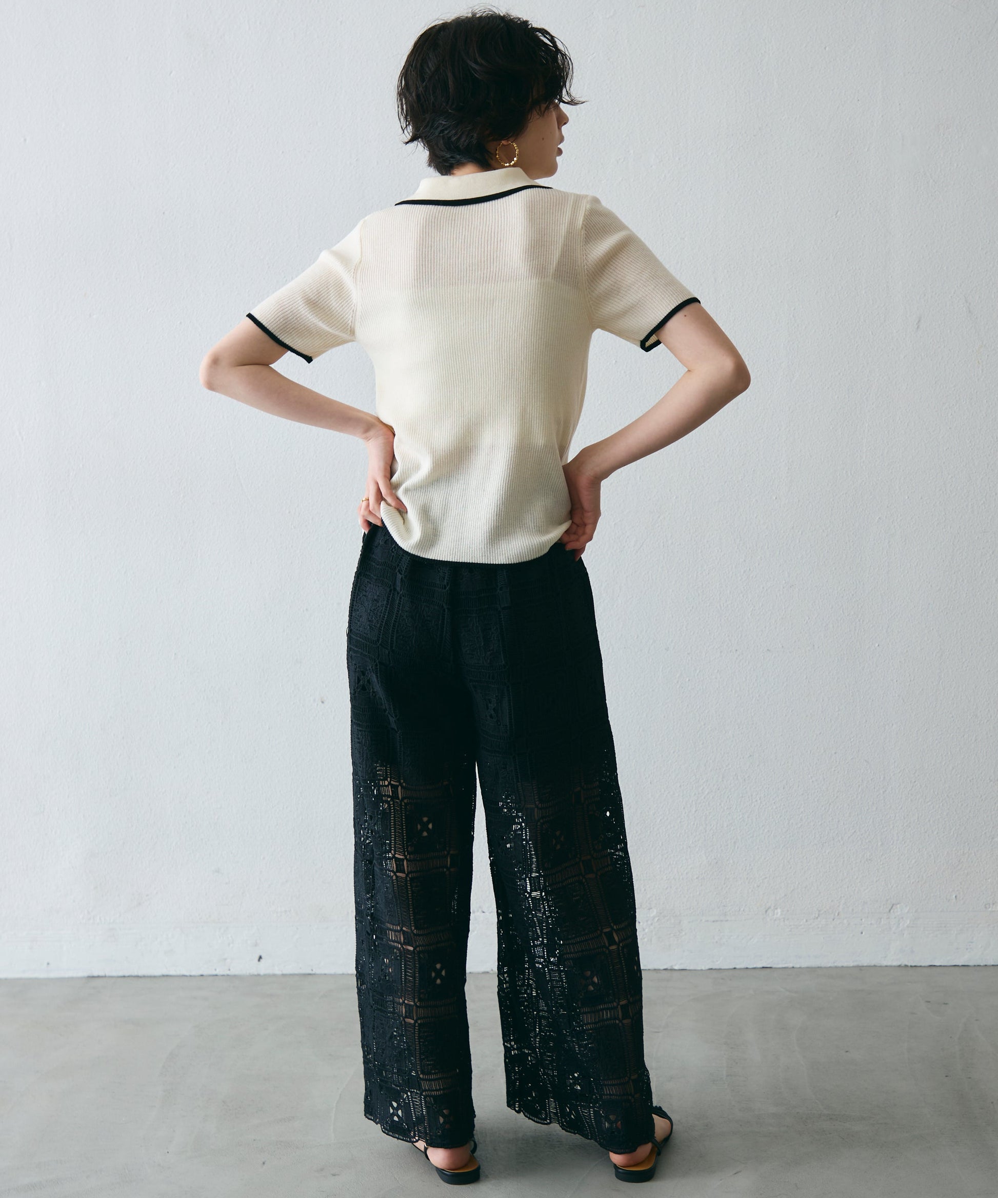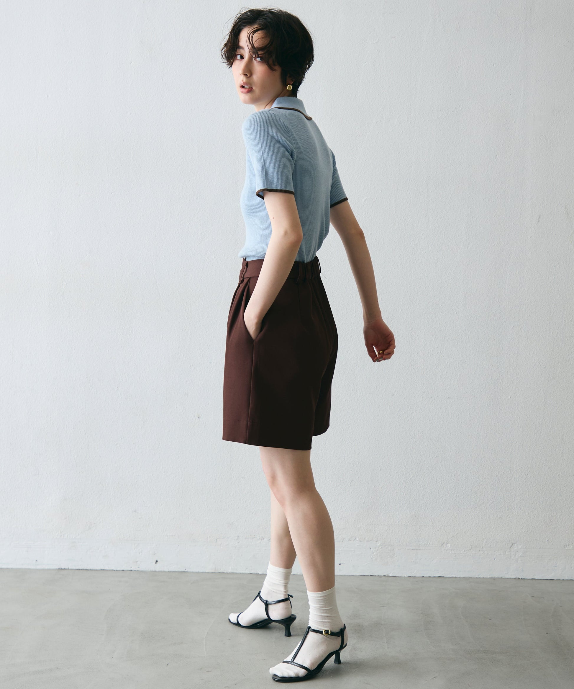 配色トリミングがアクセントになった、上品なポロ衿半袖ニット。