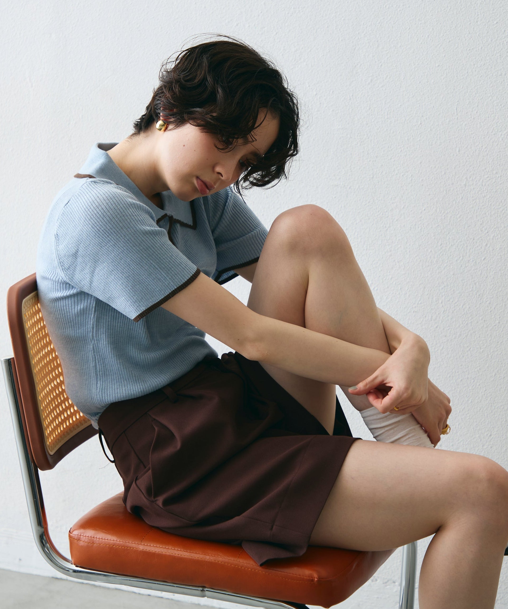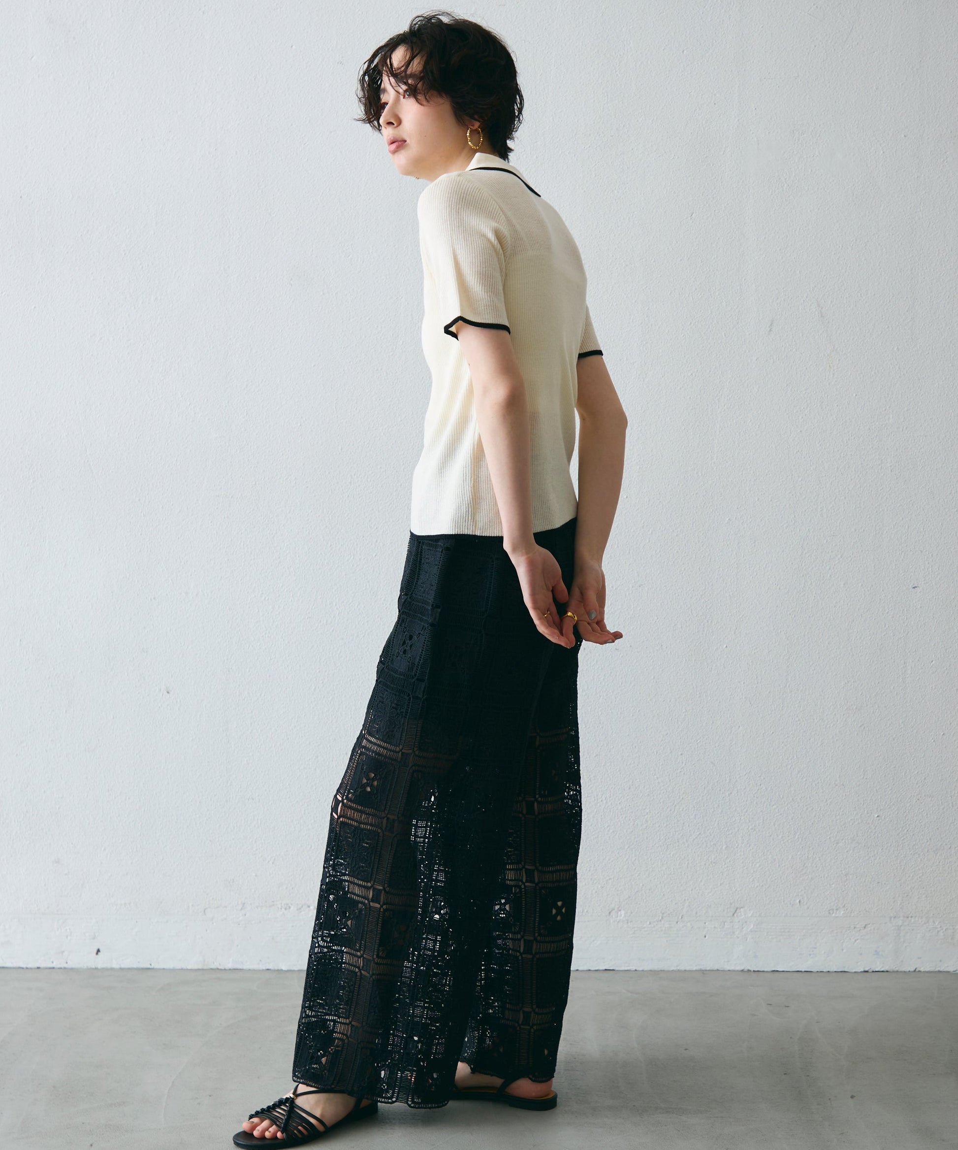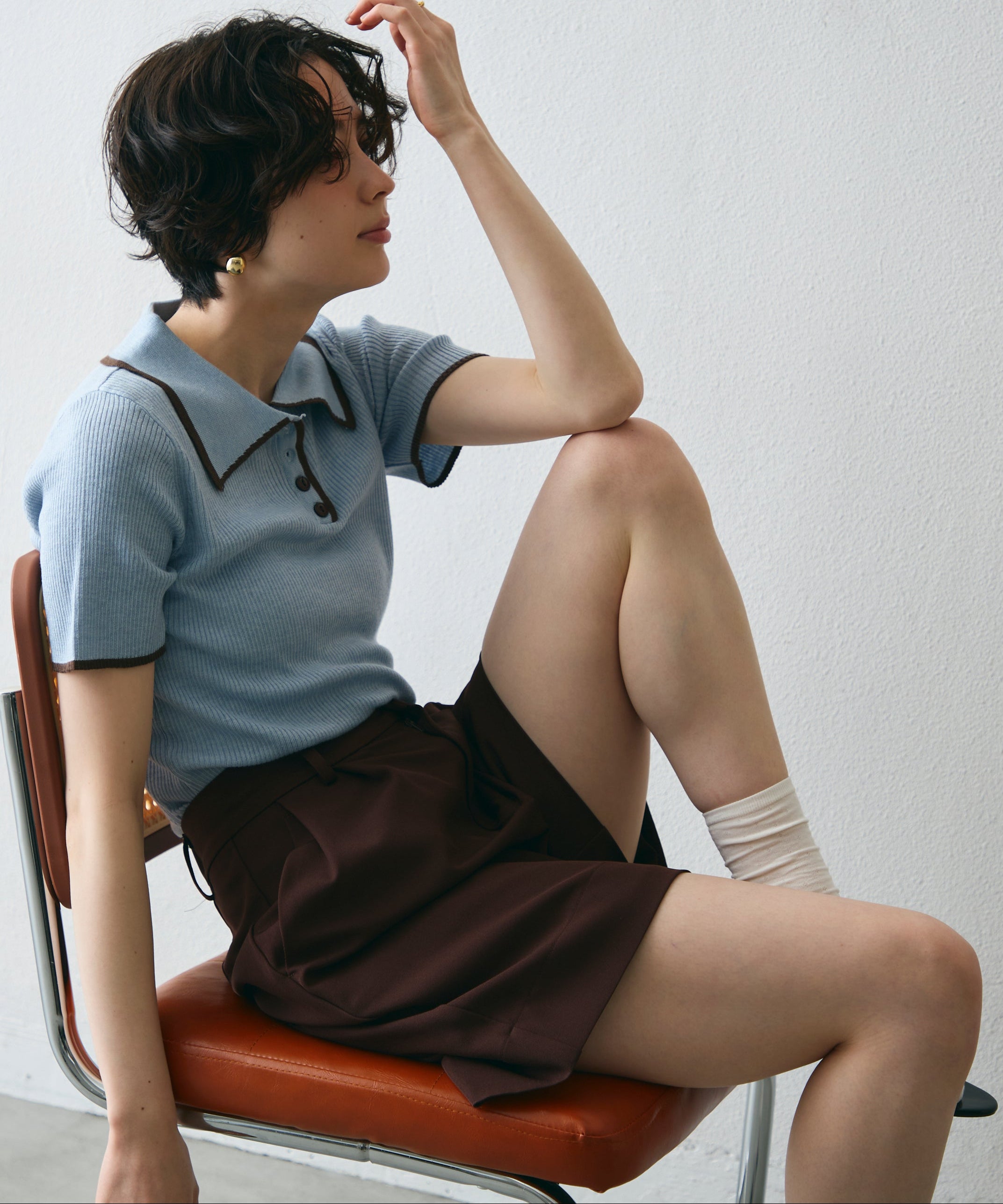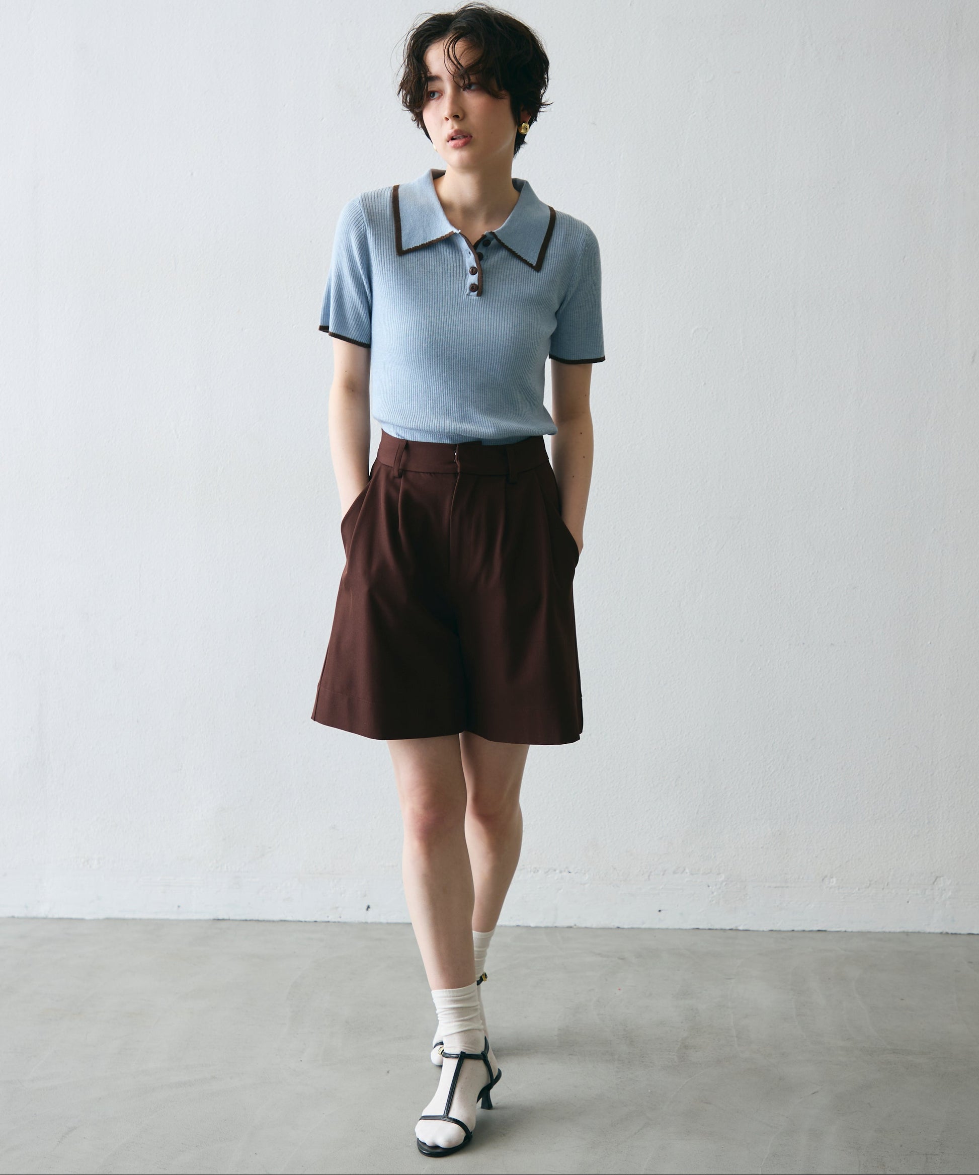 ポロ衿のきちんと感と、配色ラインのカジュアルさが絶妙にマッチ。