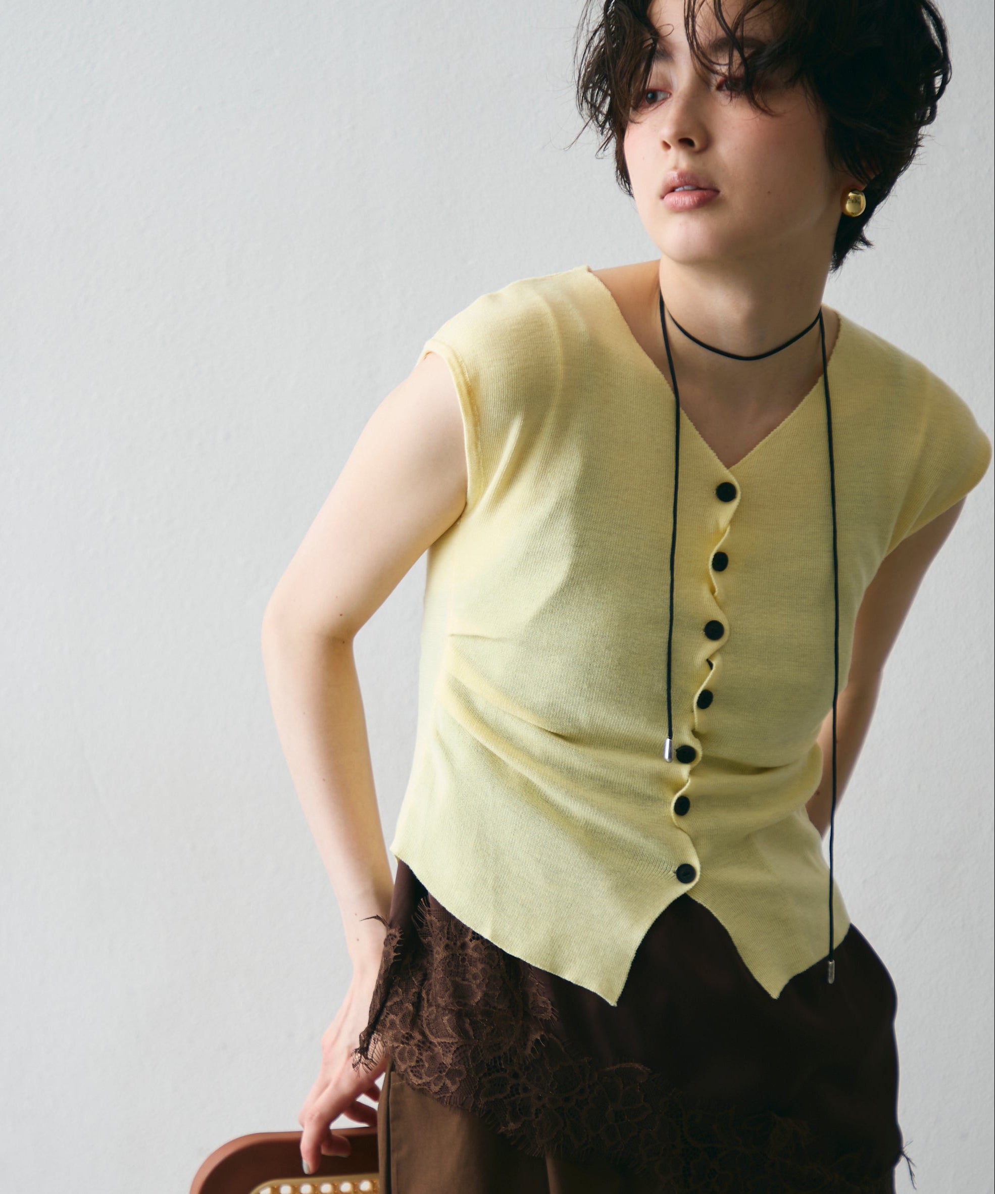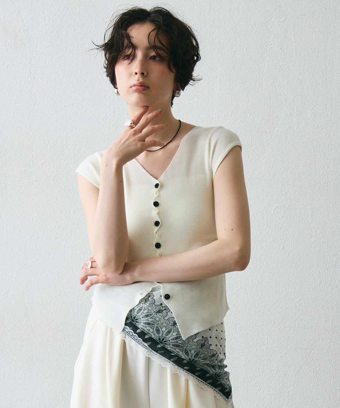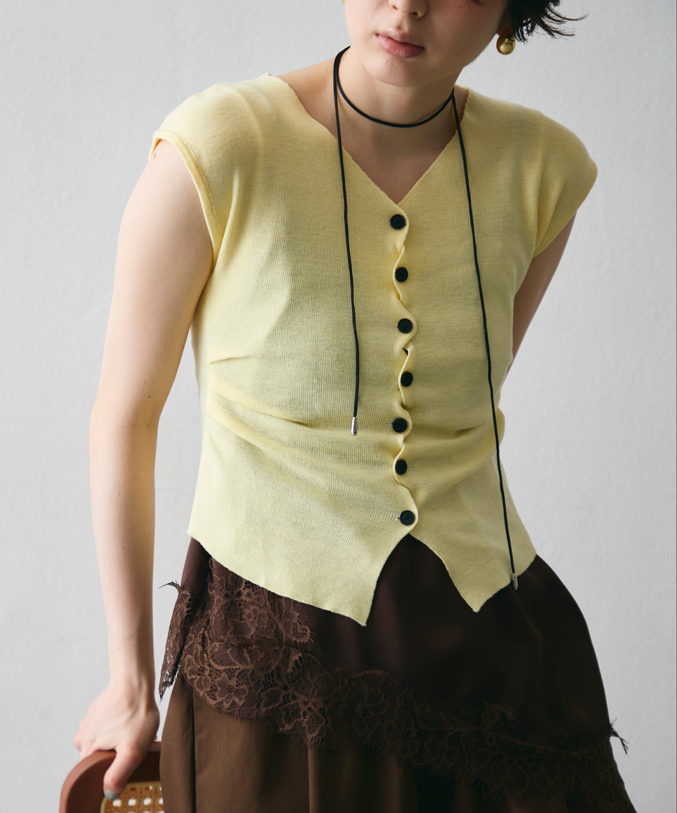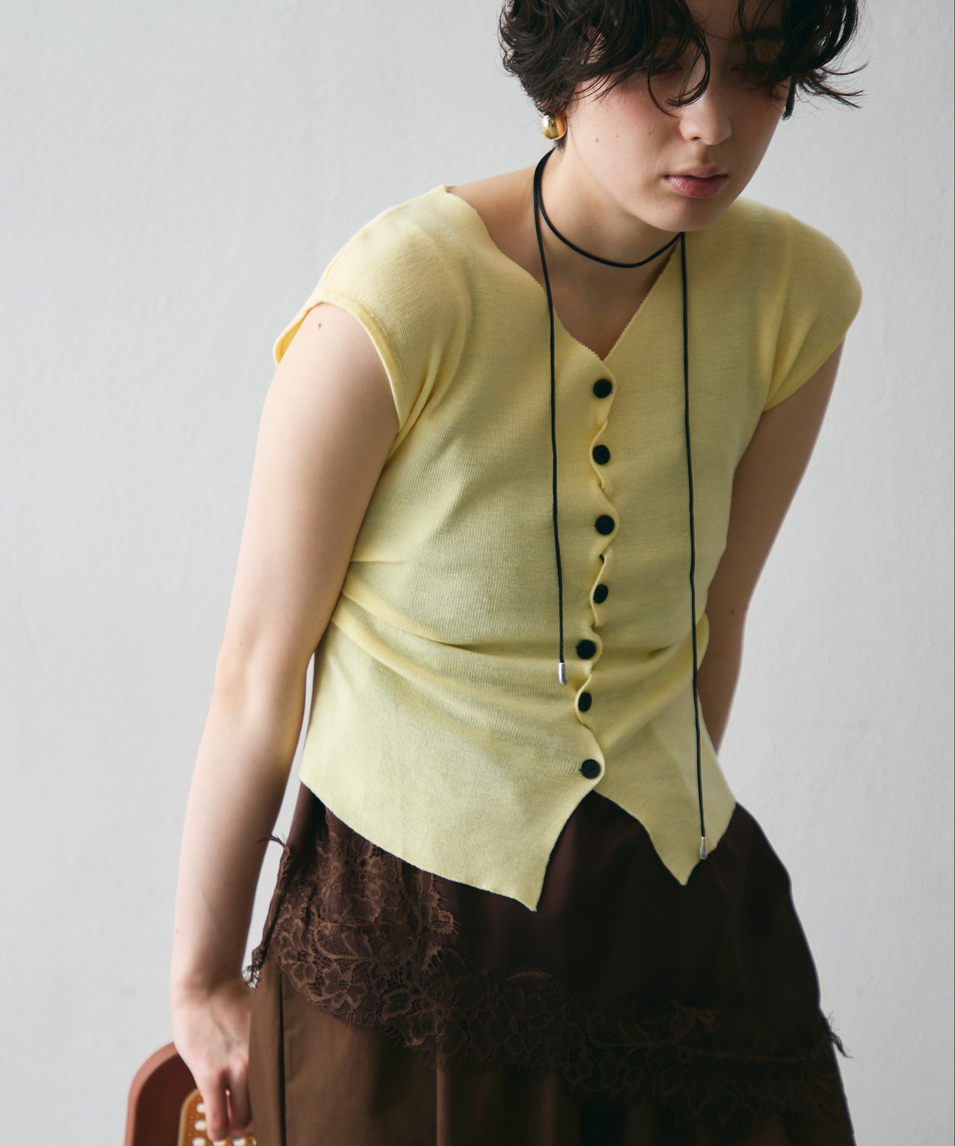 クロスしたボタンデザインがさりげないアクセントになるフレンチスリーブニット。