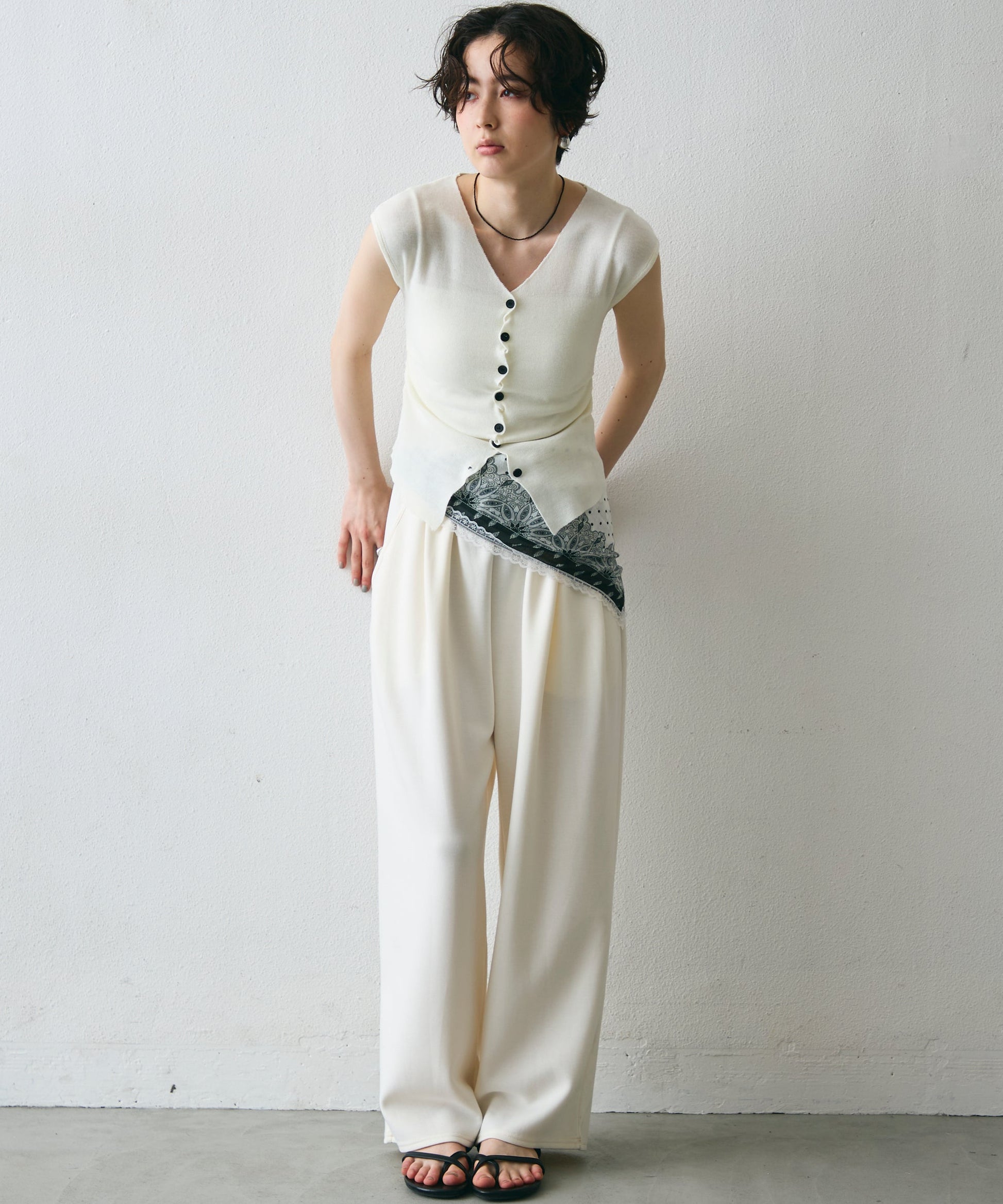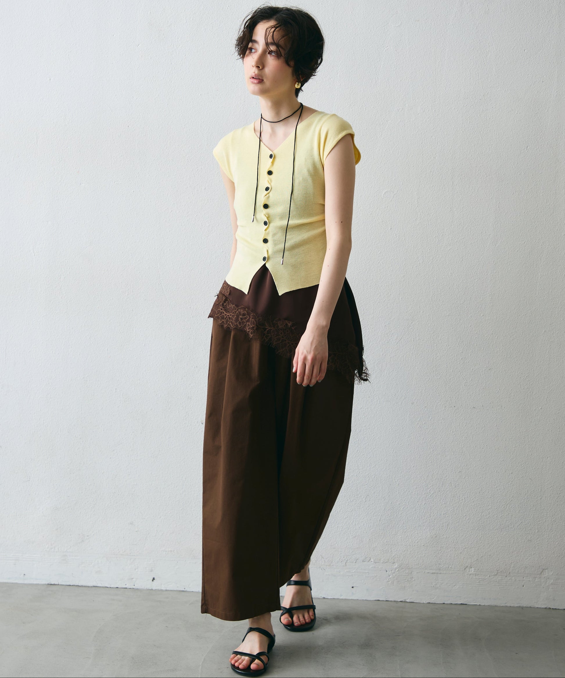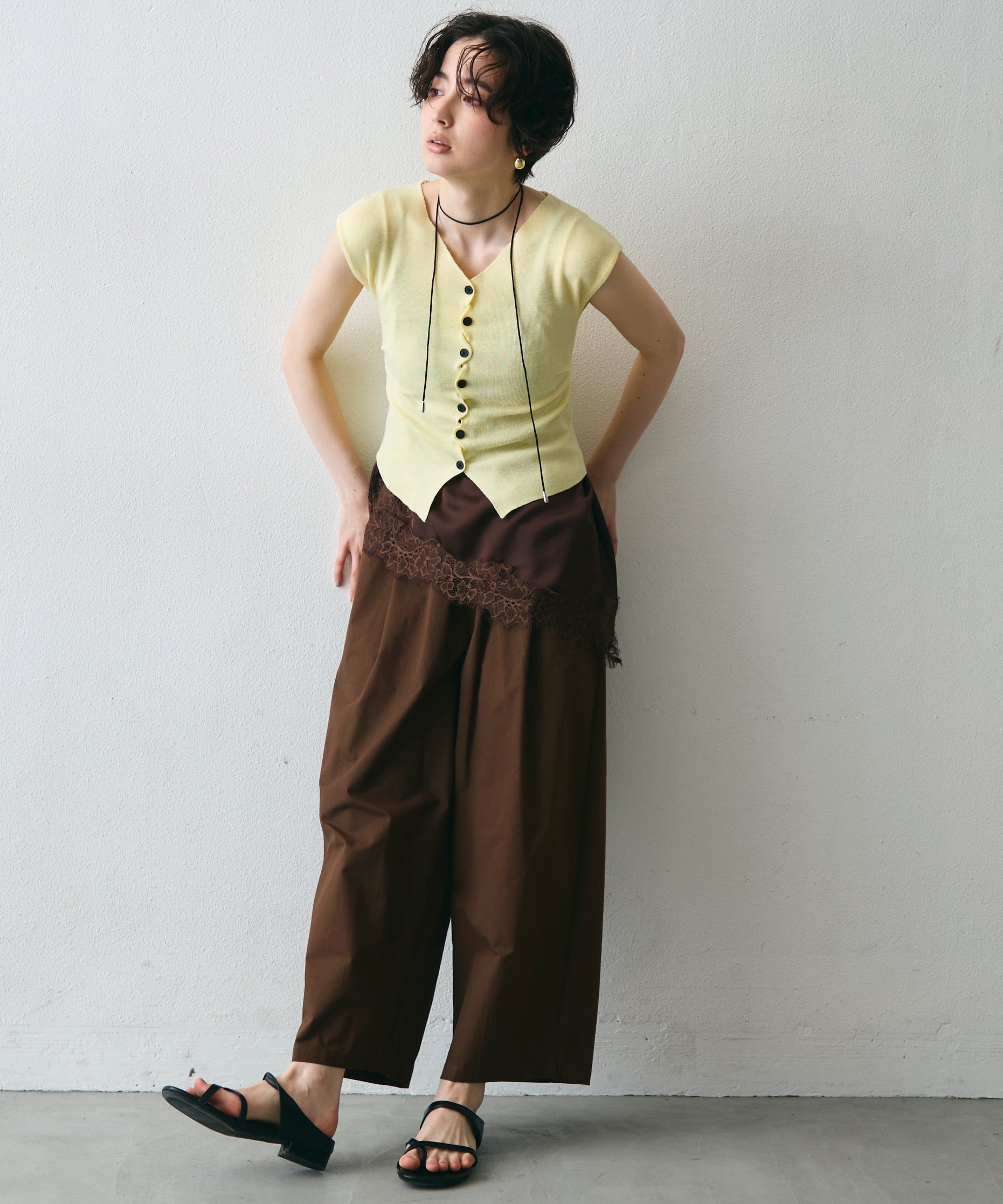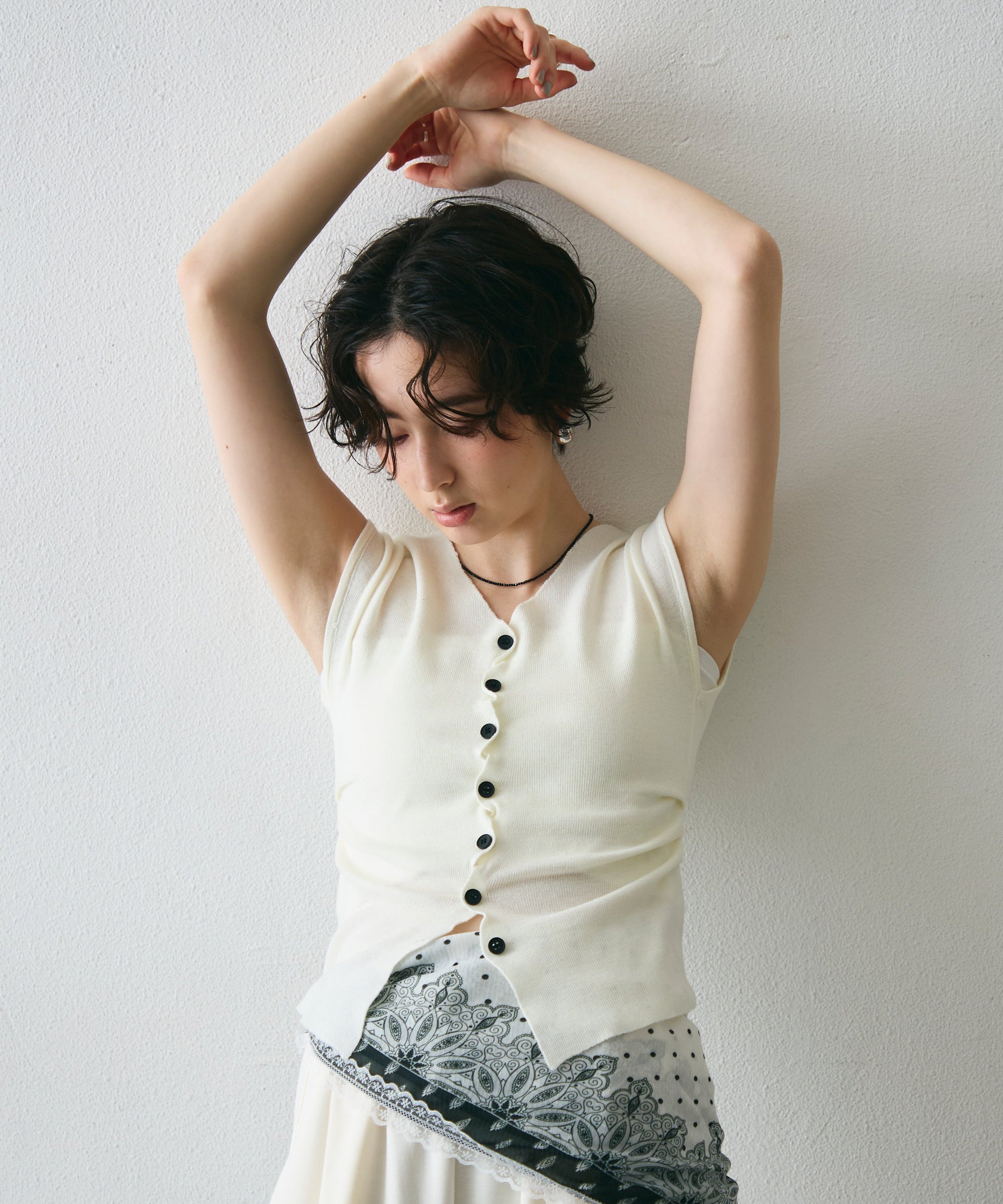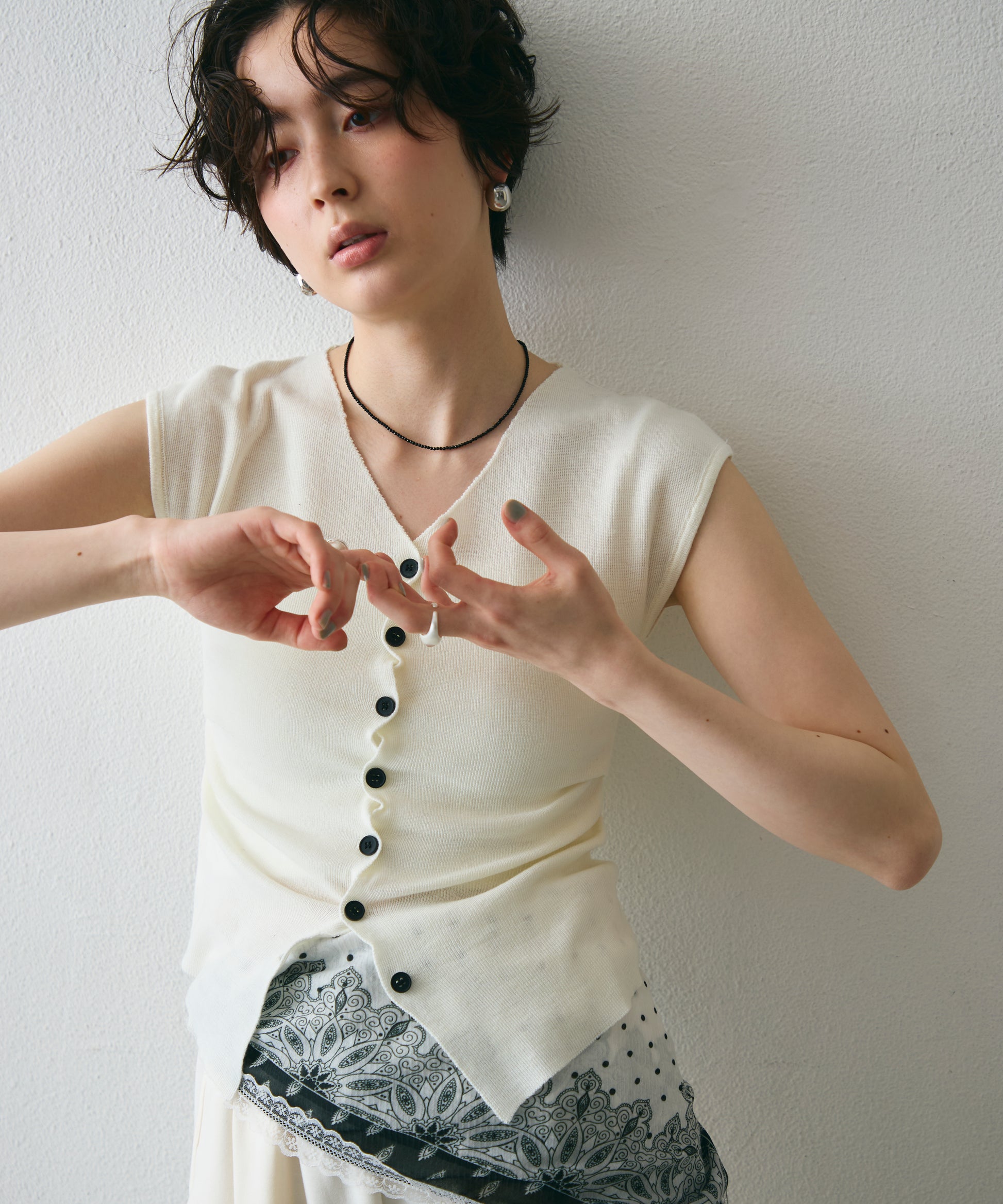 クロスしたボタンデザインがさりげないアクセントになるフレンチスリーブニット。