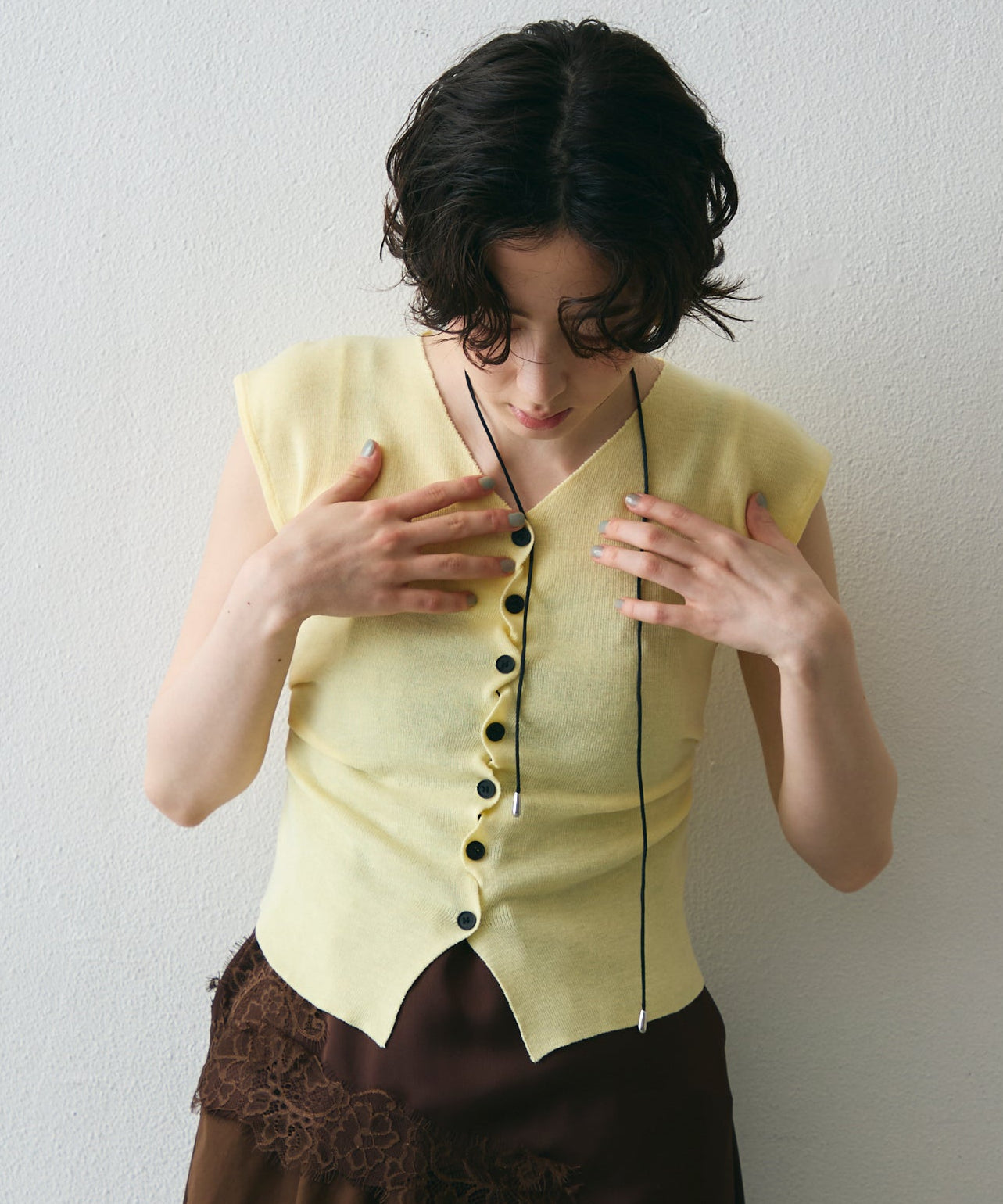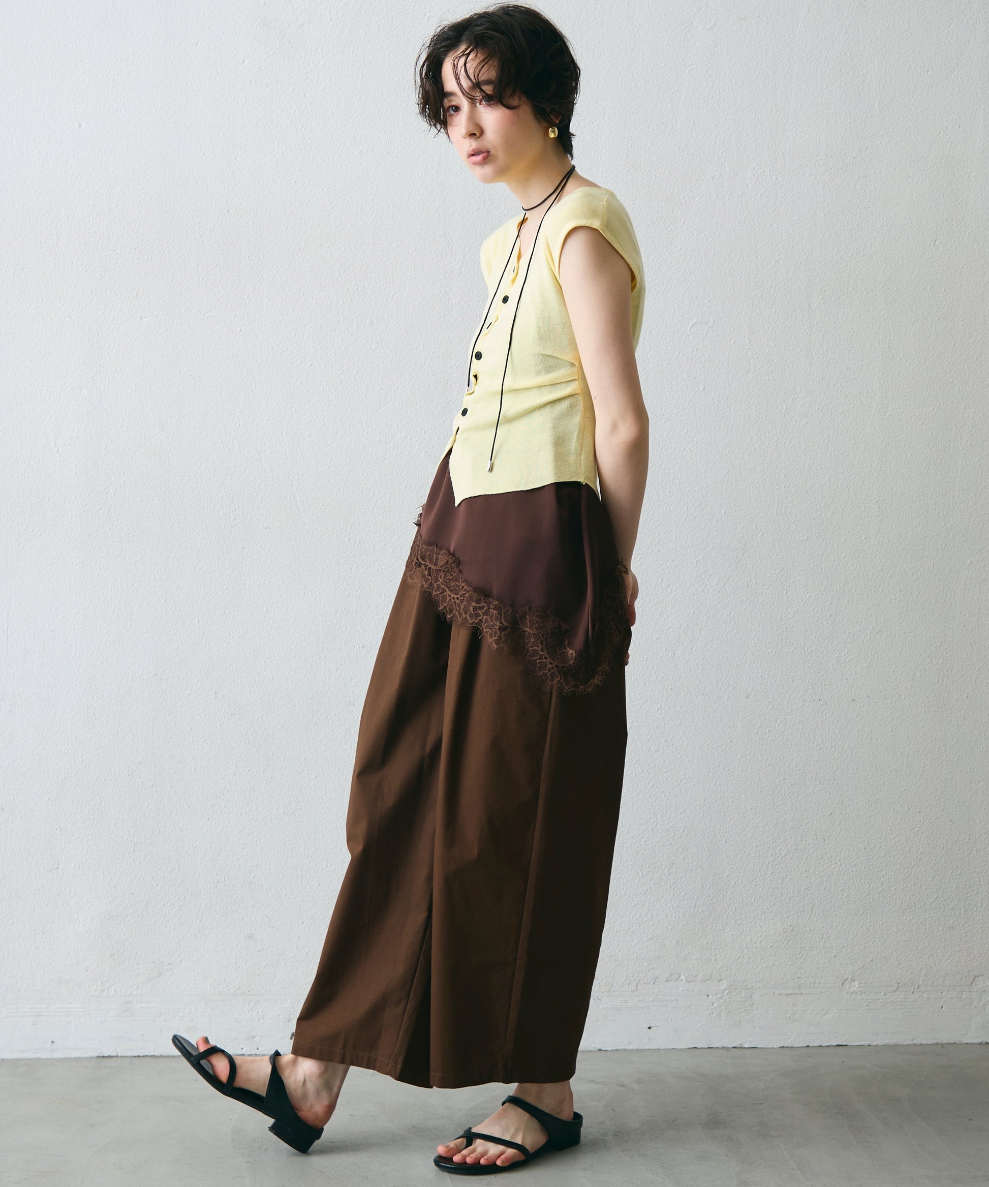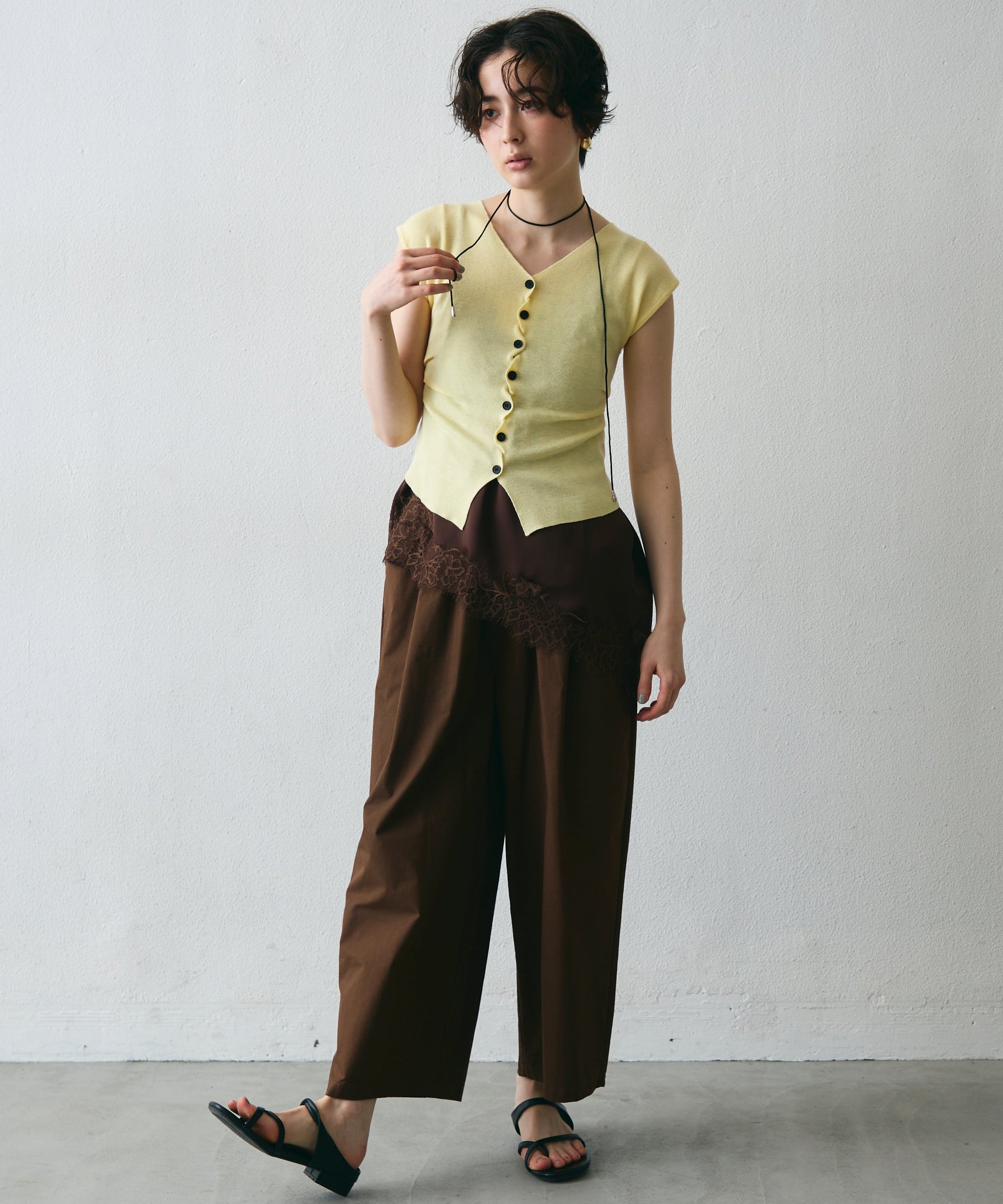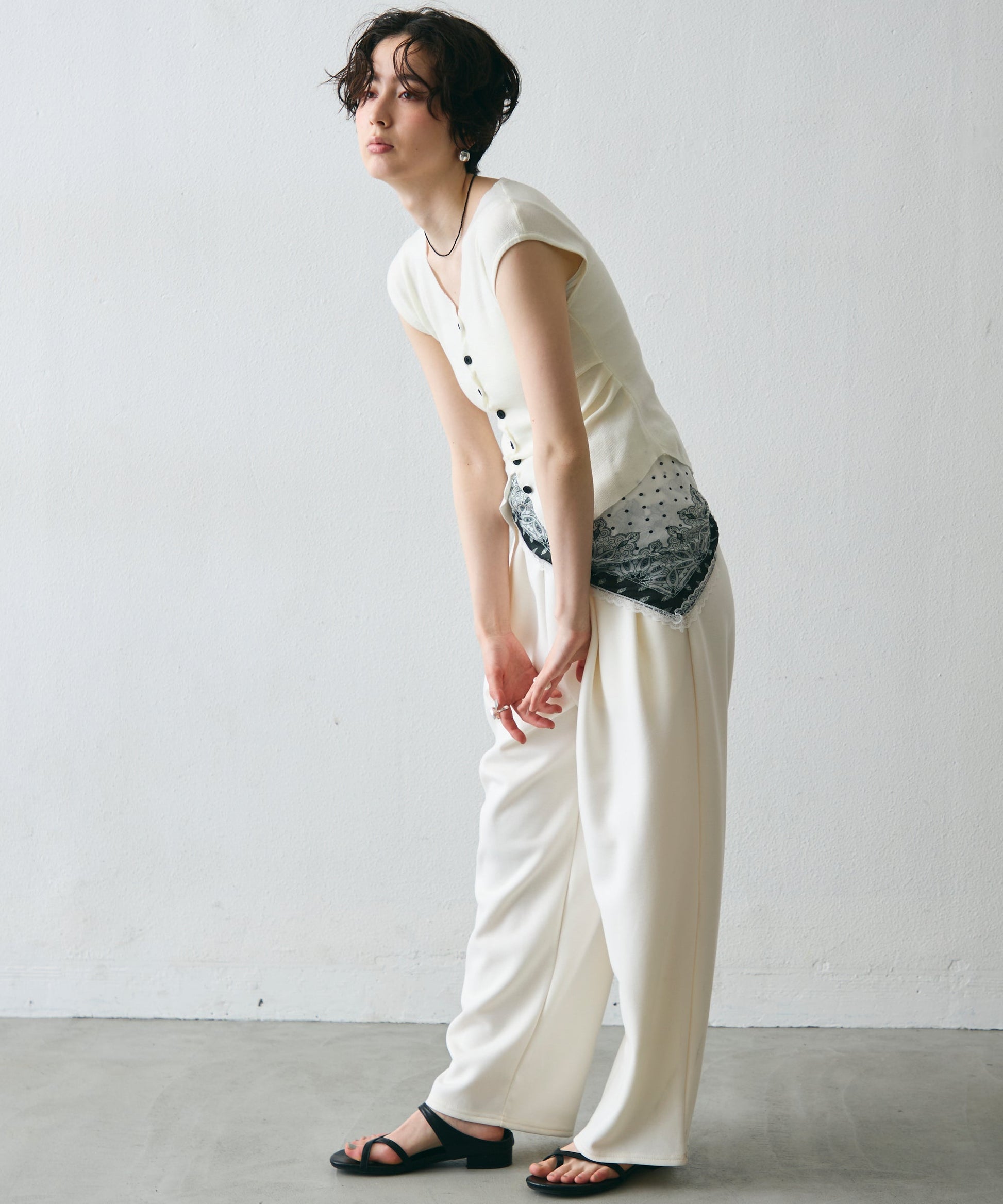 クロスしたボタンデザインがさりげないアクセントになるフレンチスリーブニット。