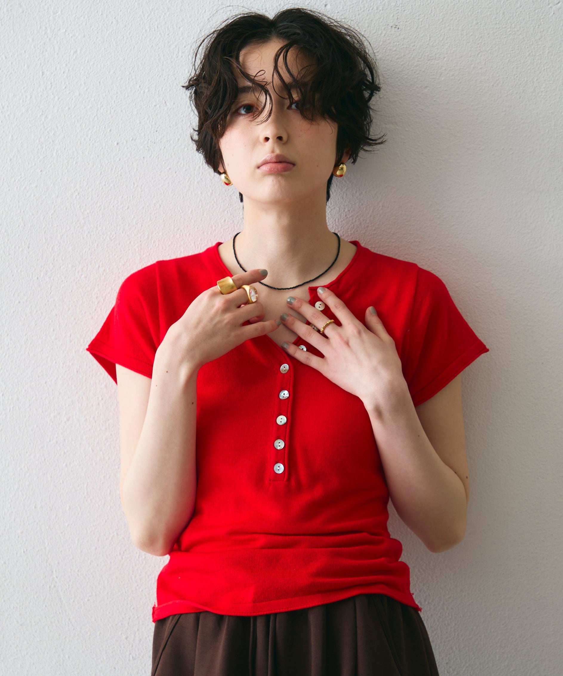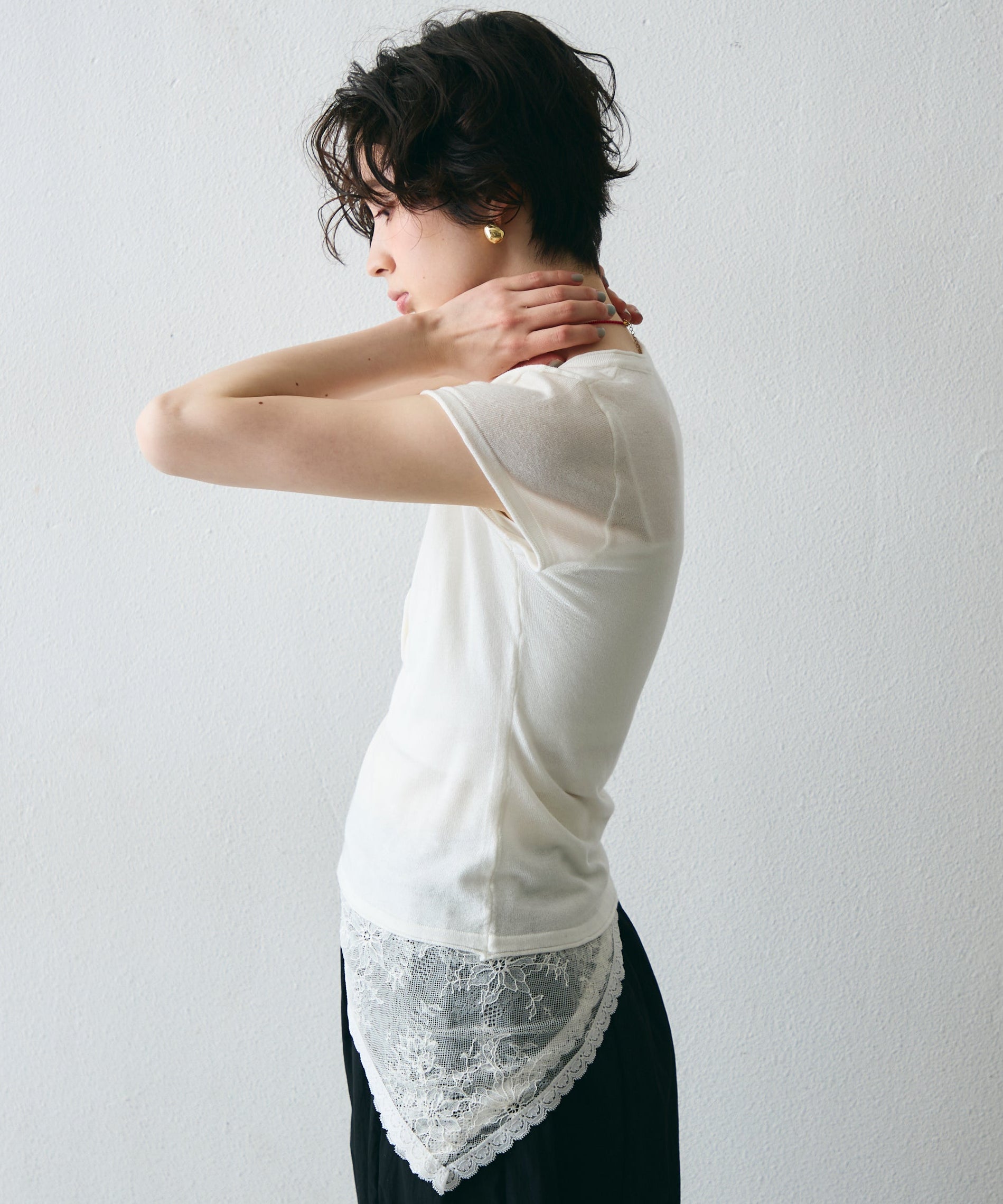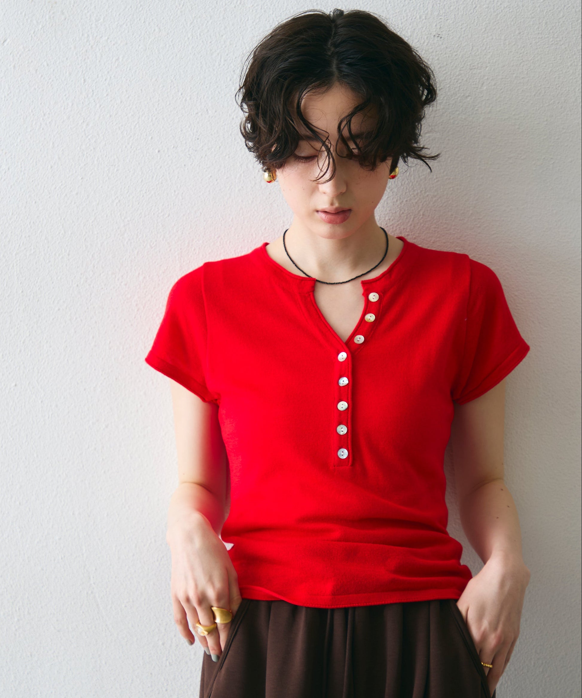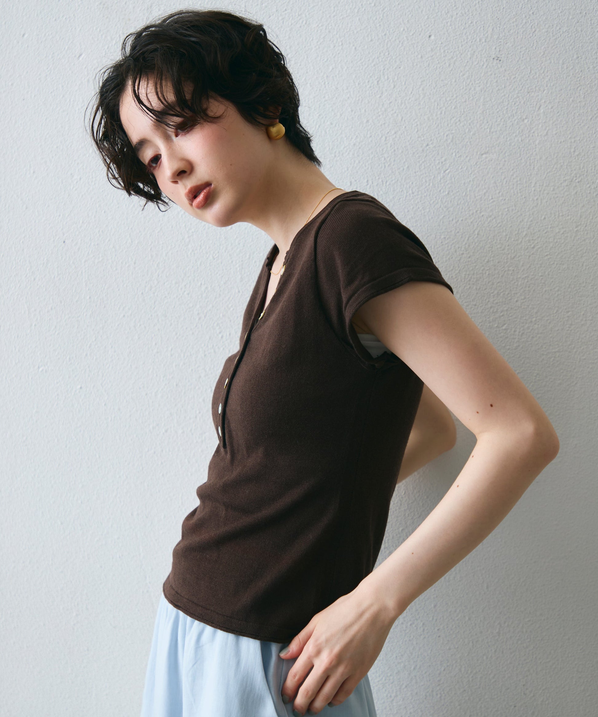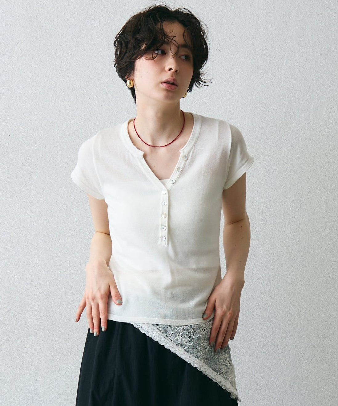 キーネックの抜け感とキャプスリーブの軽さが、大人のこなれ感をプラス
