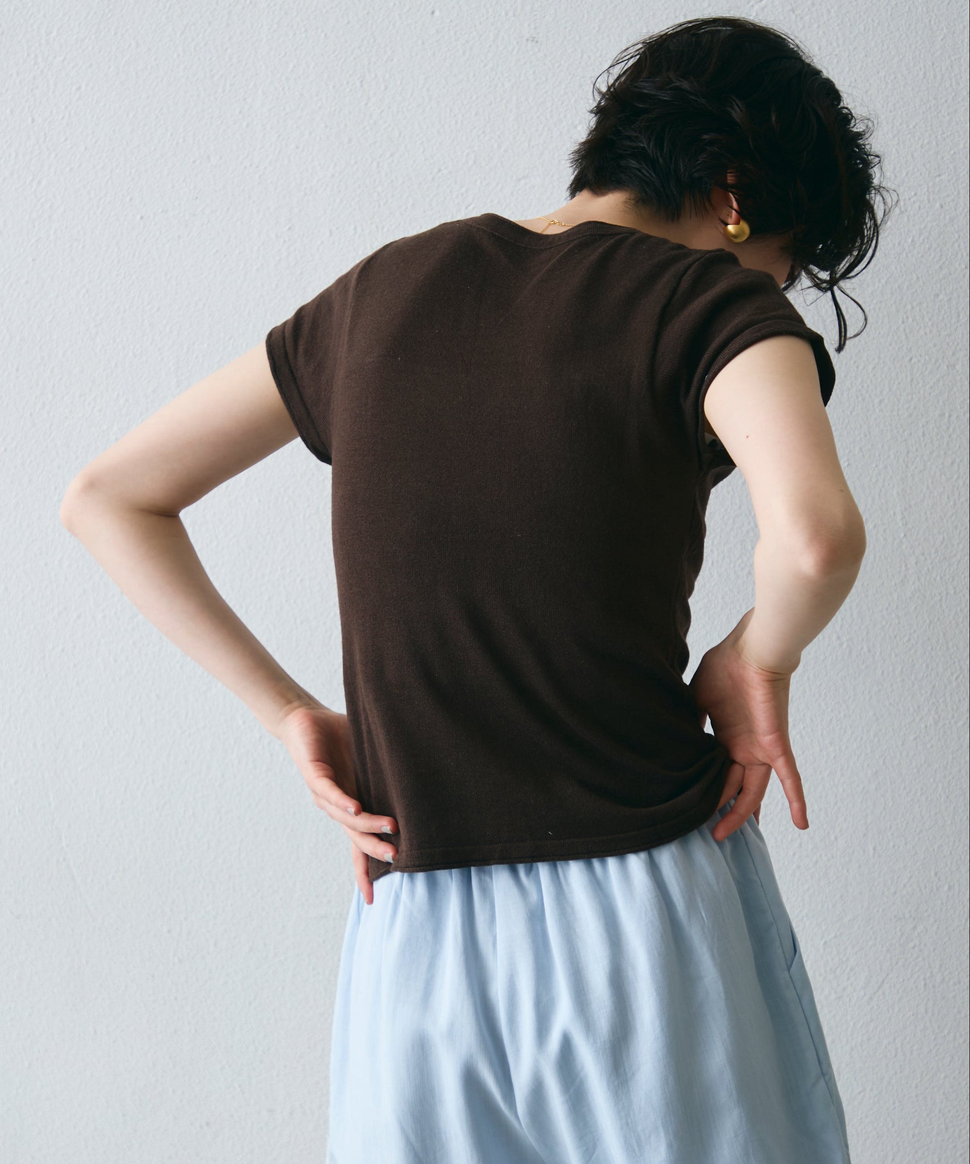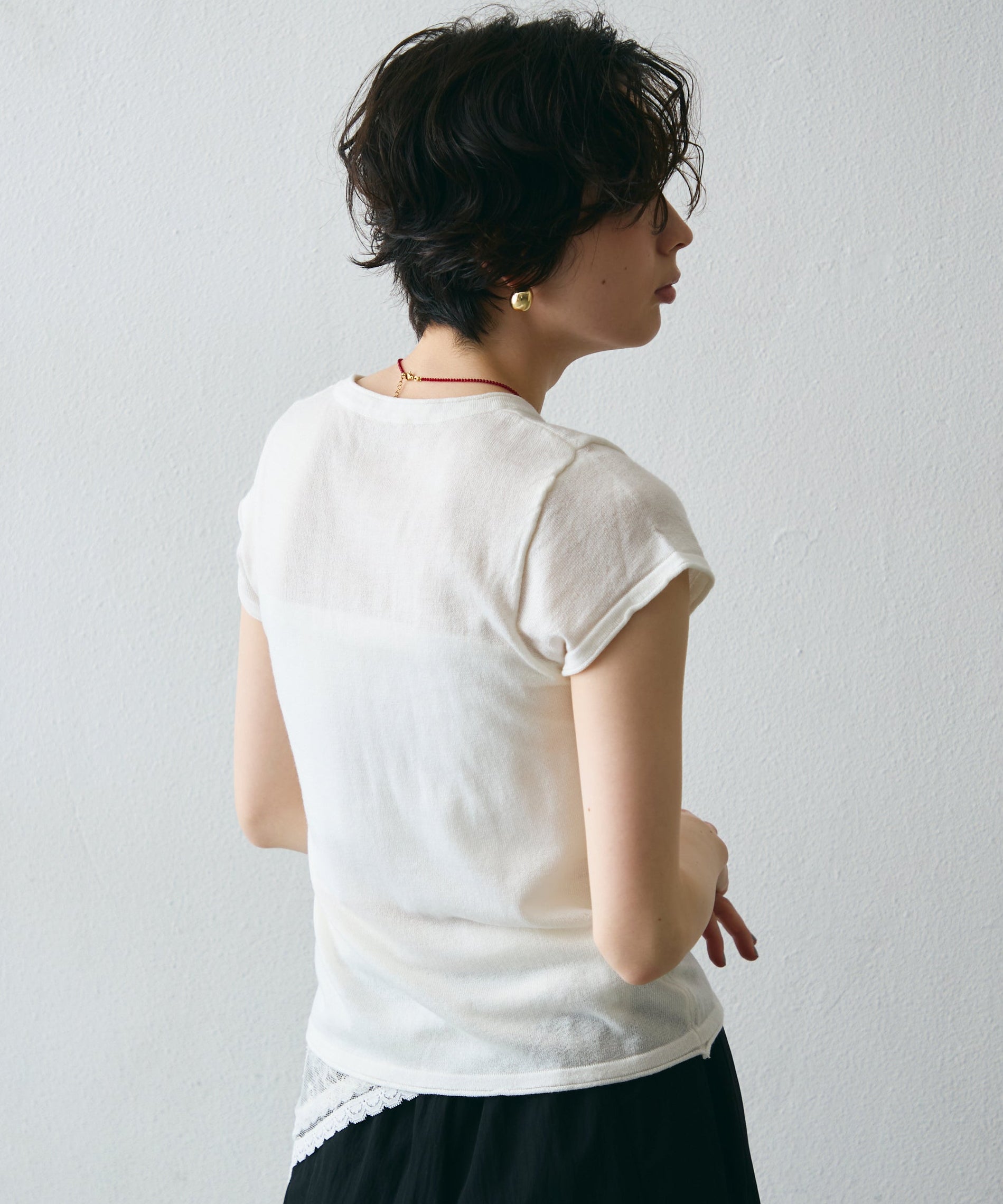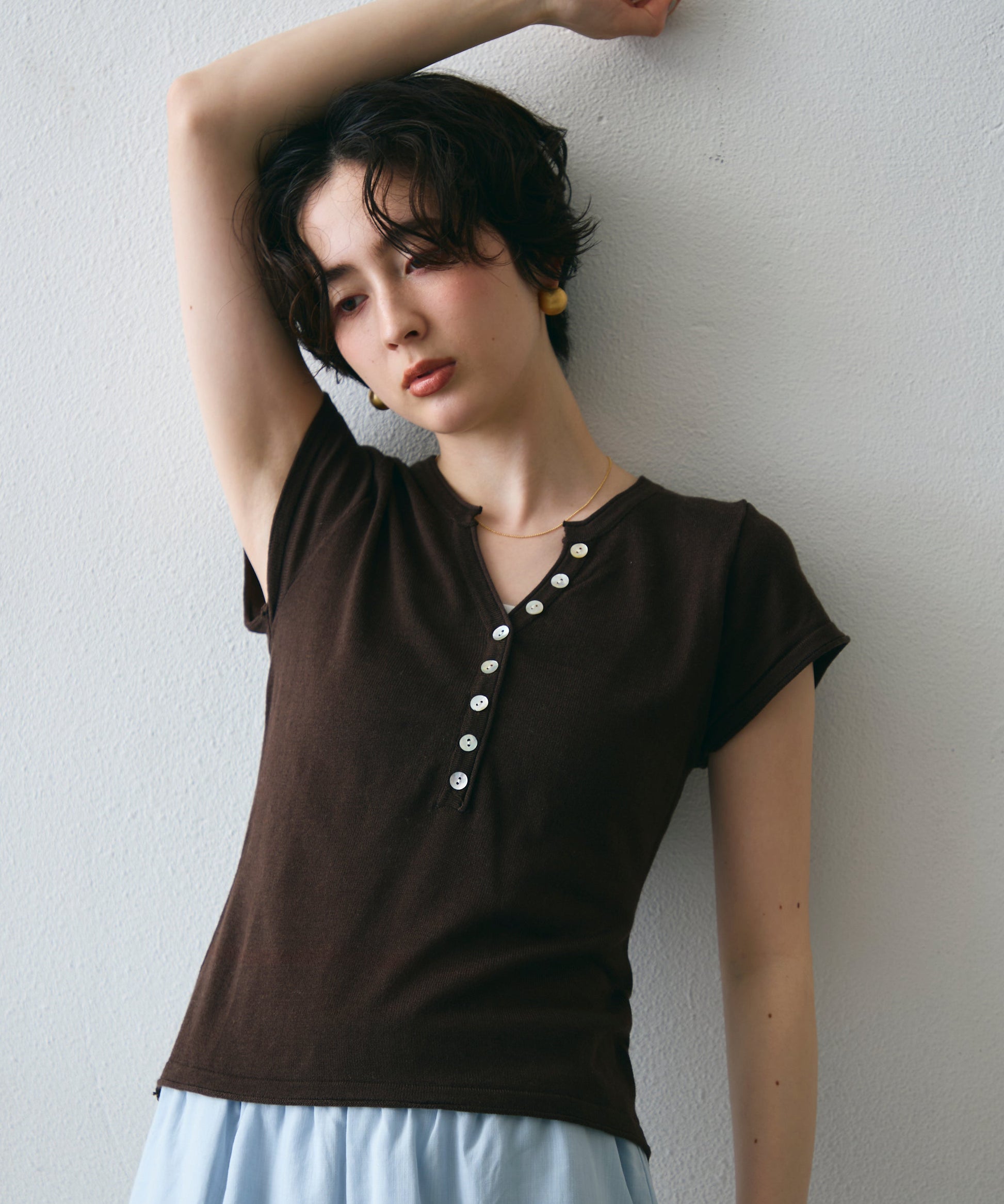 キーネックがデコルテをすっきり見せるキャプスリーブニット。