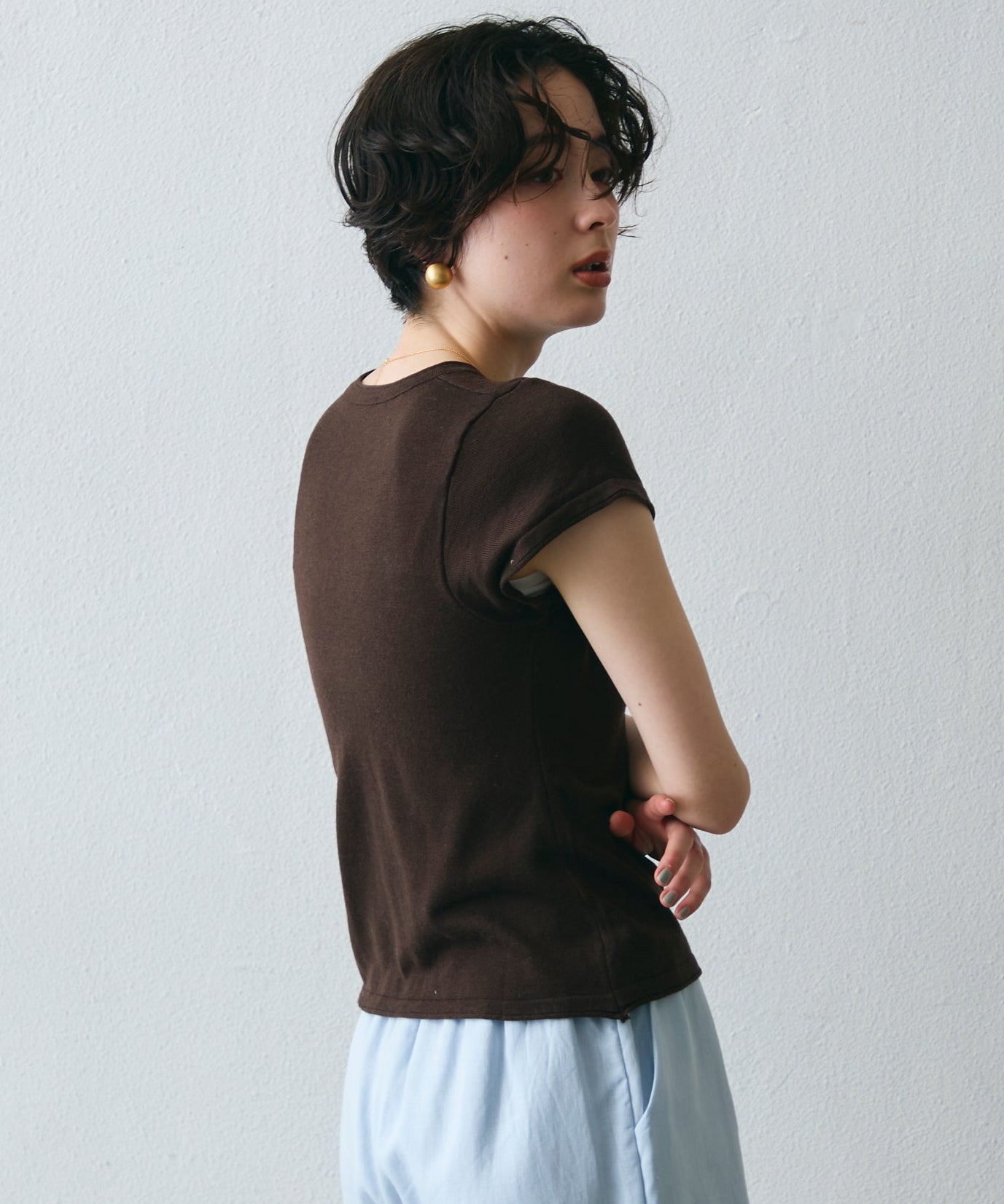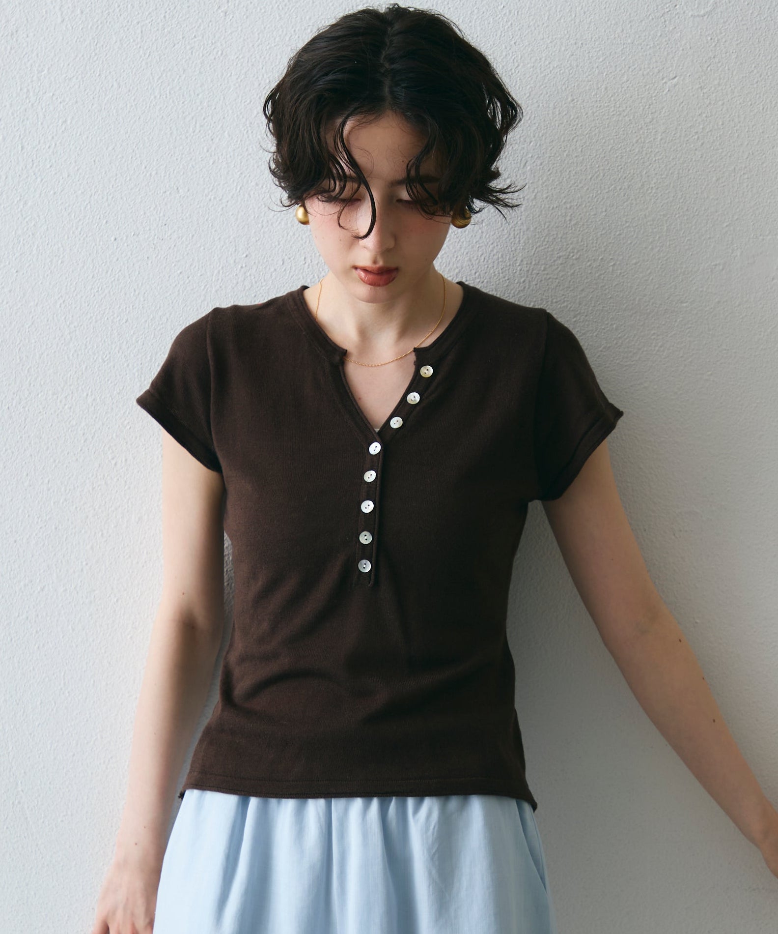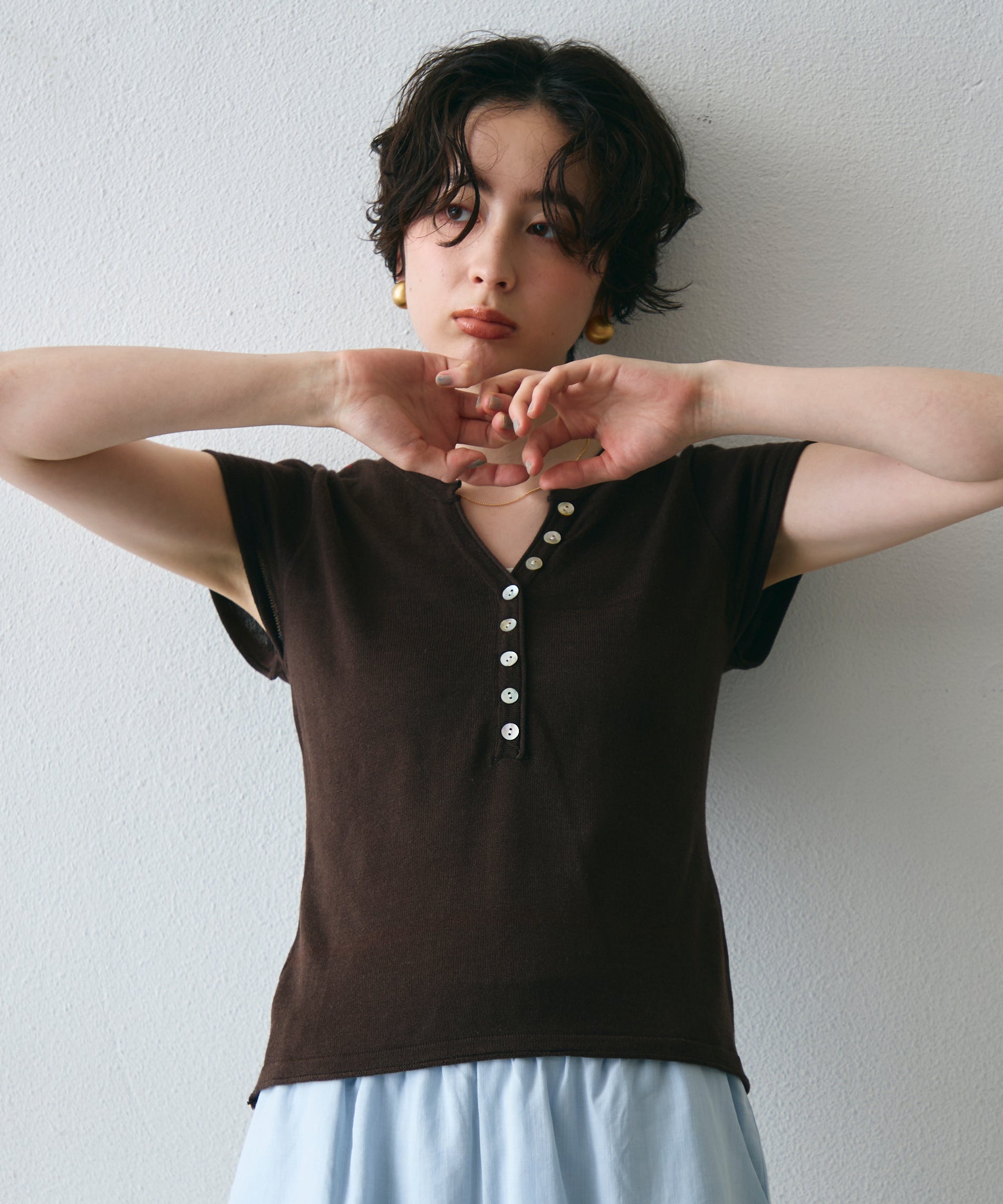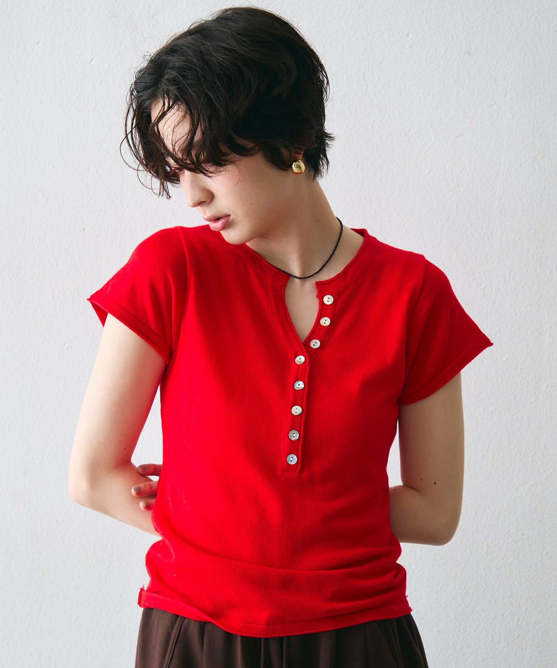 キーネックがデコルテをすっきり見せるキャプスリーブニット。