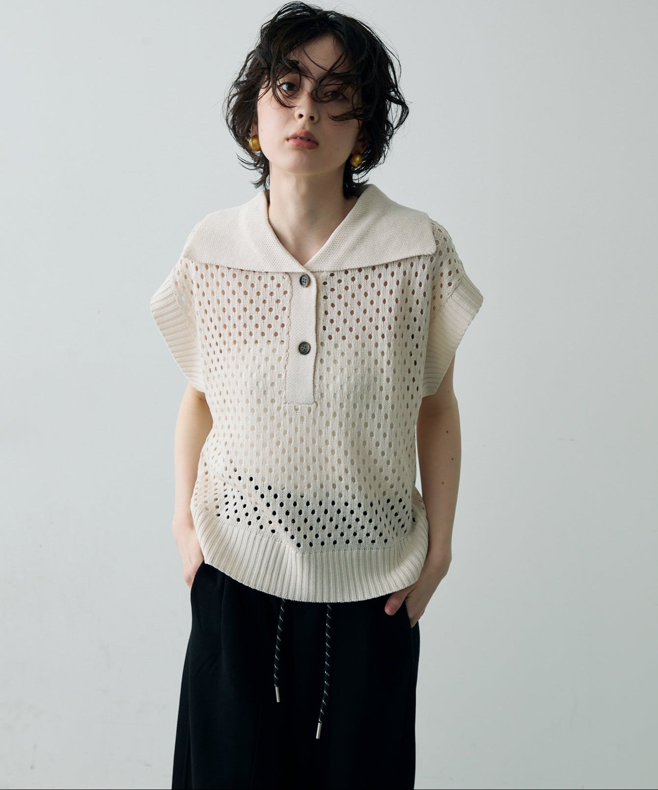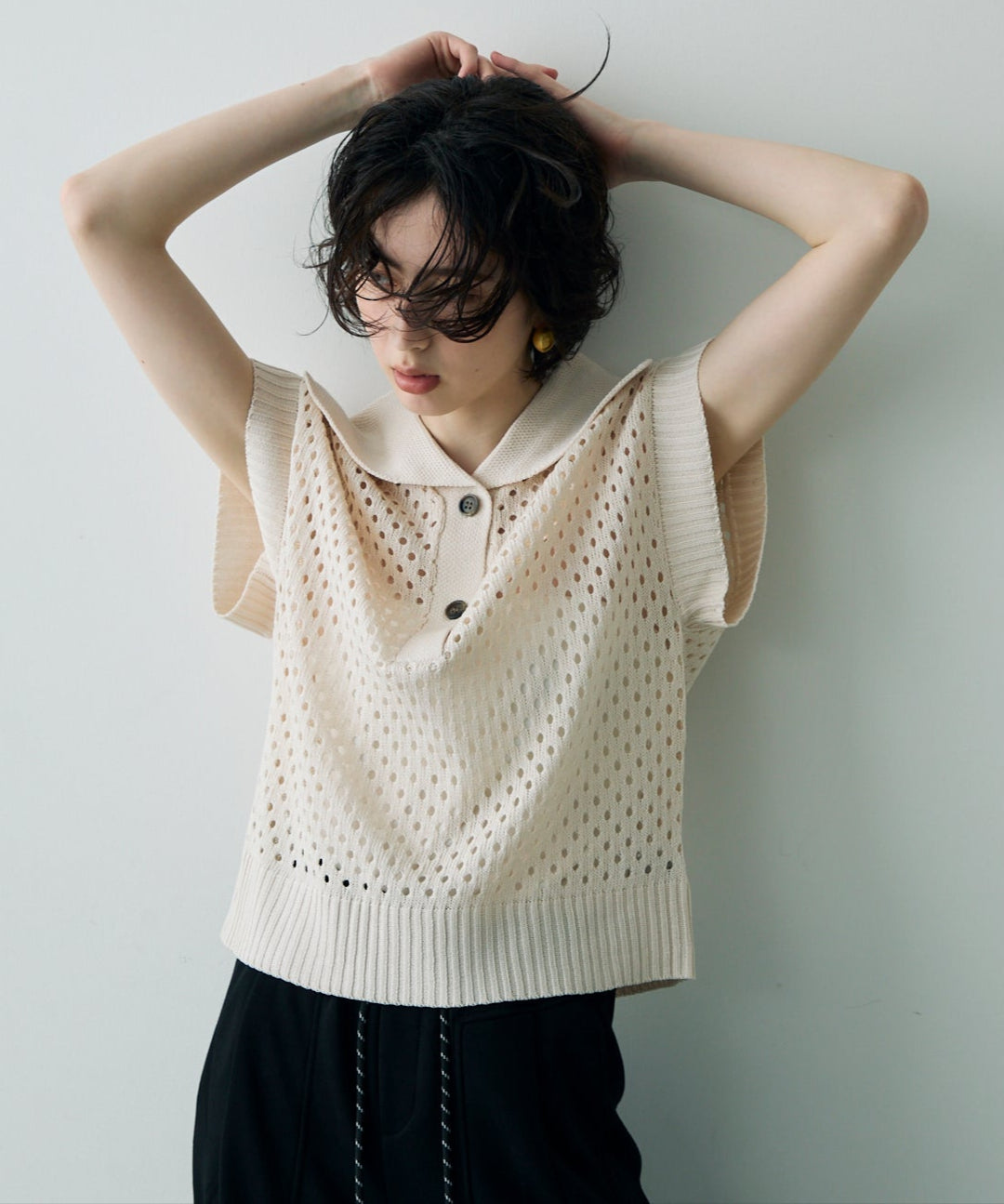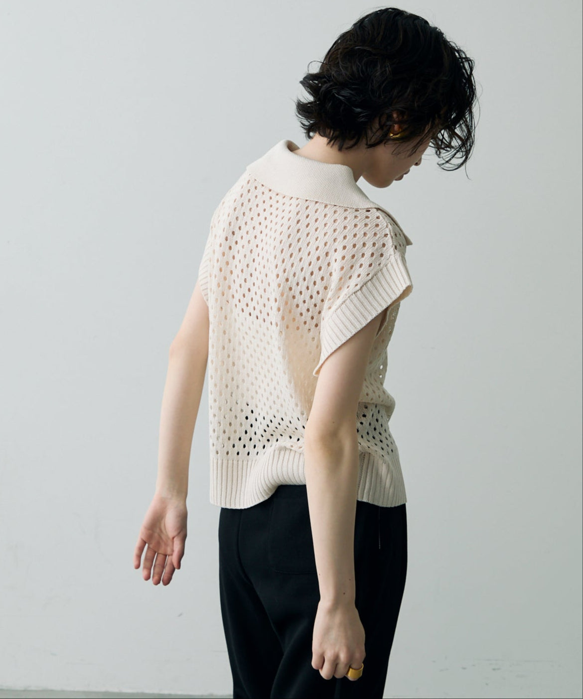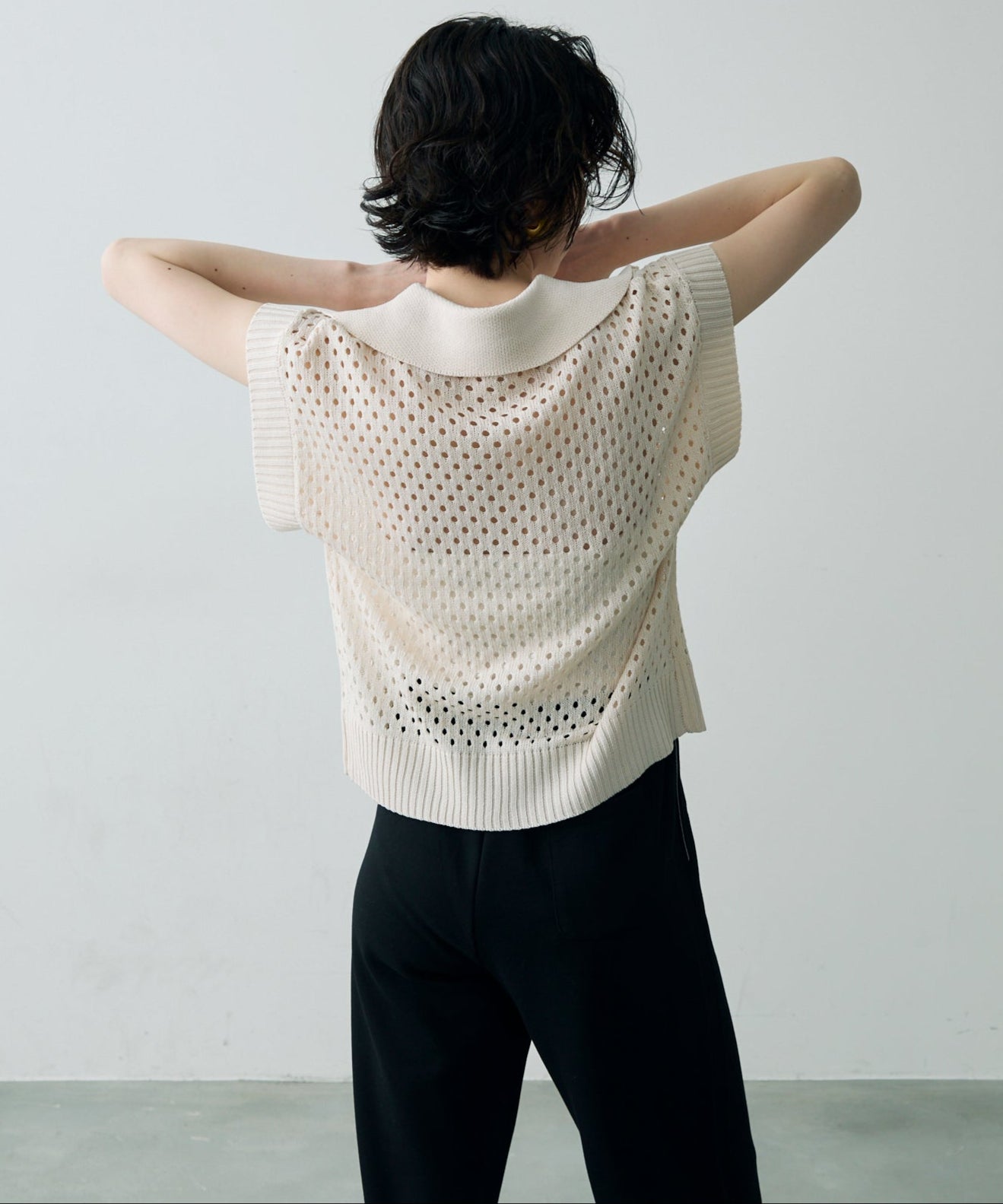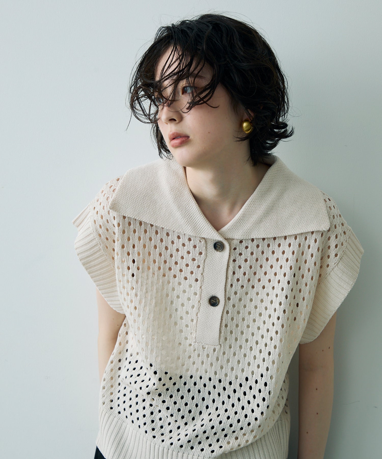 ざっくり編まれたボディに、大きめの襟が特徴のニットポロ。
