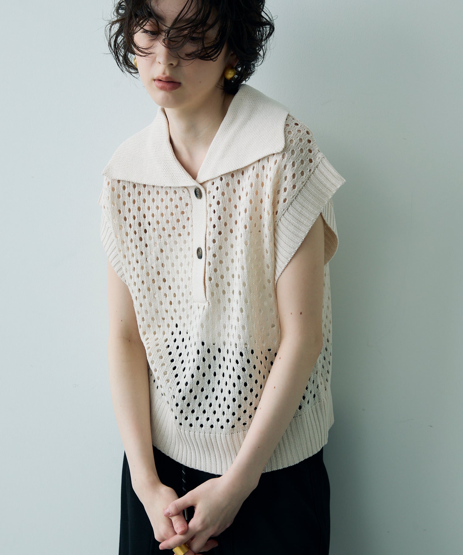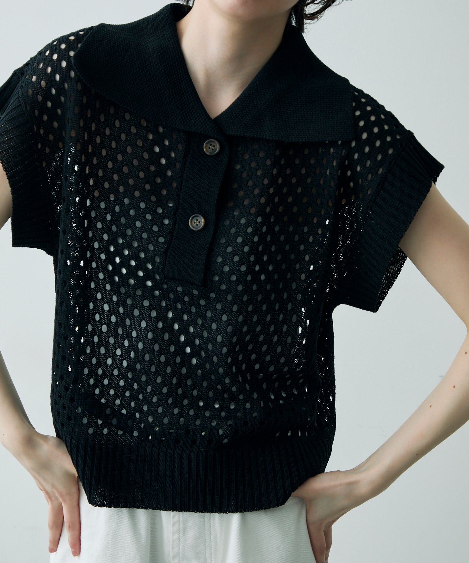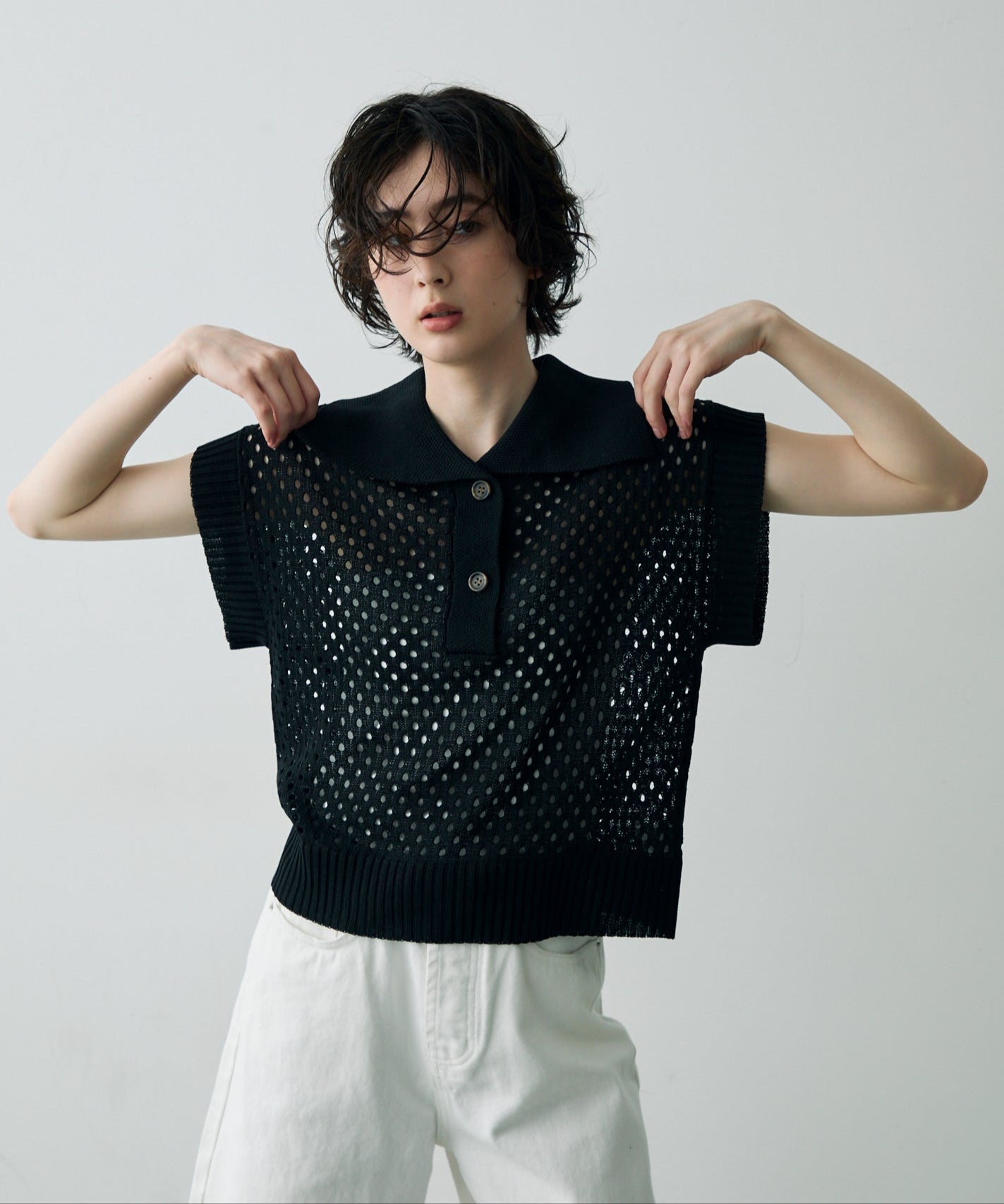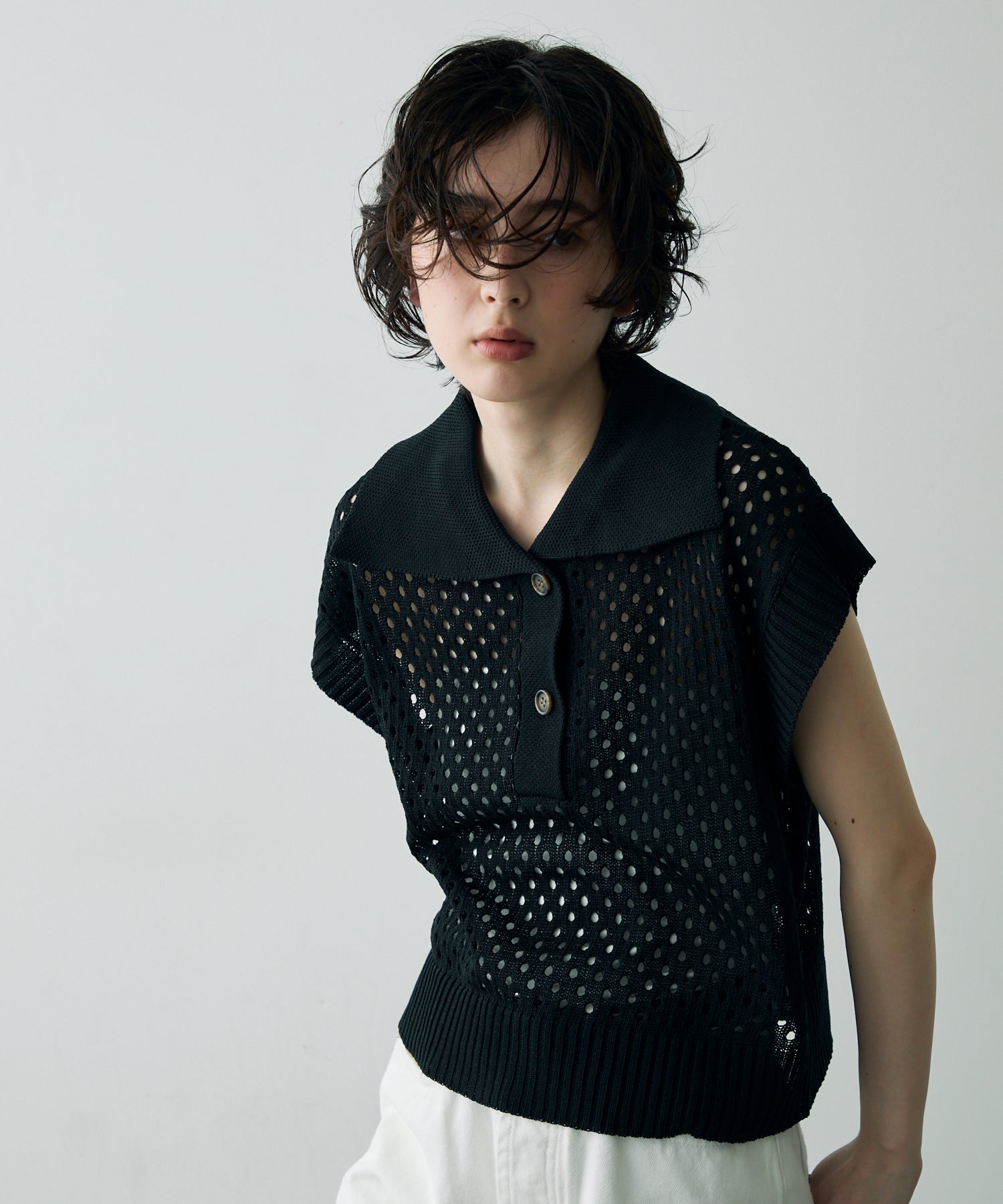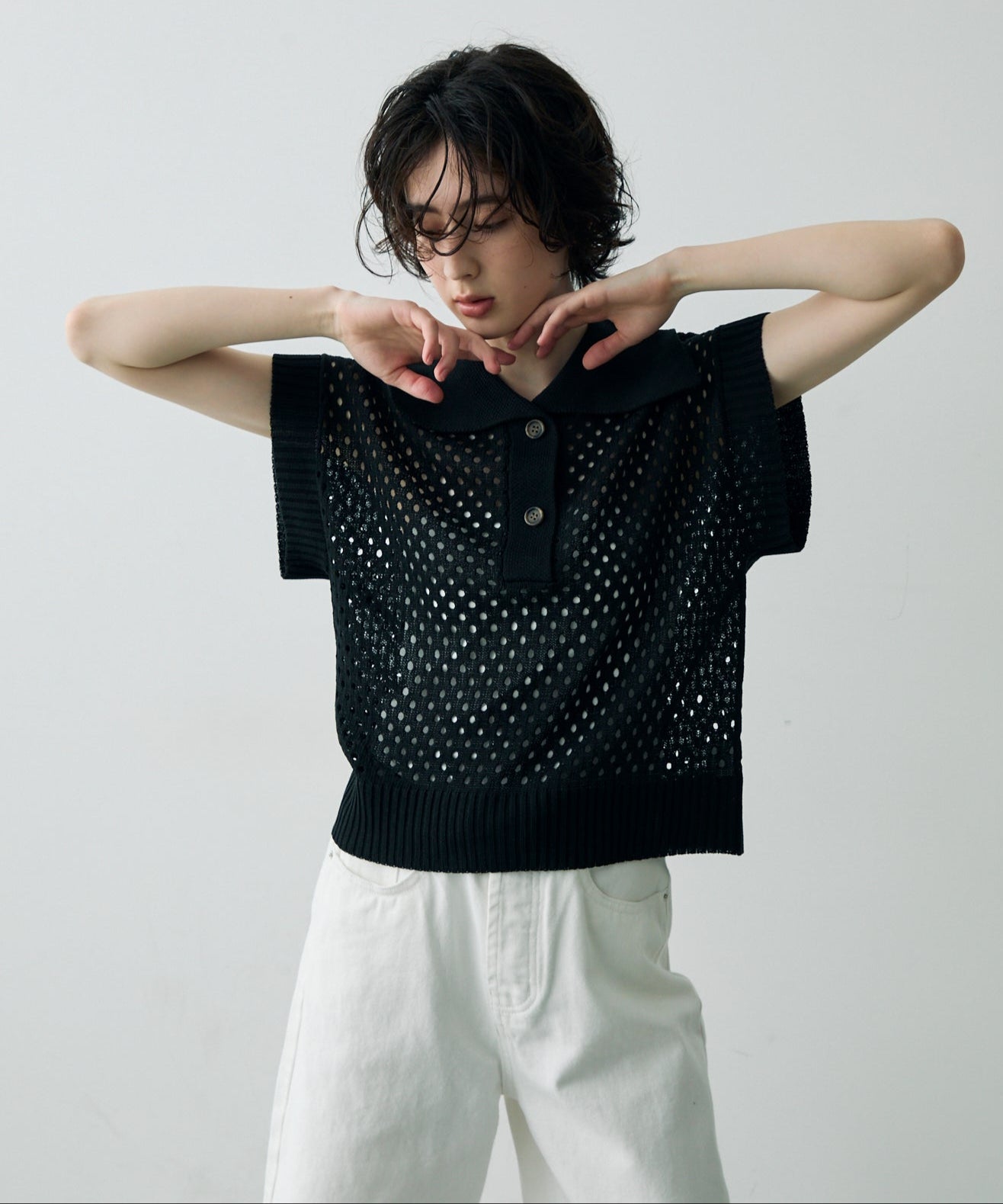 ざっくり編まれたボディに、大きめの襟が特徴のニットポロ。