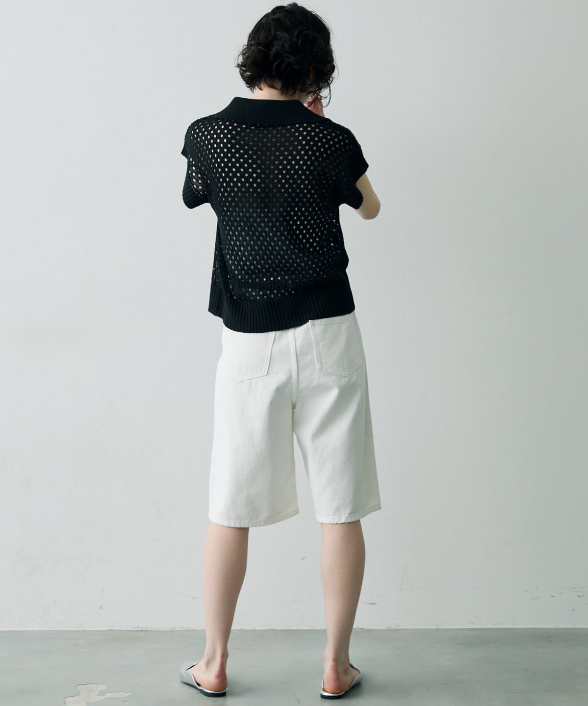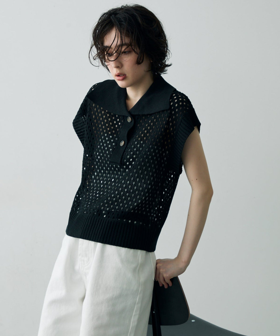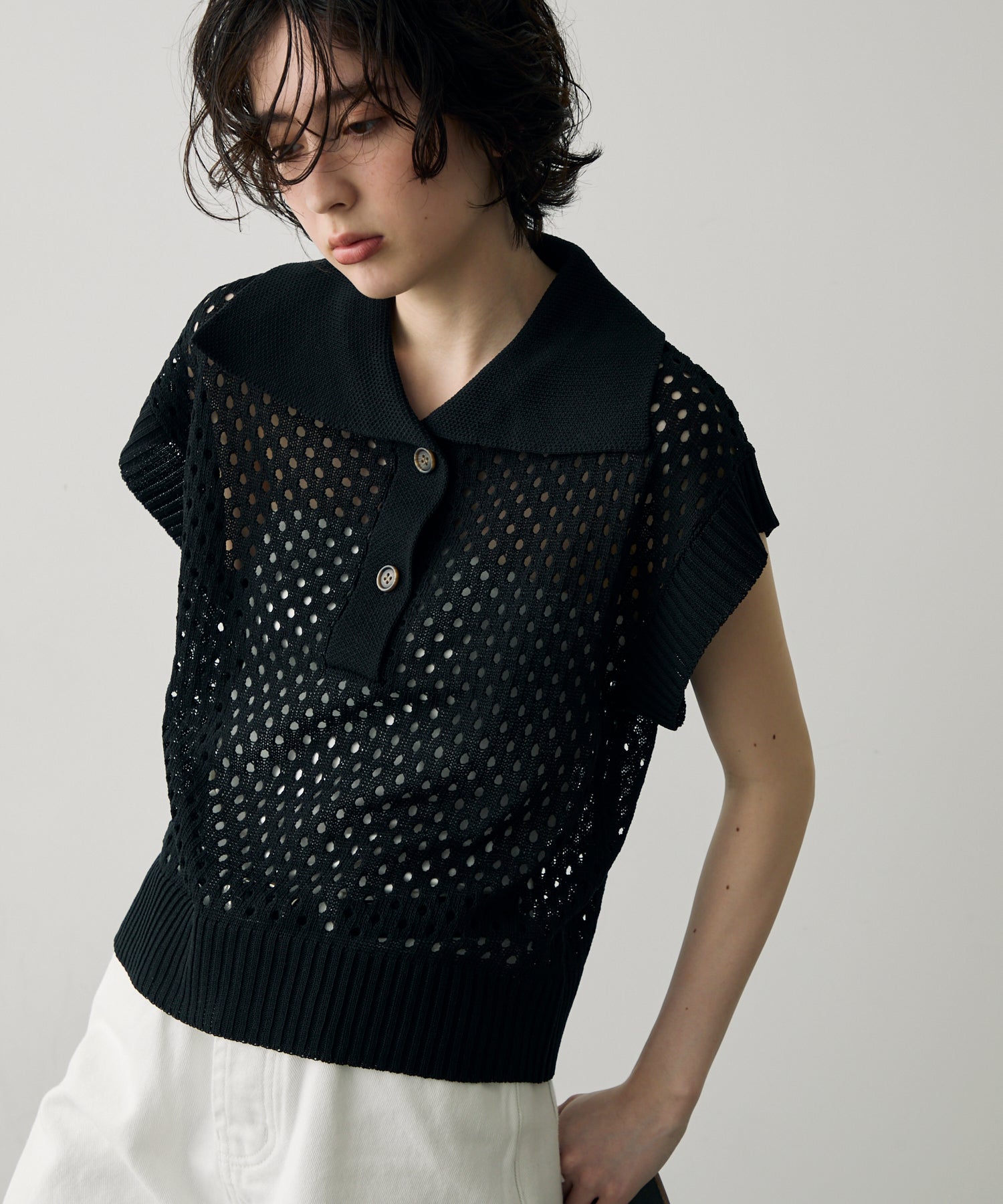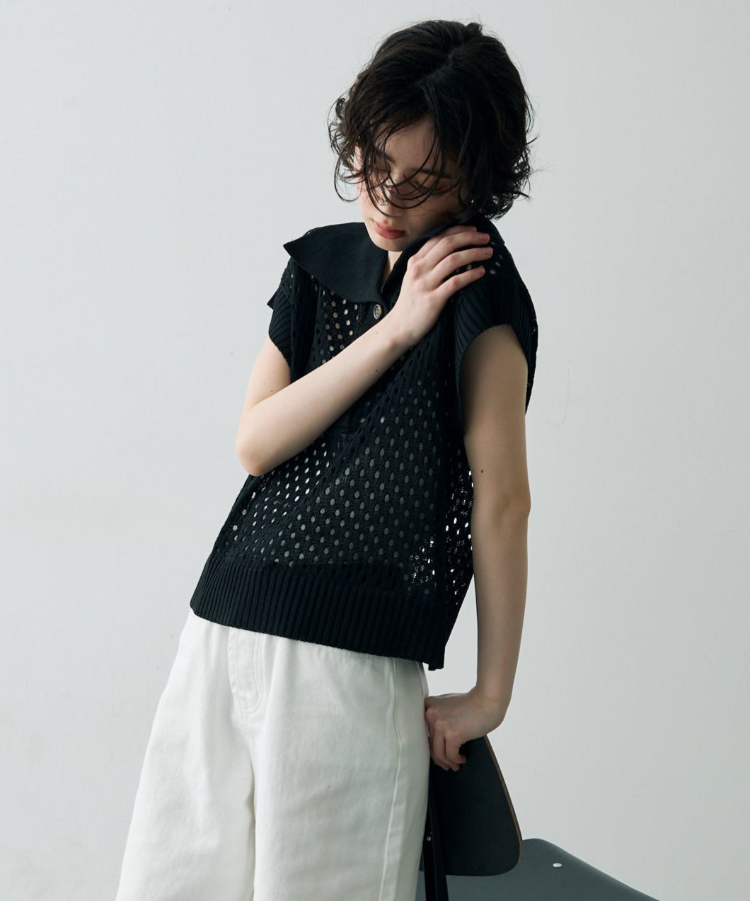 ざっくり編まれたボディに、大きめの襟が特徴のニットポロ。