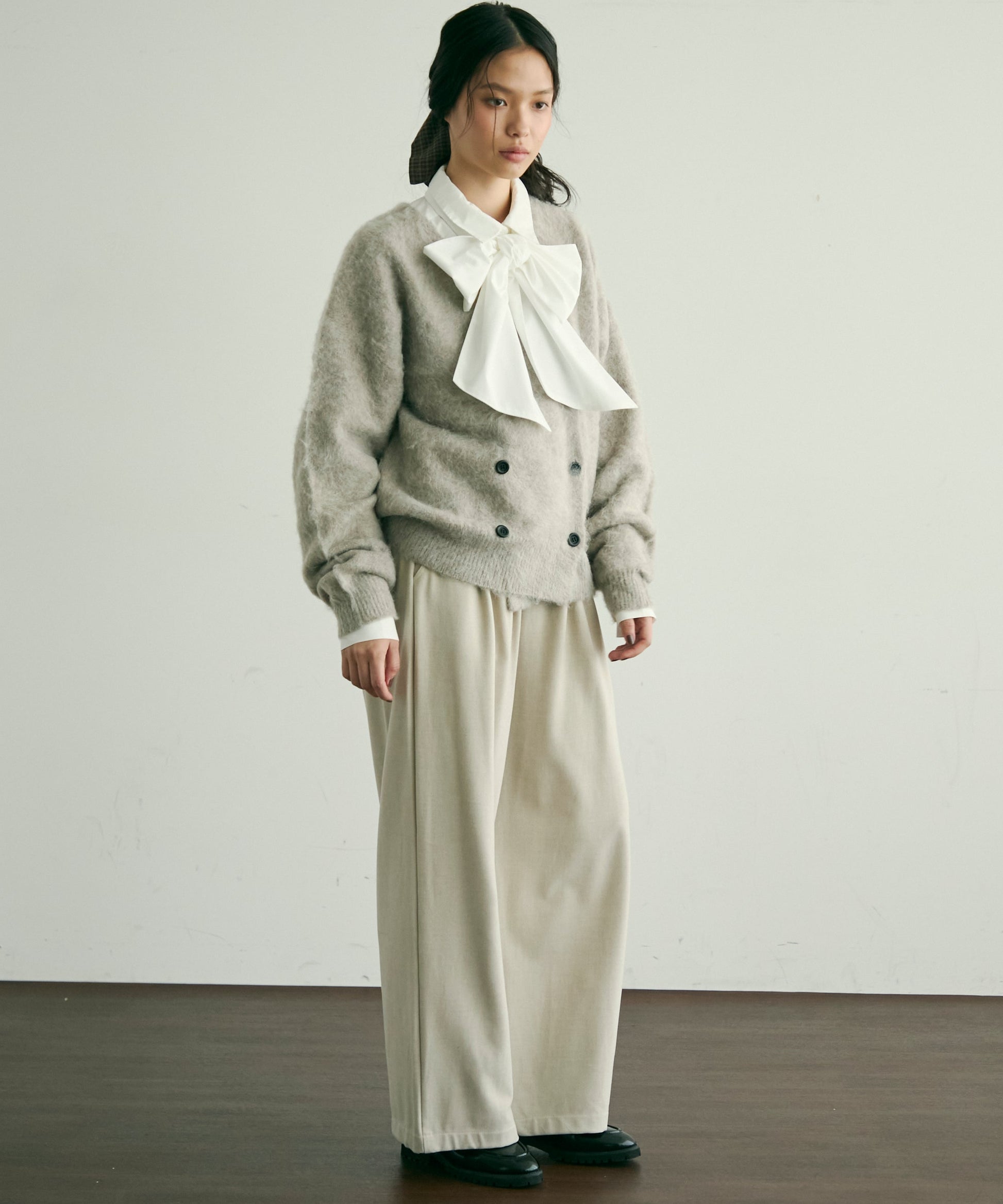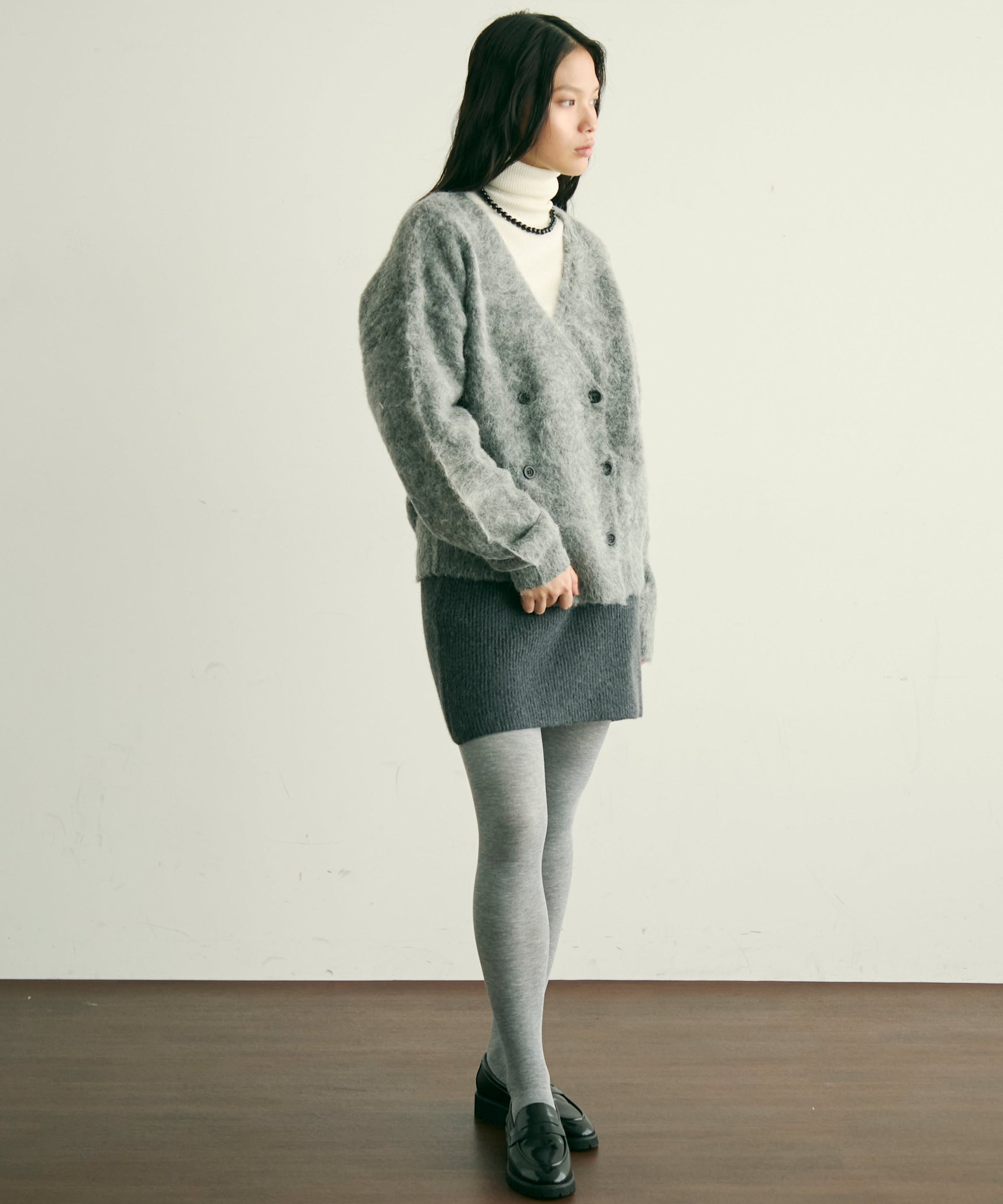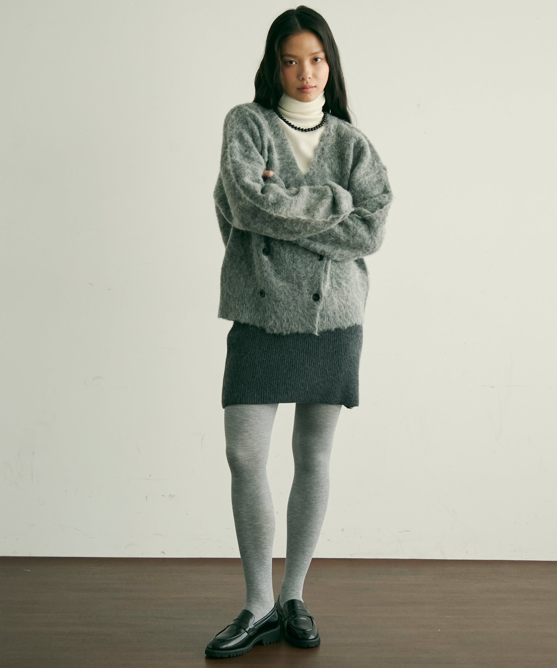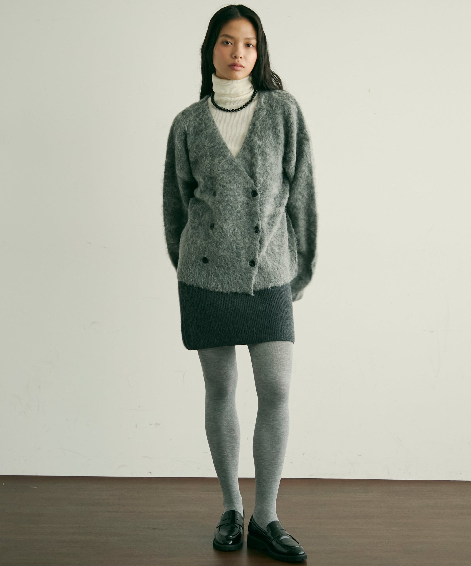 ふんわりとしたモヘアタッチ素材が魅力の、存在感たっぷりなダブルブレストカーディガン。