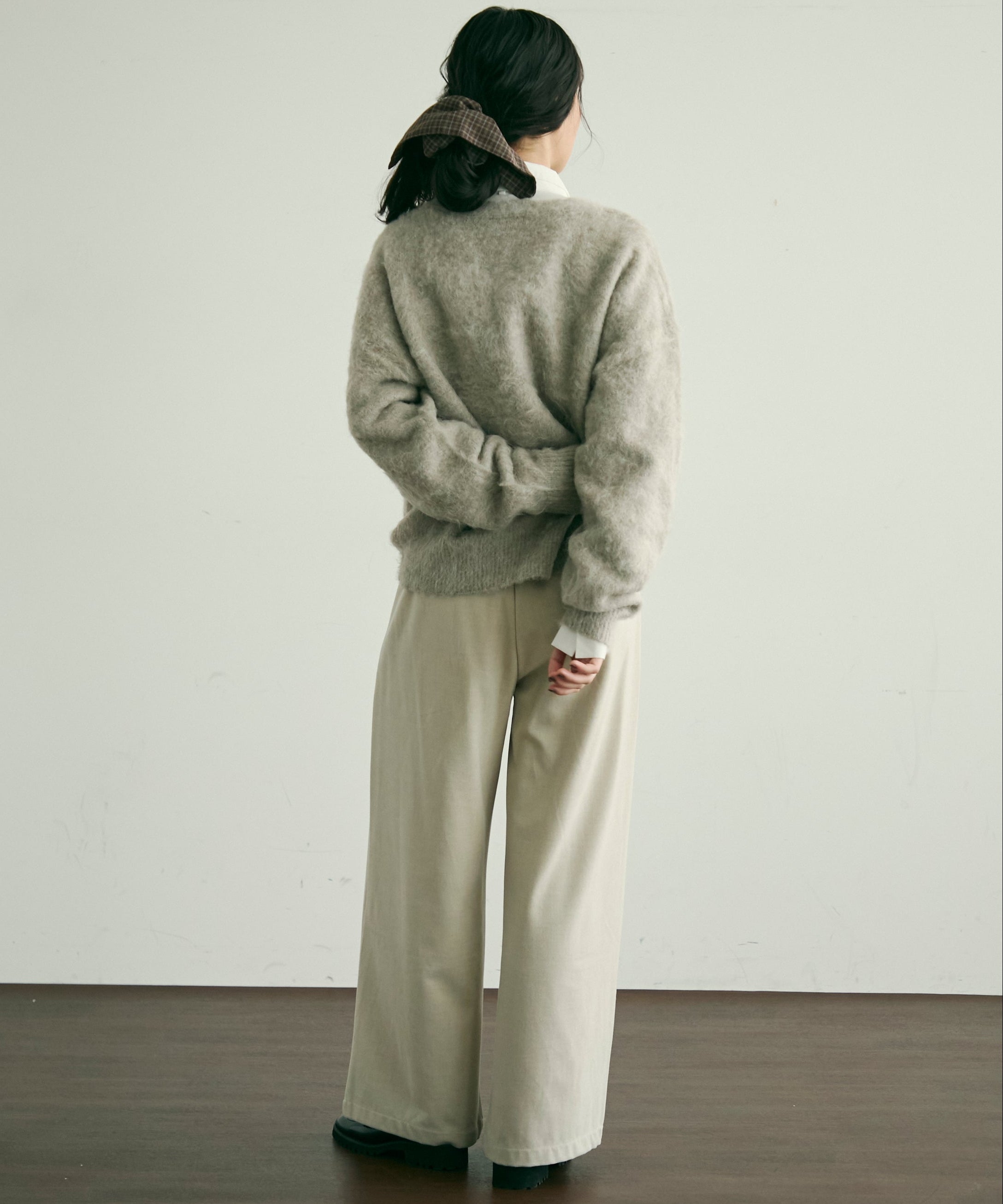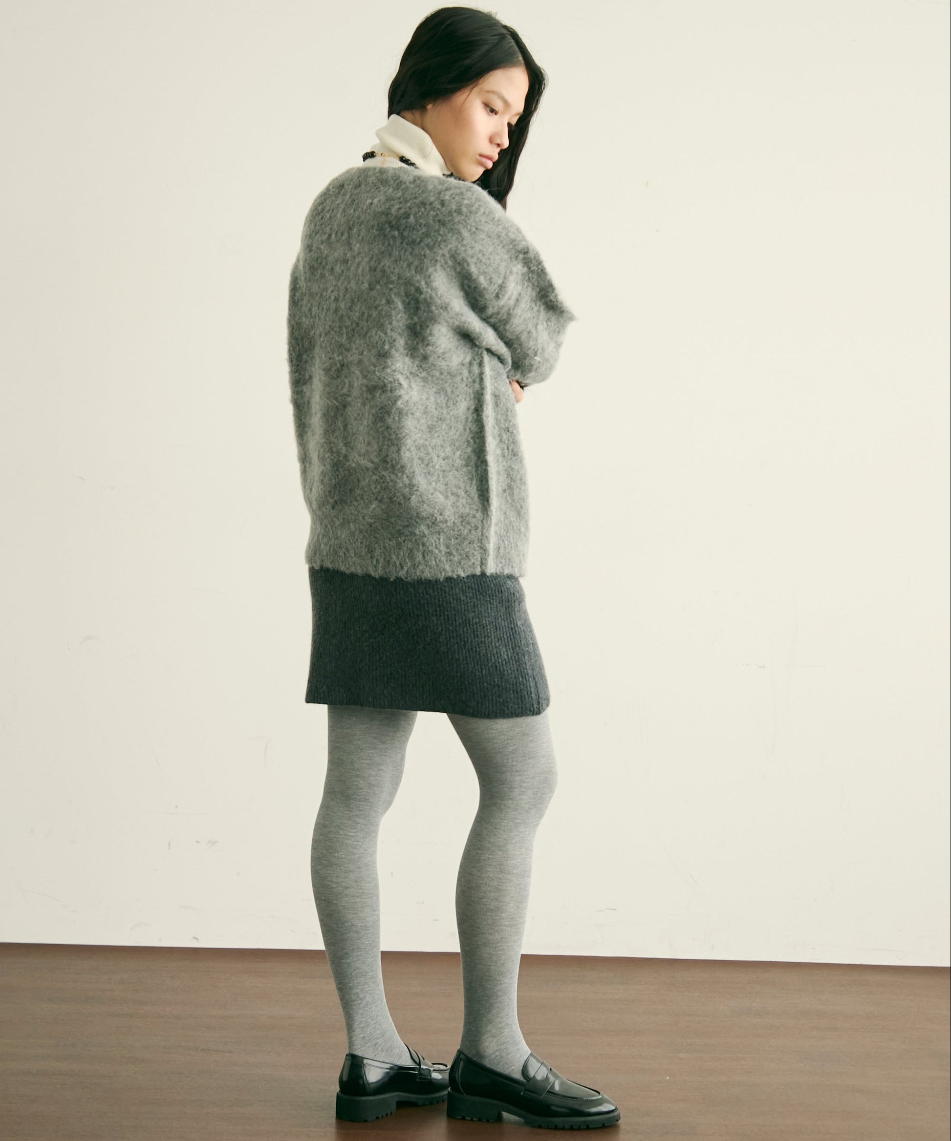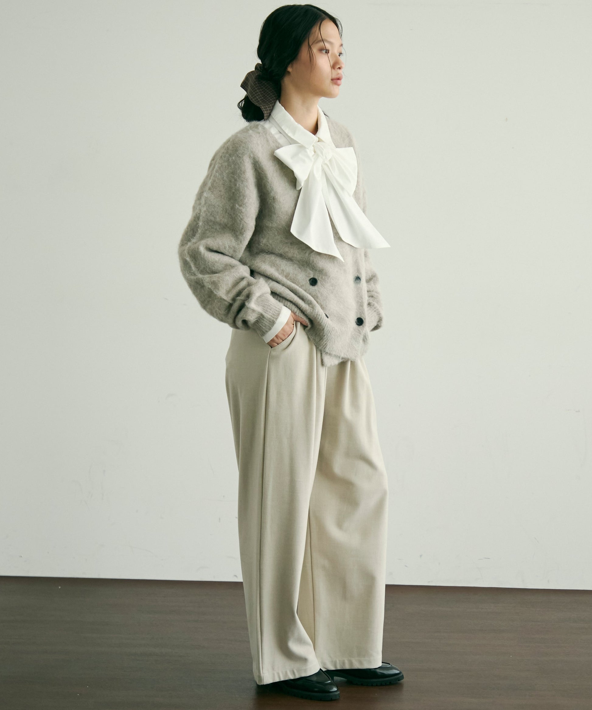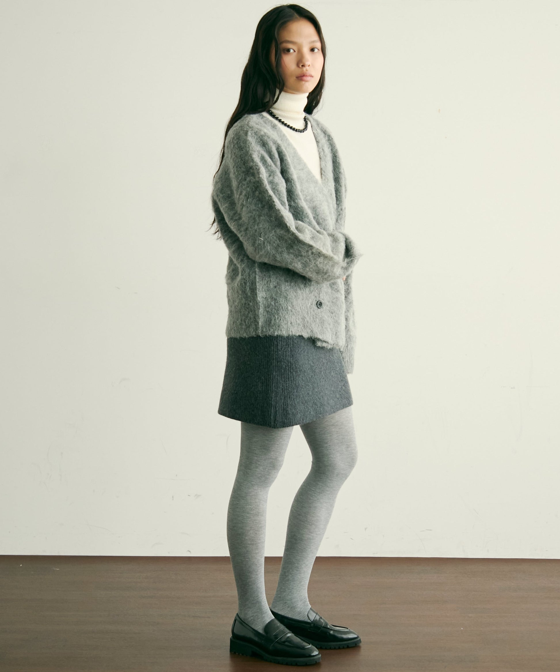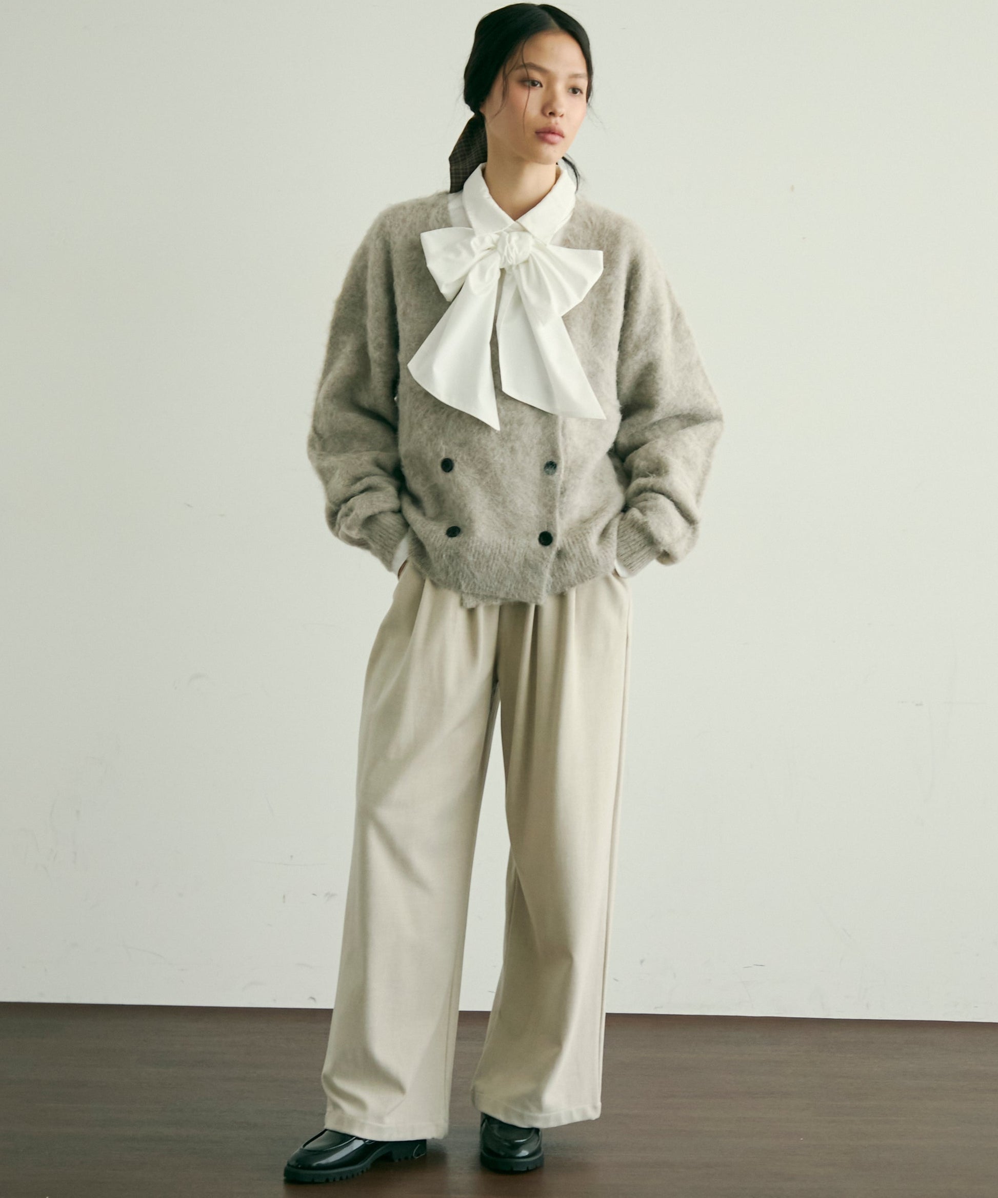 ふんわりとしたモヘアタッチ素材が魅力の、存在感たっぷりなダブルブレストカーディガン。