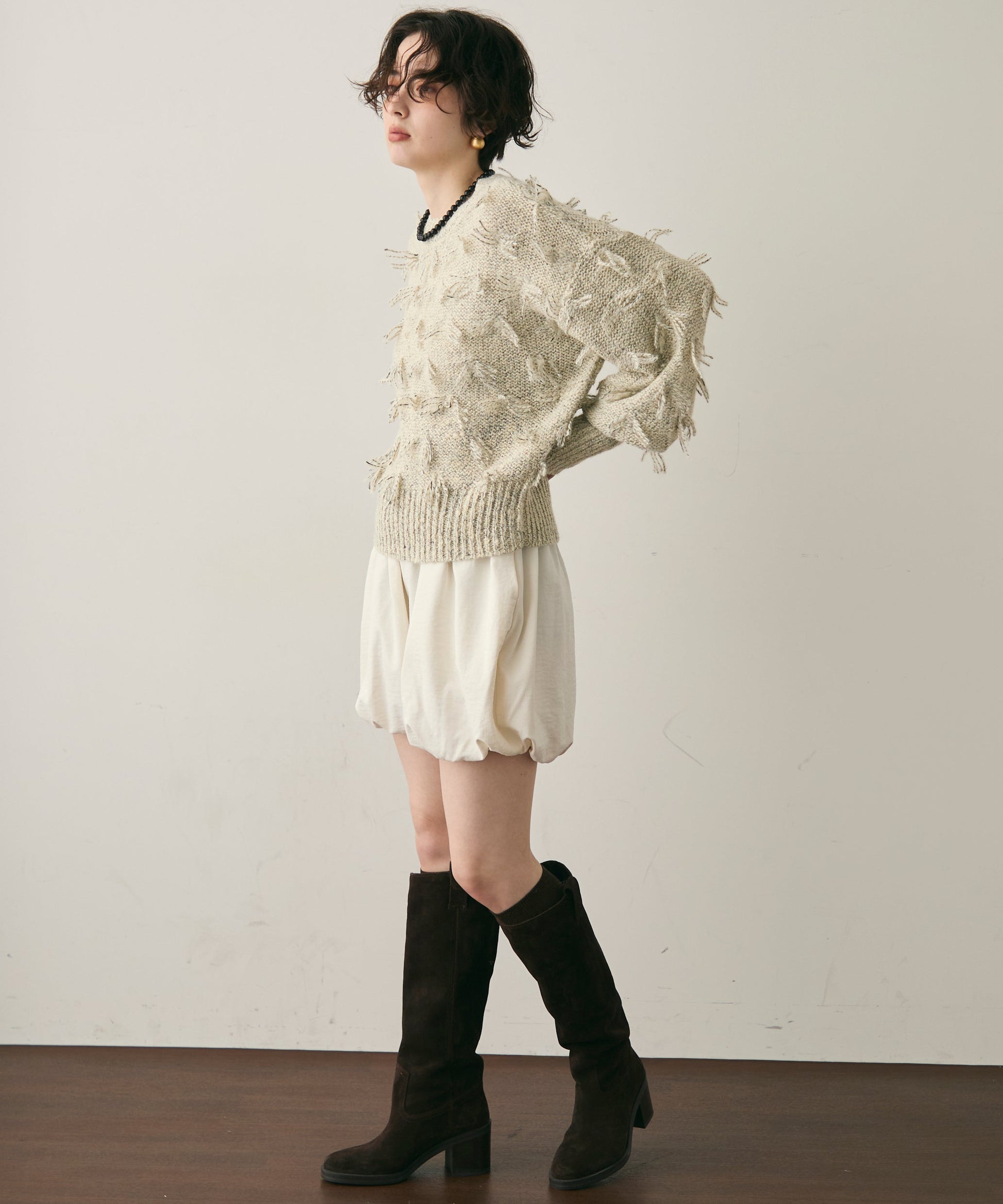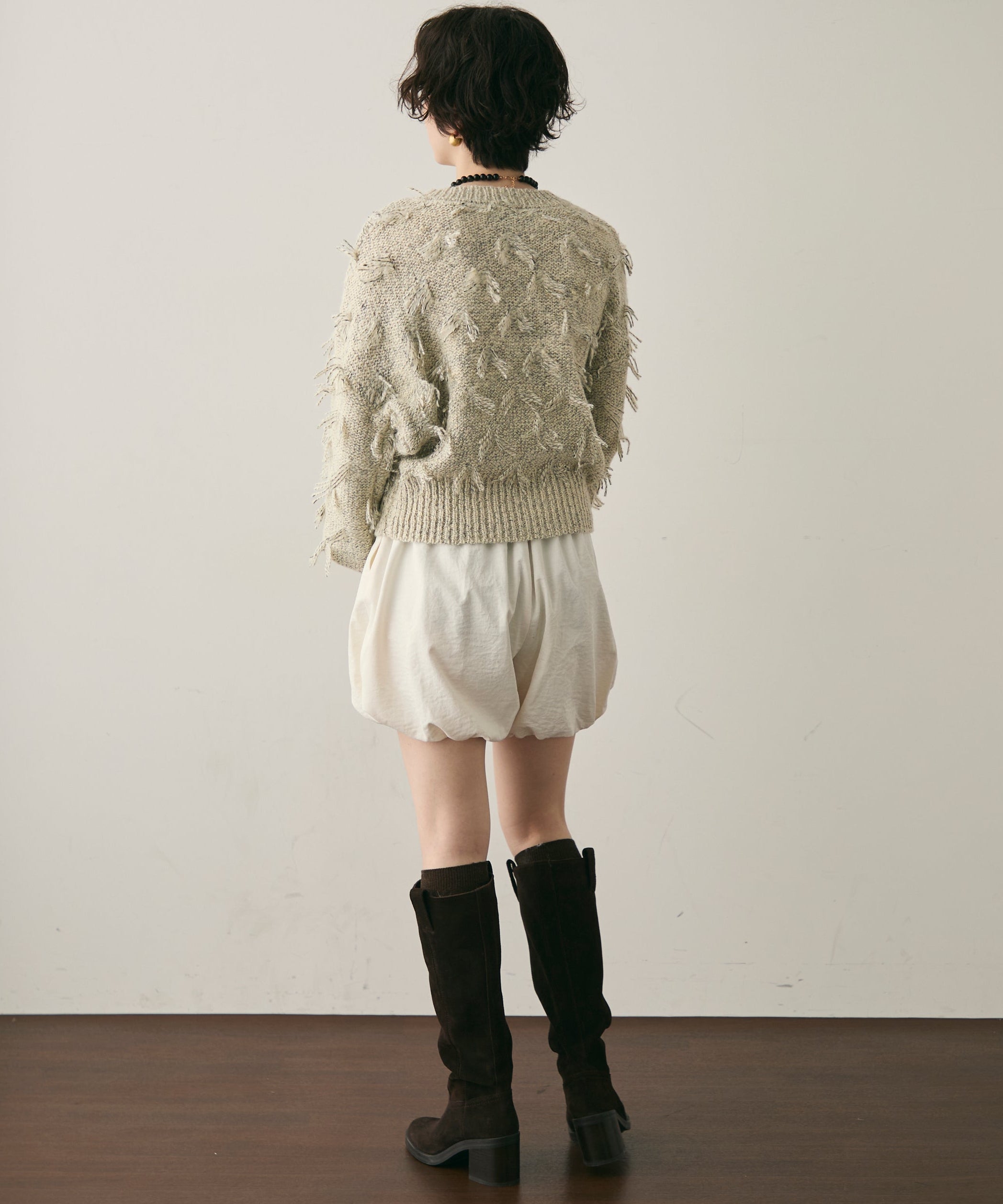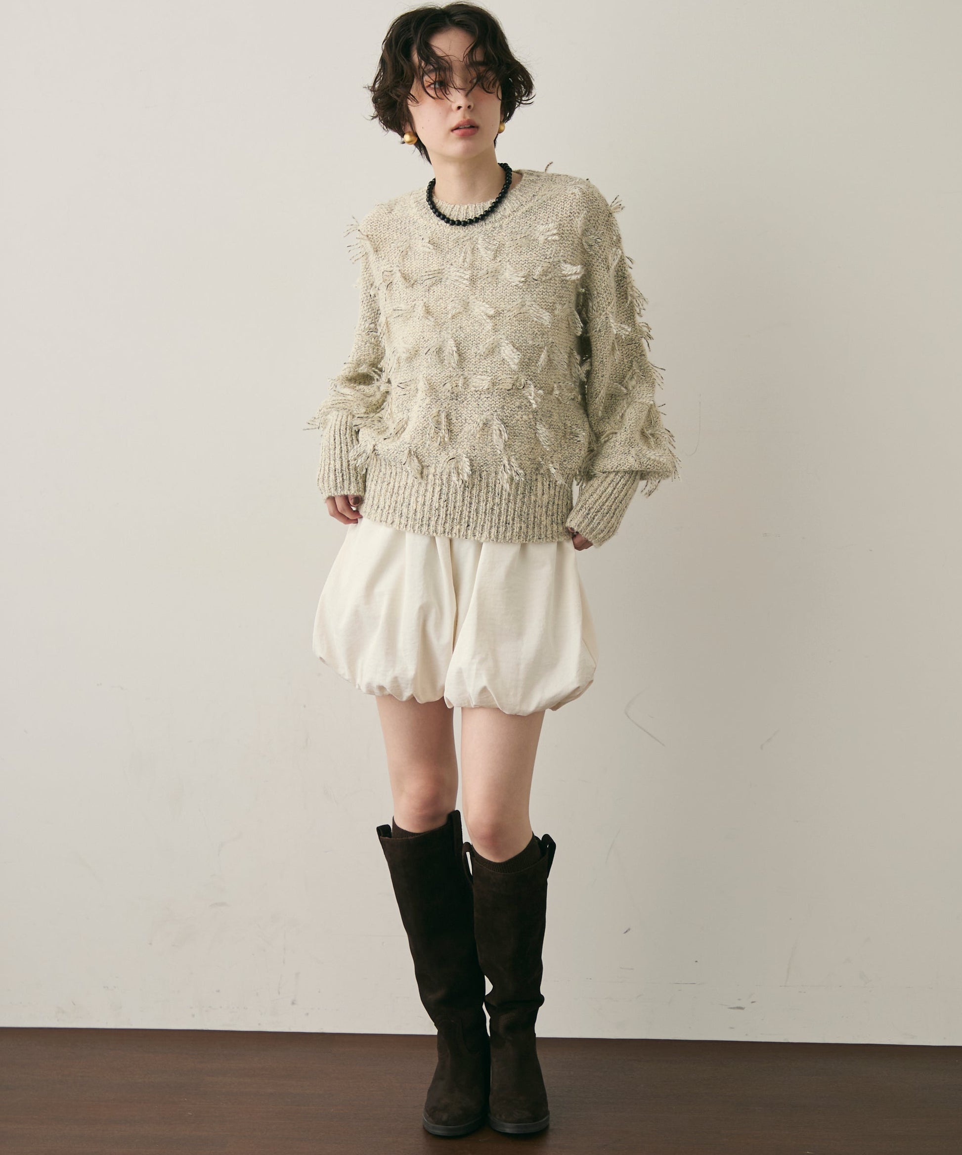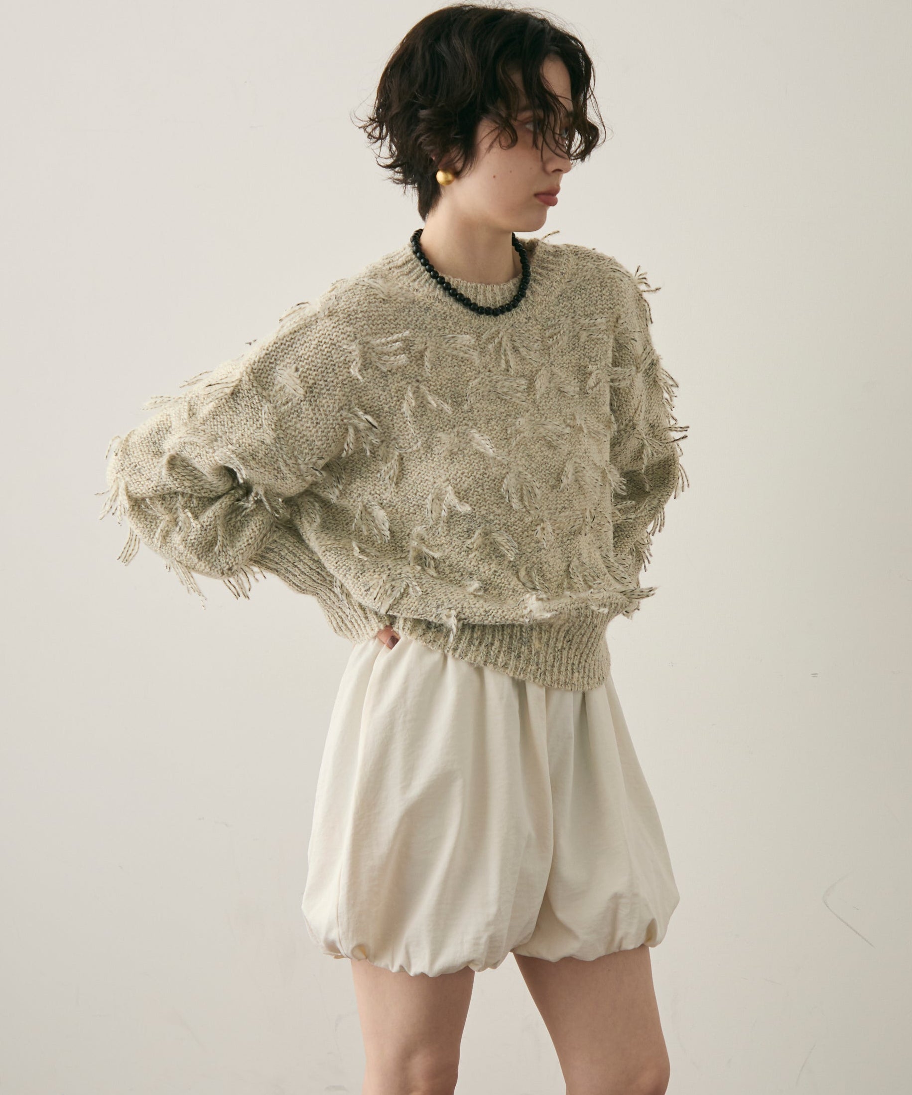 ランダムフリンジパフスリーブプルオーバートレンド感たっぷりの“ランダムフリンジ”が目を引くプルオーバー。