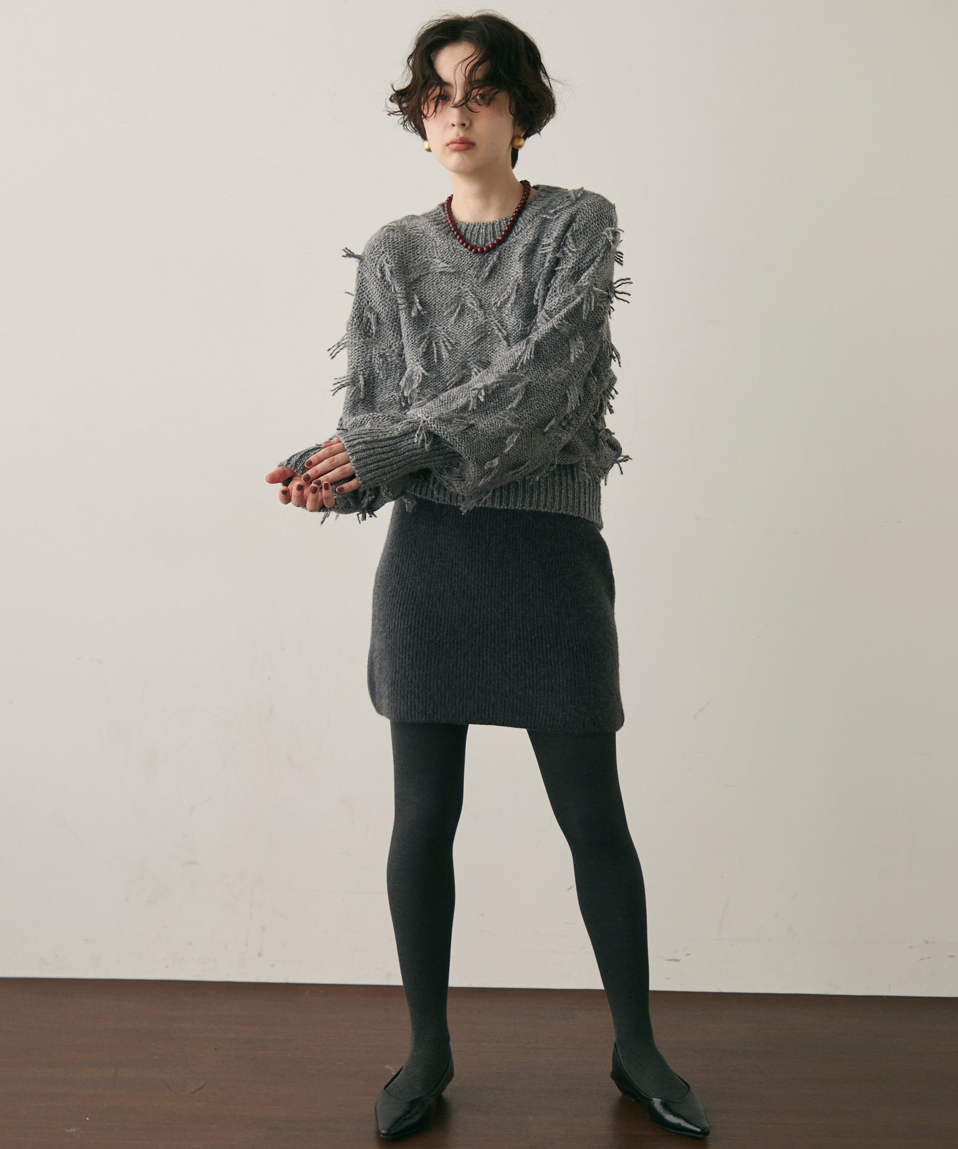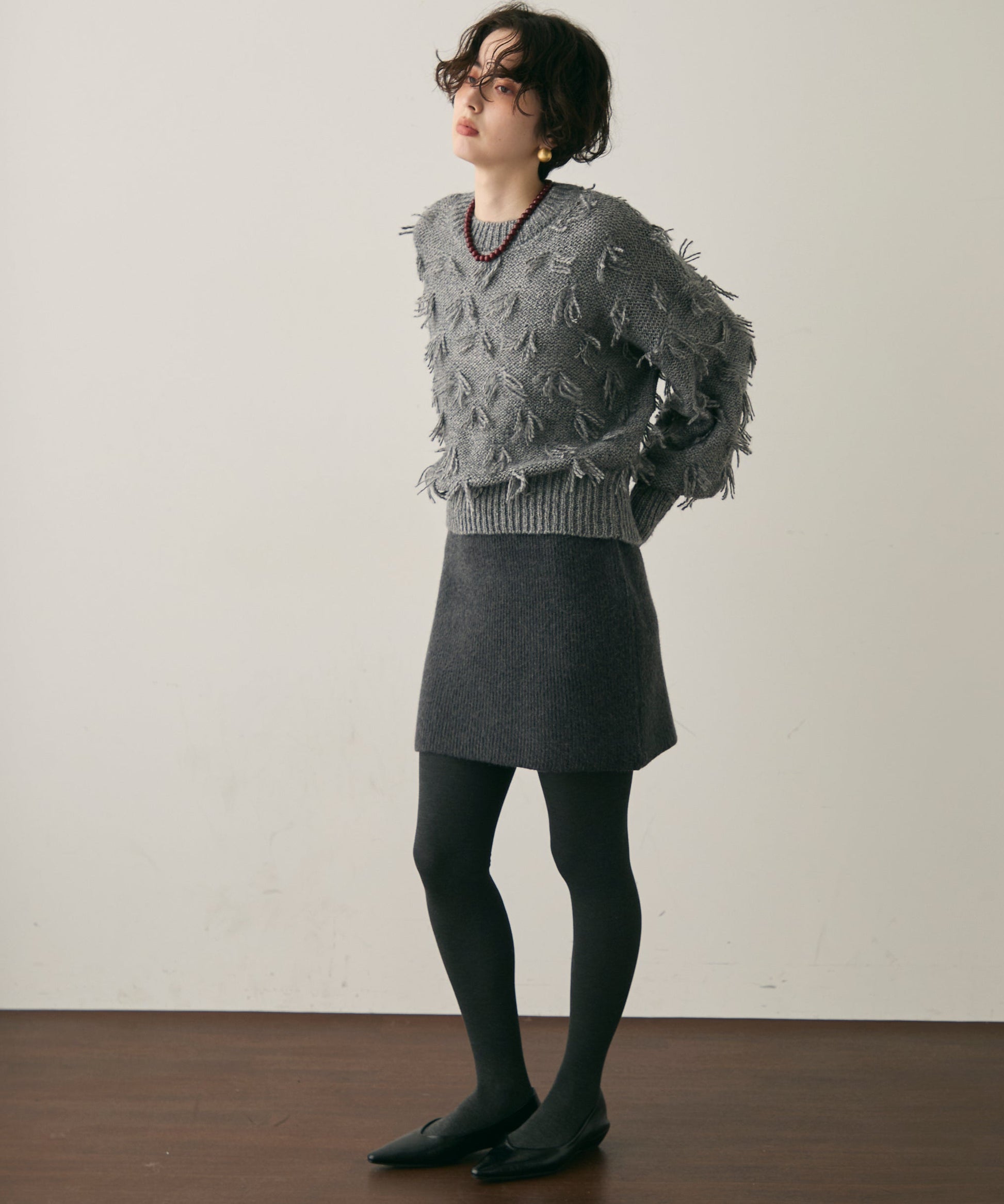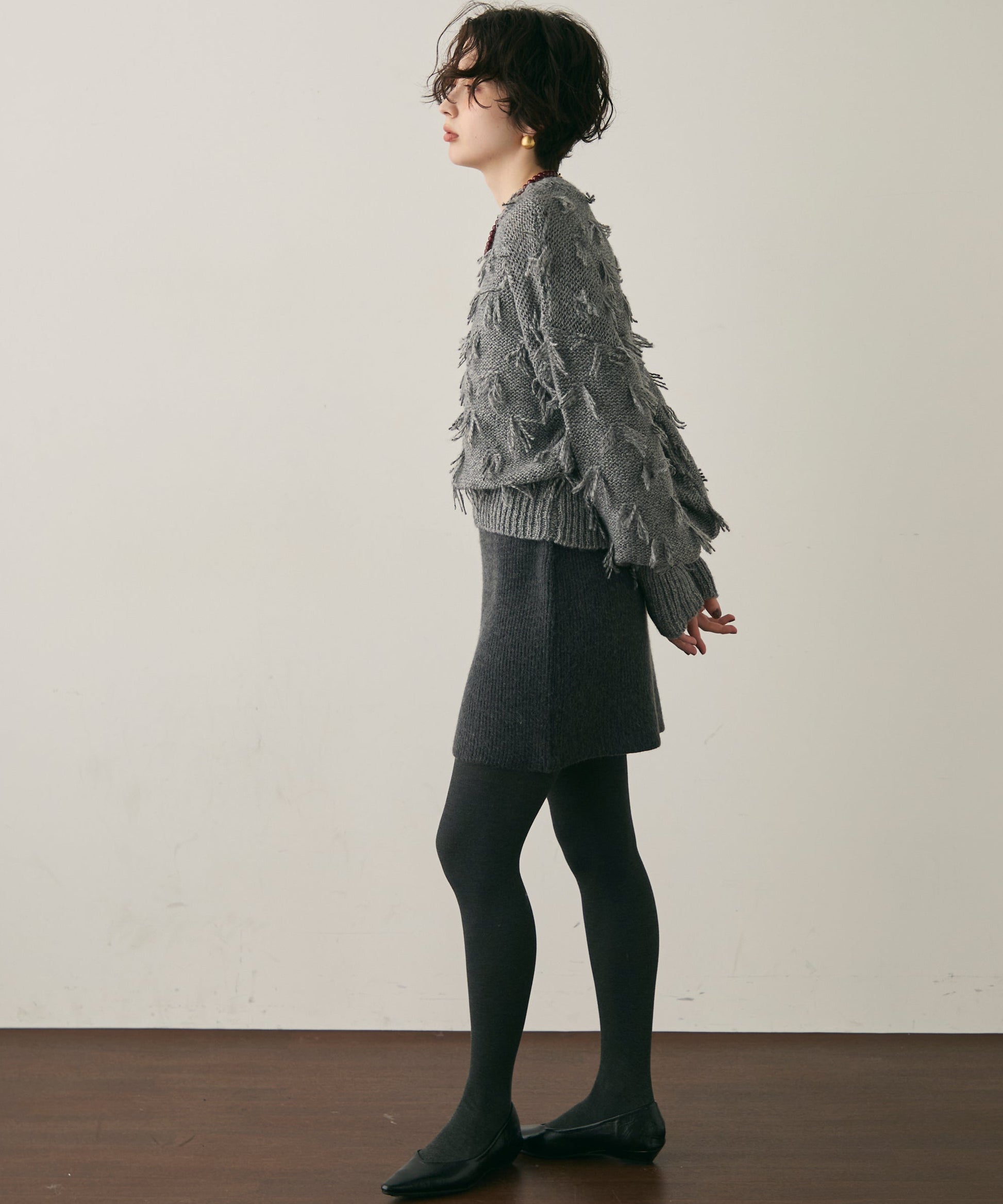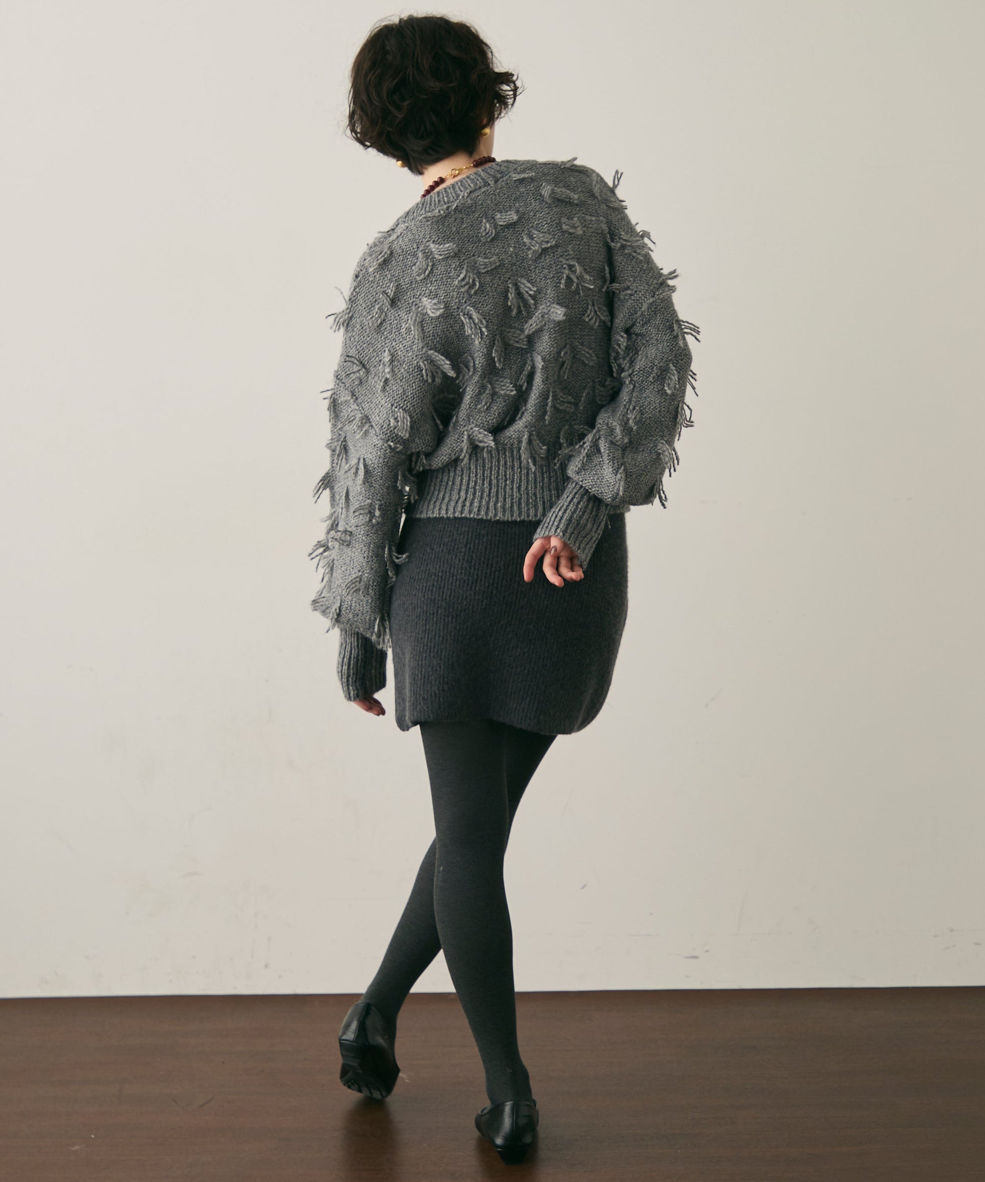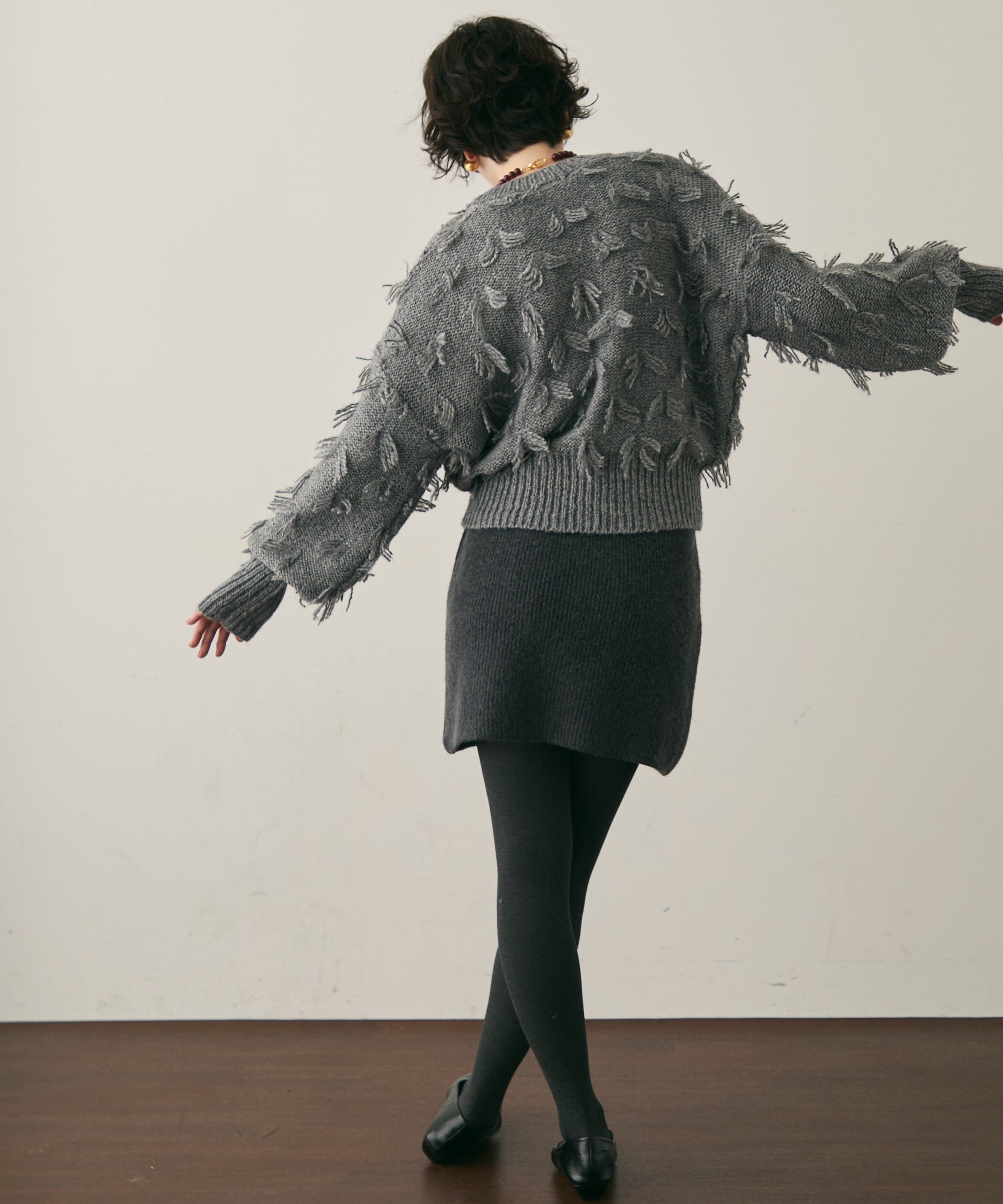 立体的なフリンジが動くたびに表情を変え、1枚で華やかさを演出します。