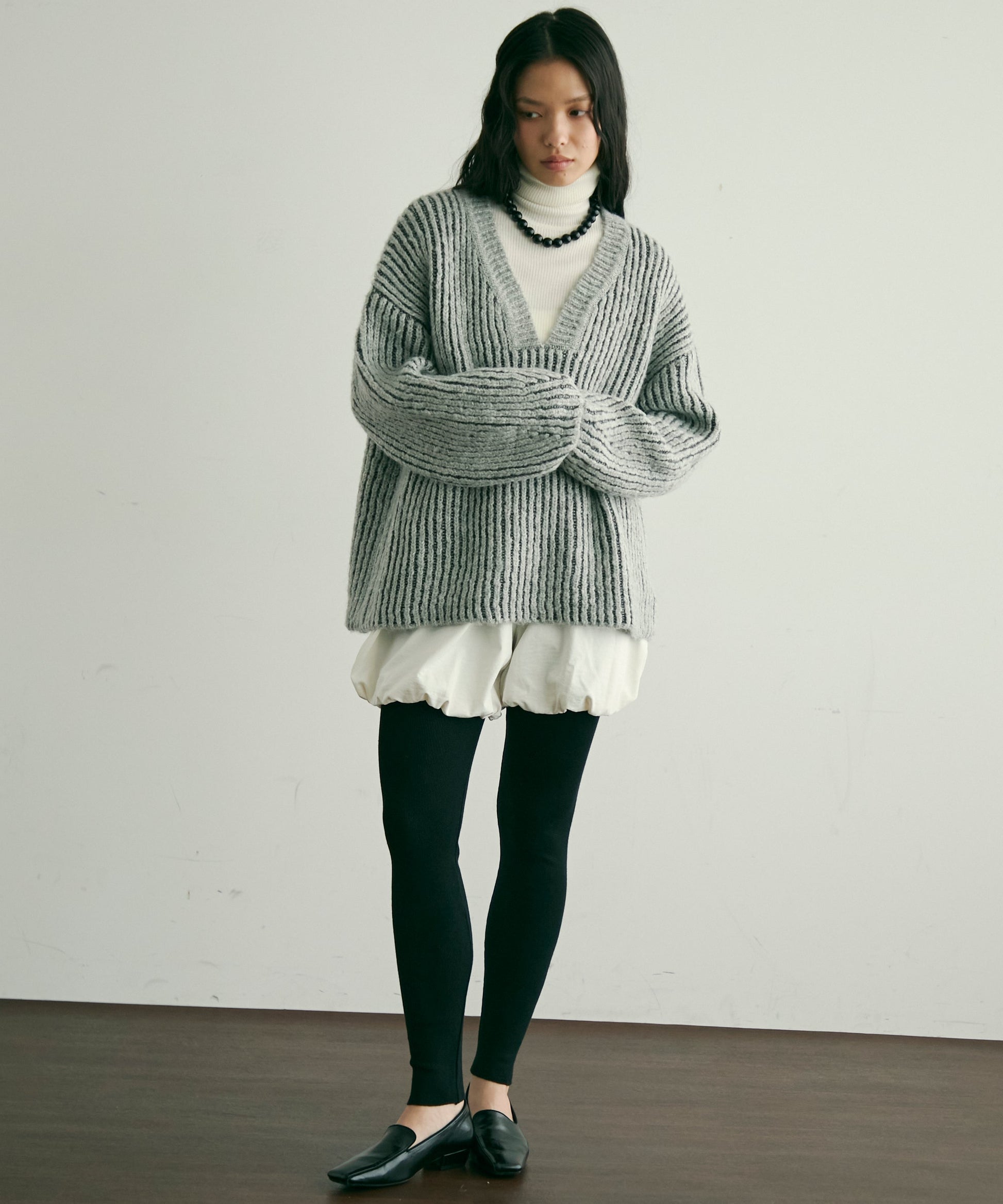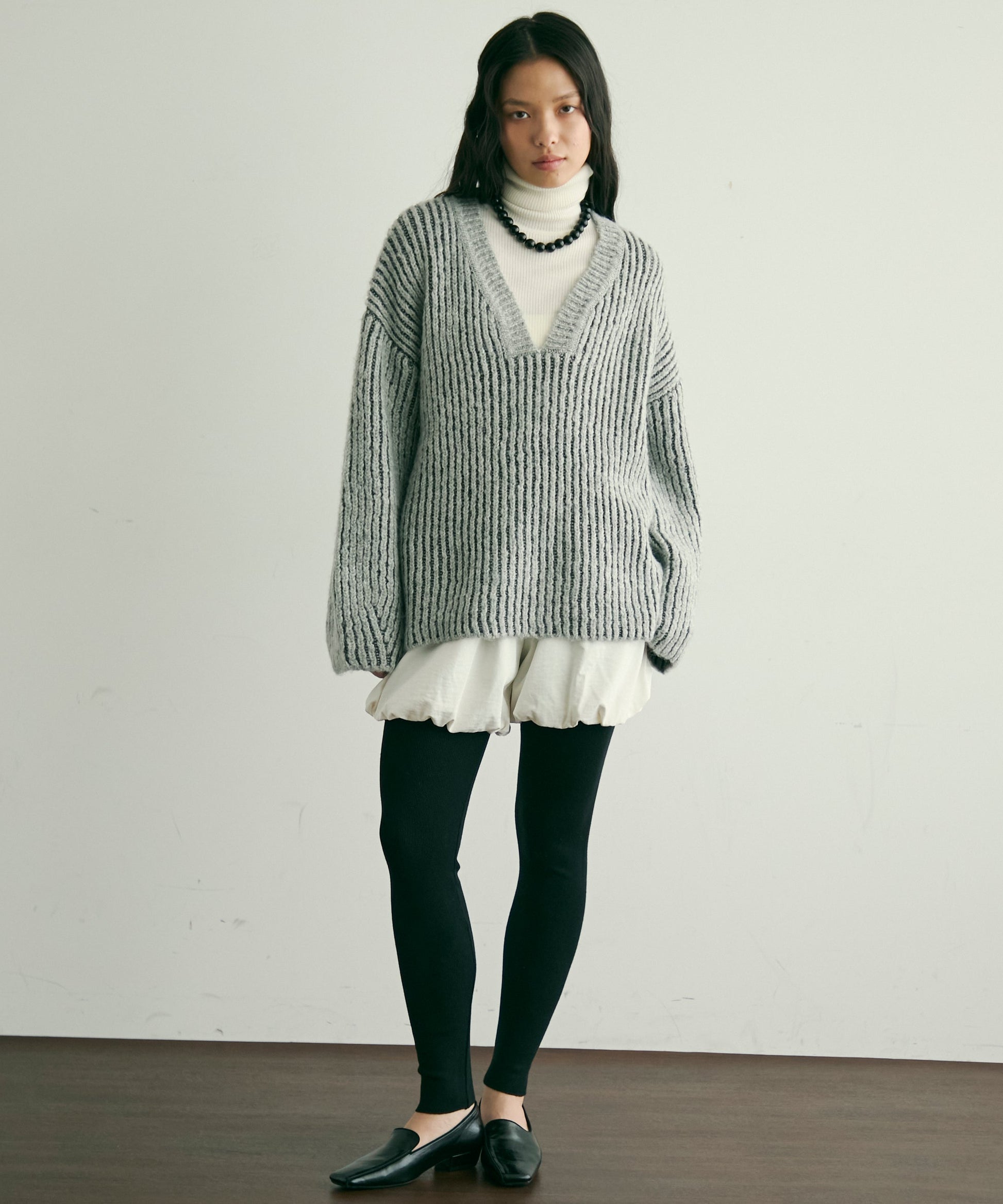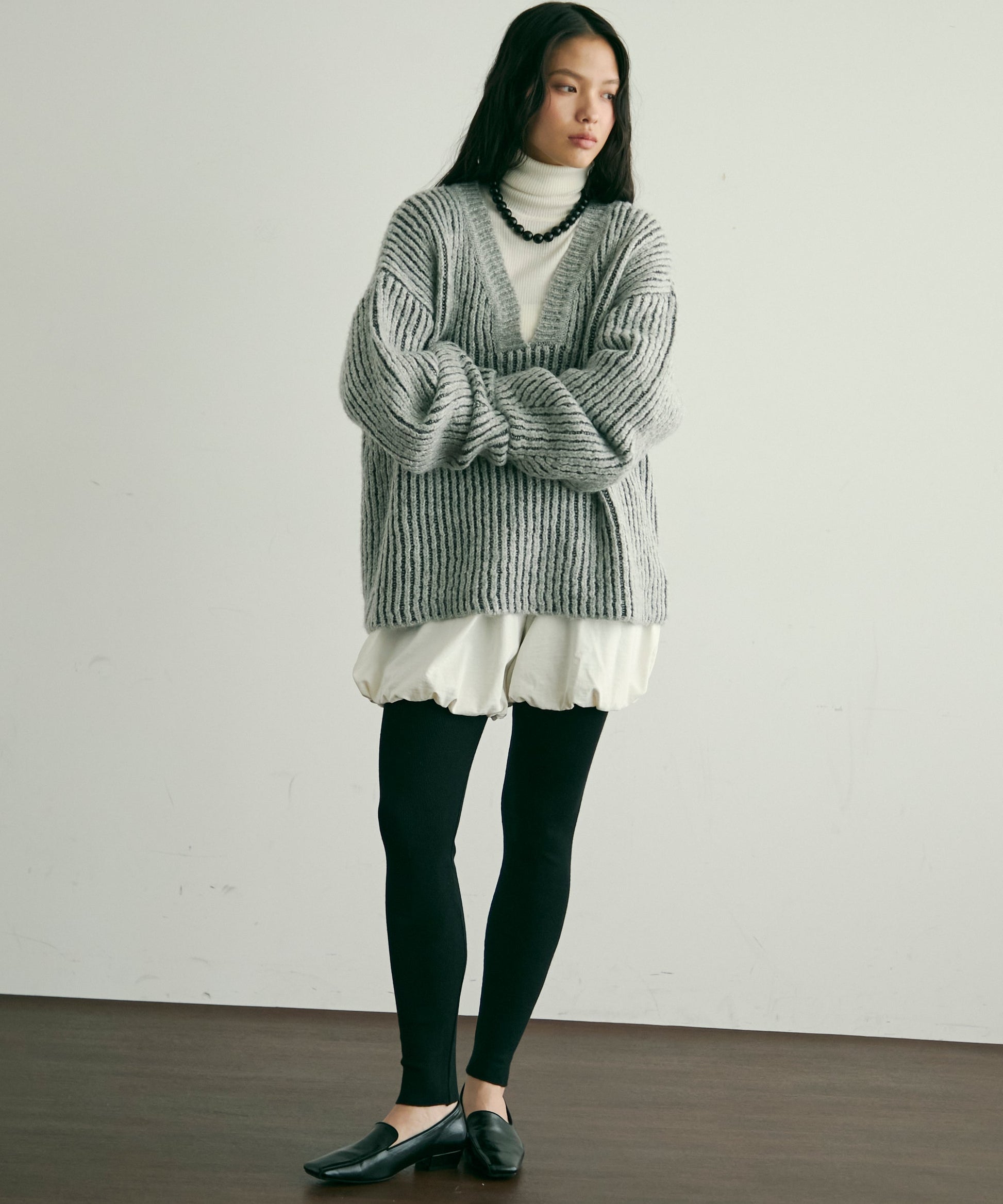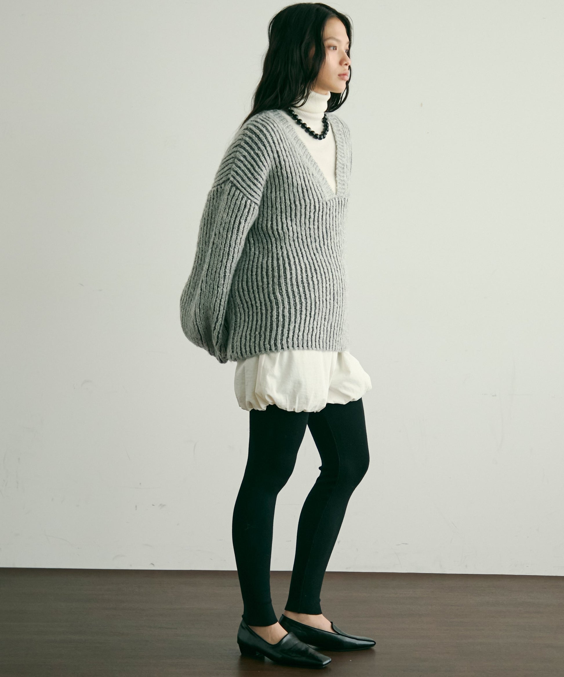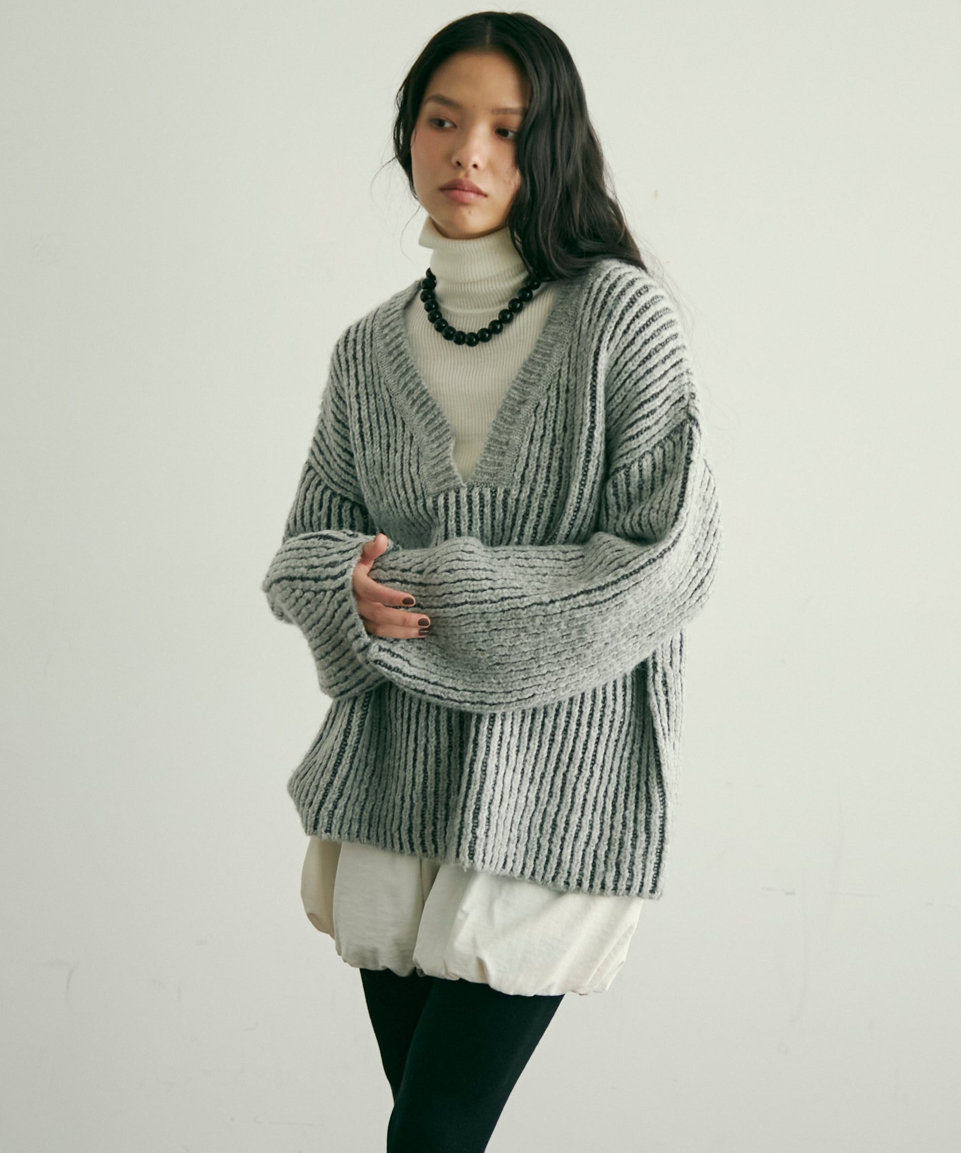 デコルテを美しく見せる深めのVネックが、女性らしさを引き立てつつ、レイヤードスタイルにもぴったり。
