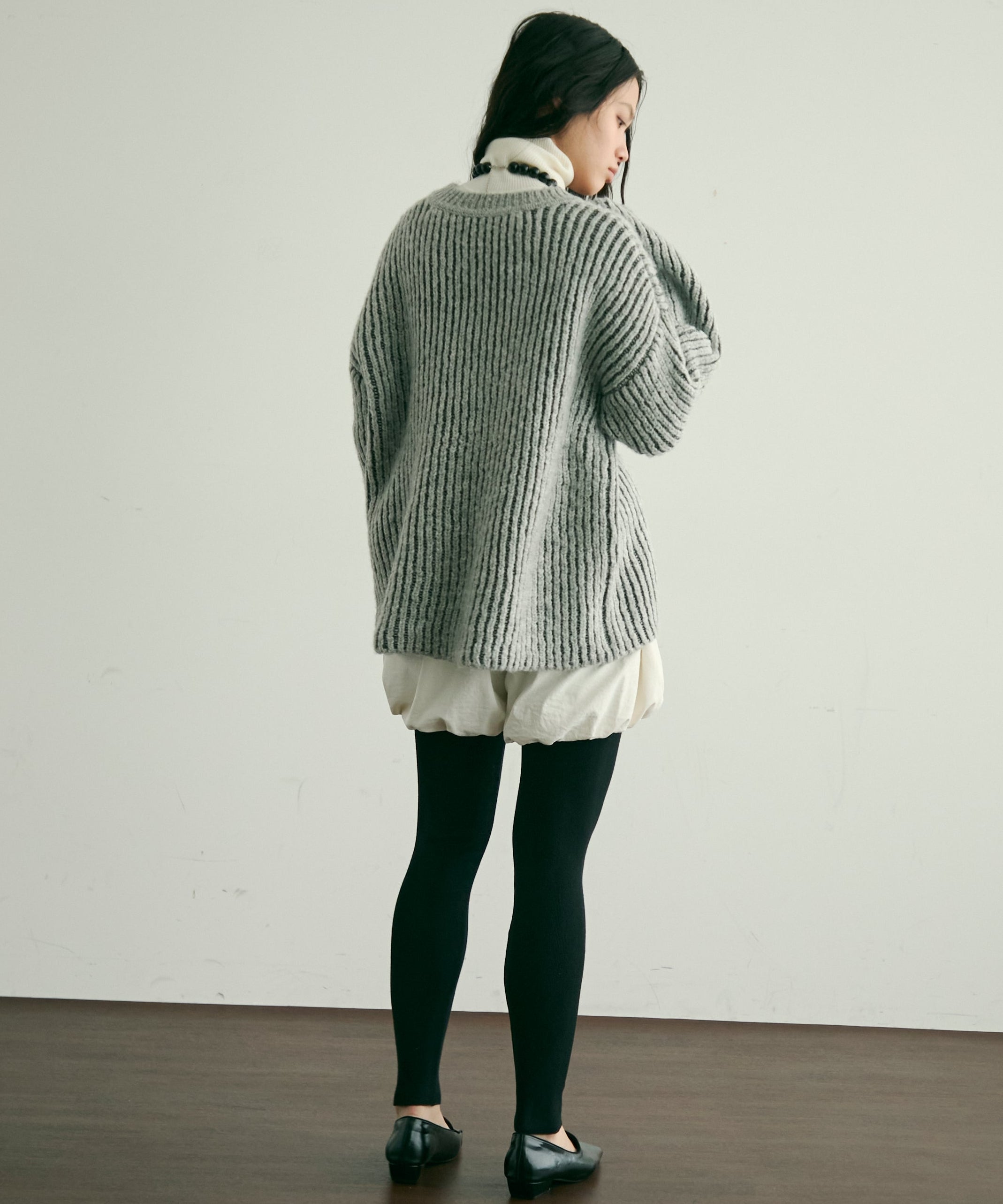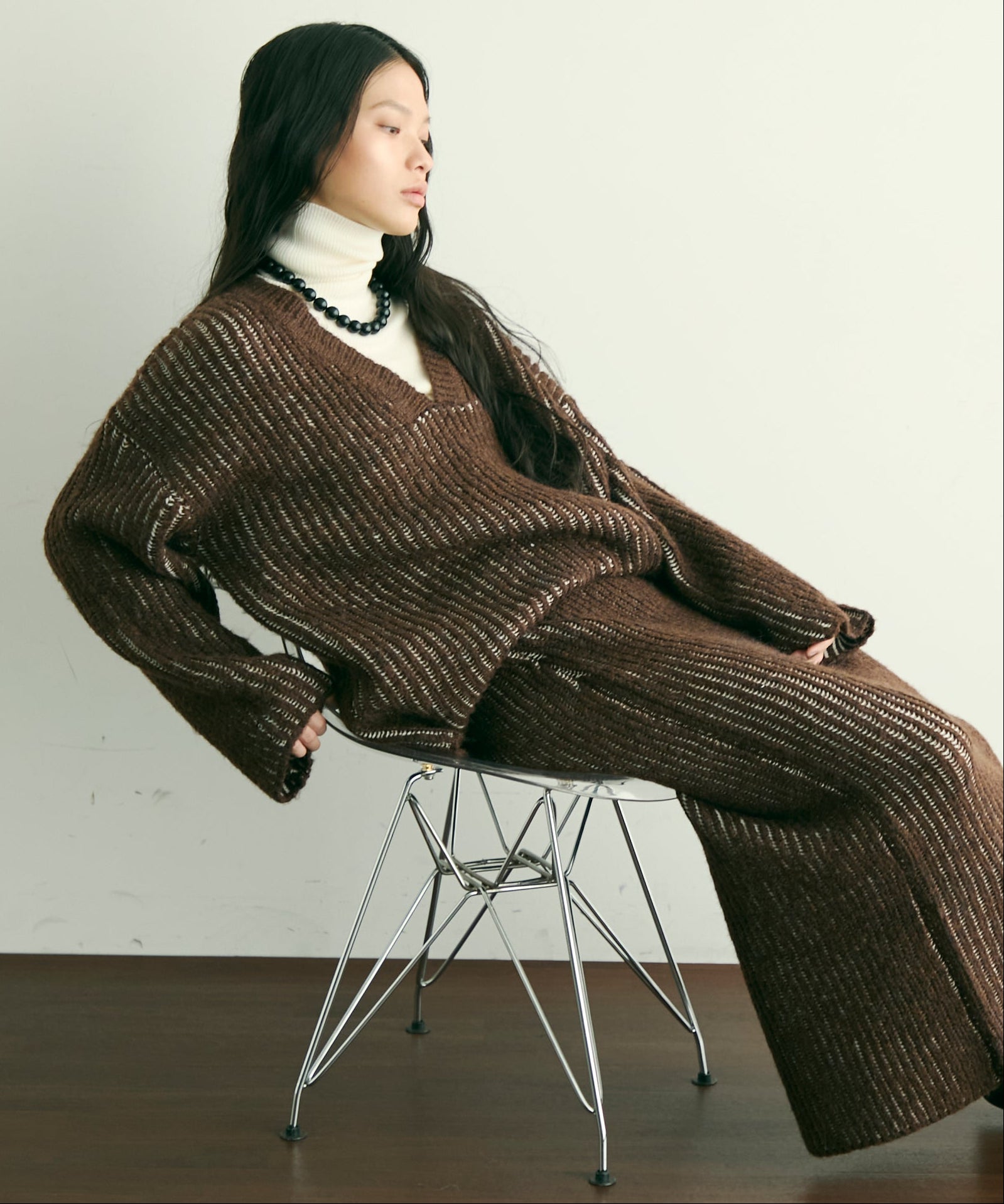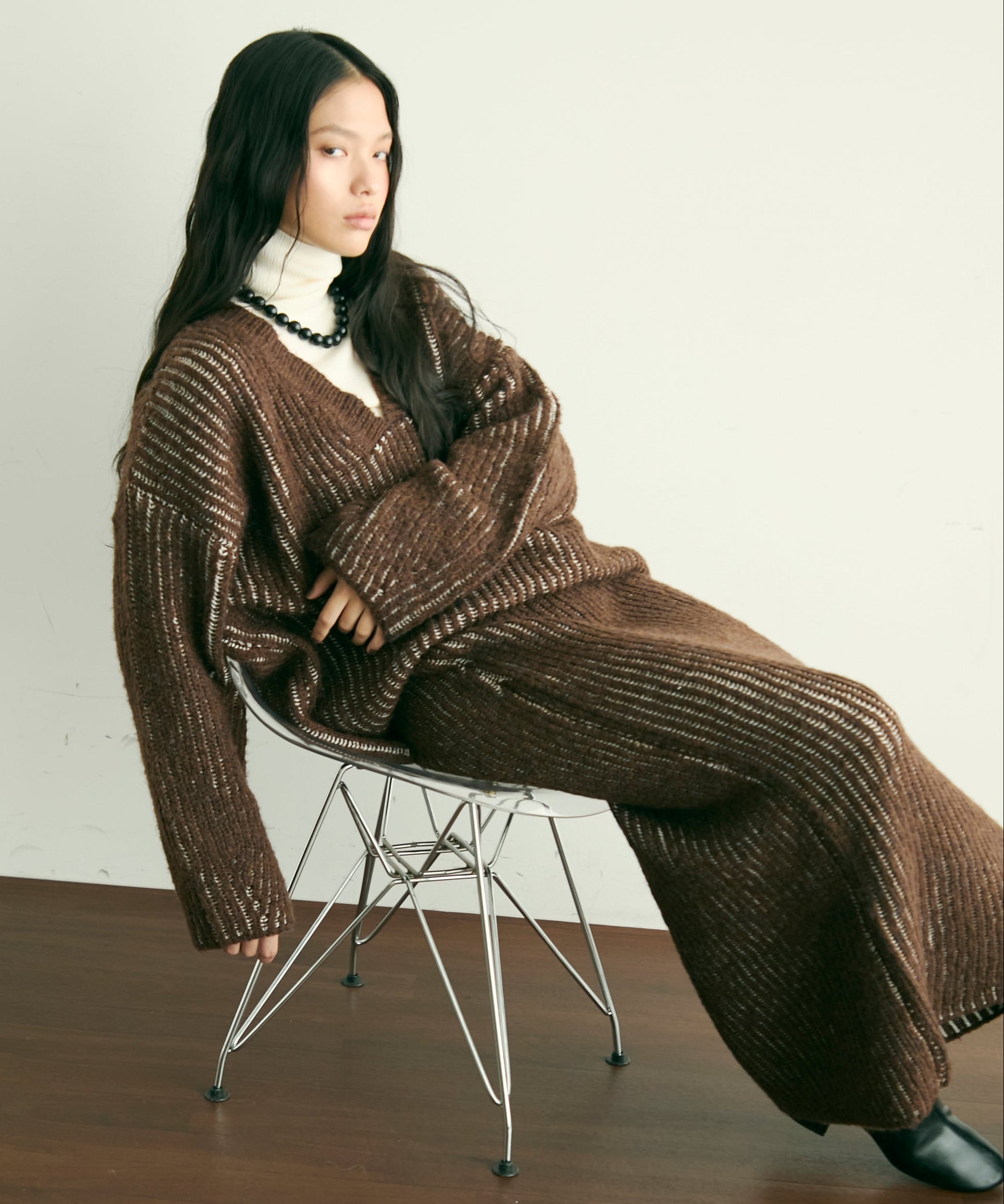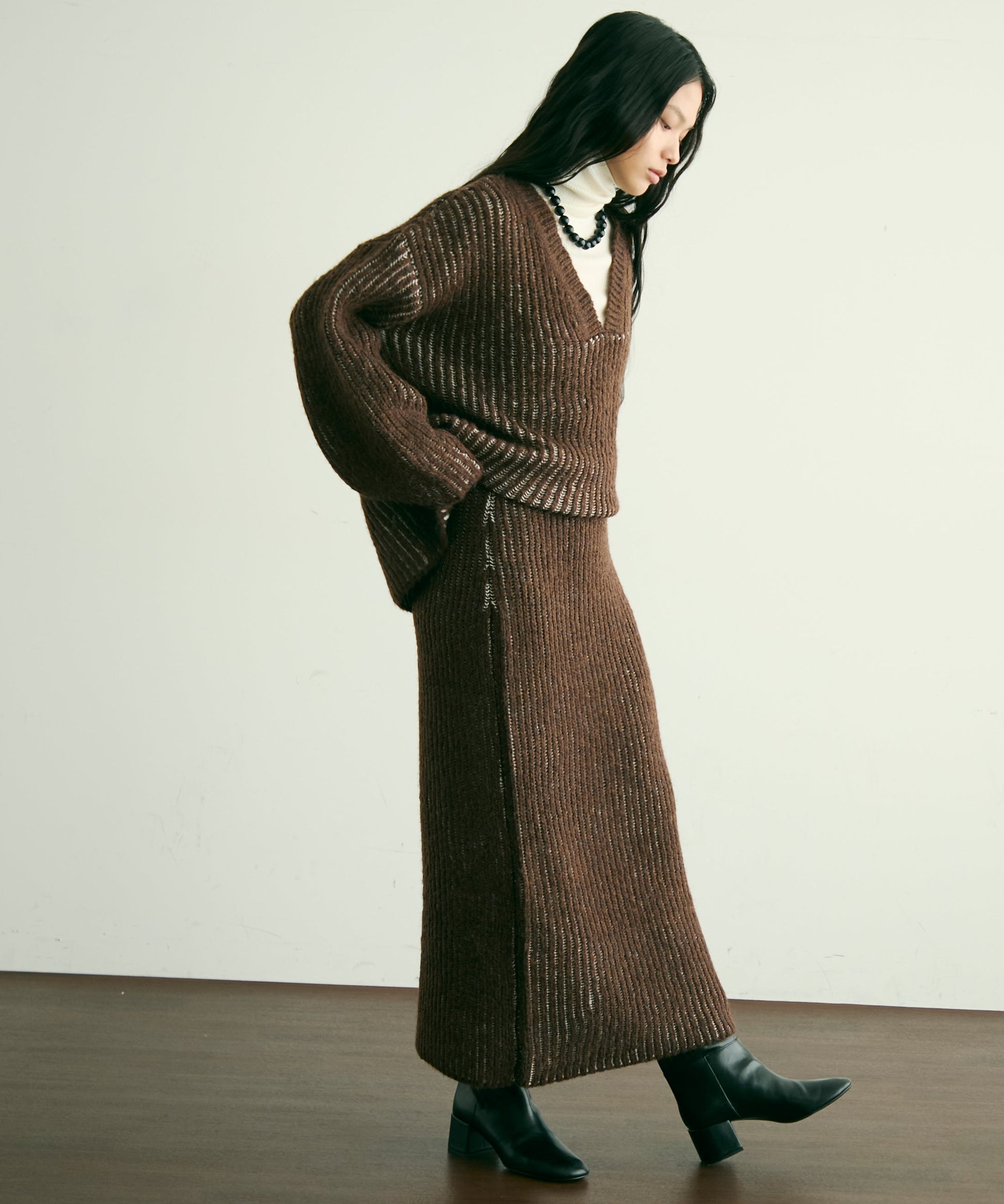 デコルテを美しく見せる深めのVネックが、女性らしさを引き立てつつ、レイヤードスタイルにもぴったり。