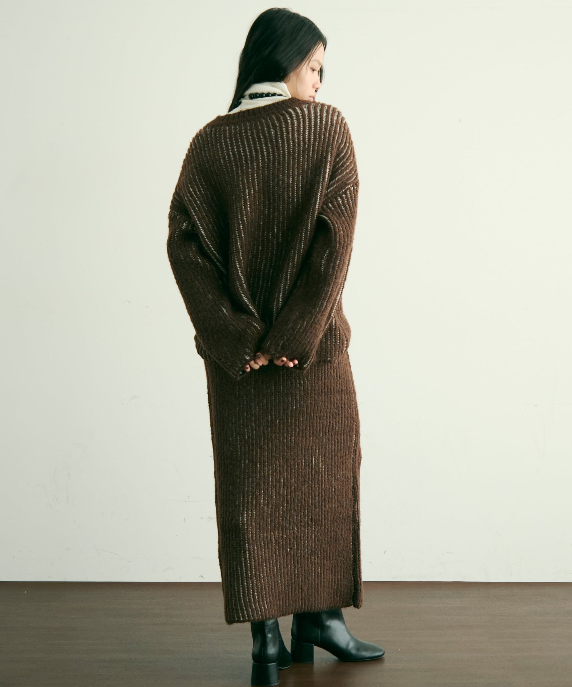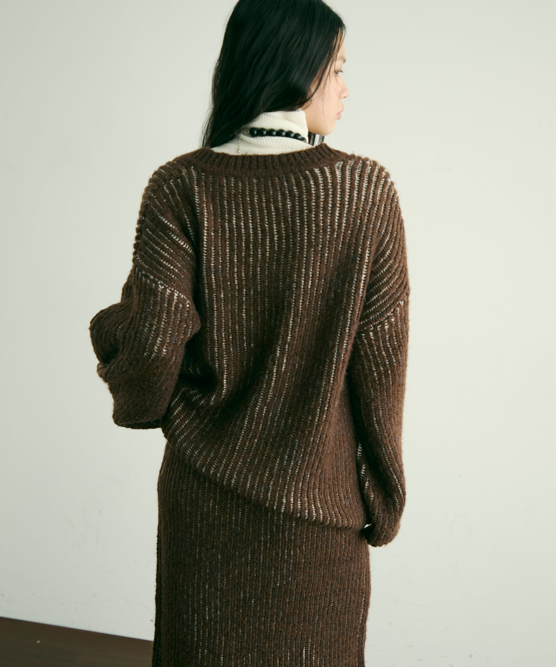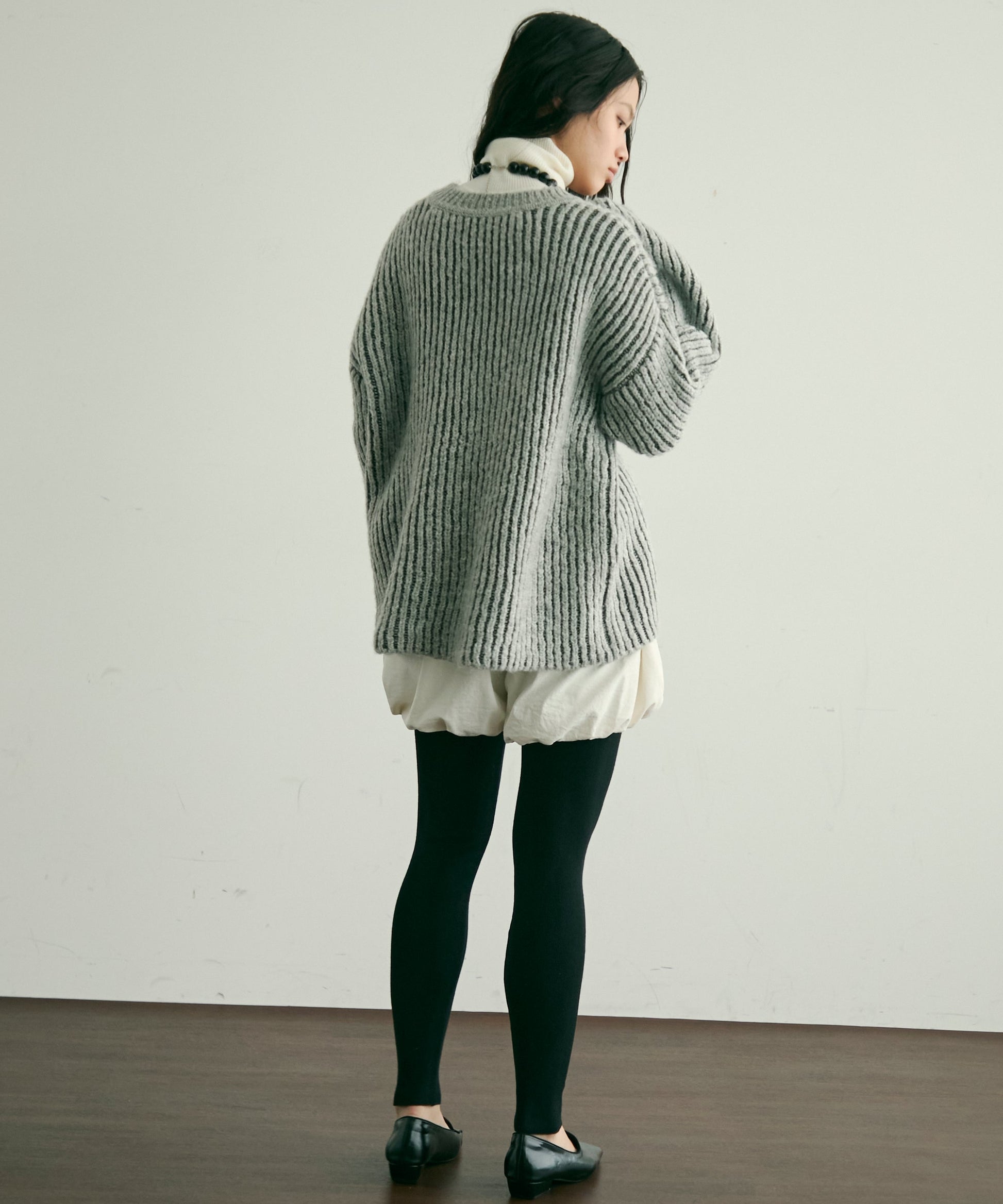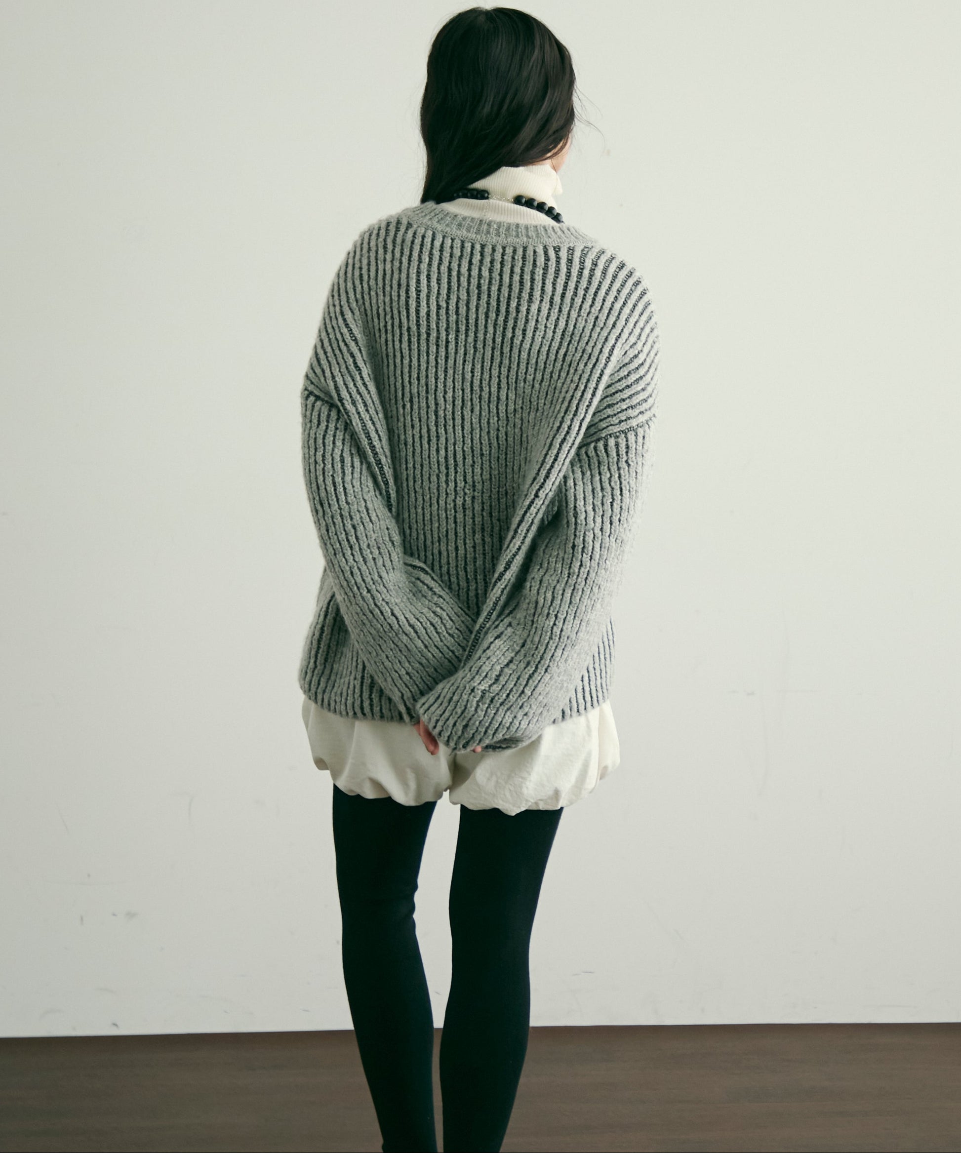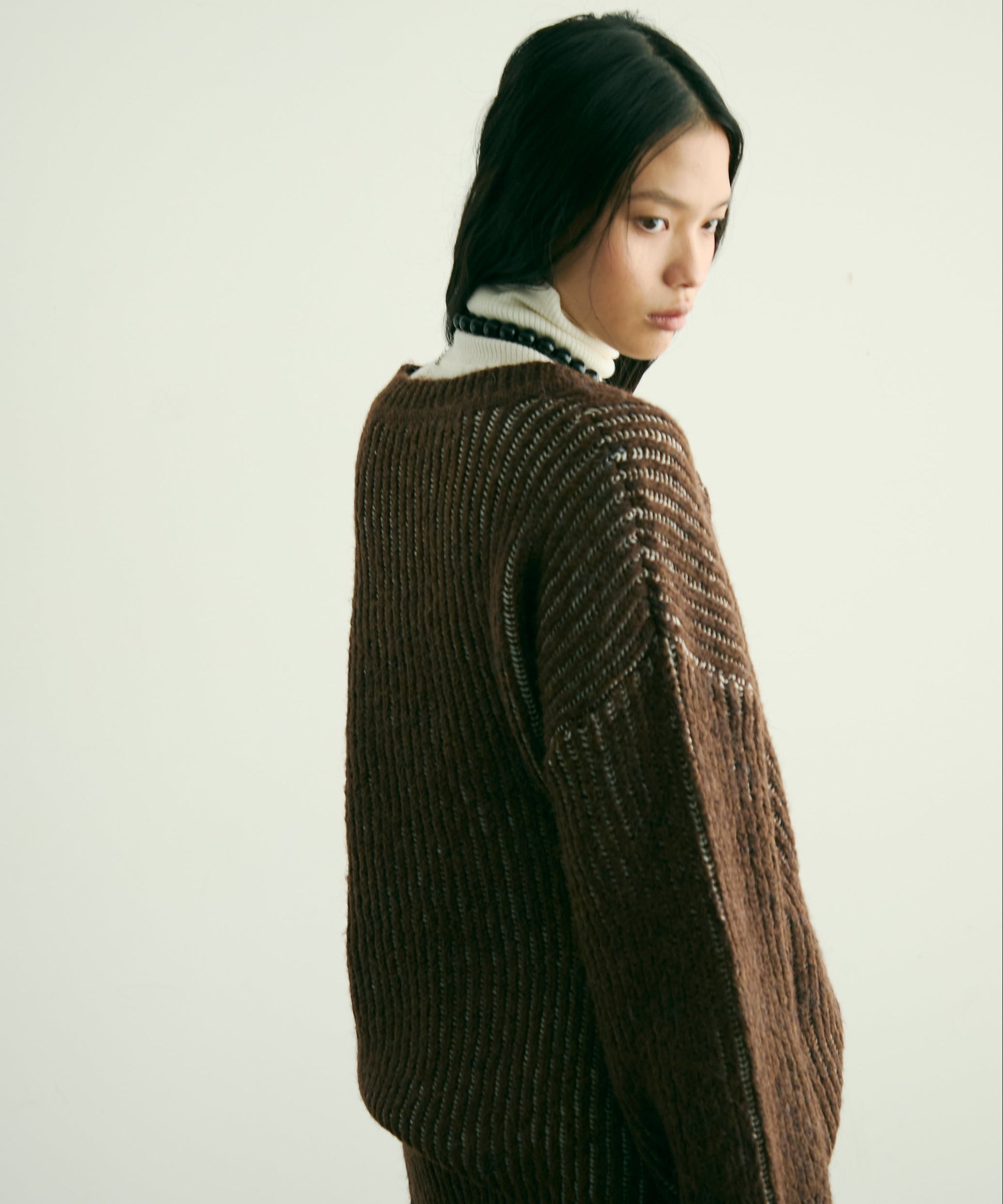 デコルテを美しく見せる深めのVネックが、女性らしさを引き立てつつ、レイヤードスタイルにもぴったり。