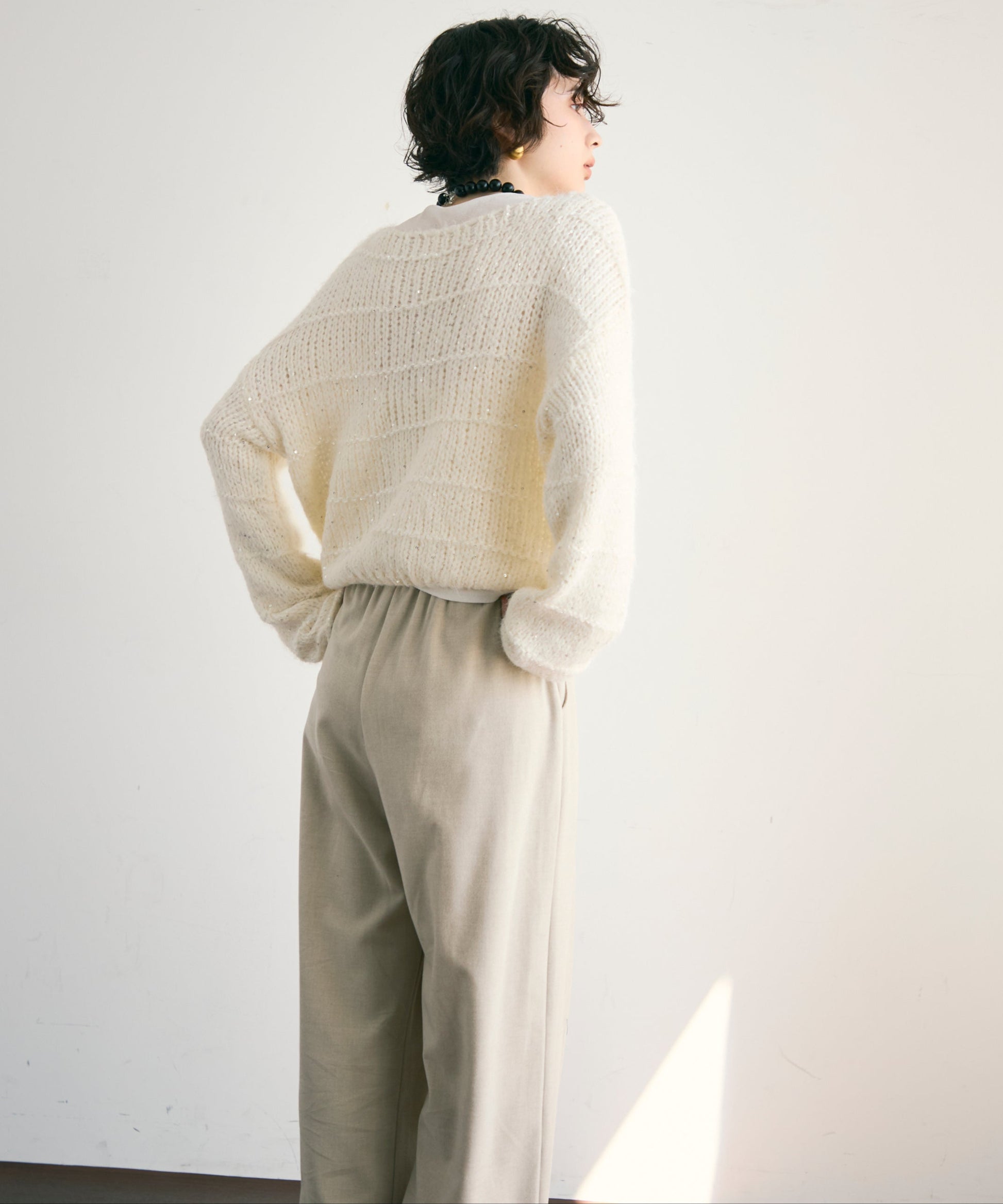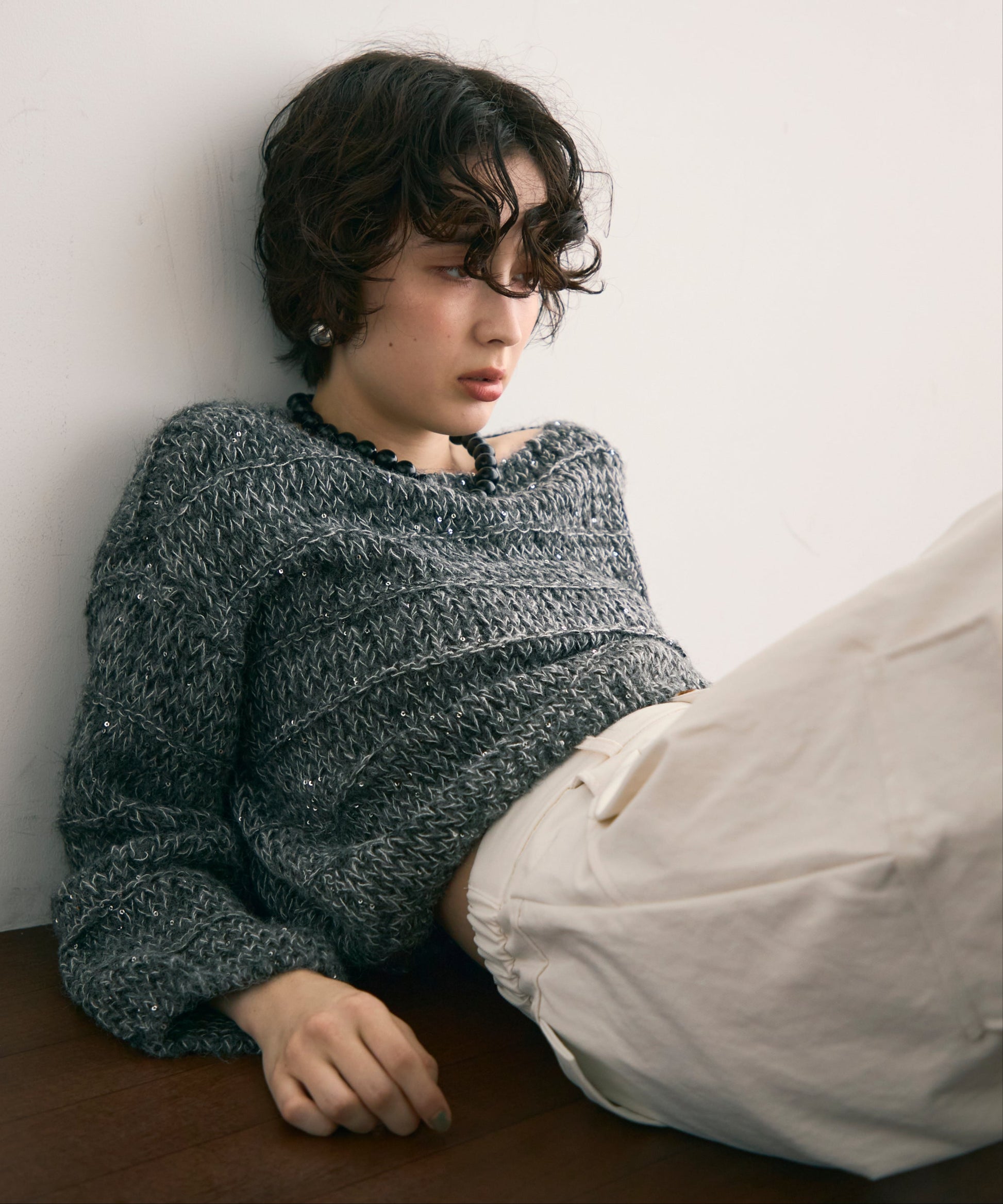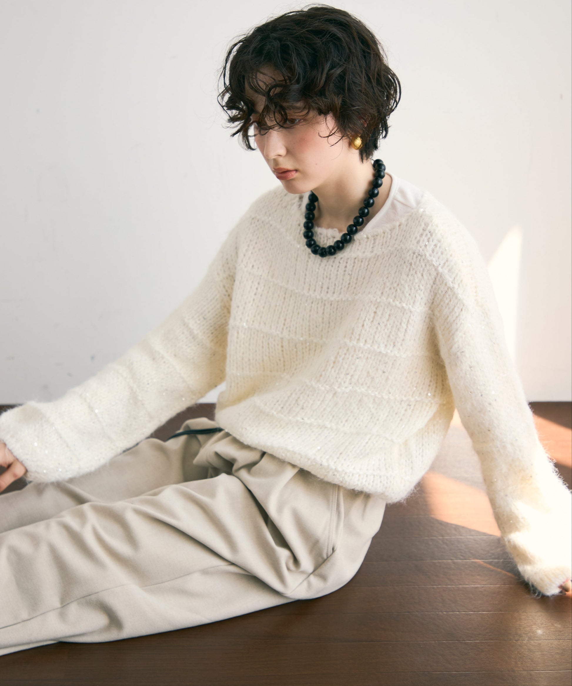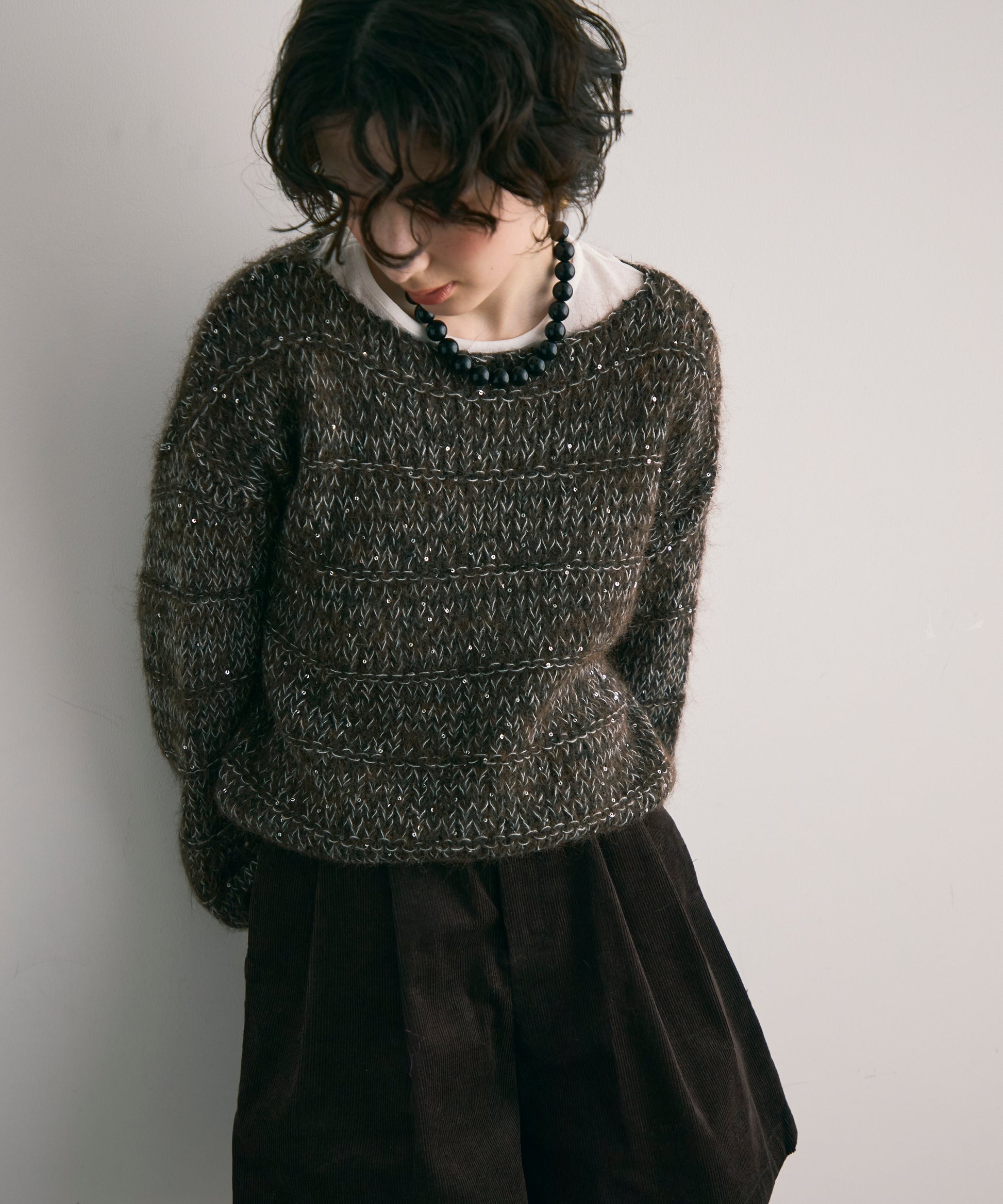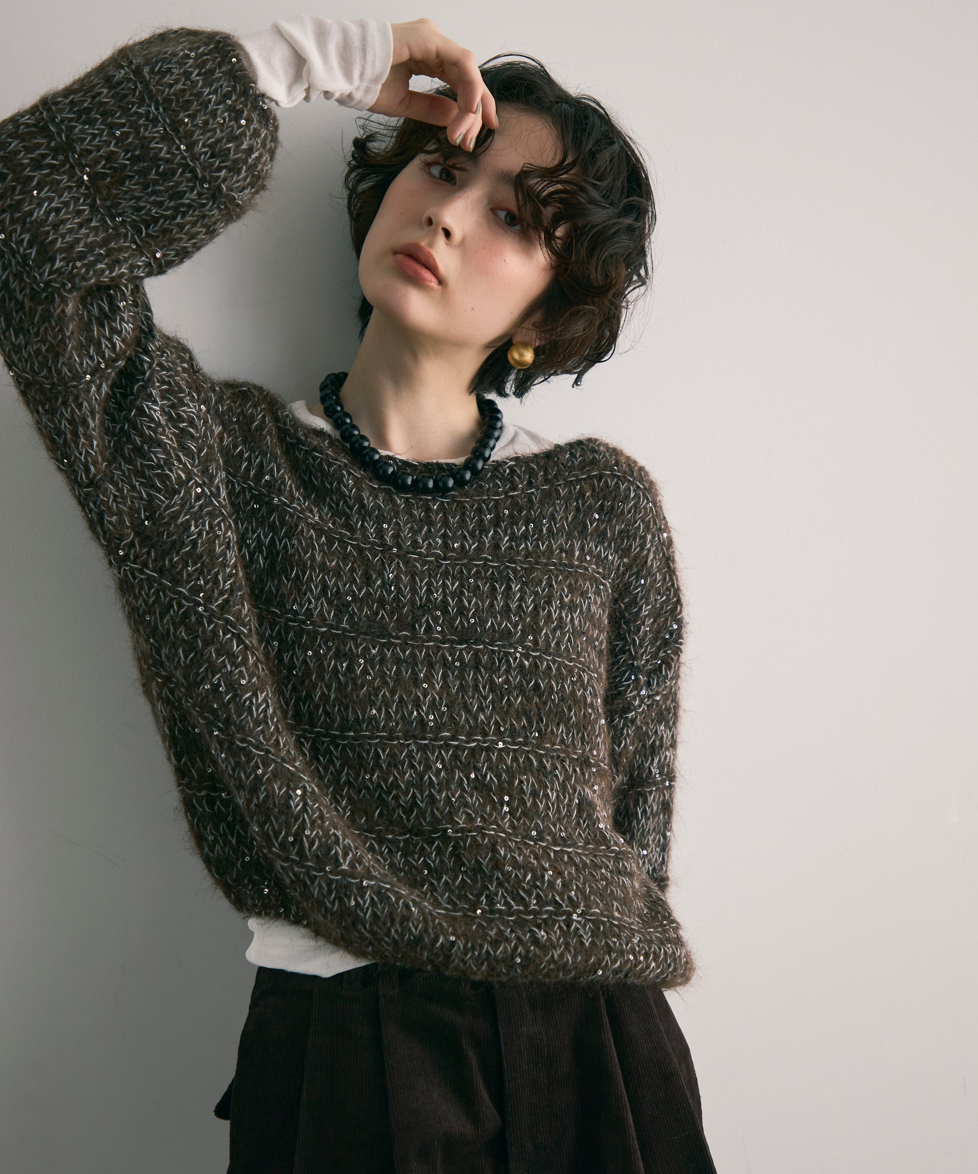 きらめくスパンコールを散りばめたルーズシルエットのニット。ほどよい透け感とゆったりとした落ち感が、大人の余裕を感じさせる一枚です。シンプルなボトムスと合わせるだけでコーディネートが華やぎ、デイリーにも特別な日にも活躍します。