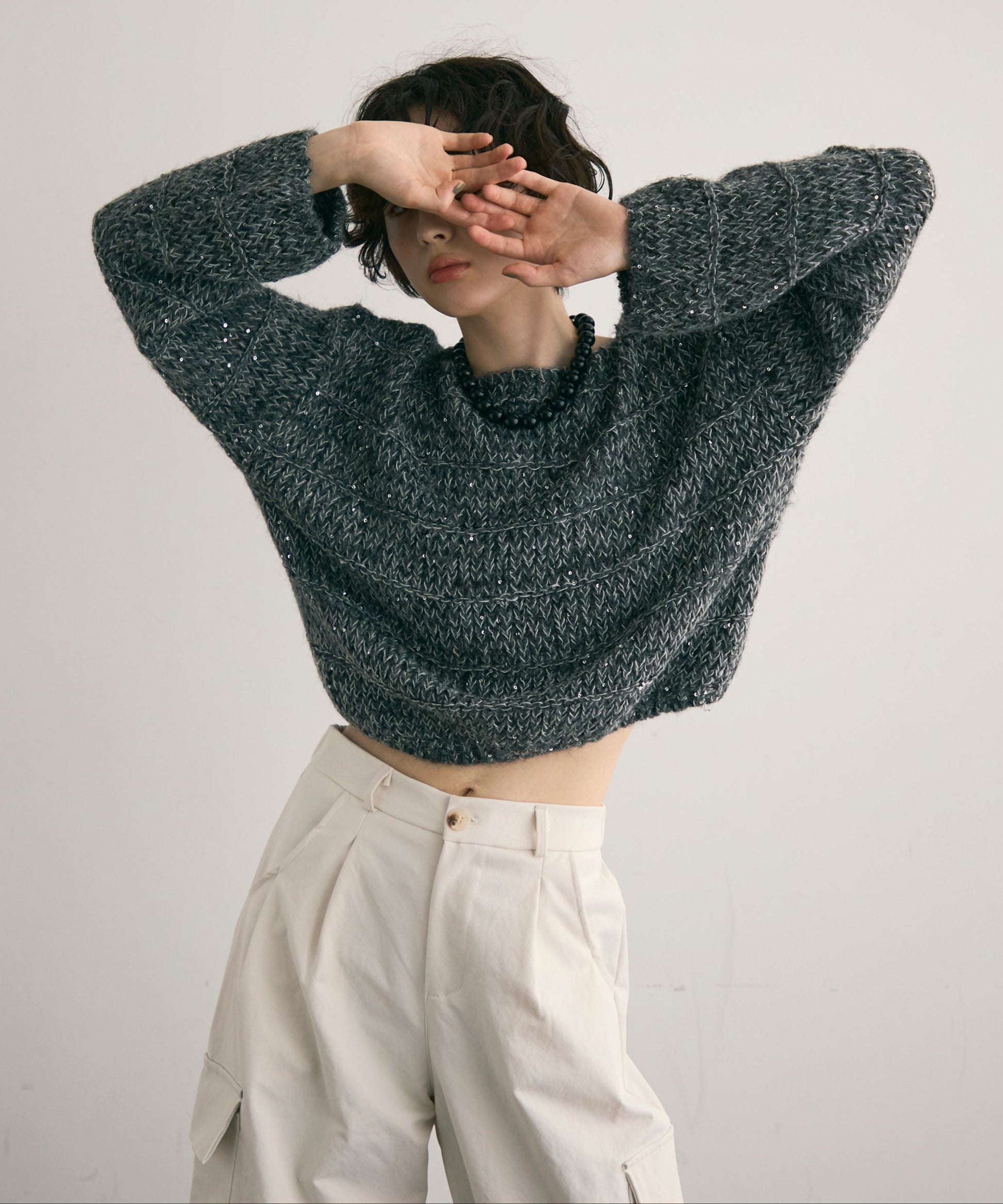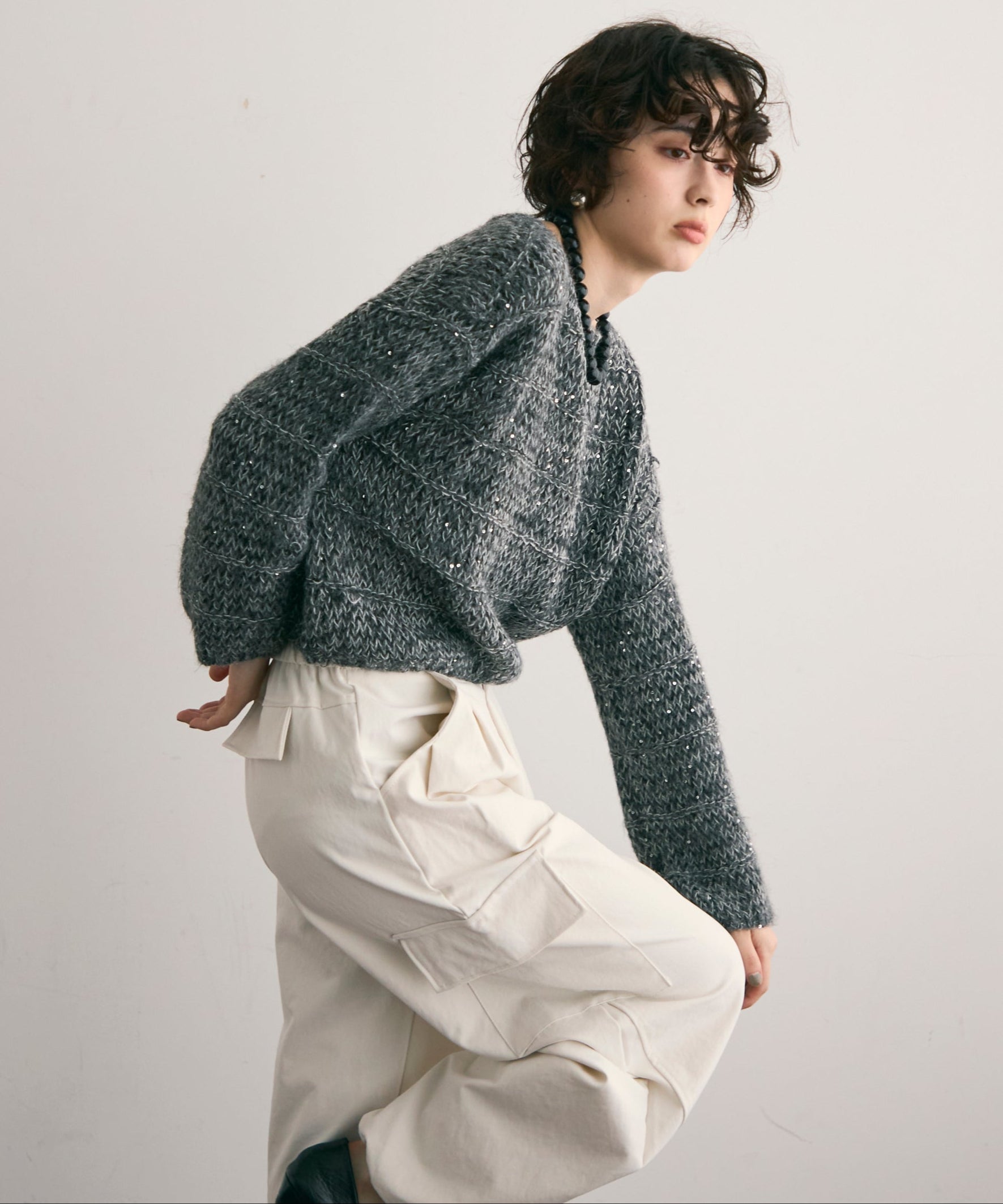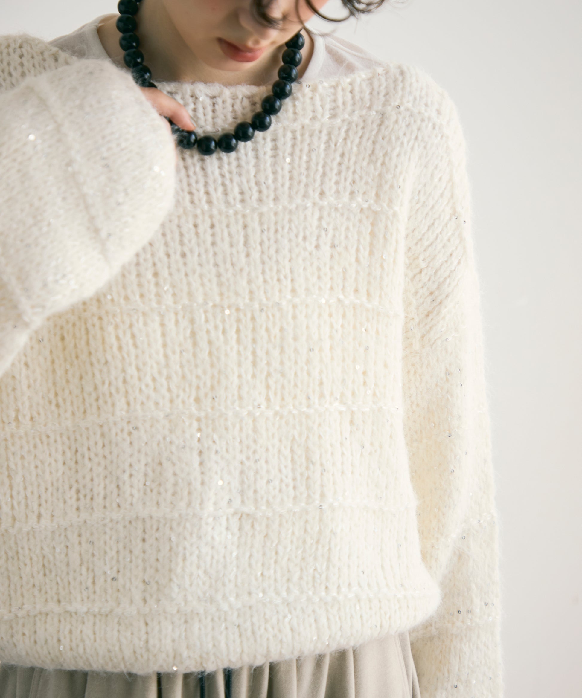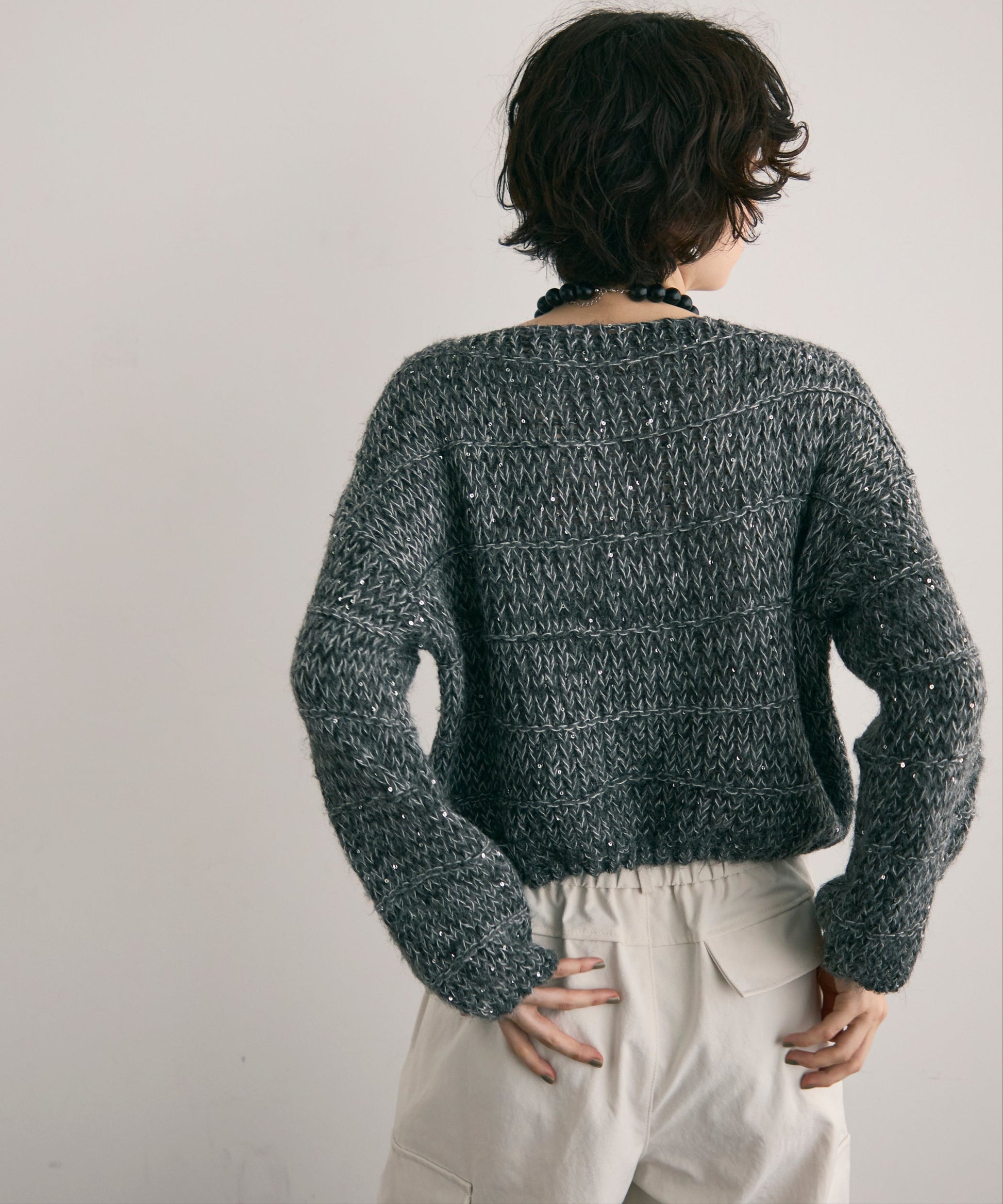 きらめくスパンコールを散りばめたルーズシルエットのニット。ほどよい透け感とゆったりとした落ち感が、大人の余裕を感じさせる一枚です。シンプルなボトムスと合わせるだけでコーディネートが華やぎ、デイリーにも特別な日にも活躍します。