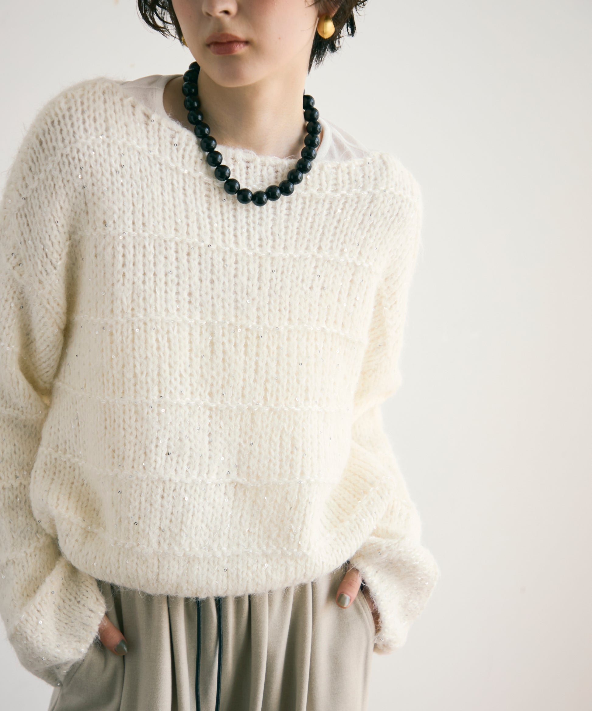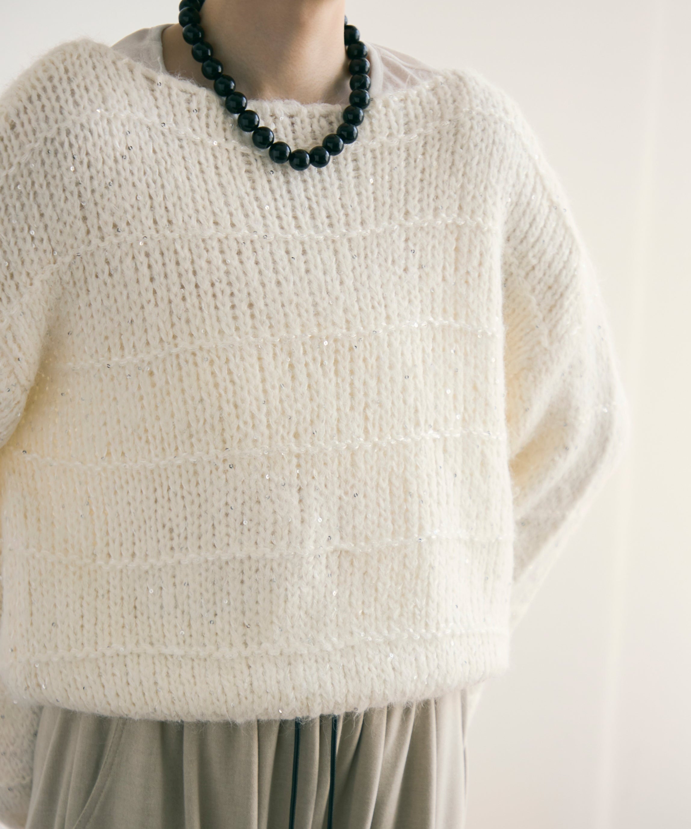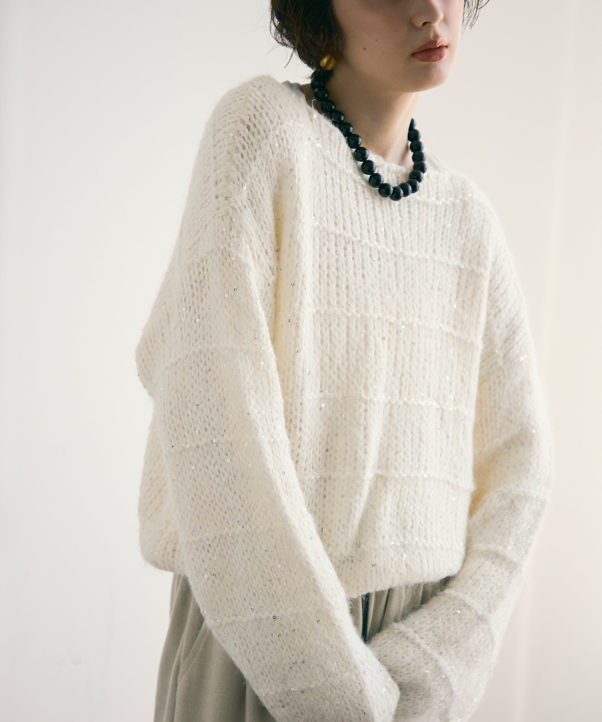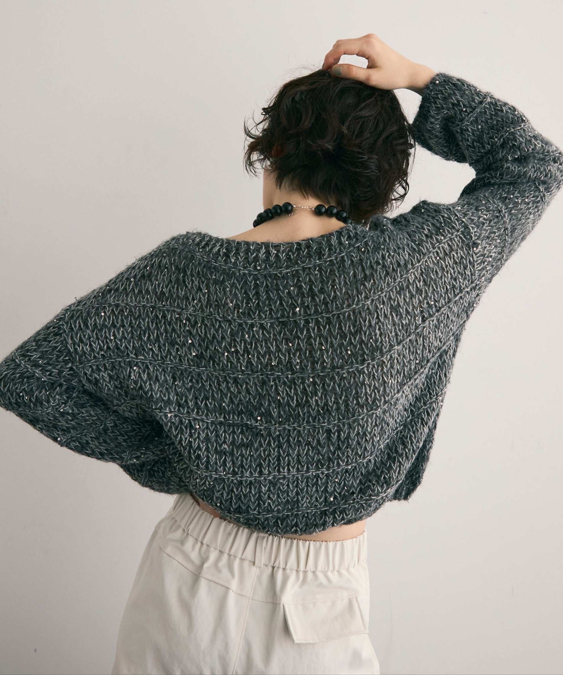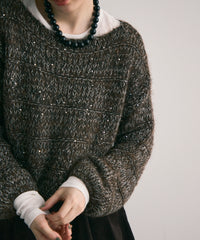 きらめくスパンコールを散りばめたルーズシルエットのニット。ほどよい透け感とゆったりとした落ち感が、大人の余裕を感じさせる一枚です。シンプルなボトムスと合わせるだけでコーディネートが華やぎ、デイリーにも特別な日にも活躍します。