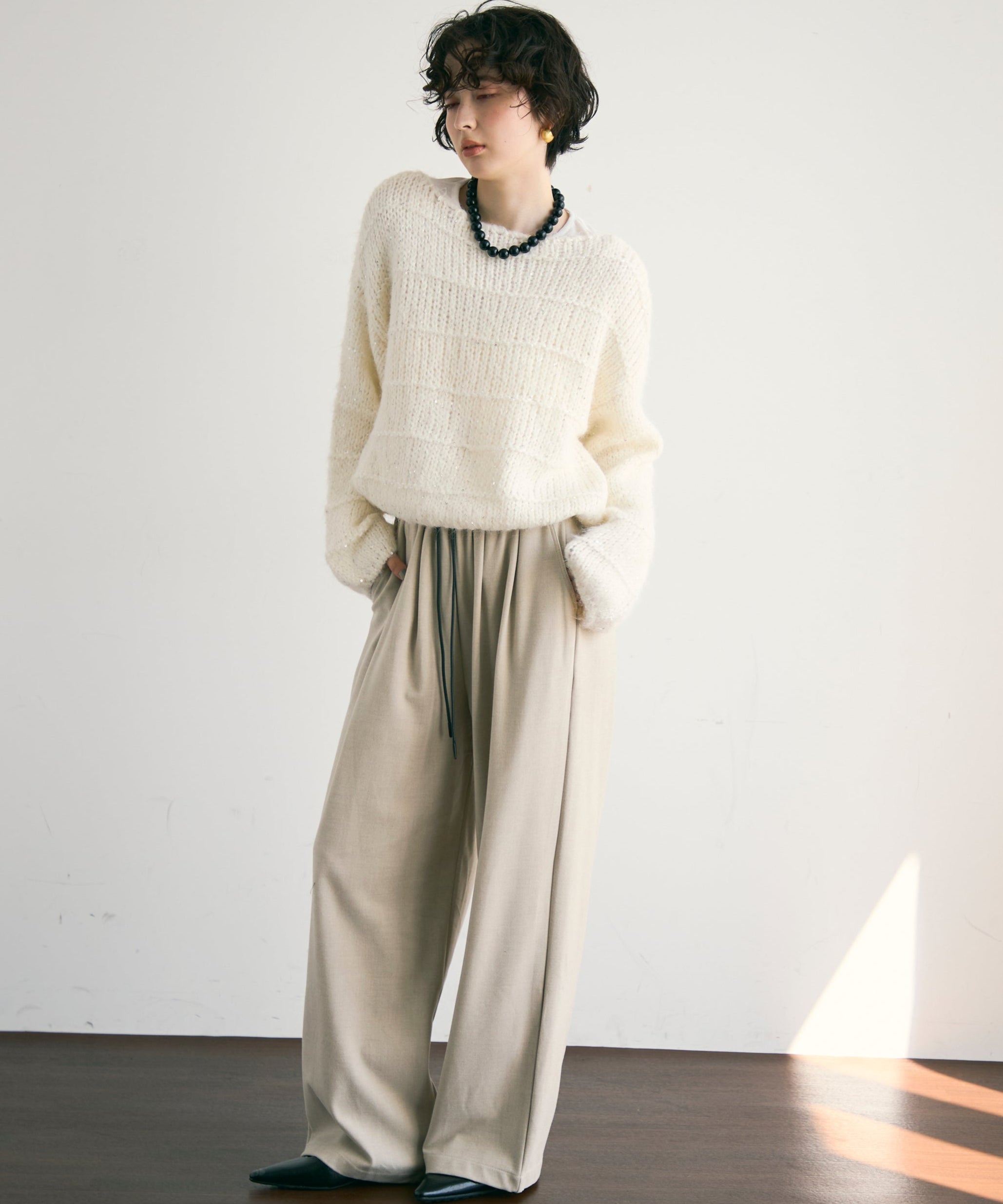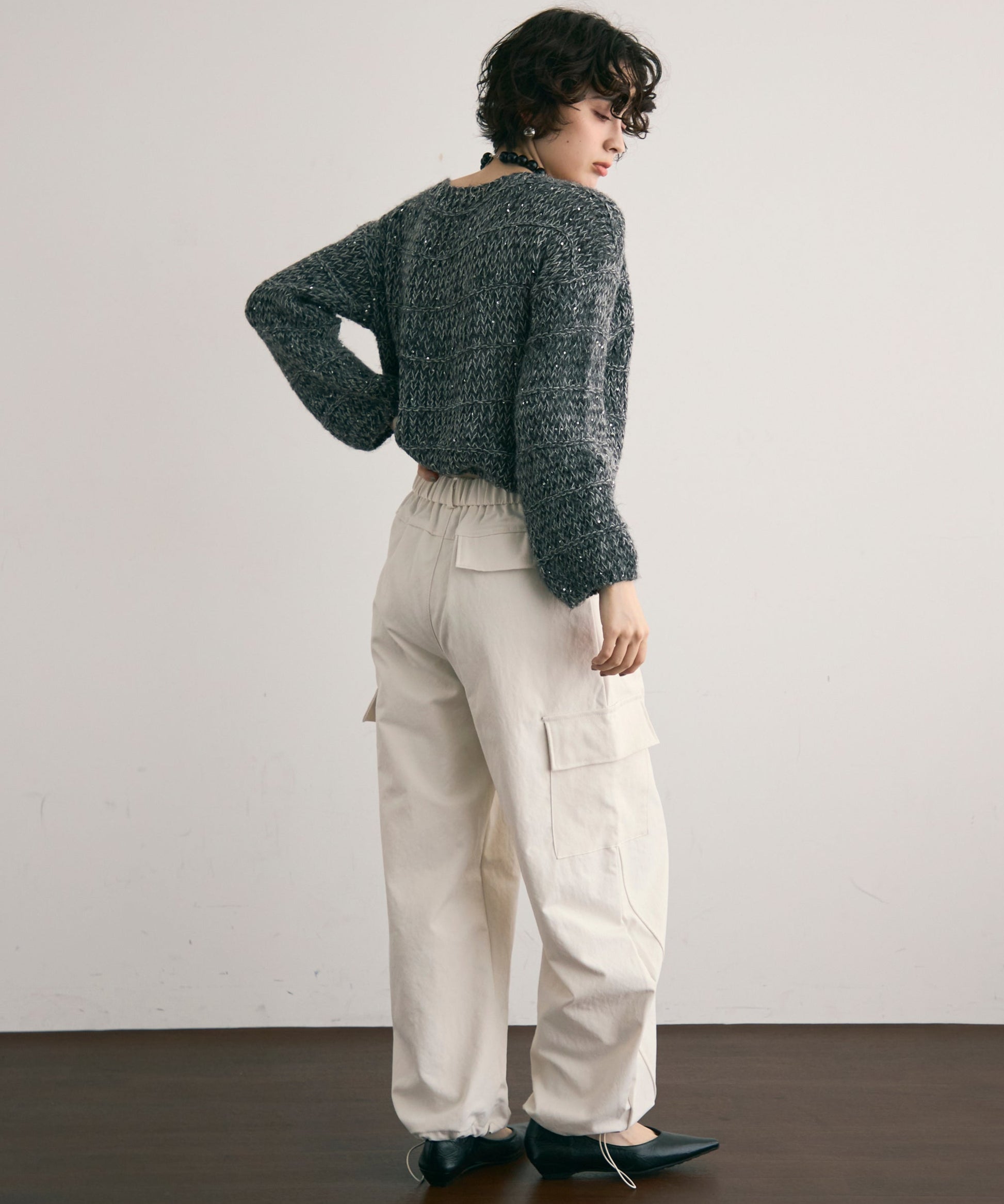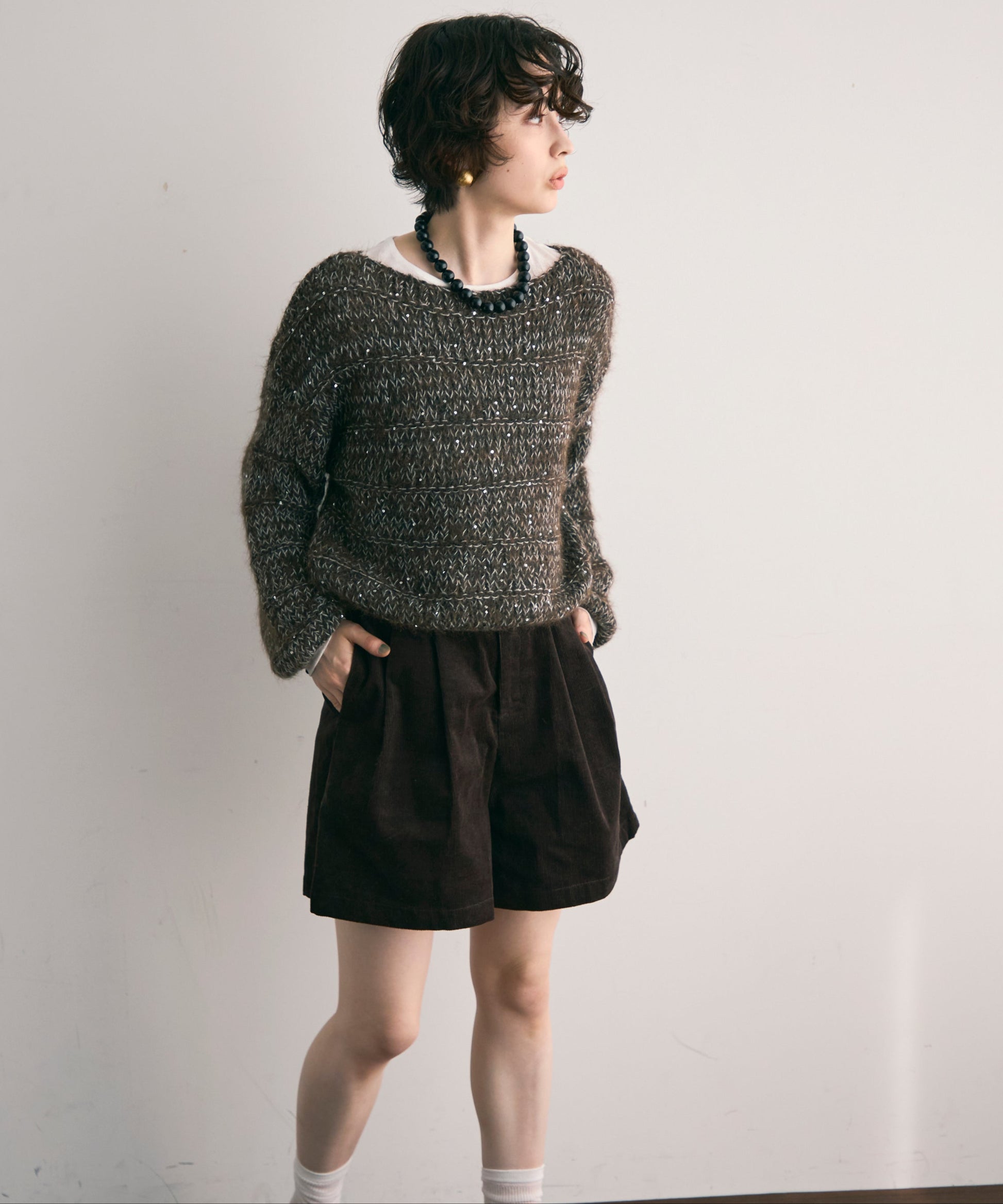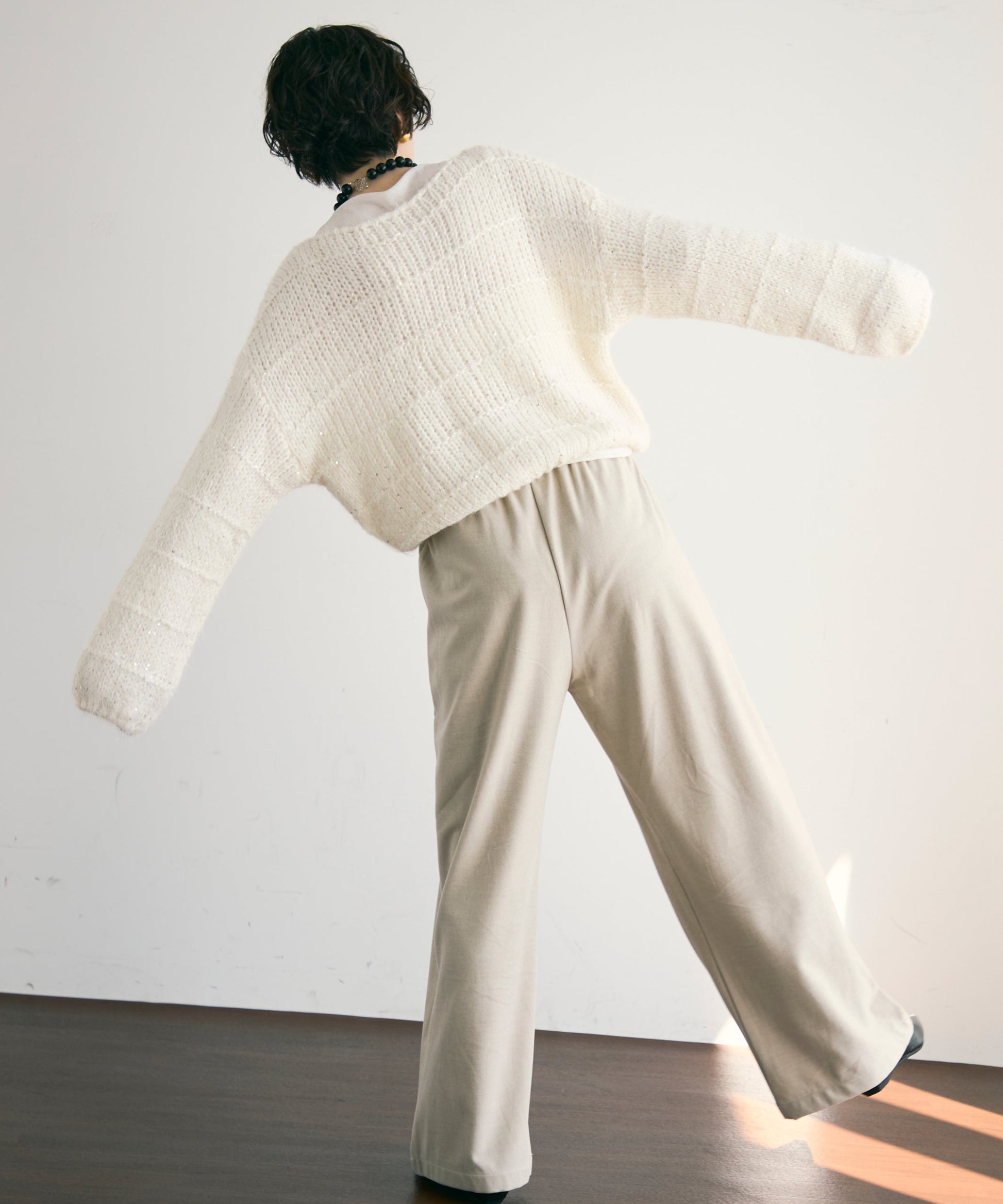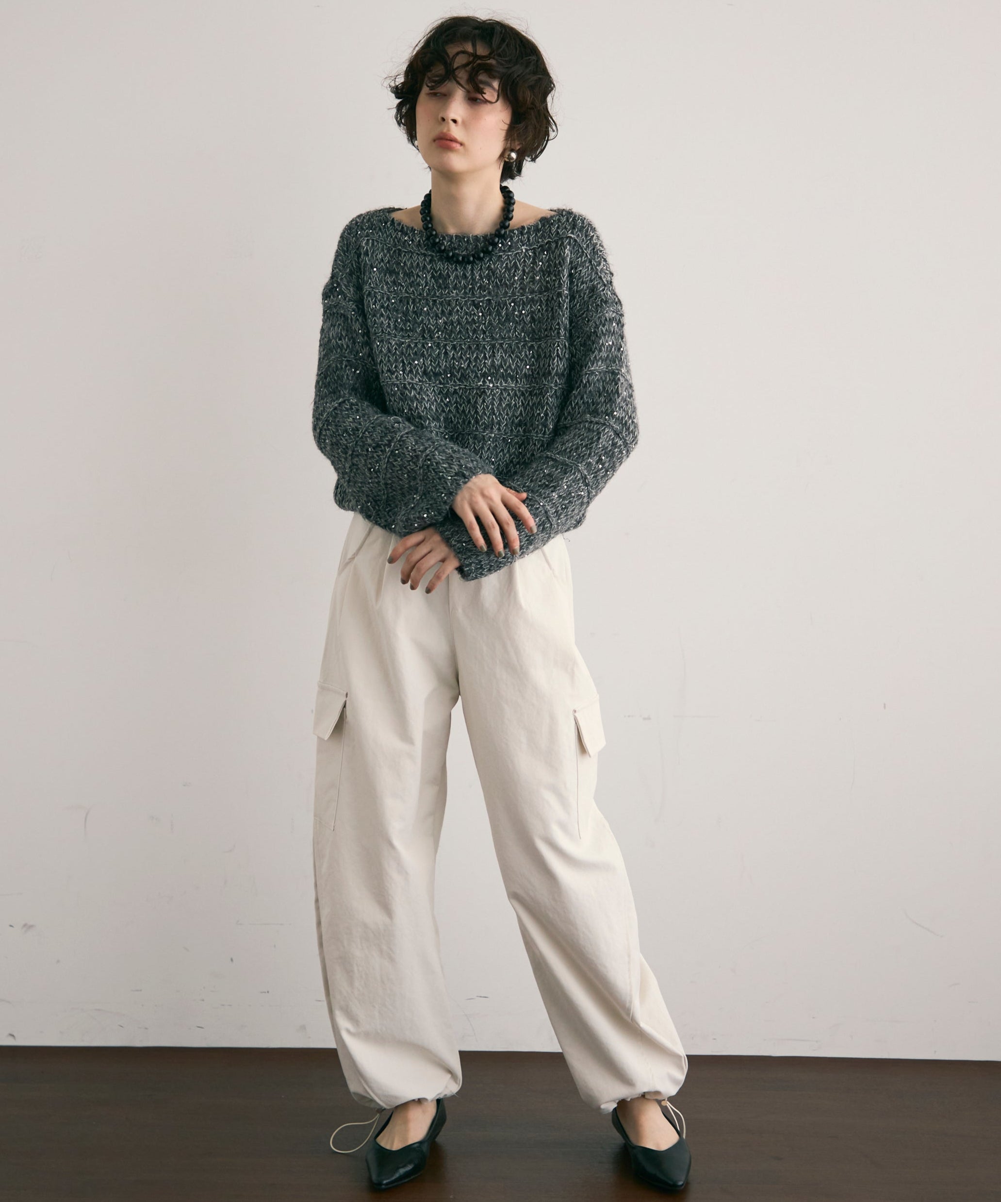 きらめくスパンコールを散りばめたルーズシルエットのニット。ほどよい透け感とゆったりとした落ち感が、大人の余裕を感じさせる一枚です。シンプルなボトムスと合わせるだけでコーディネートが華やぎ、デイリーにも特別な日にも活躍します。
