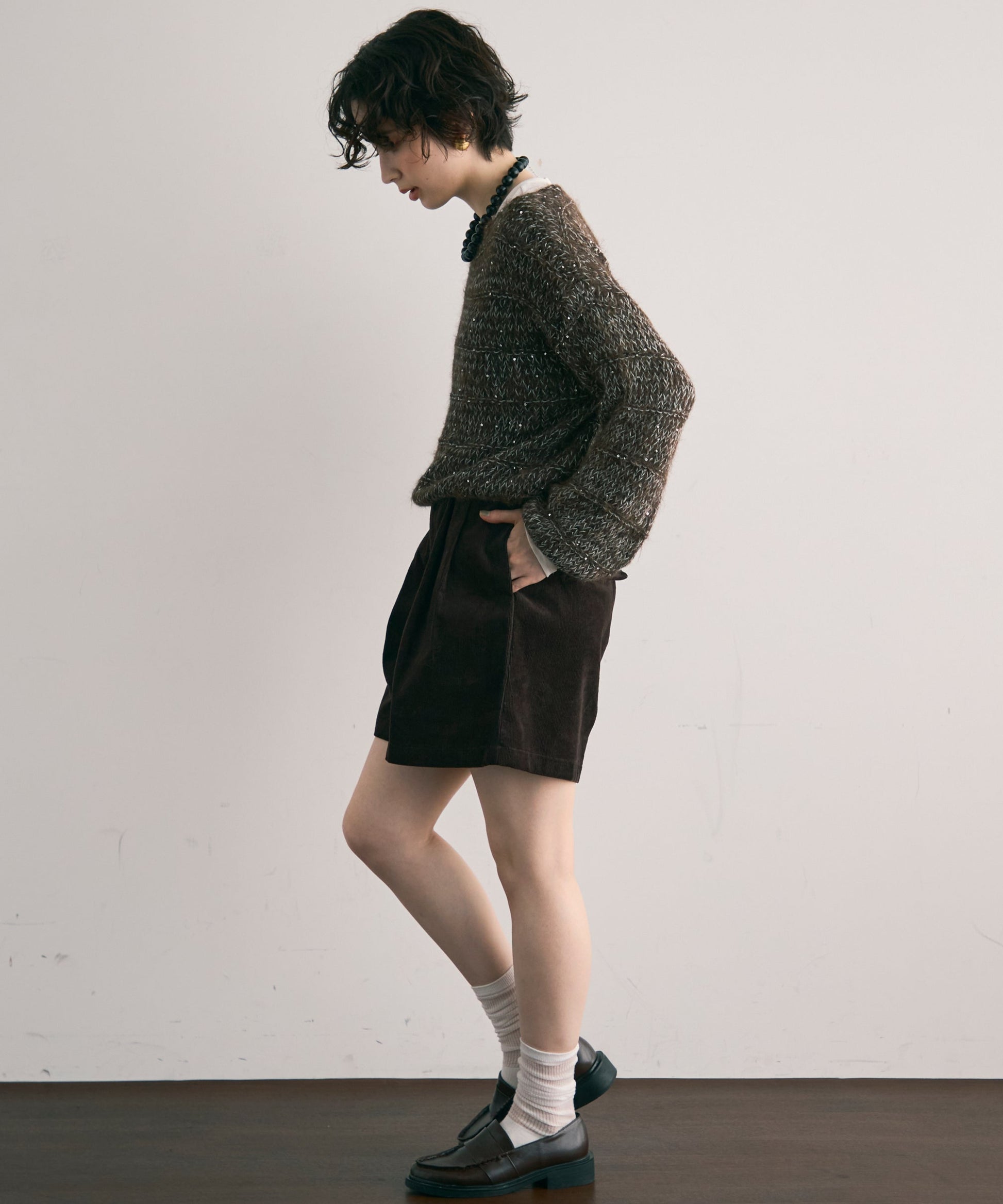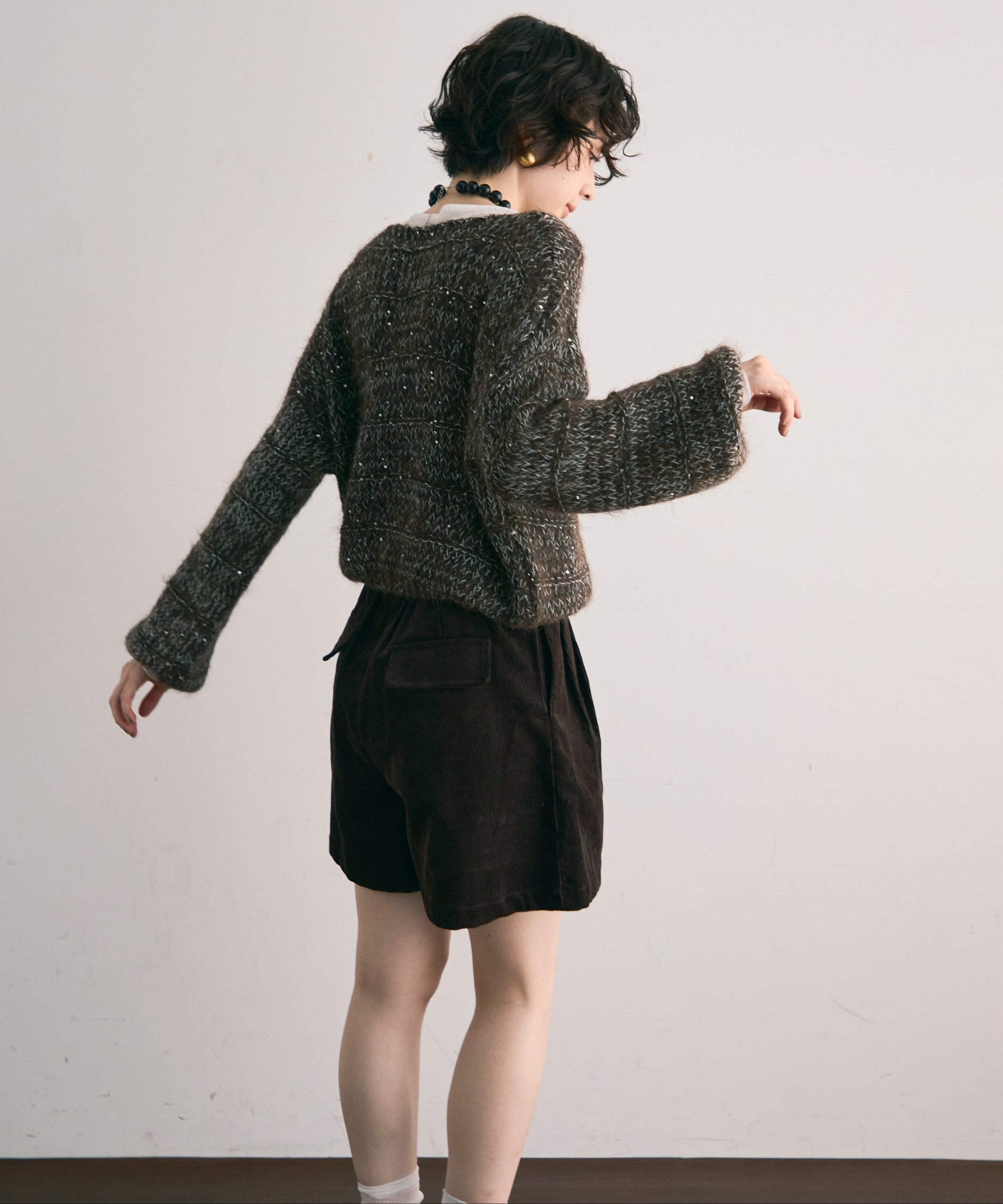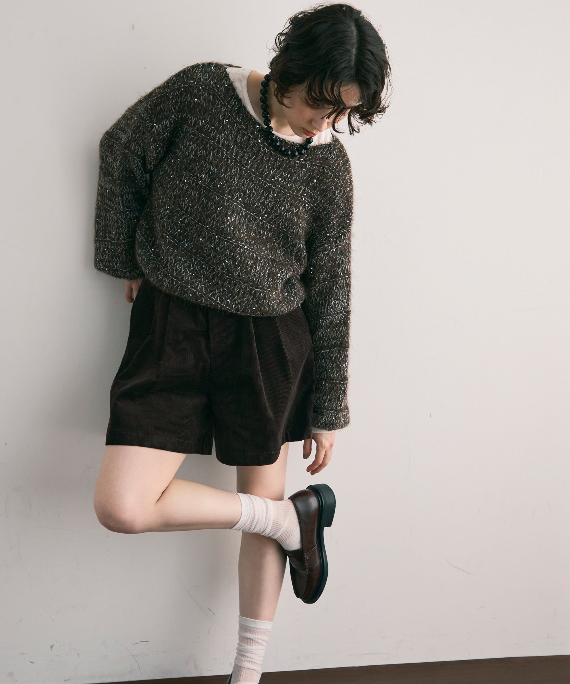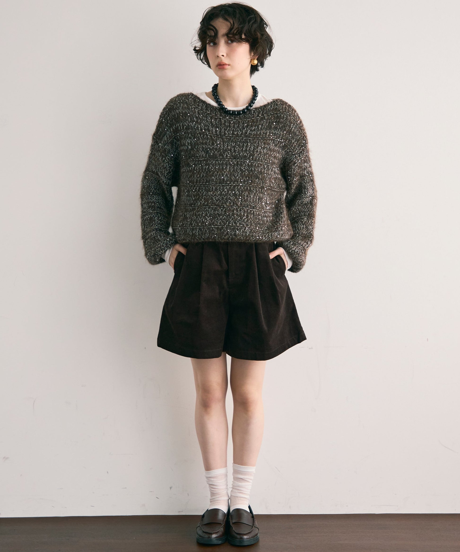 きらめくスパンコールを散りばめたルーズシルエットのニット。ほどよい透け感とゆったりとした落ち感が、大人の余裕を感じさせる一枚です。シンプルなボトムスと合わせるだけでコーディネートが華やぎ、デイリーにも特別な日にも活躍します。