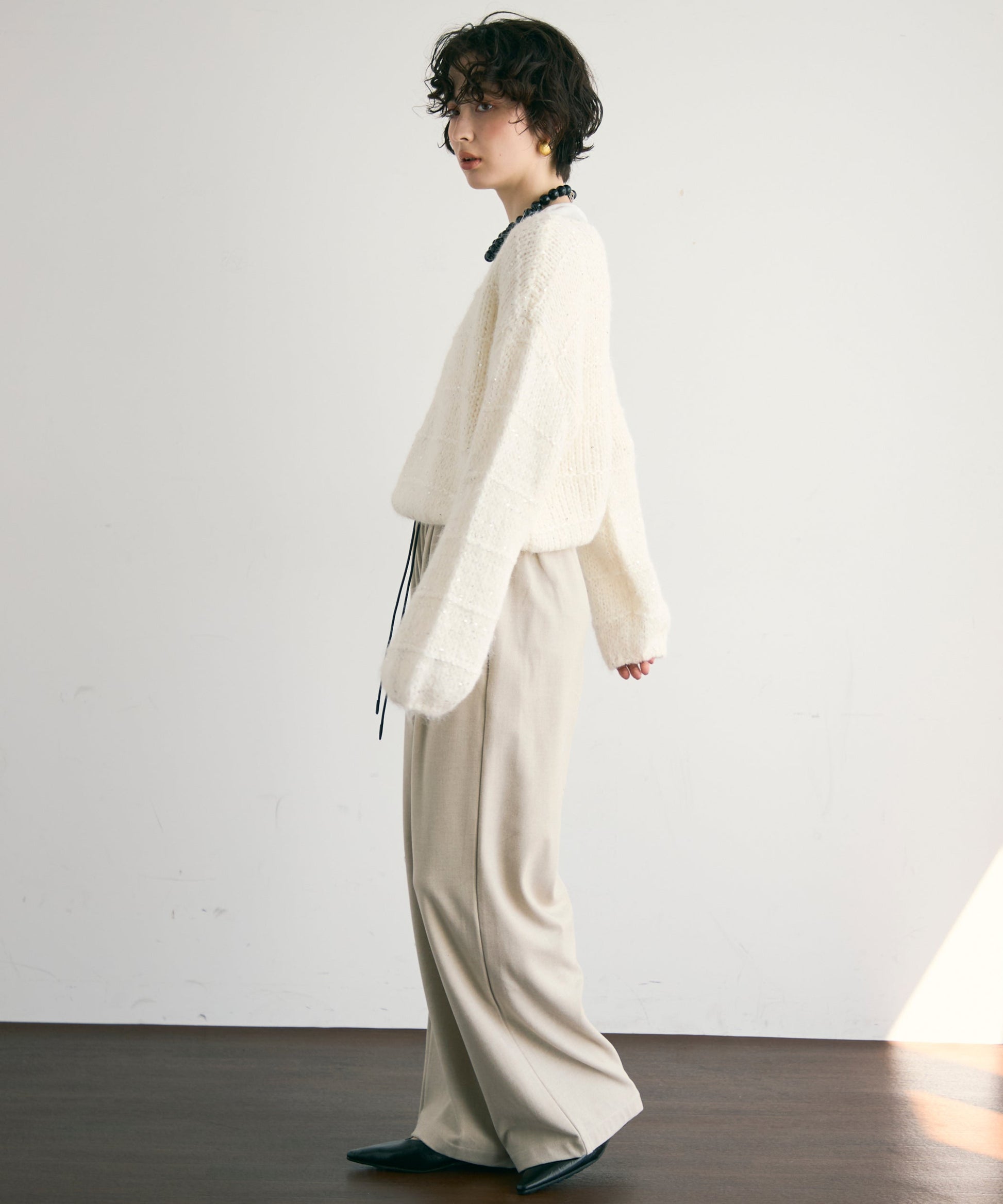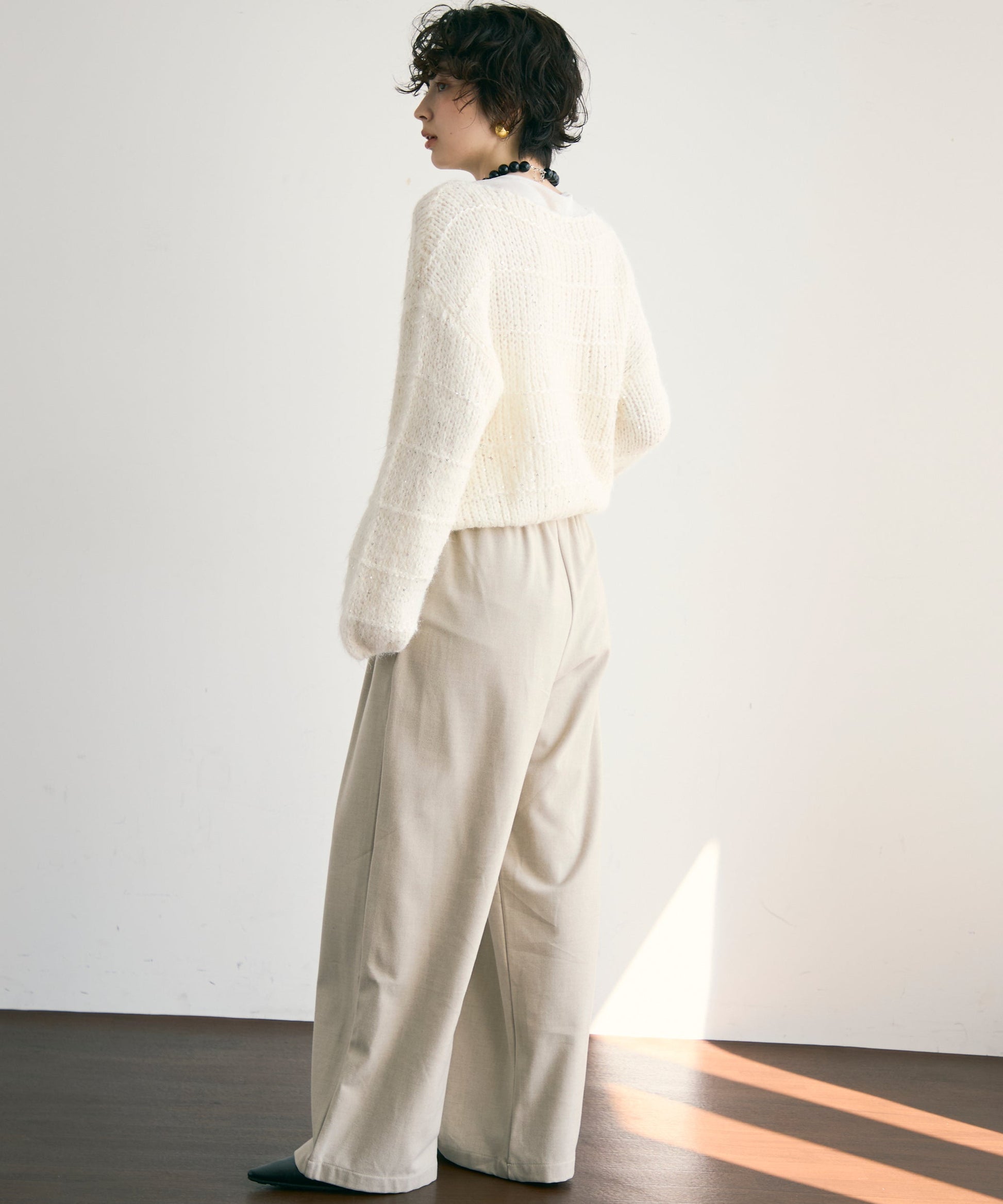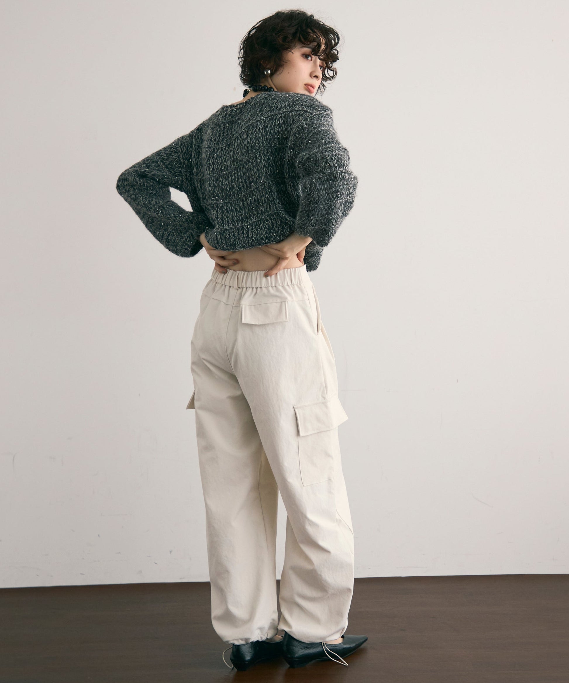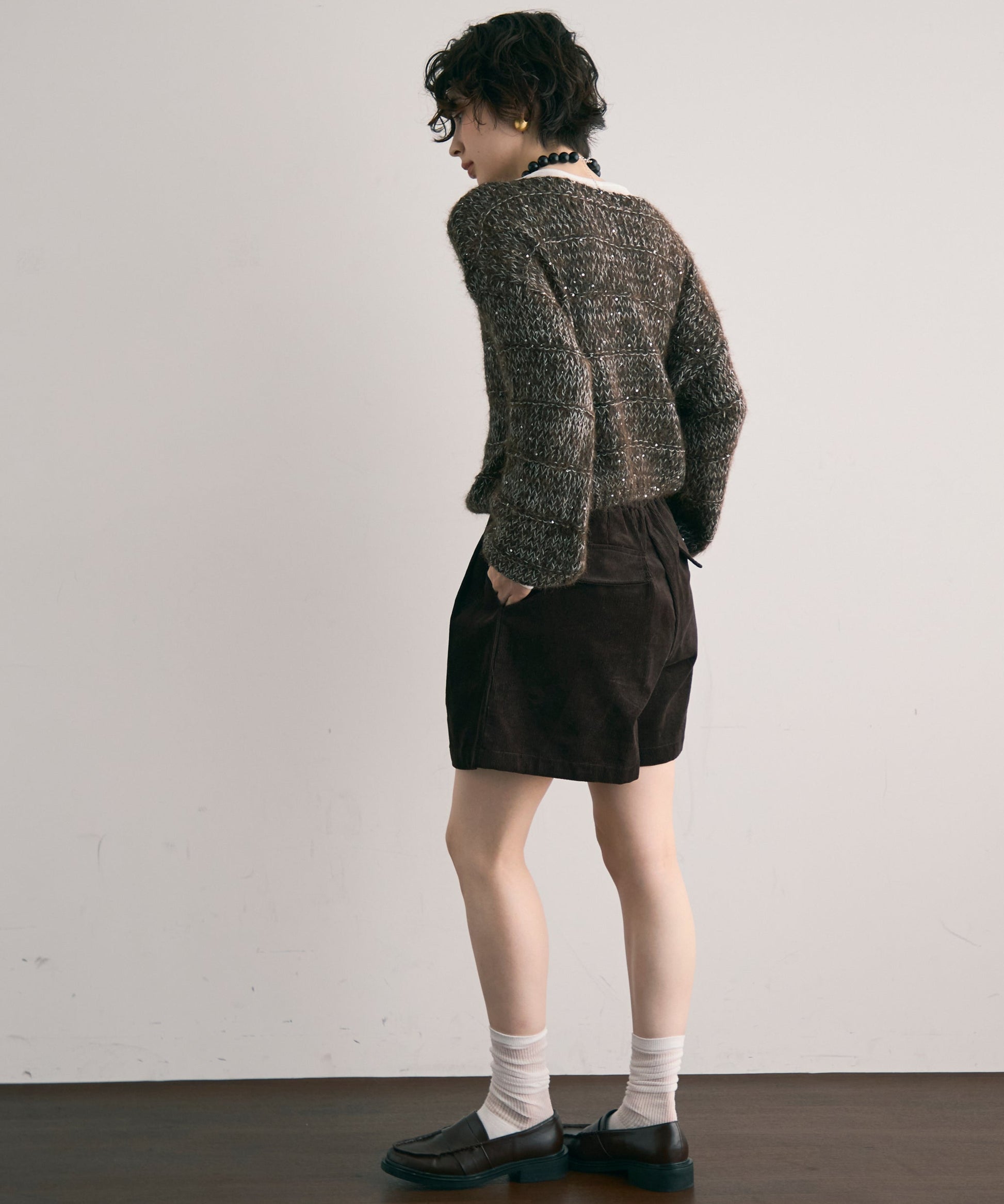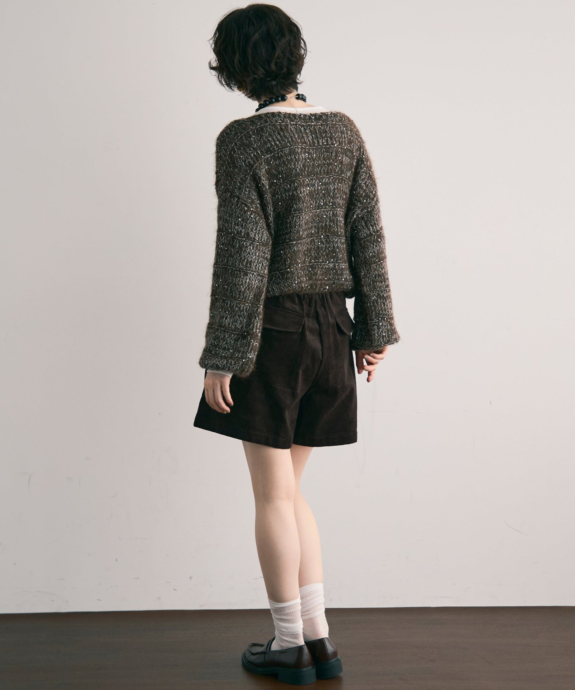 きらめくスパンコールを散りばめたルーズシルエットのニット。ほどよい透け感とゆったりとした落ち感が、大人の余裕を感じさせる一枚です。シンプルなボトムスと合わせるだけでコーディネートが華やぎ、デイリーにも特別な日にも活躍します。