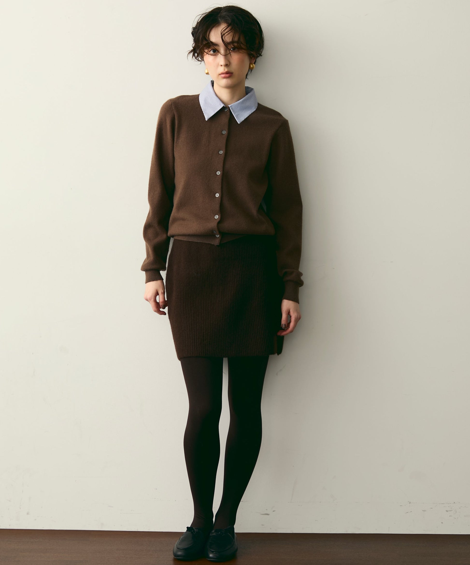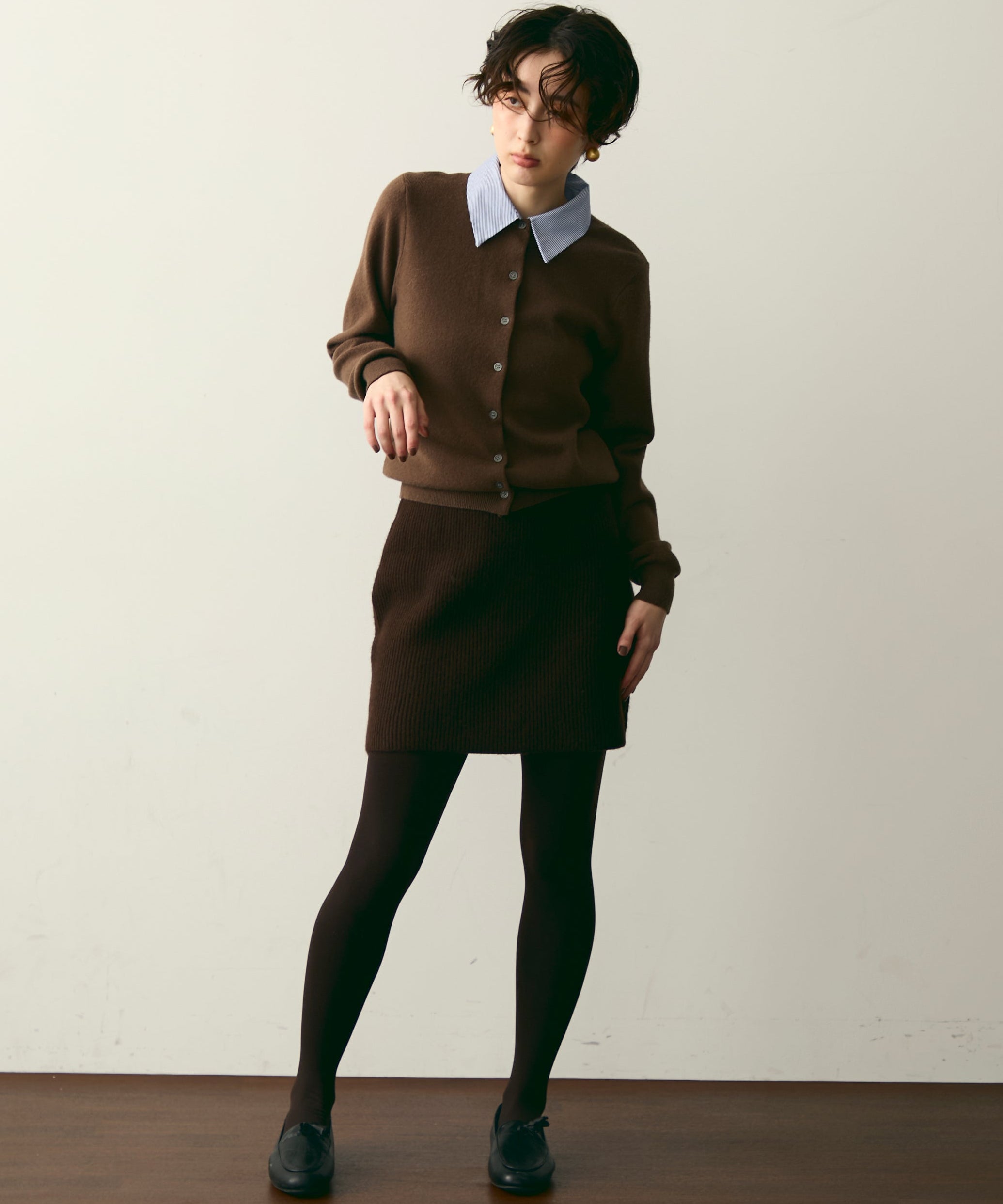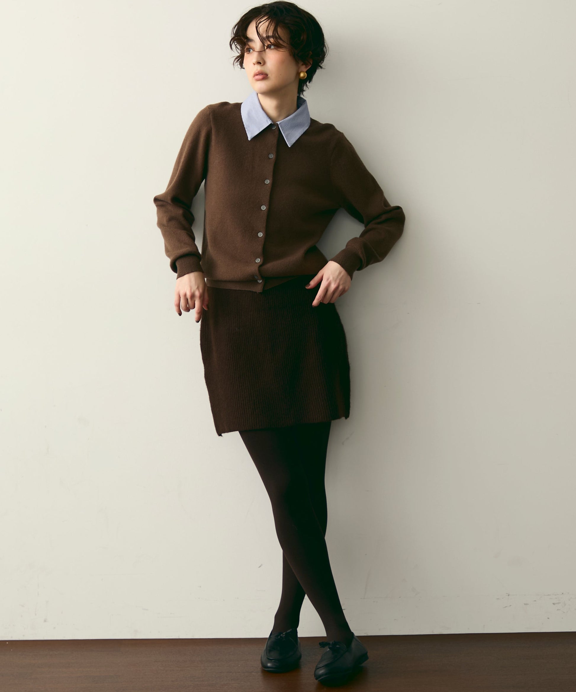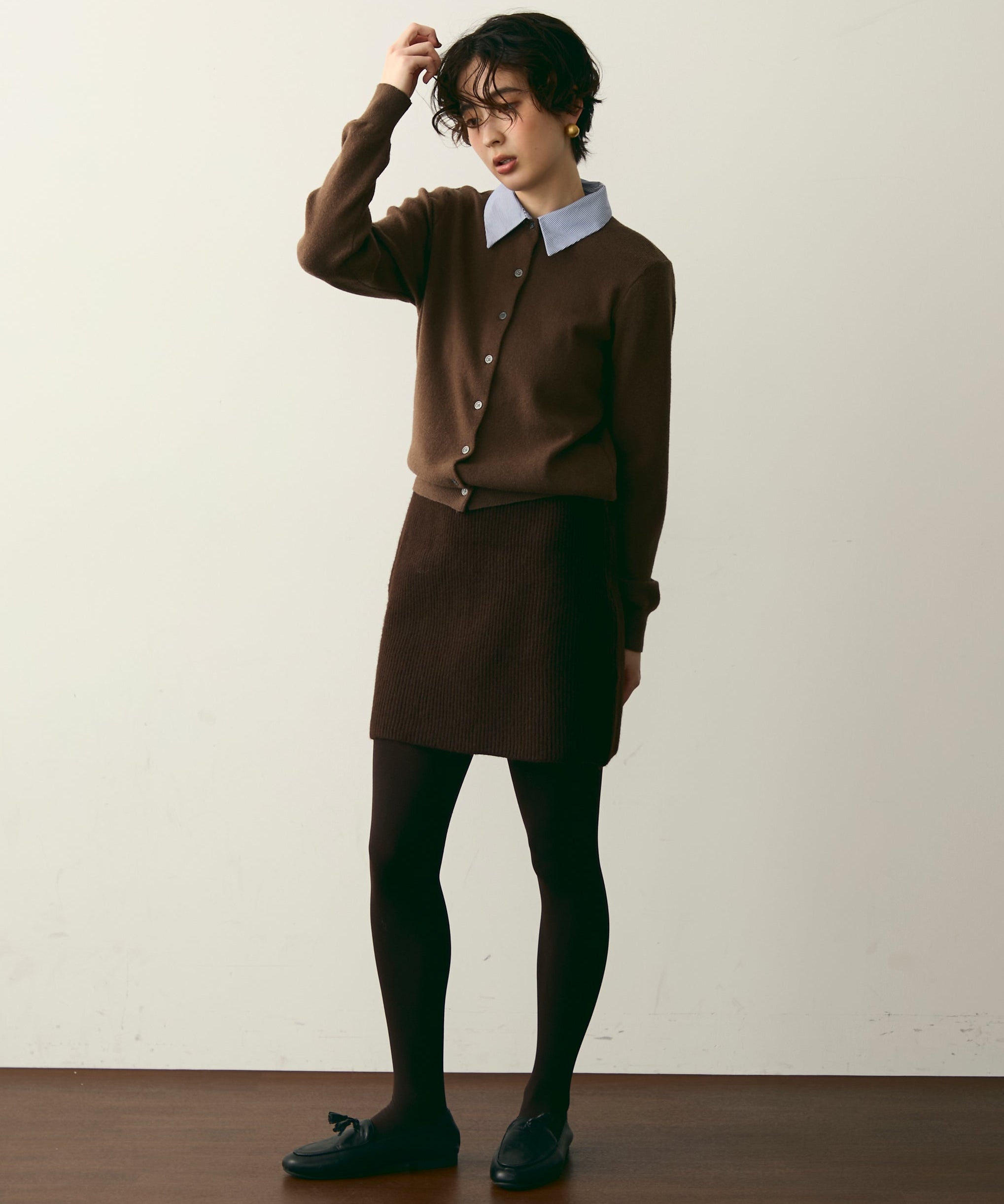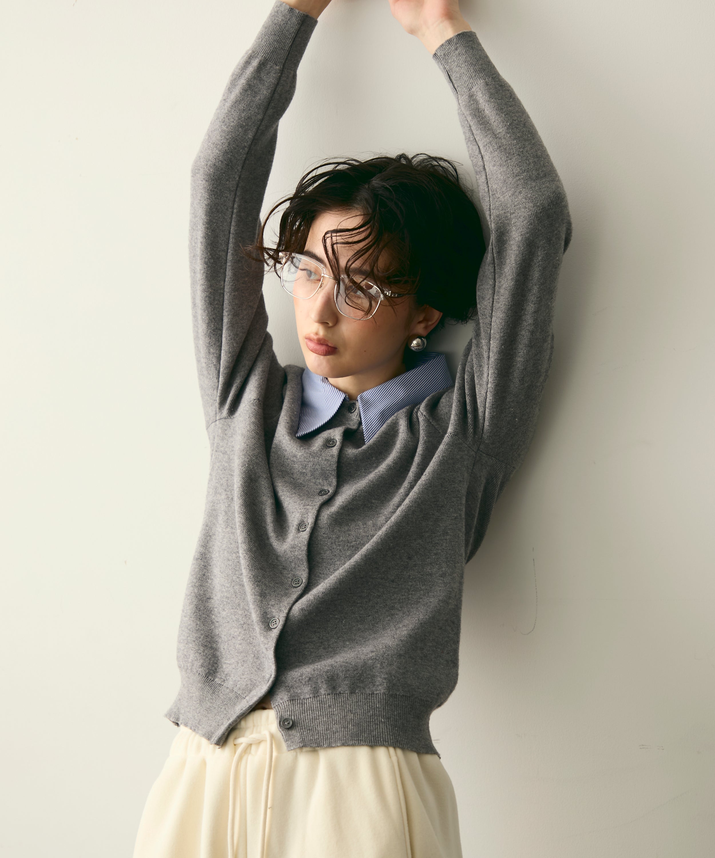 柔らかなニット素材で着心地も抜群、シンプルながらもストライプ衿がアクセントになり、コーディネートをぐっと引き締めます。