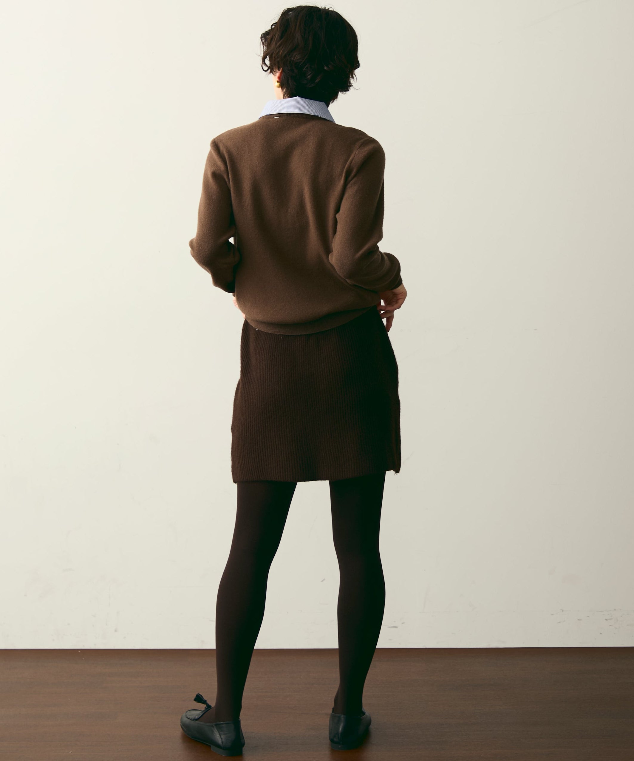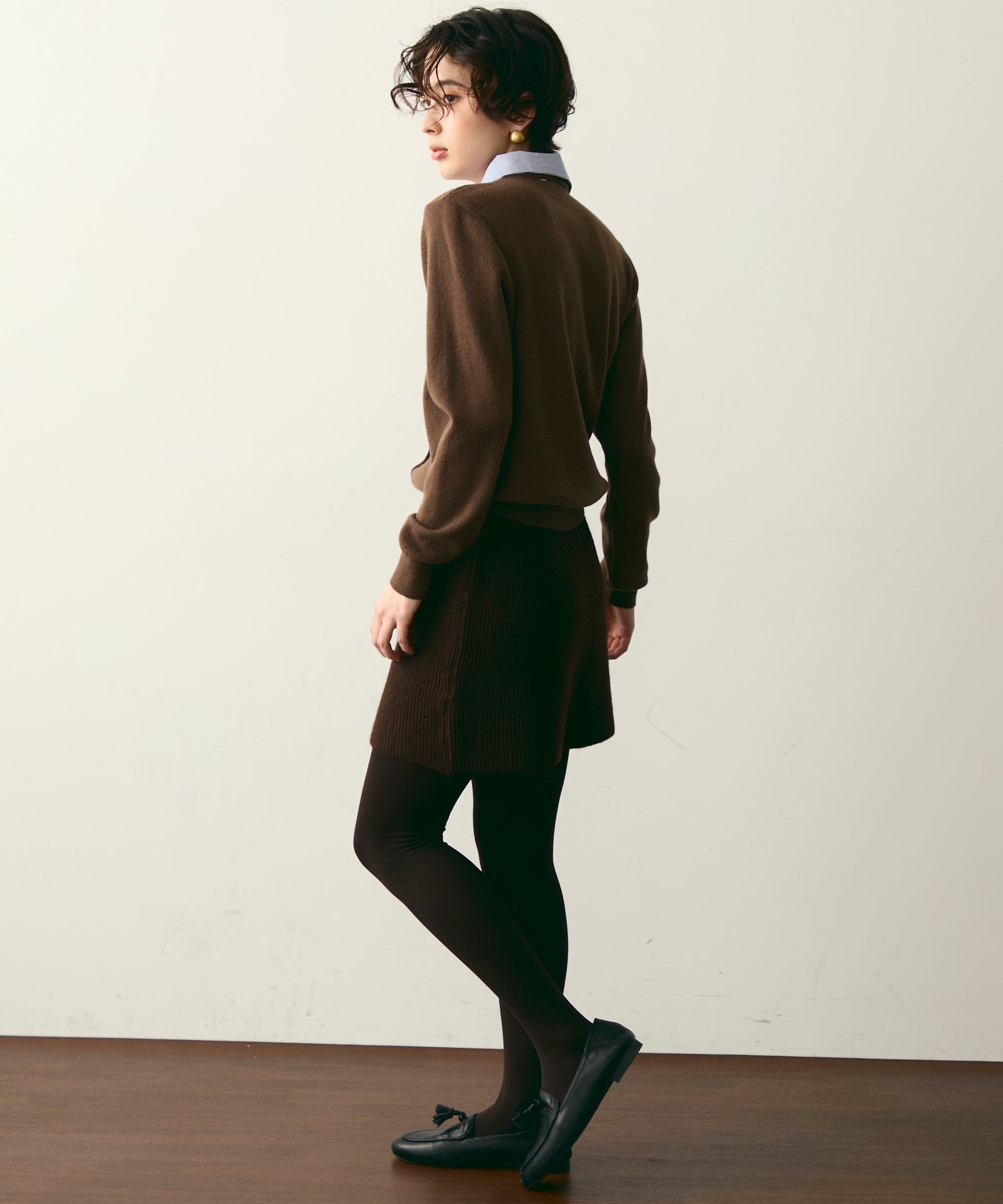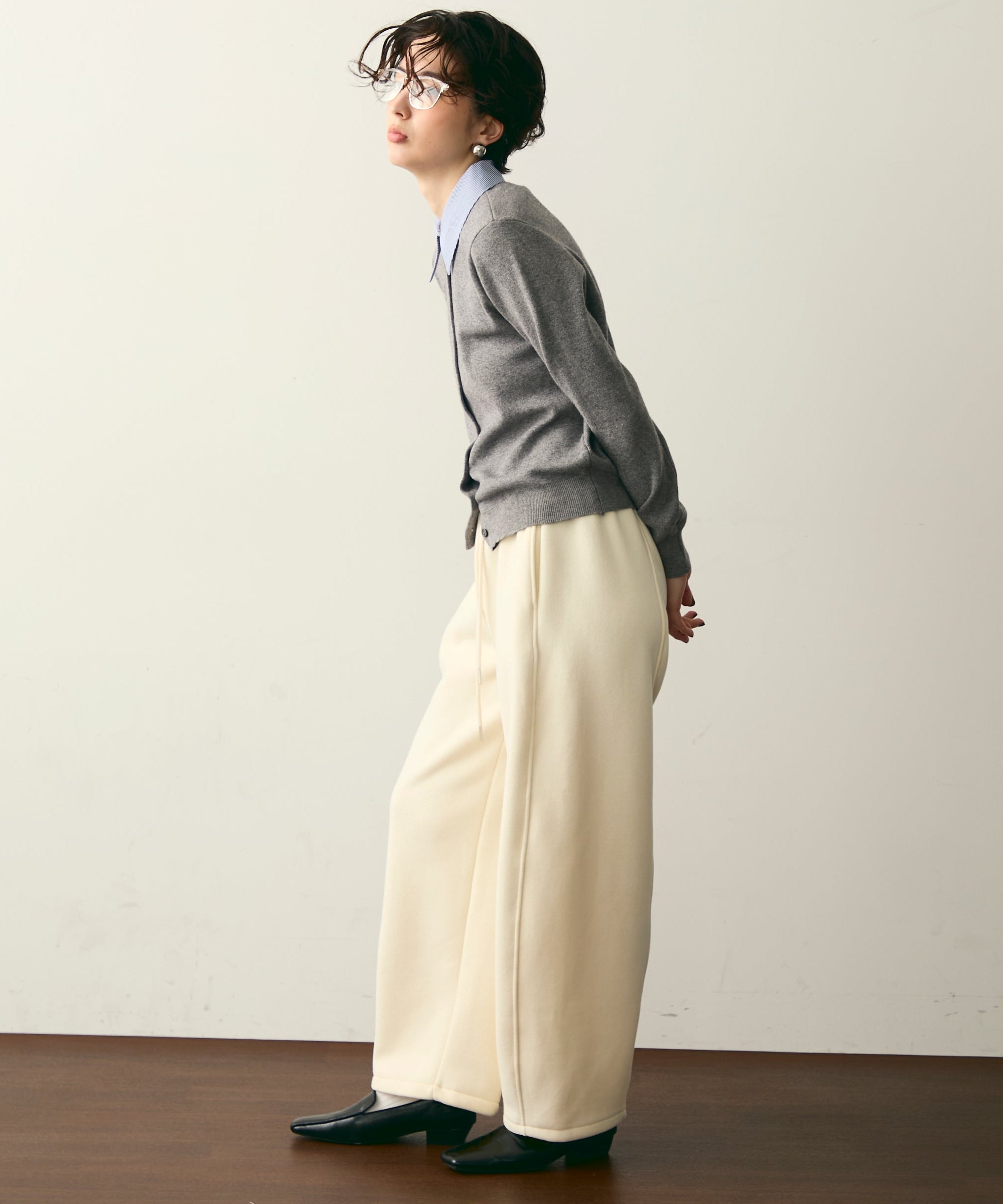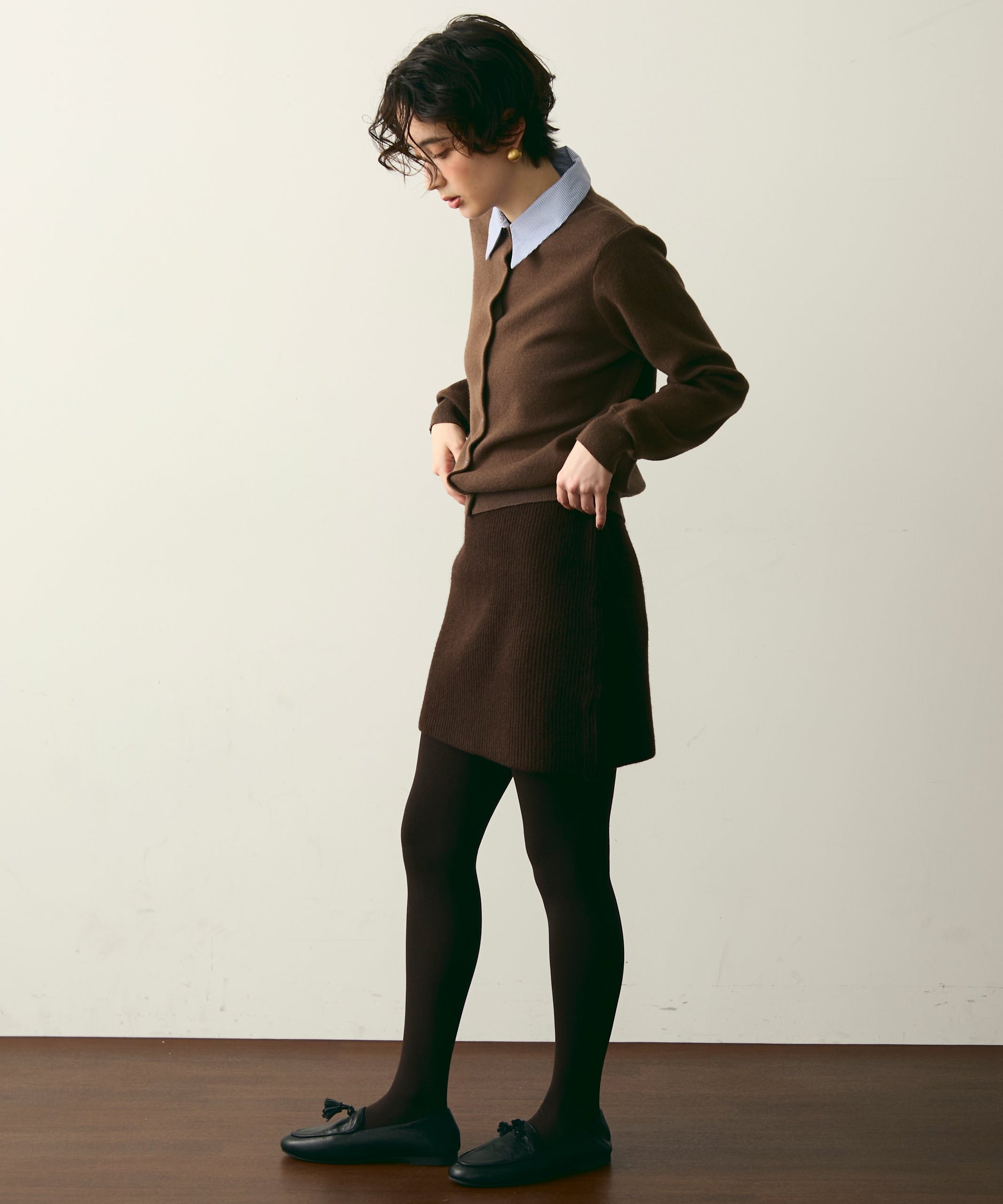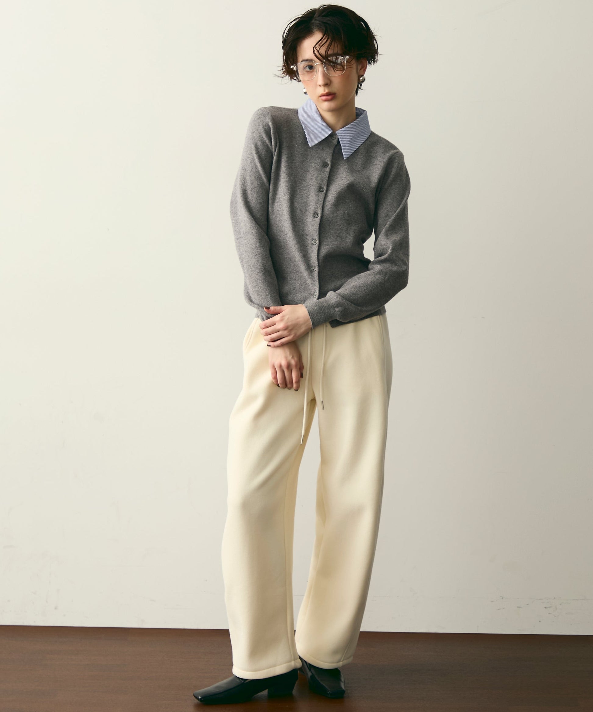 柔らかなニット素材で着心地も抜群、シンプルながらもストライプ衿がアクセントになり、コーディネートをぐっと引き締めます。