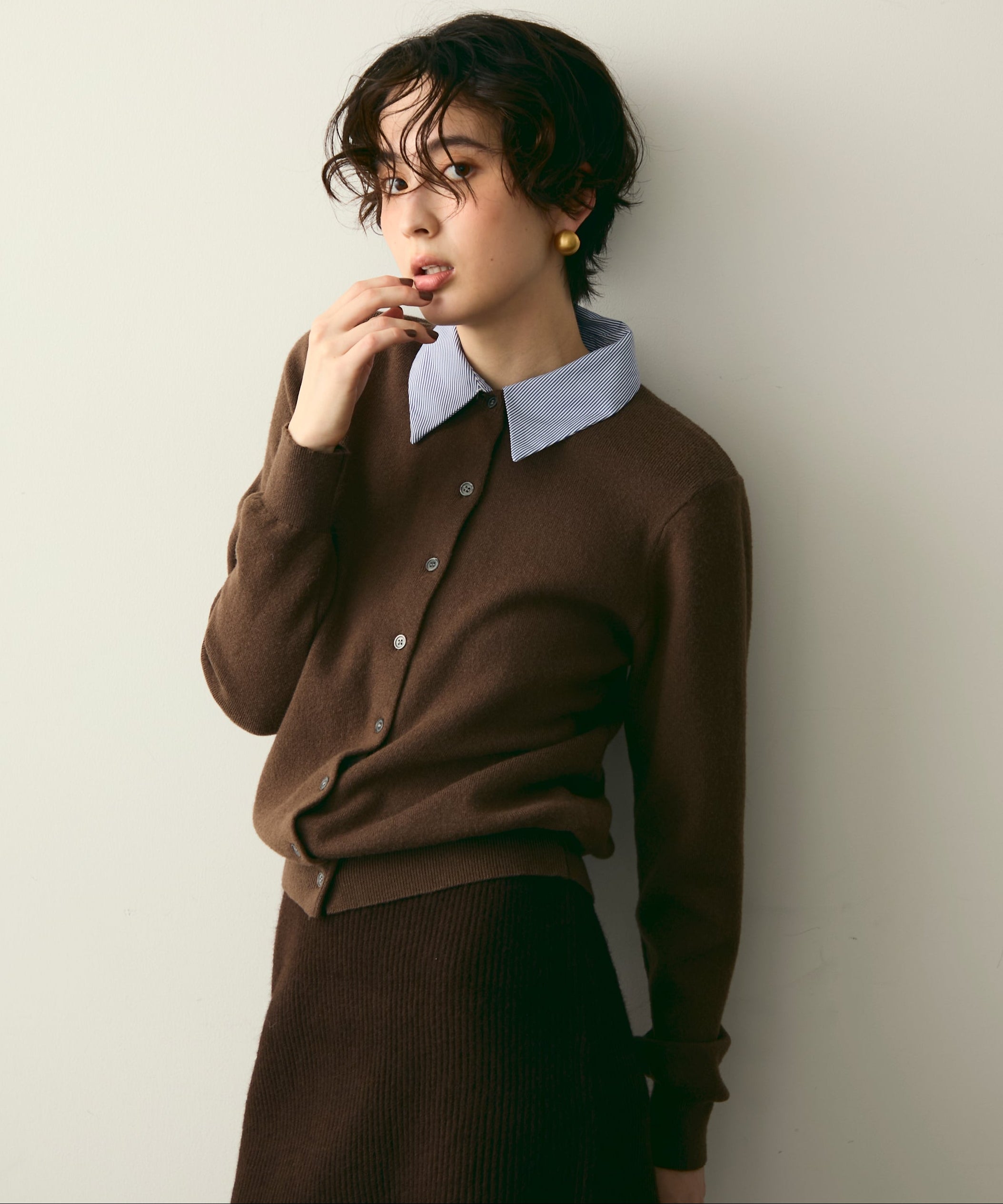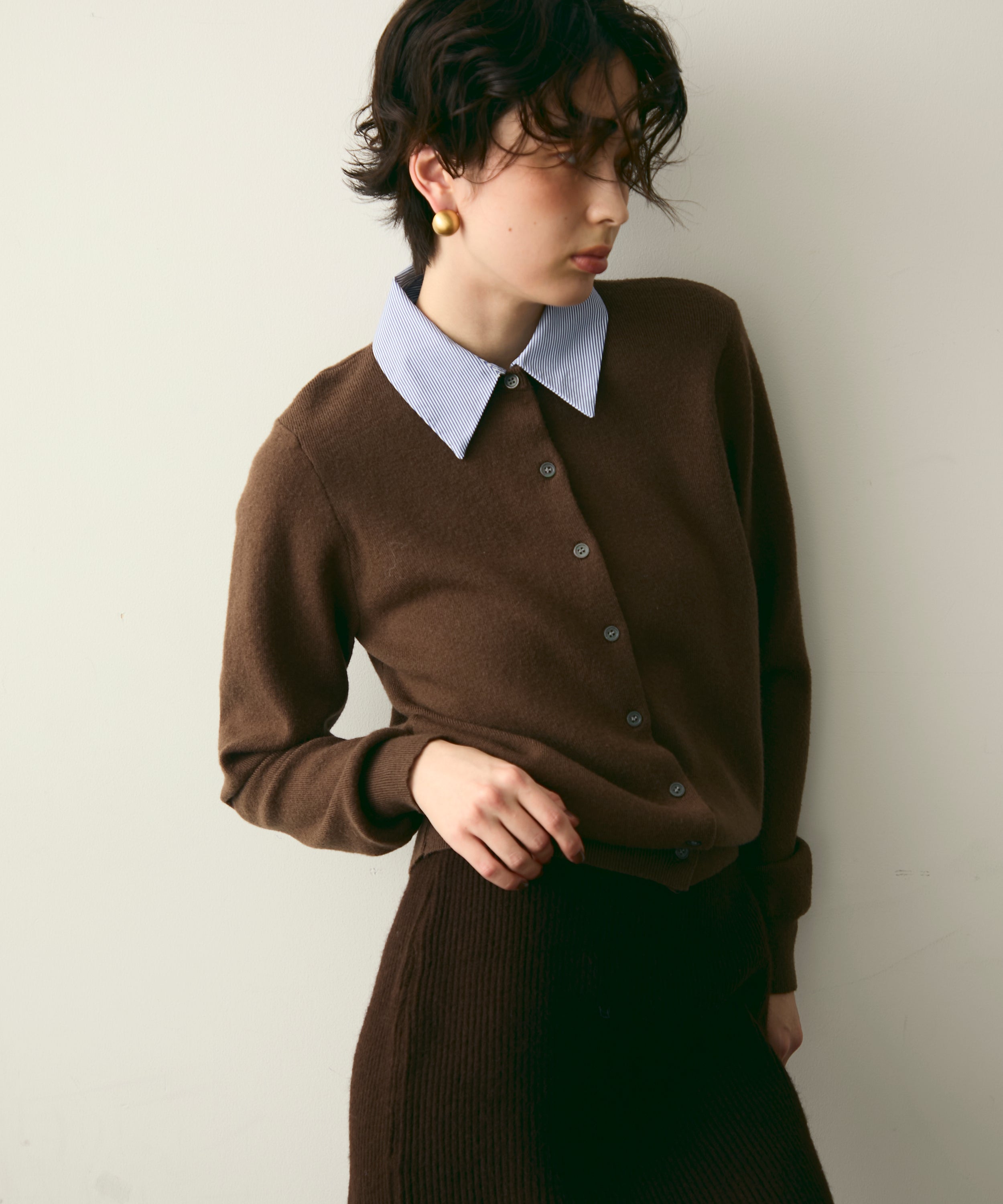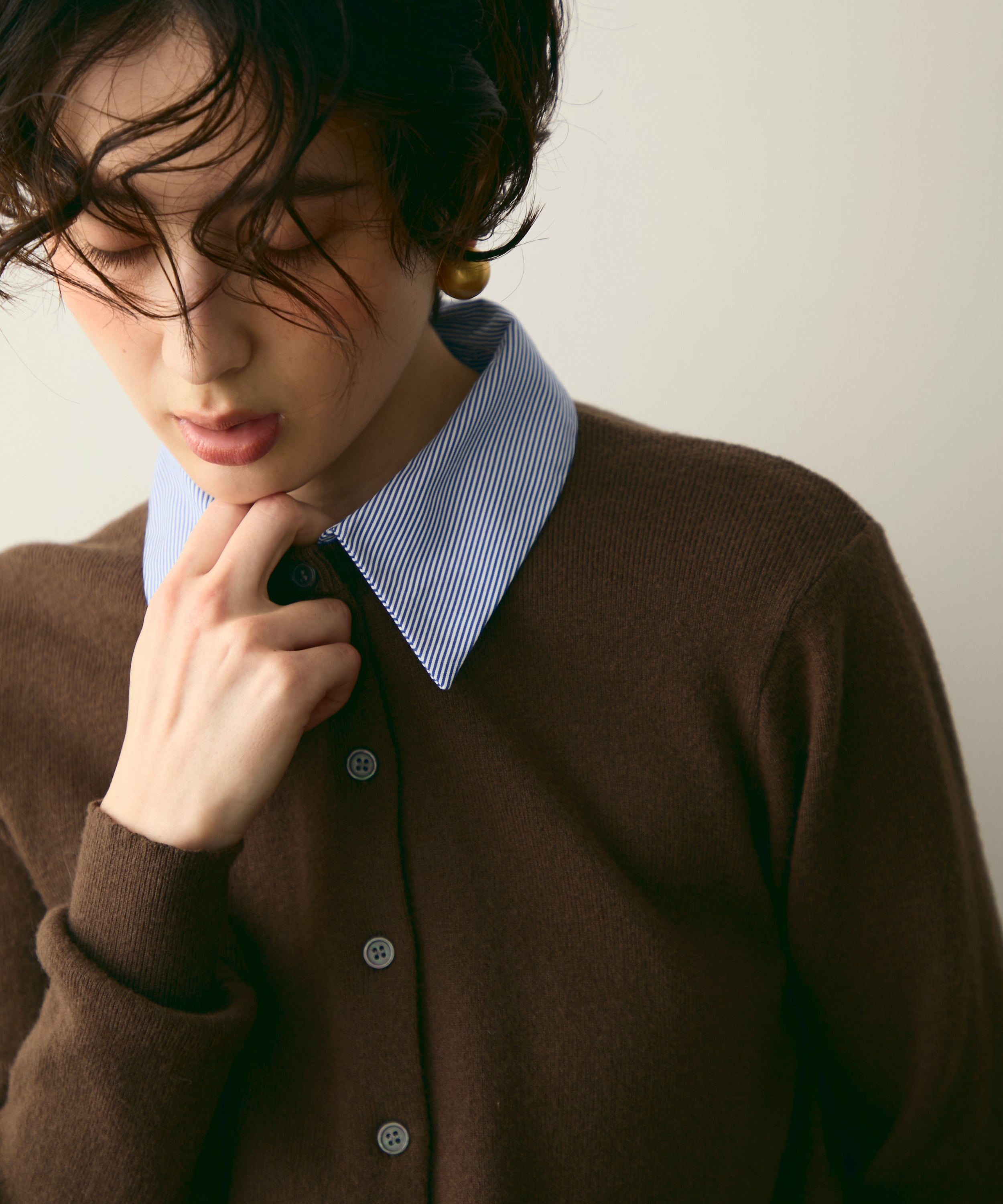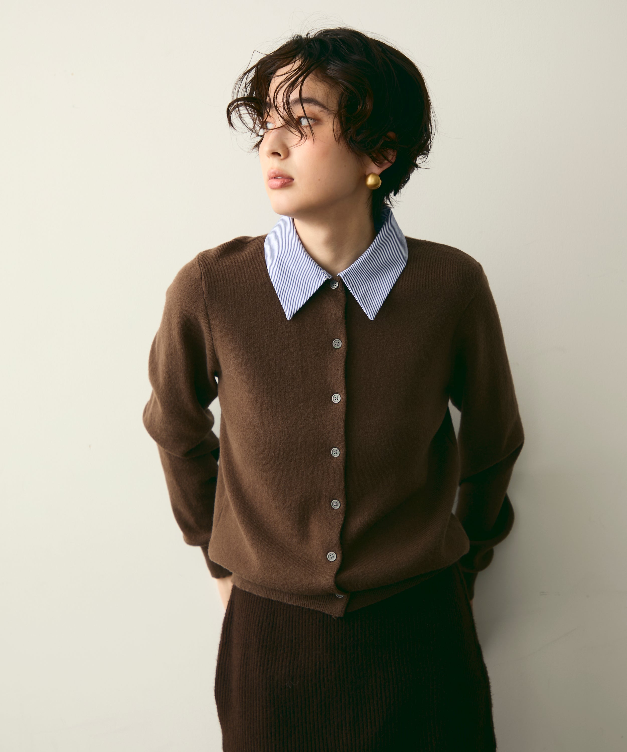 着こなしの幅が広がる、衿取り外し可能なストライプ衿付きニットカーディガンです。