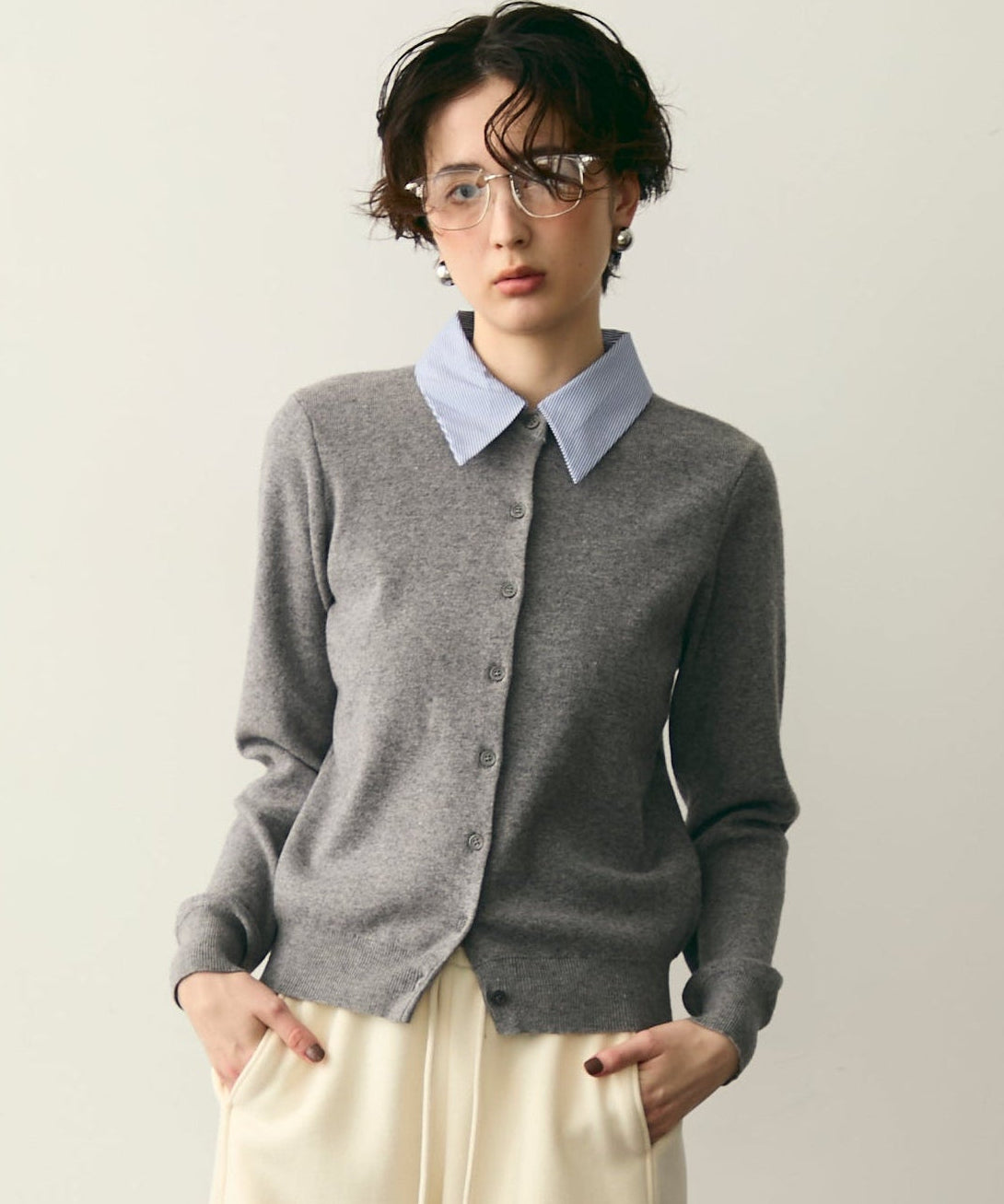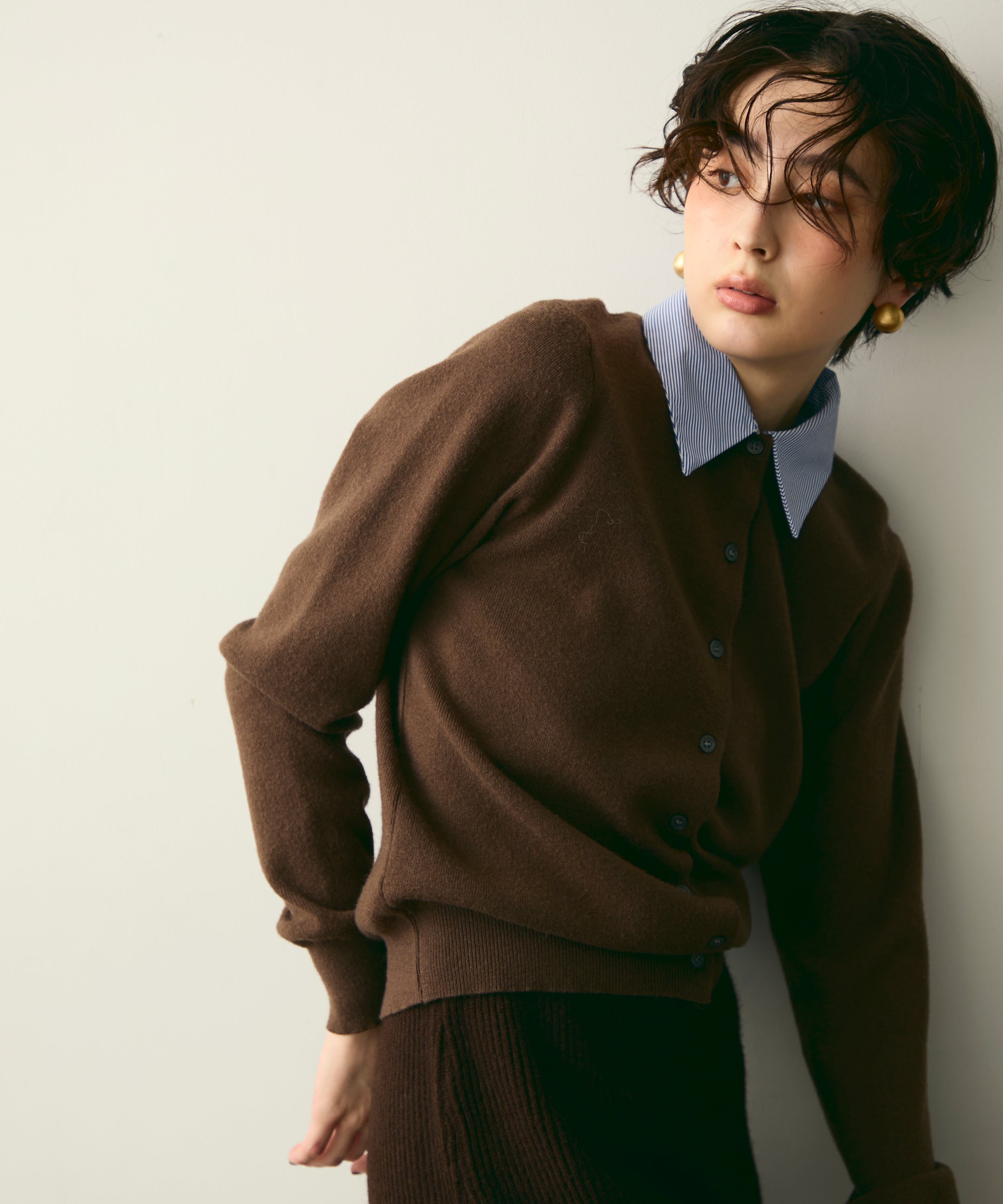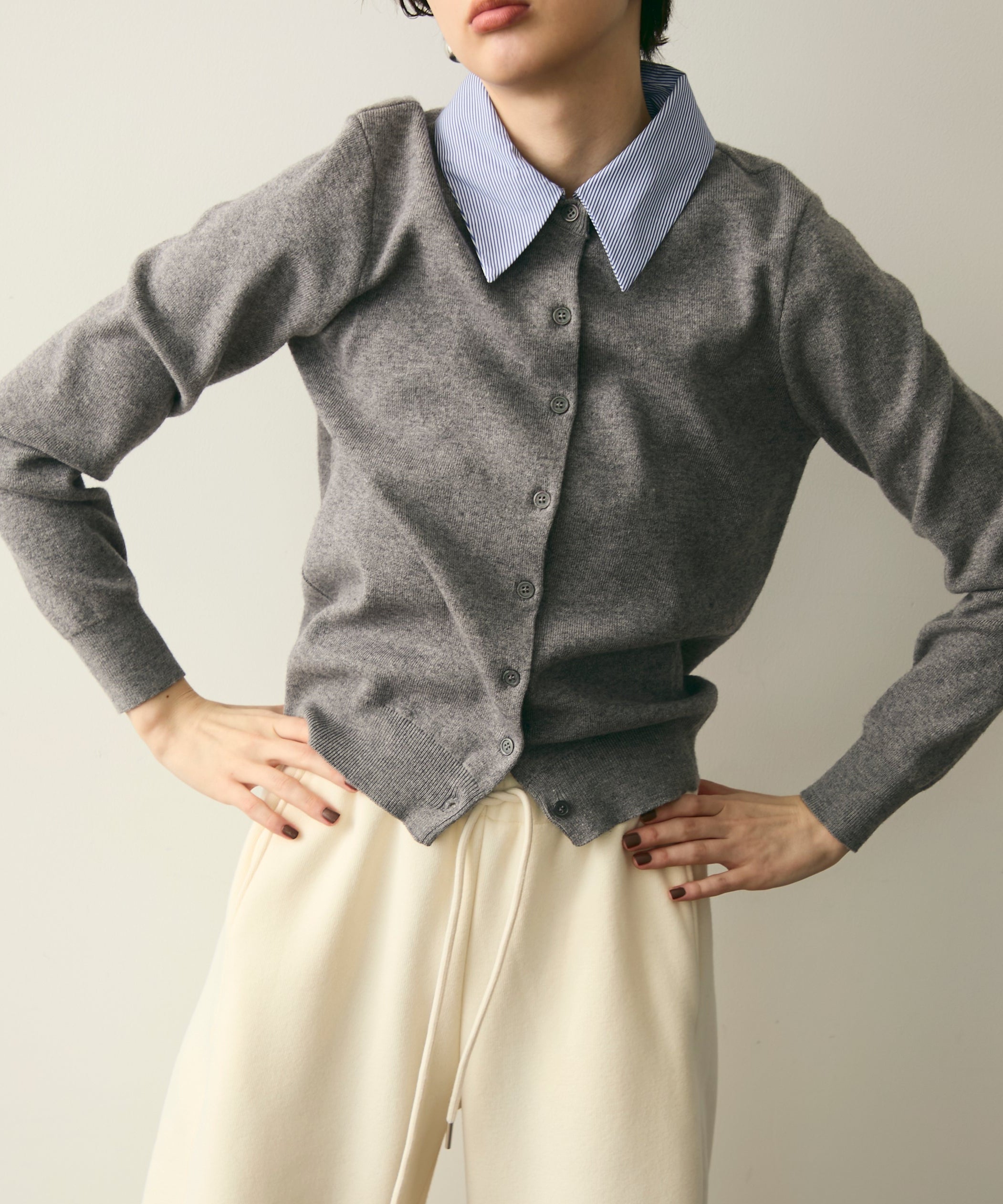 着こなしの幅が広がる、衿取り外し可能なストライプ衿付きニットカーディガンです。