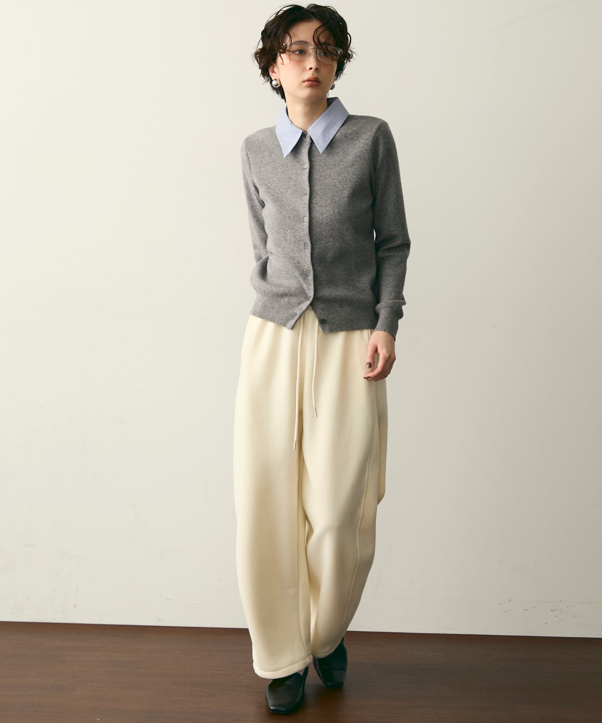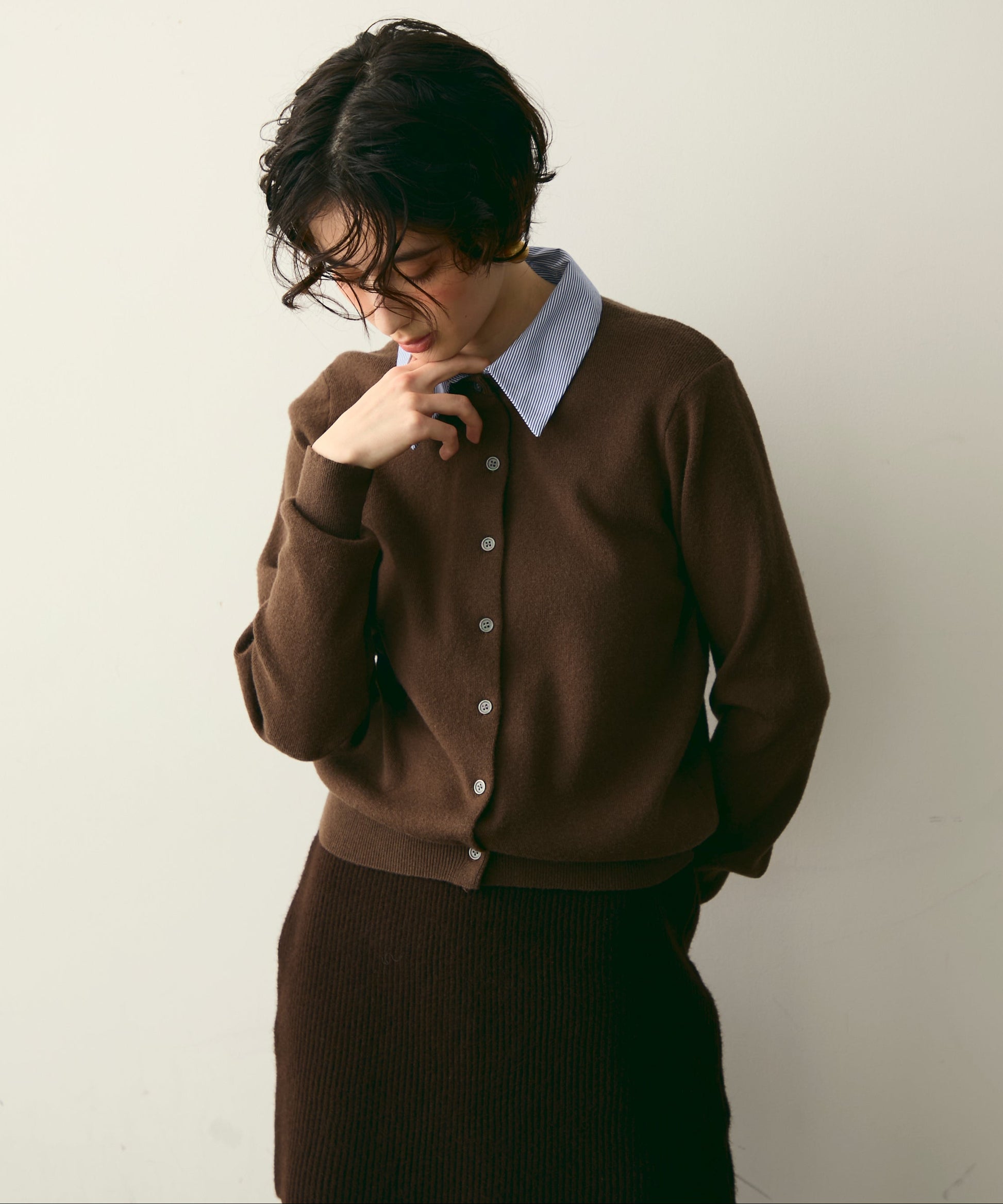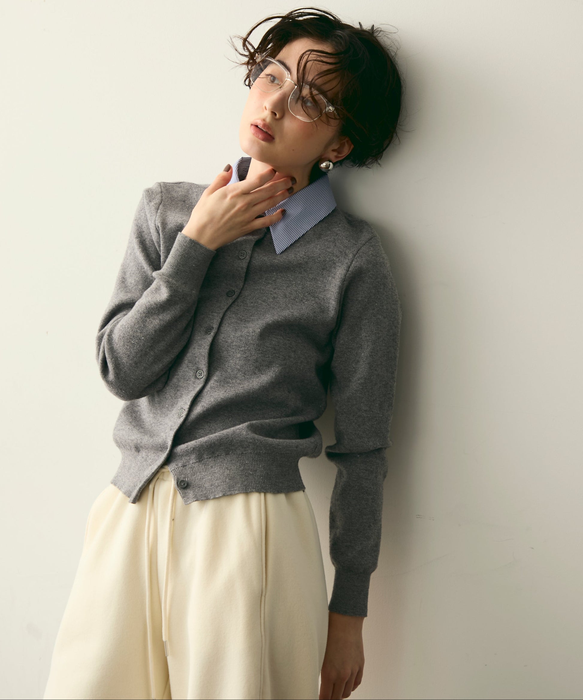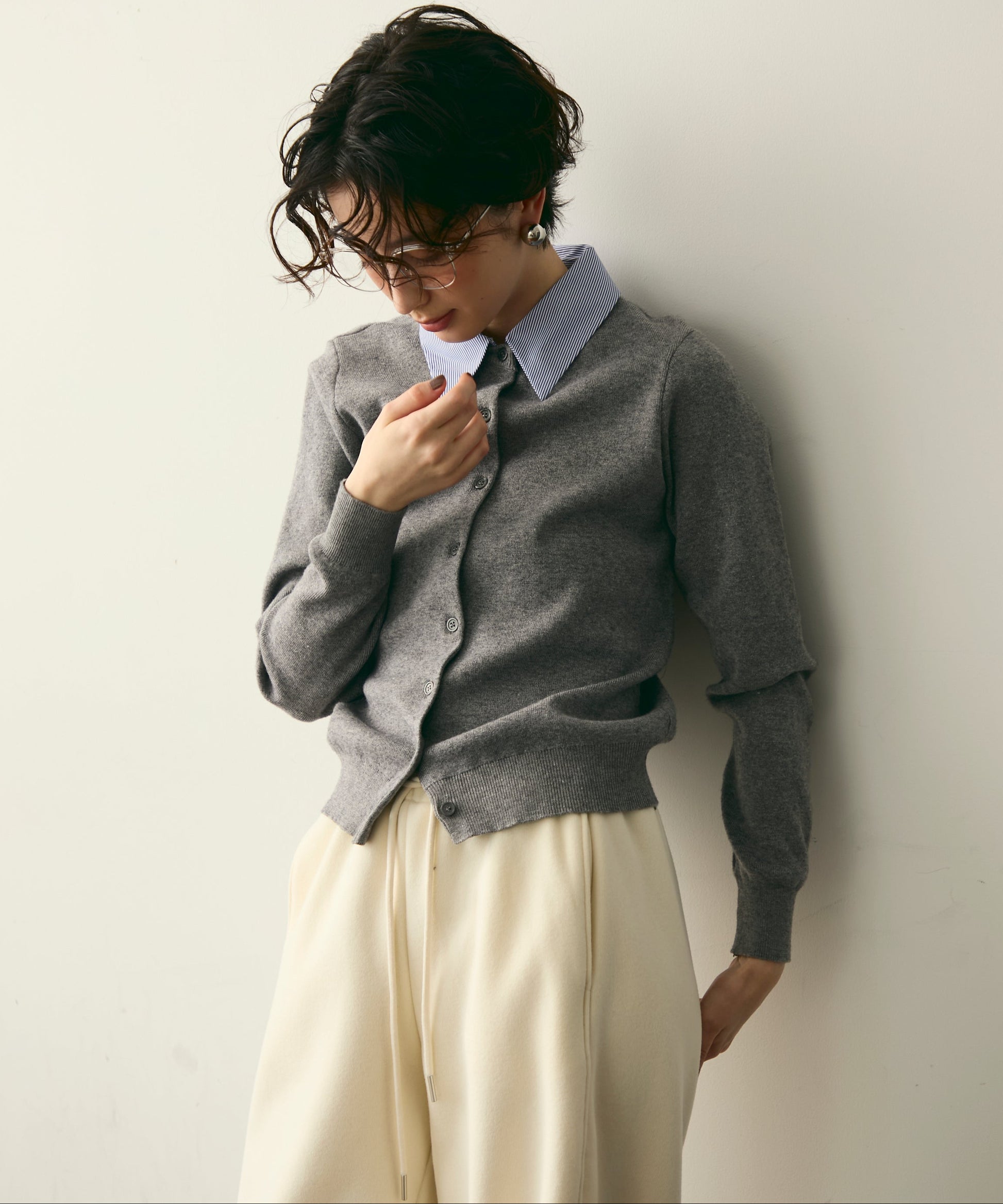 着こなしの幅が広がる、衿取り外し可能なストライプ衿付きニットカーディガンです。