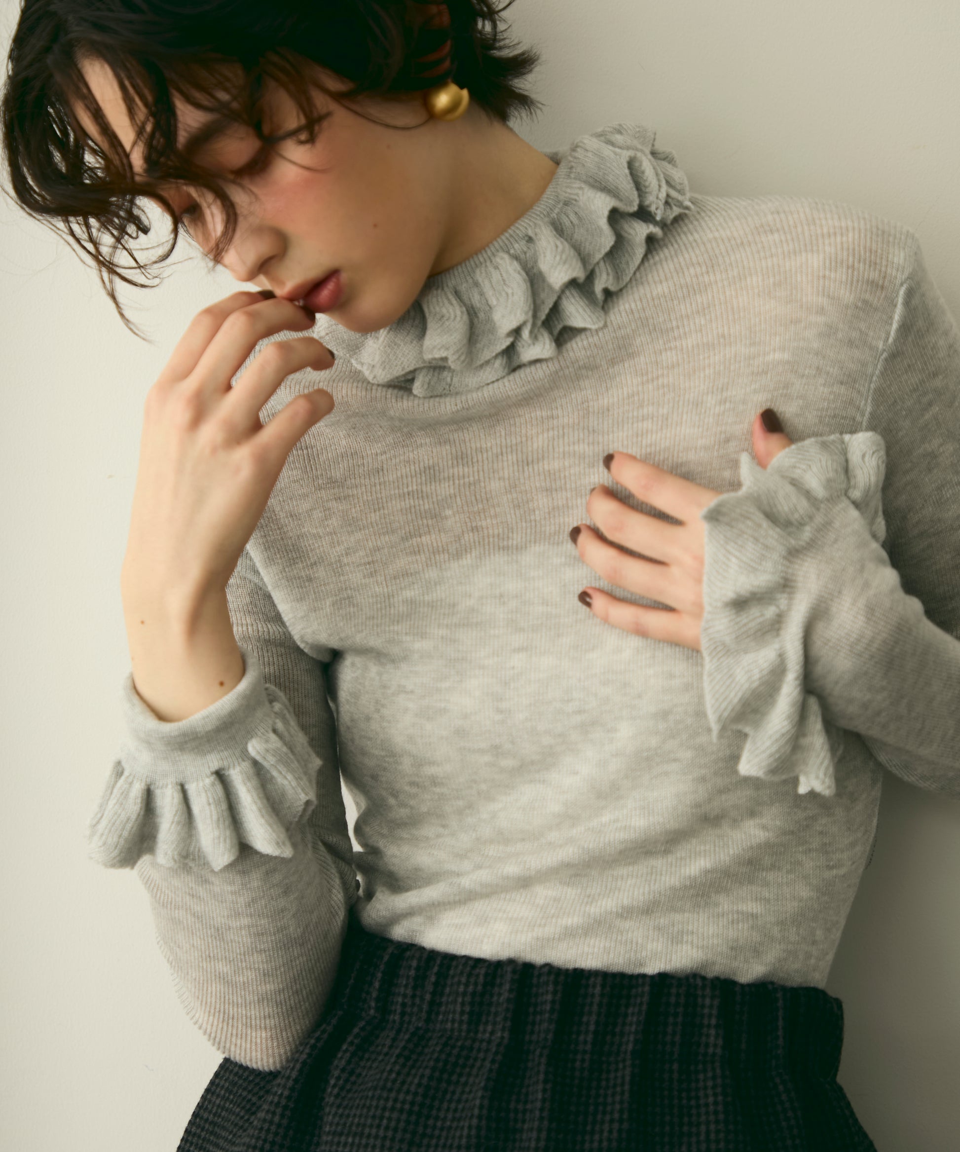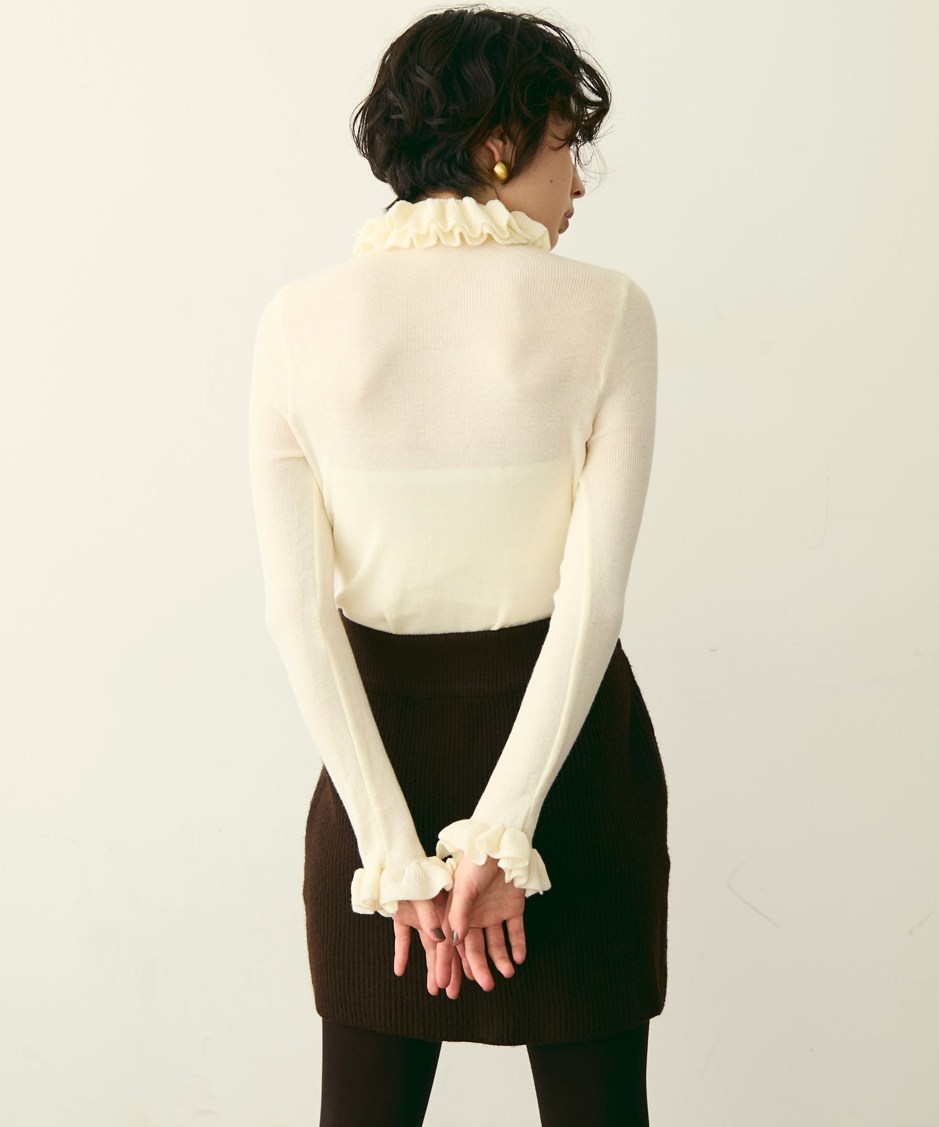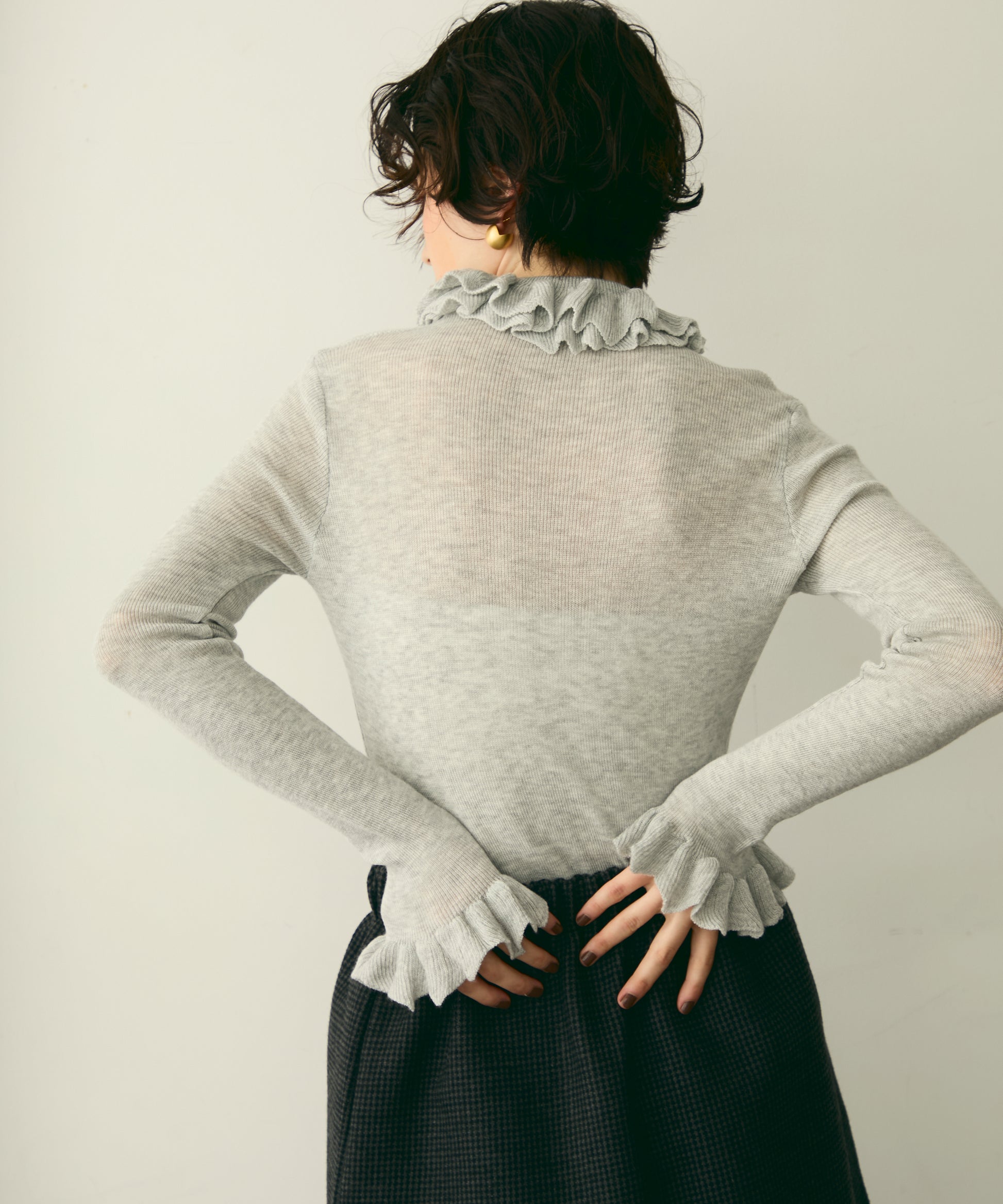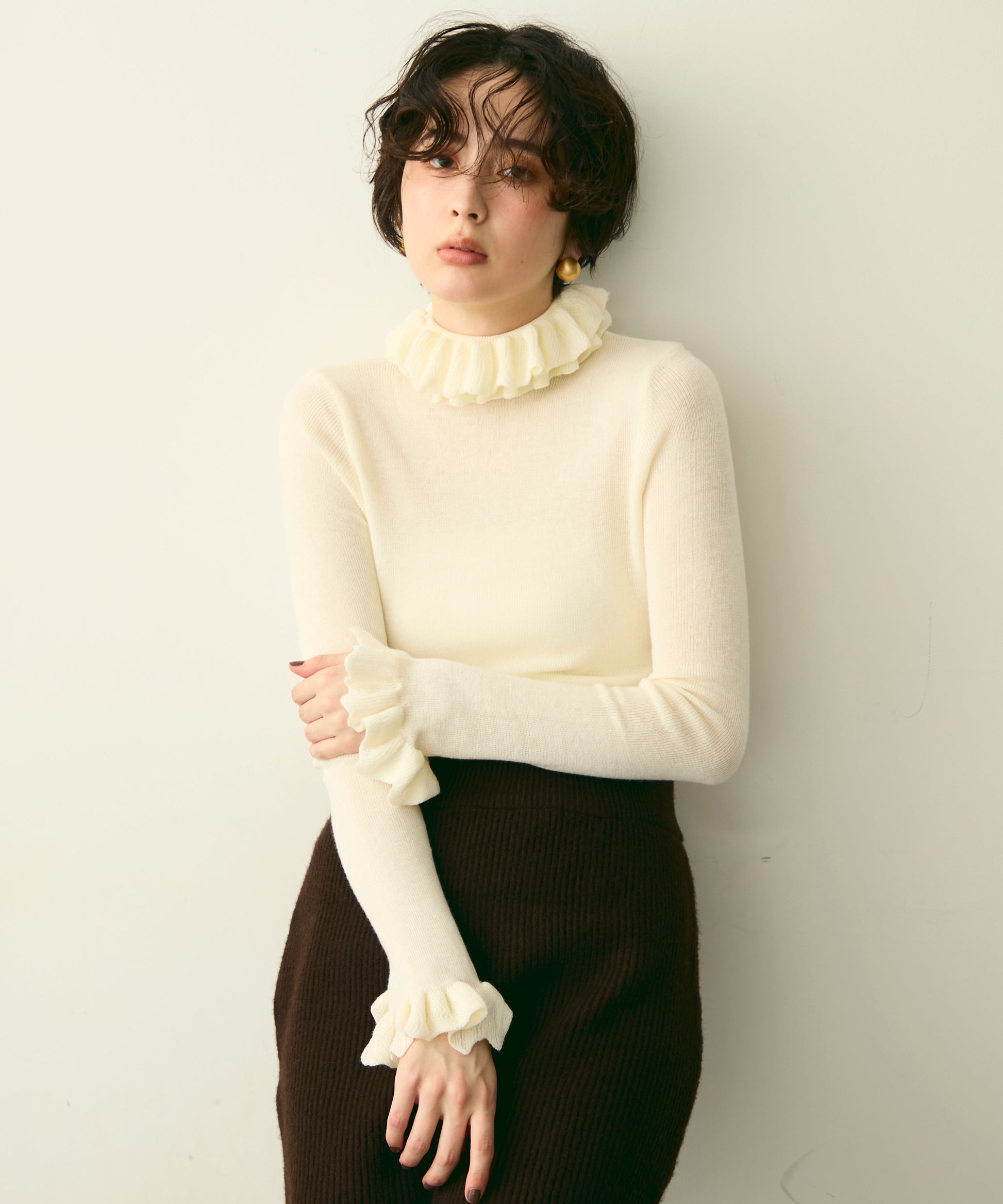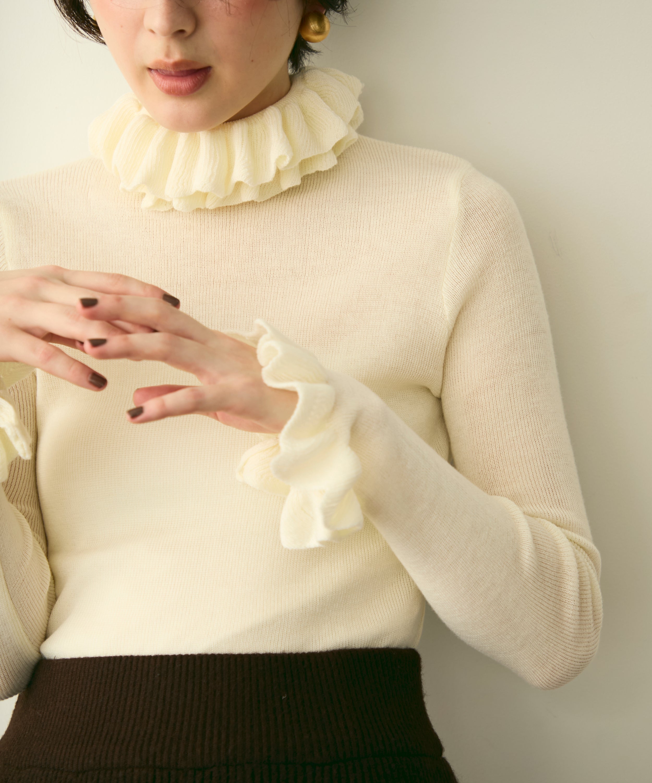 首元のフリルが女性らしさを引き立てる上品なデザインです。