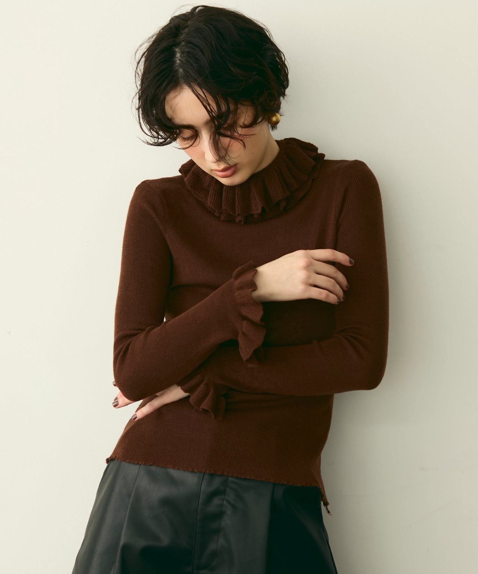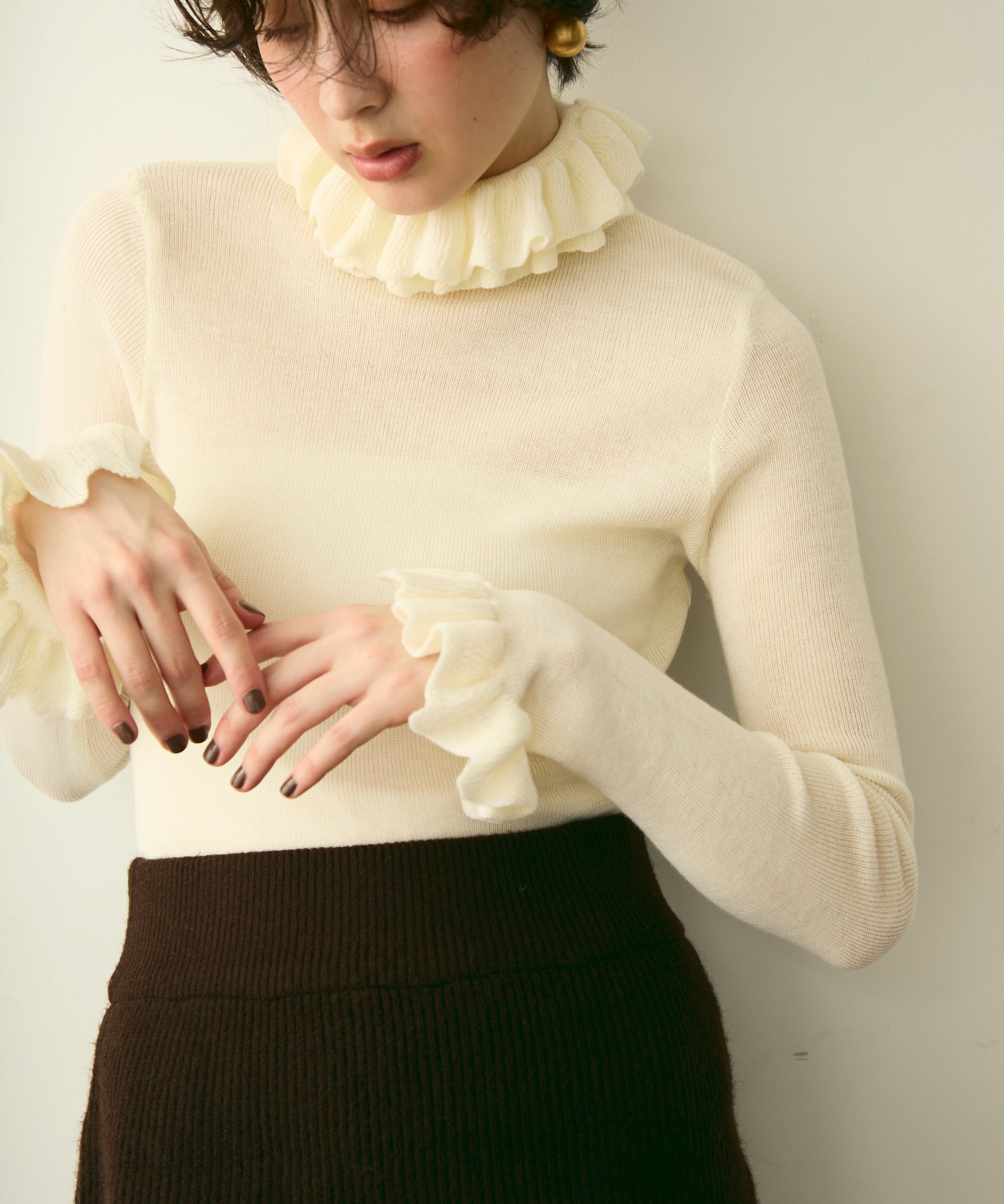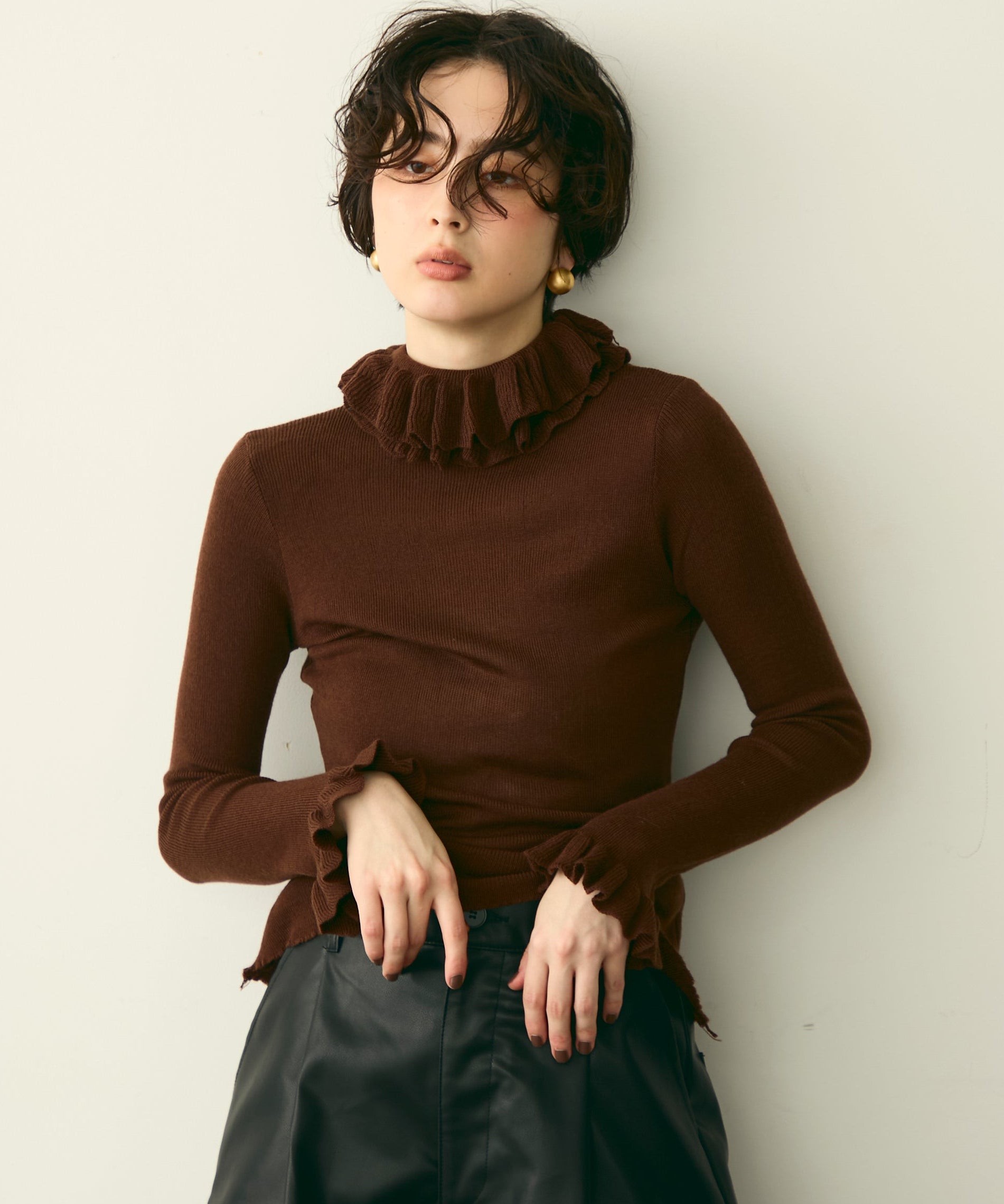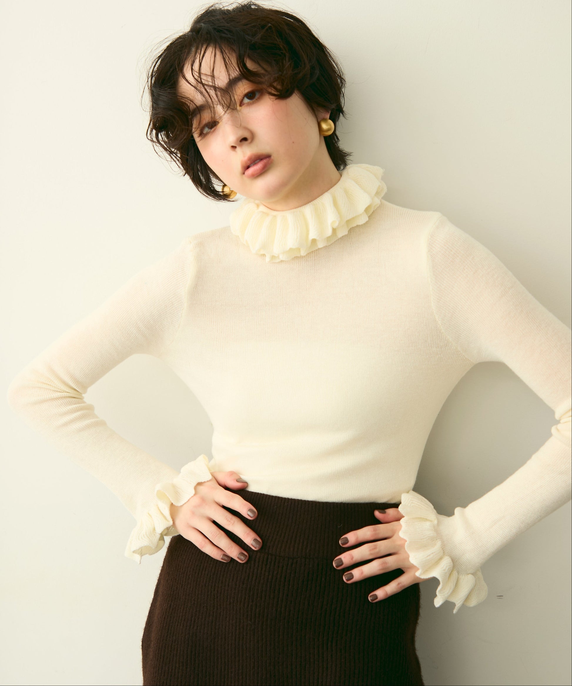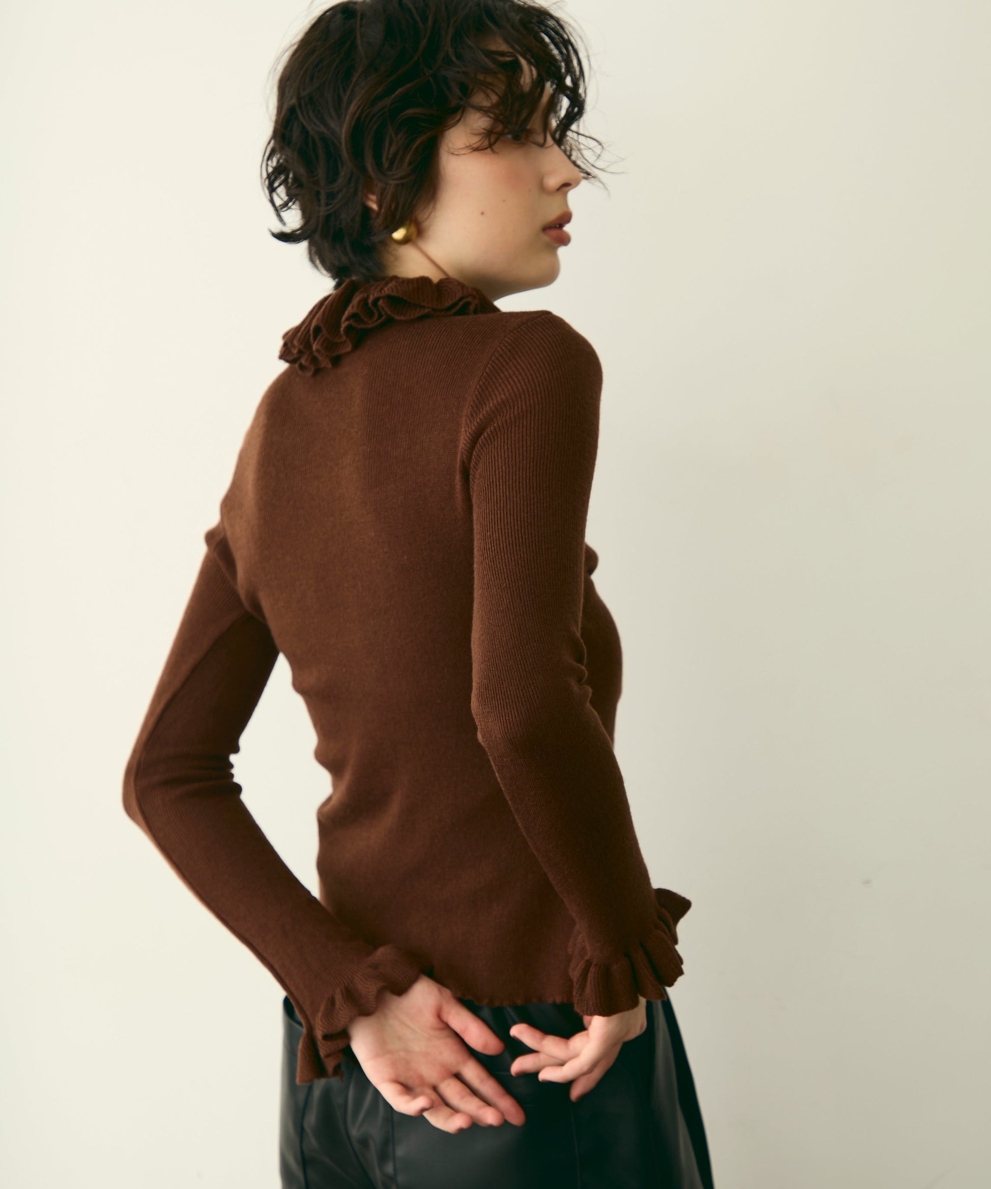 首元のフリルが女性らしさを引き立てる上品なデザインです。