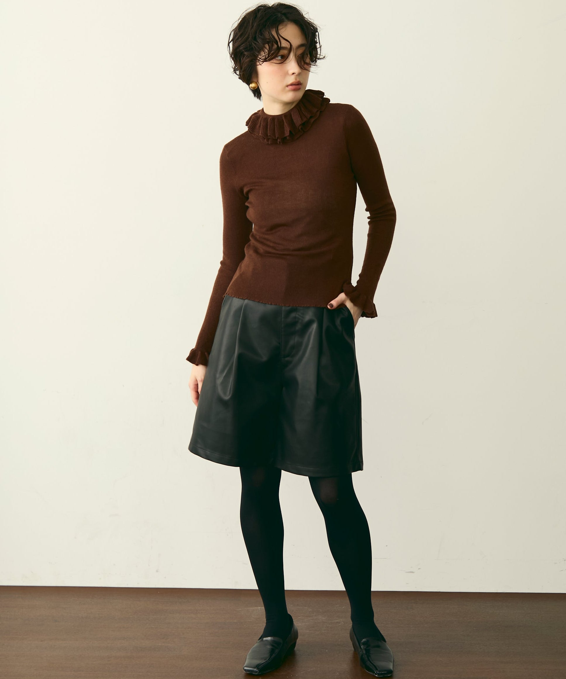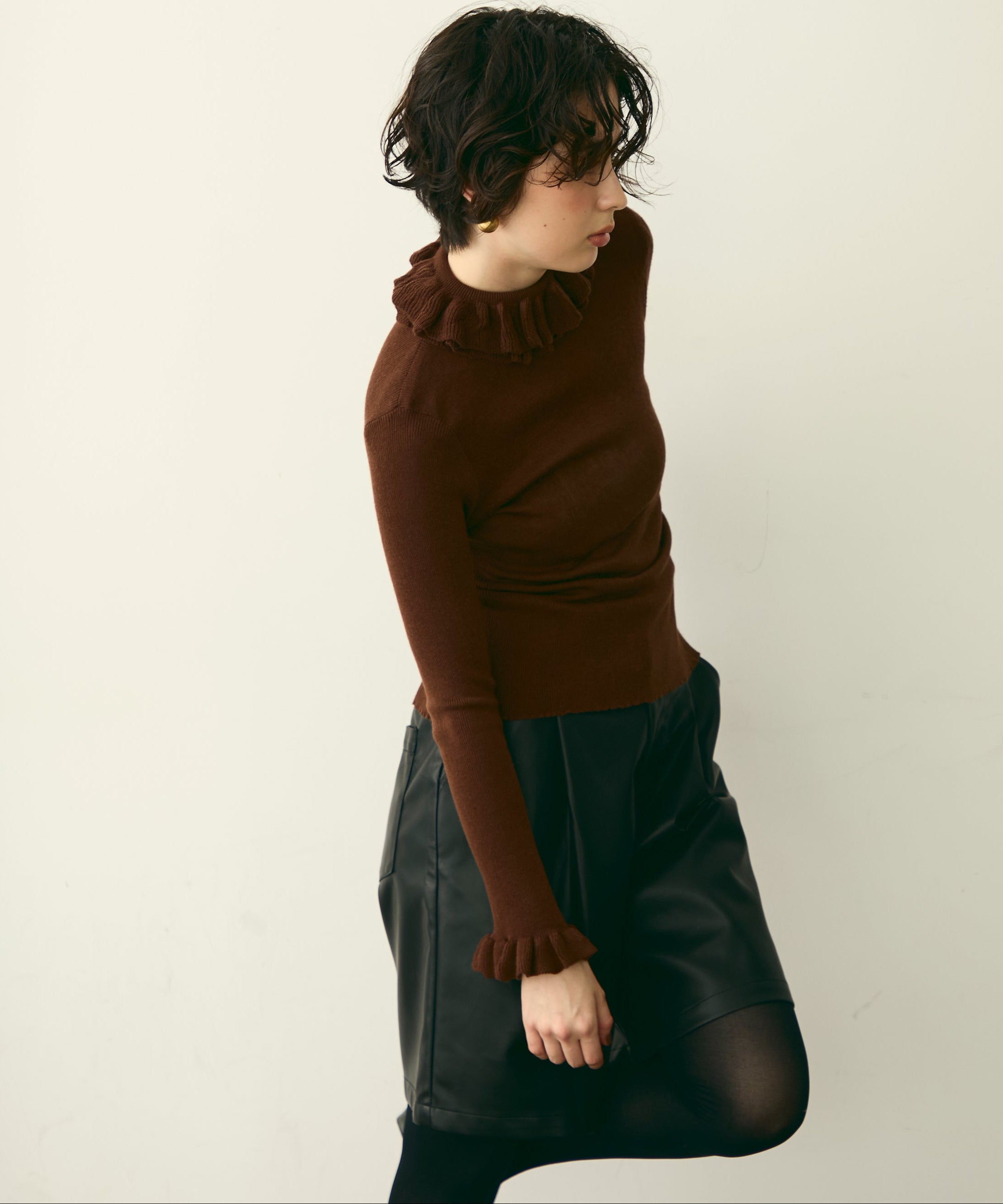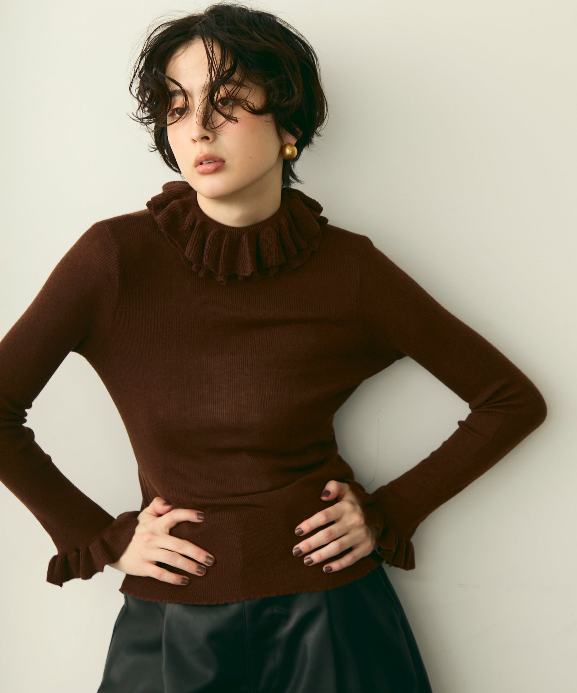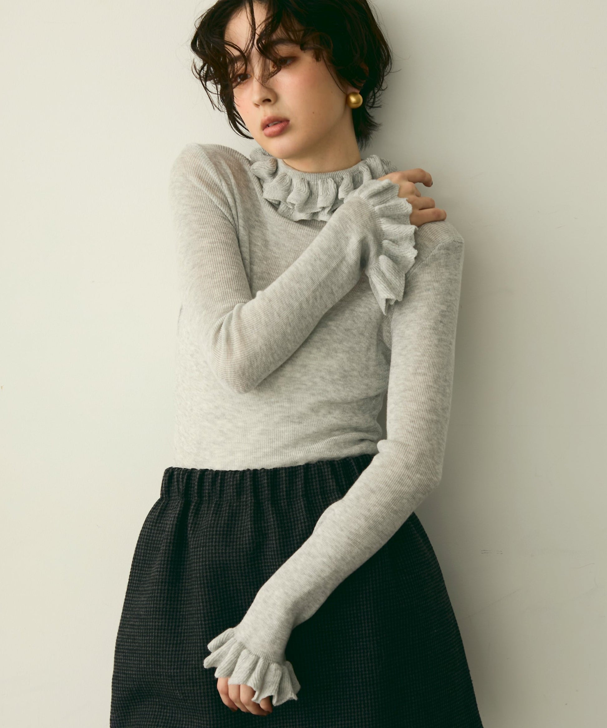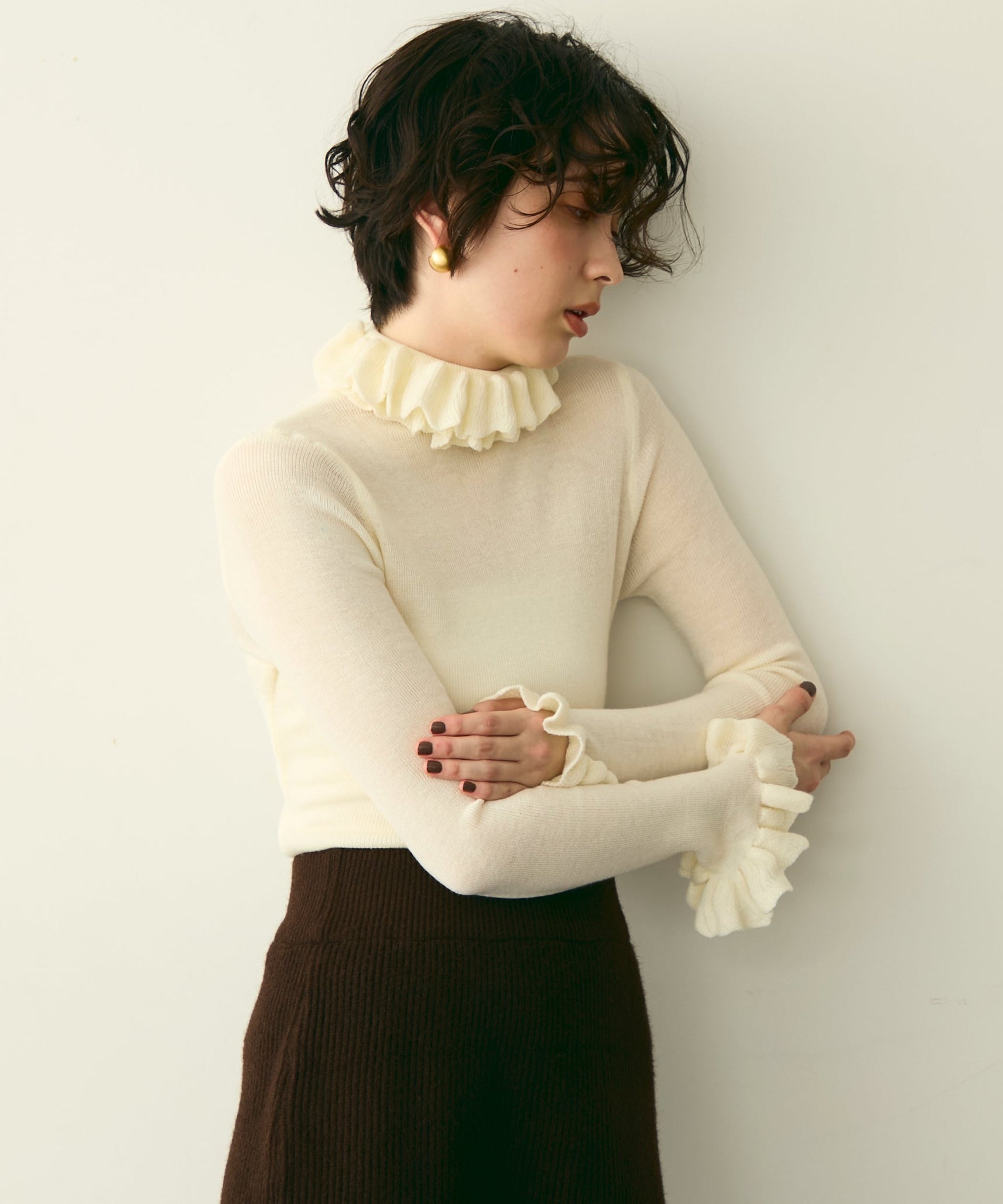 首元のフリルが女性らしさを引き立てる上品なデザインです。