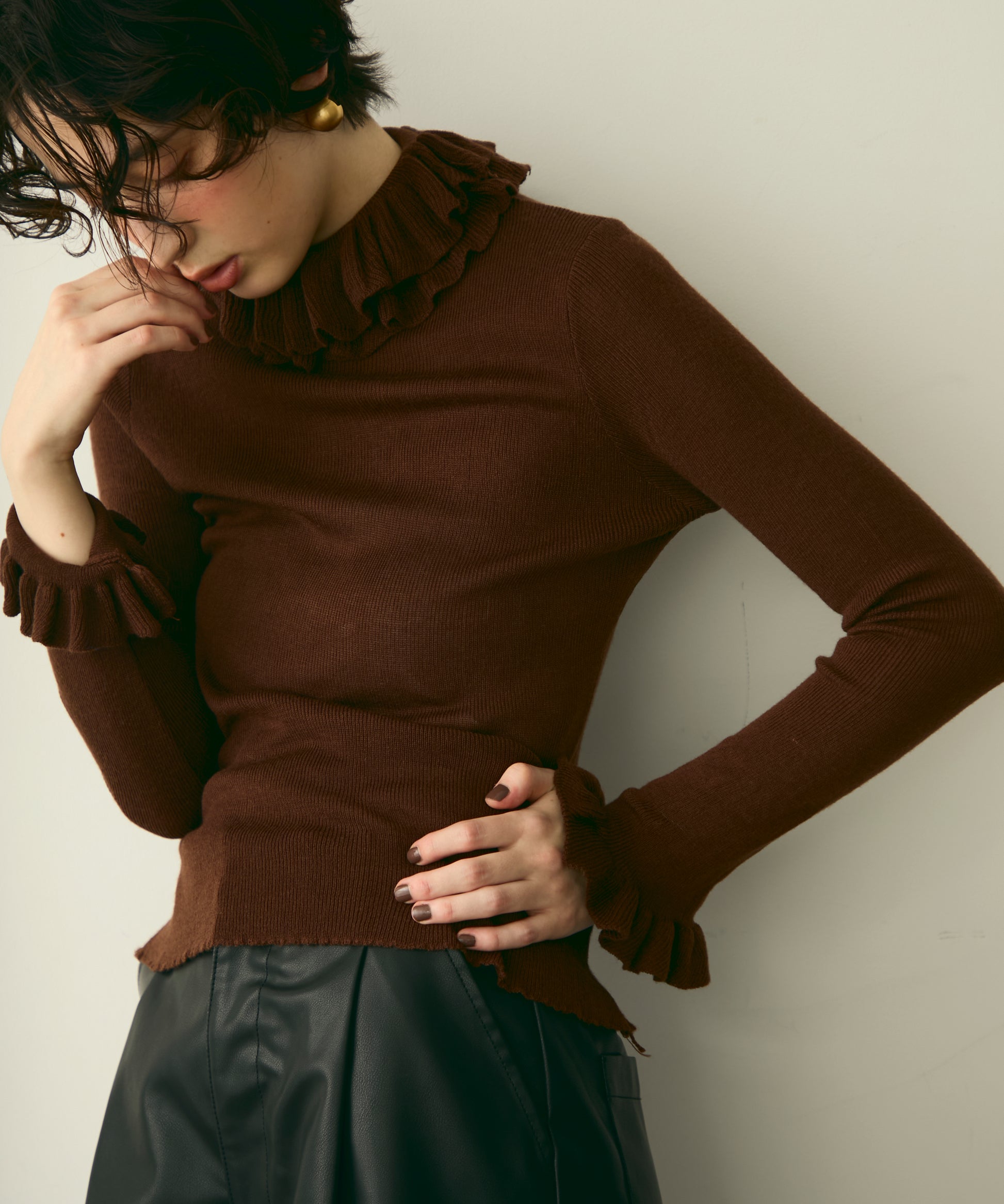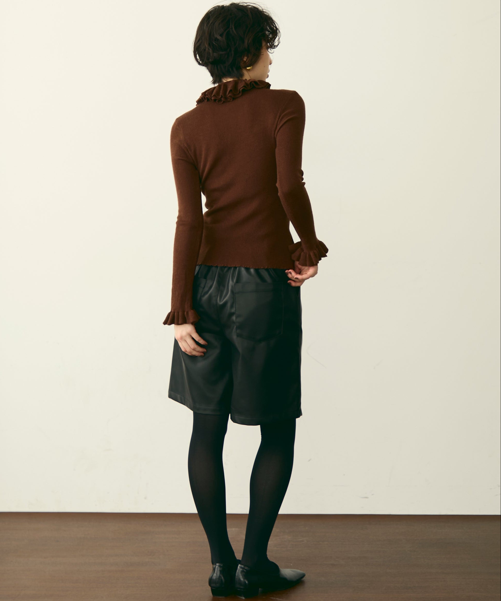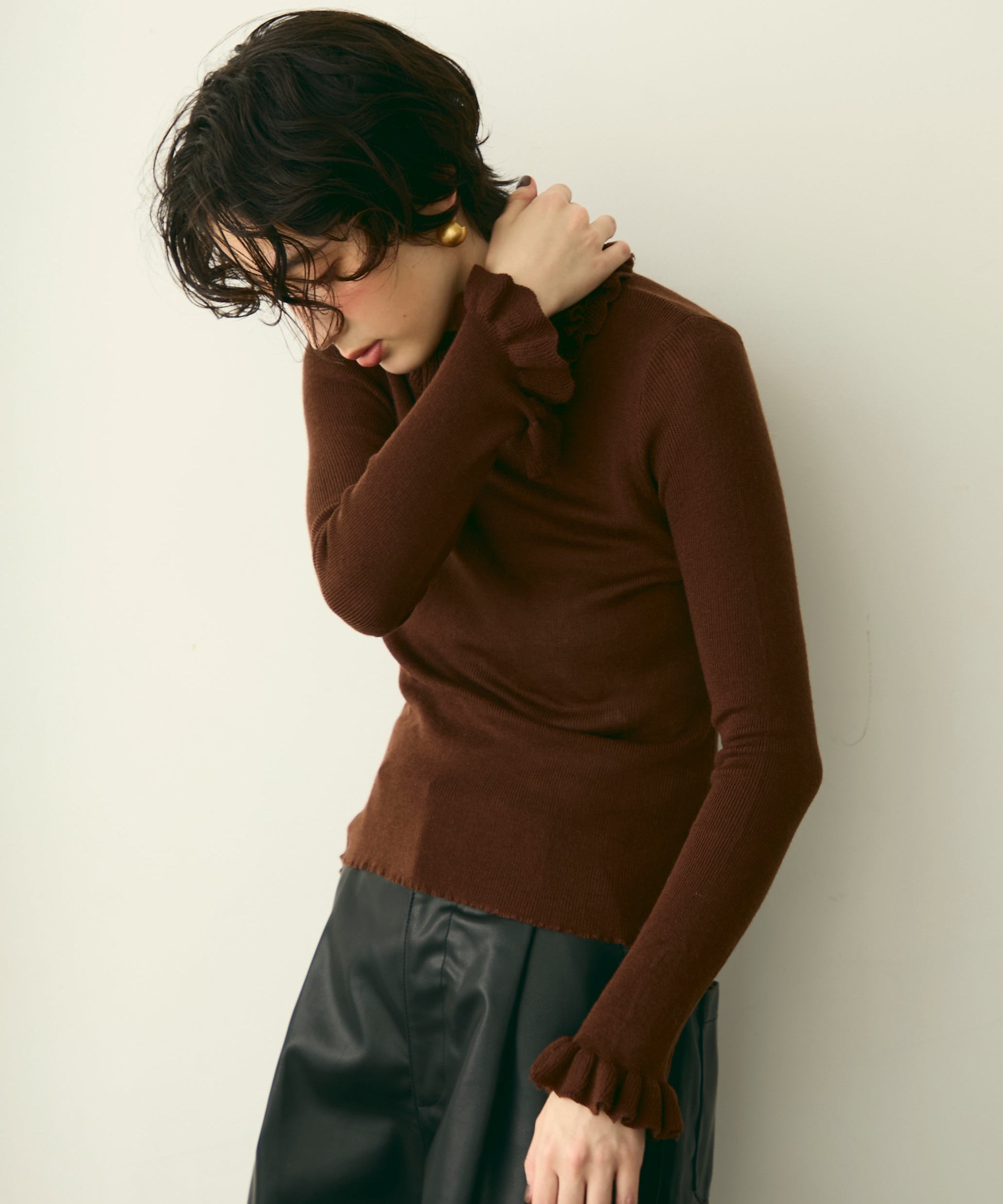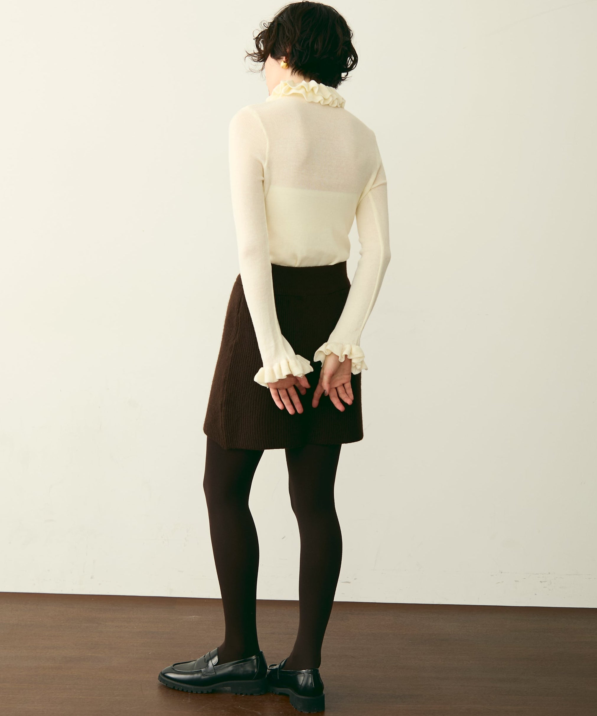 首元のフリルが女性らしさを引き立てる上品なデザインです。