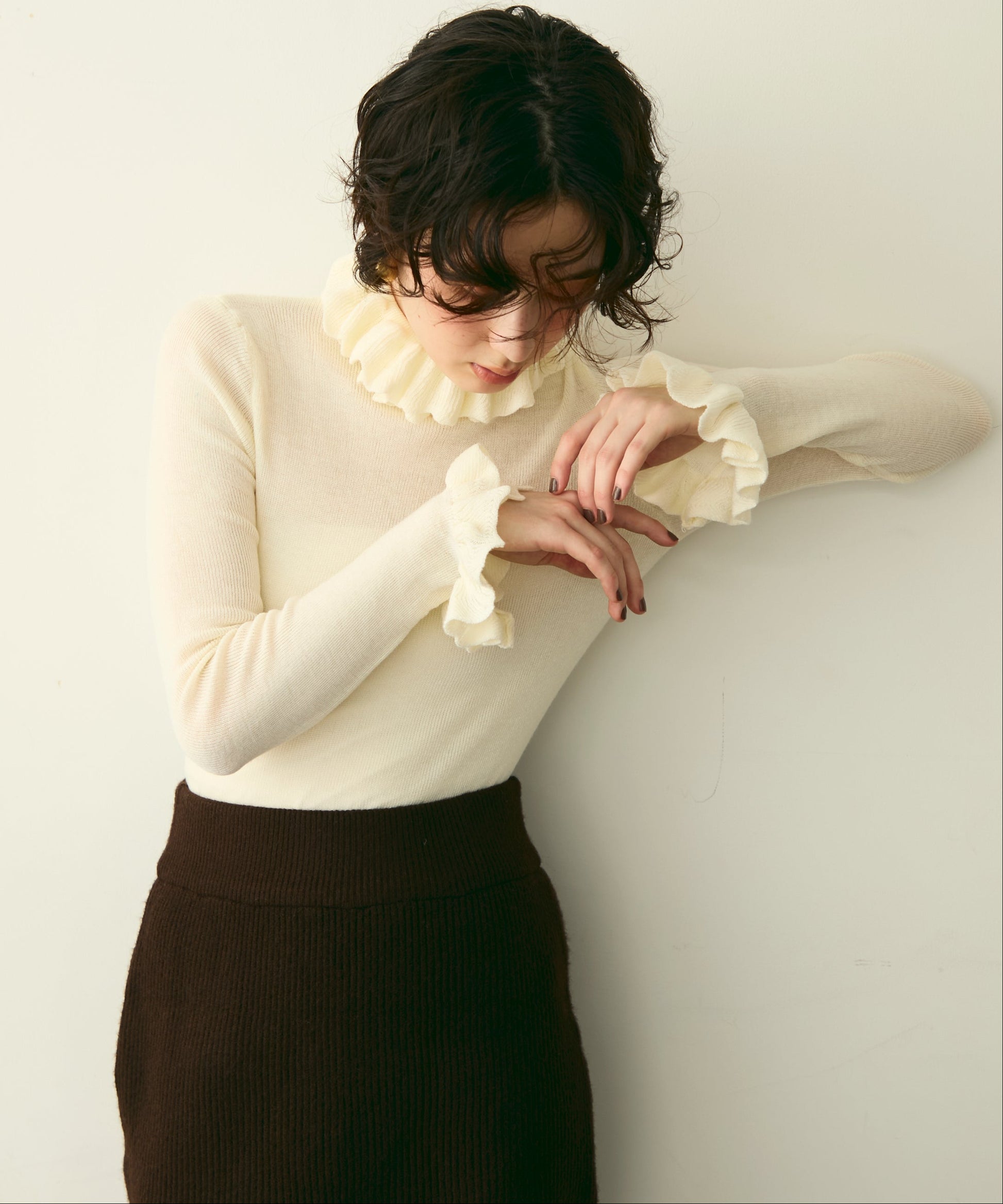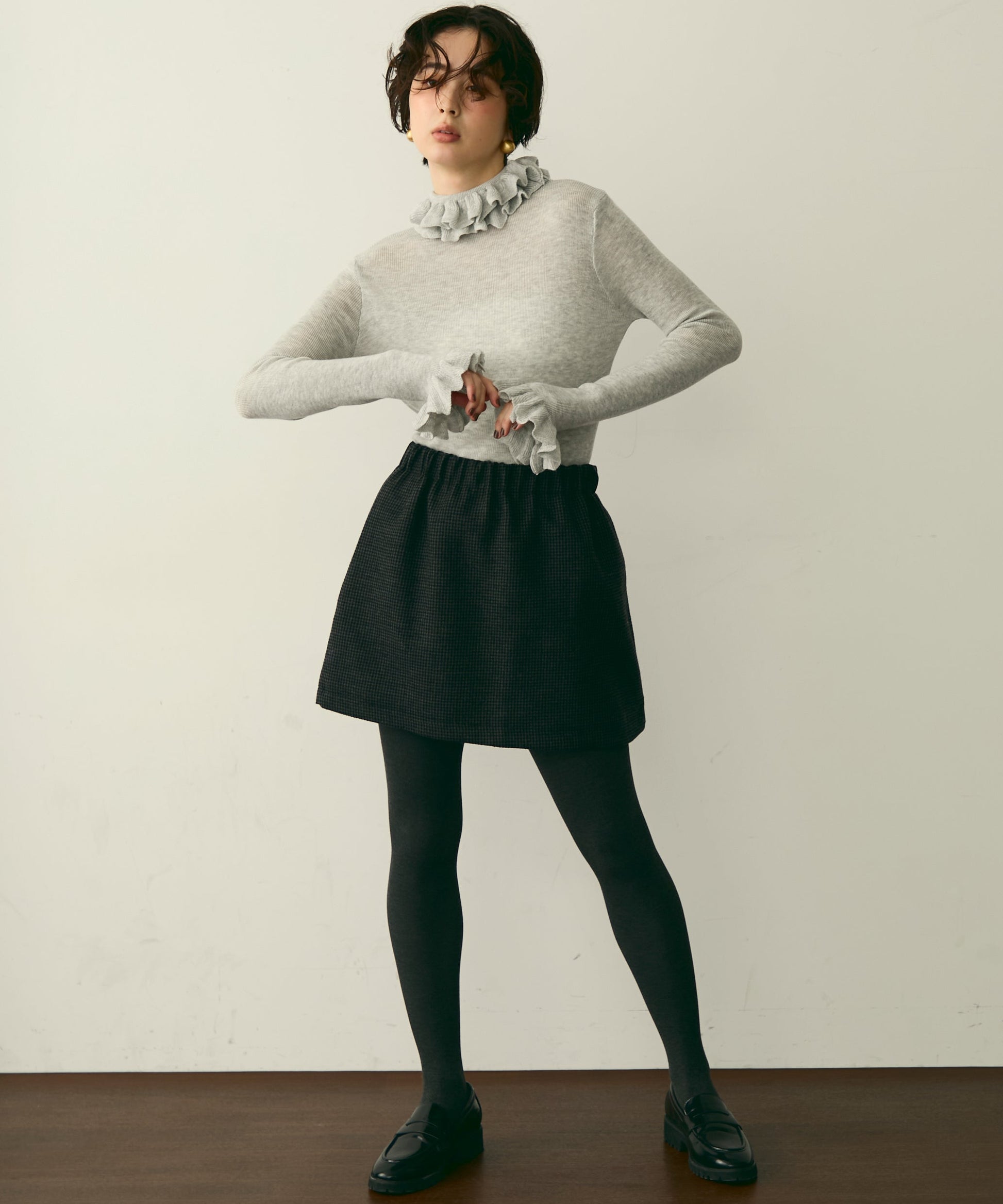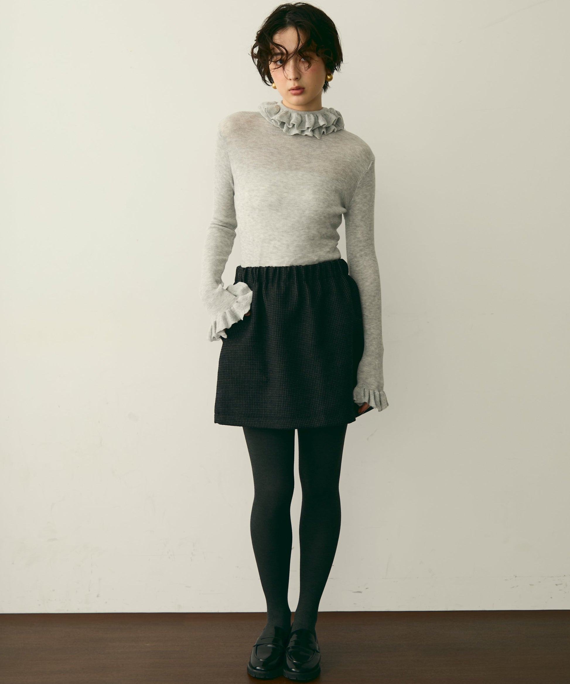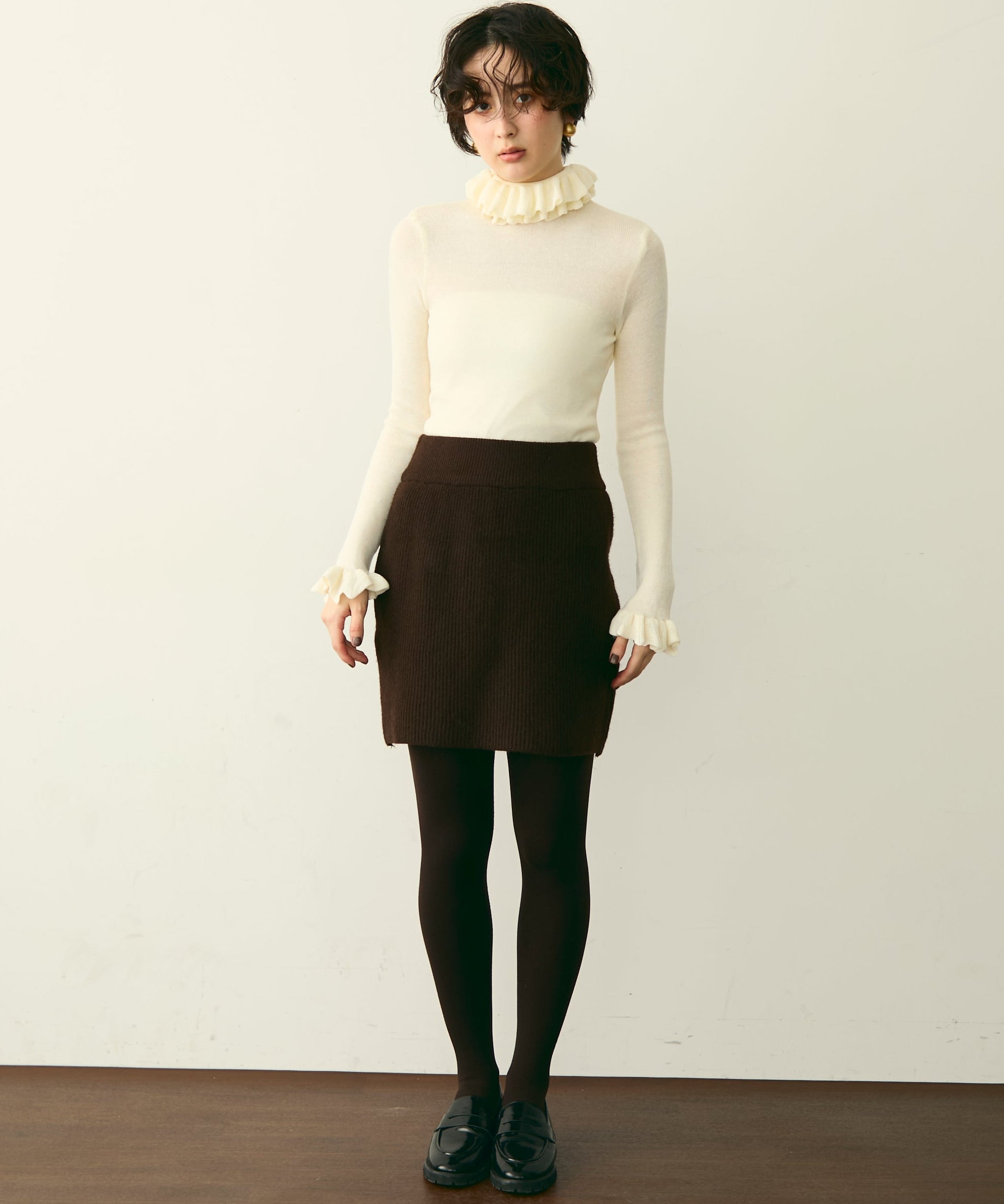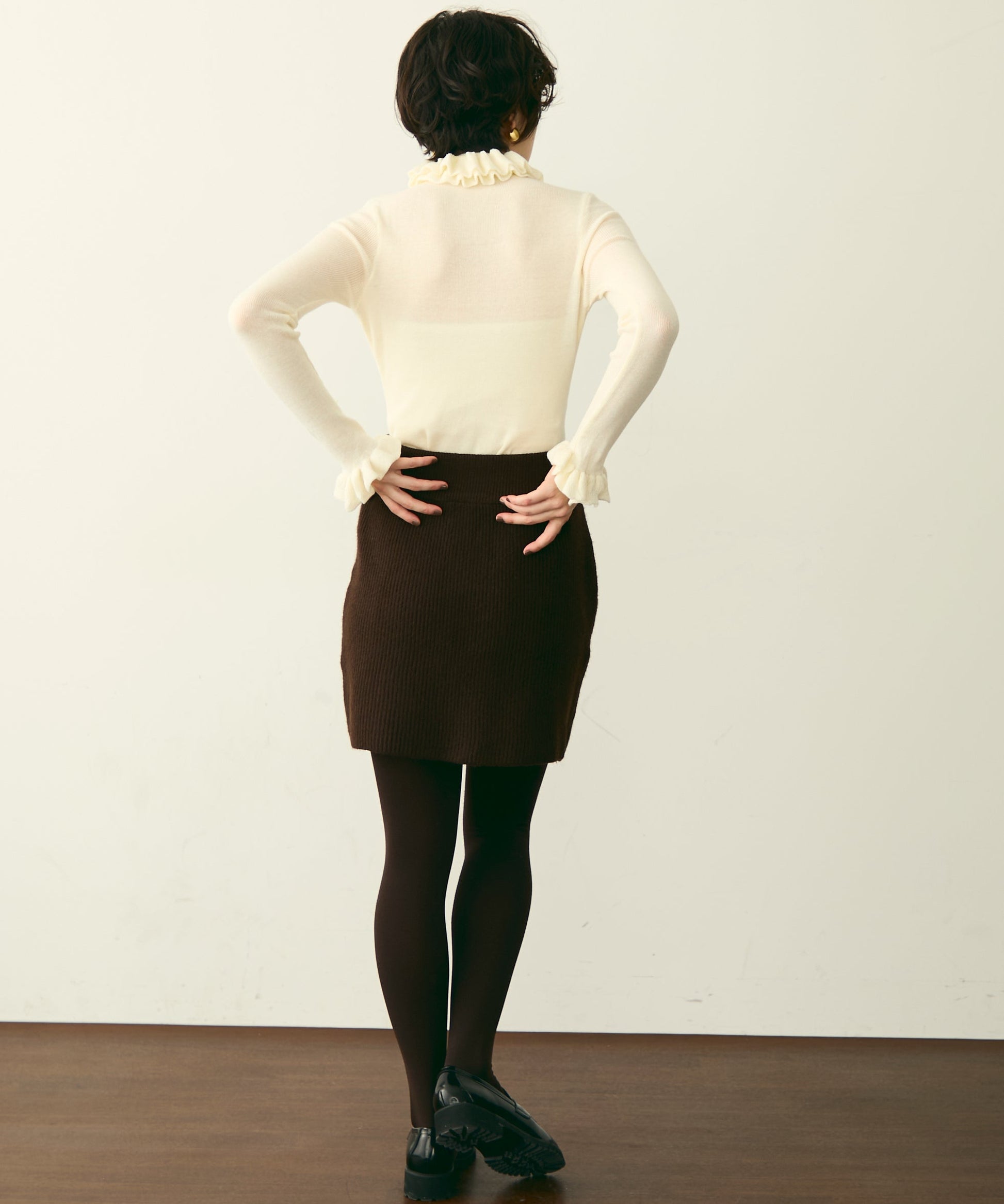 首元のフリルが女性らしさを引き立てる上品なデザインです。