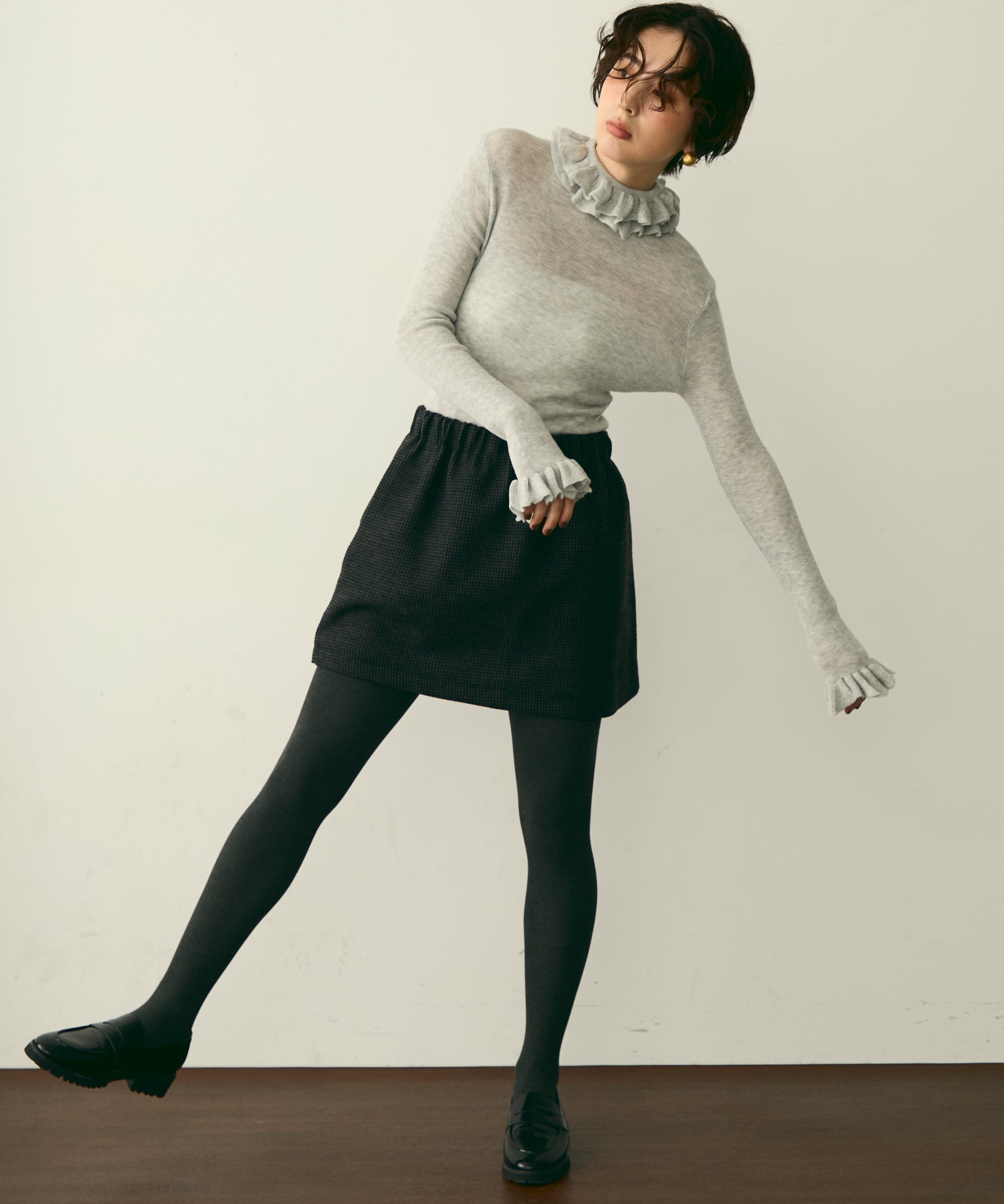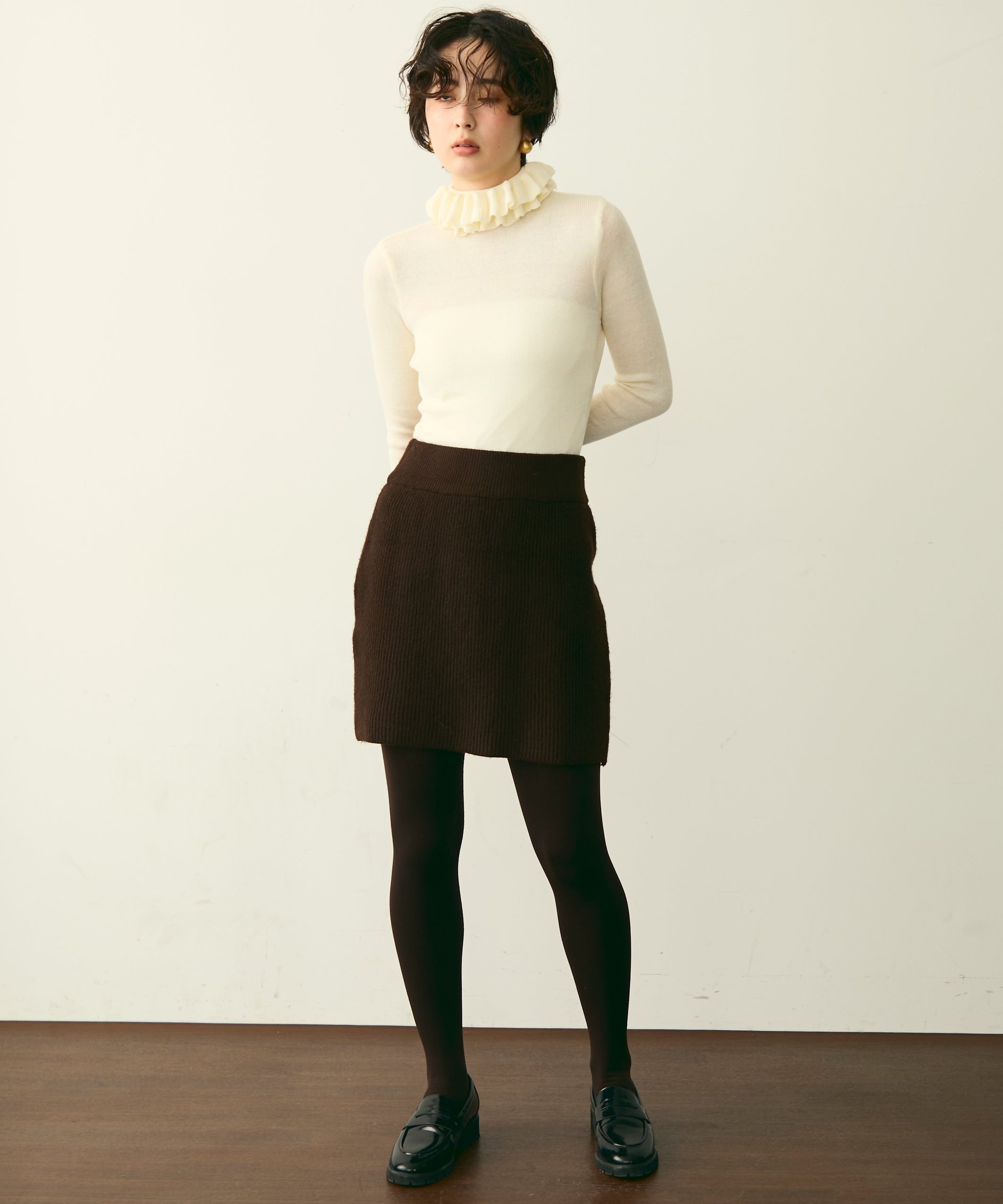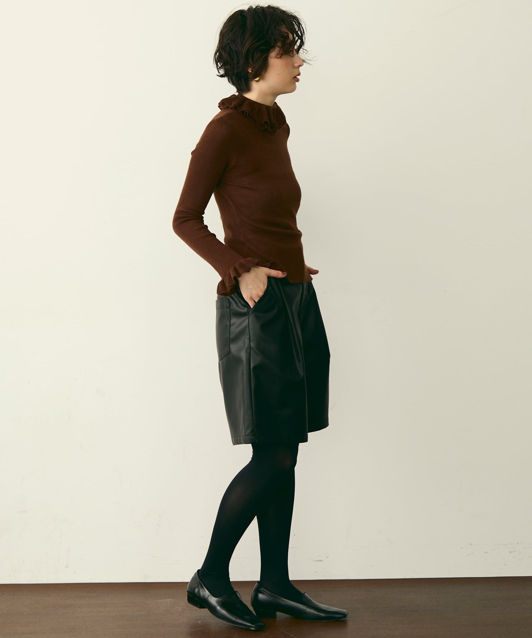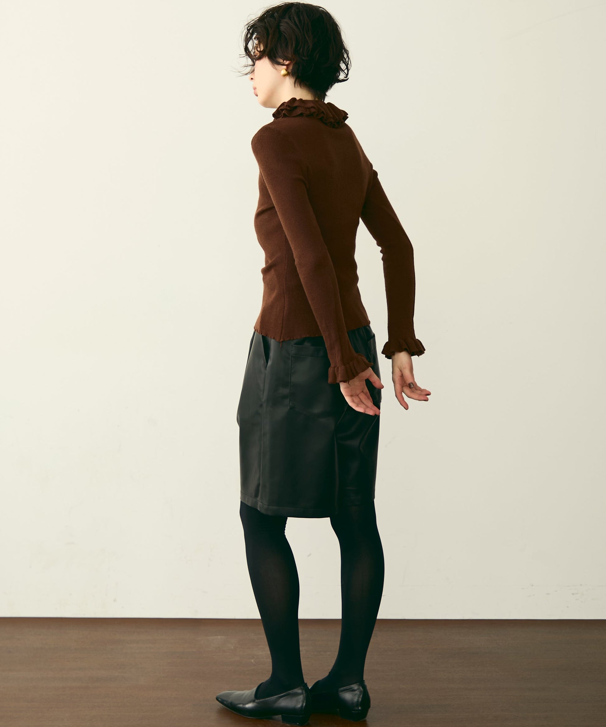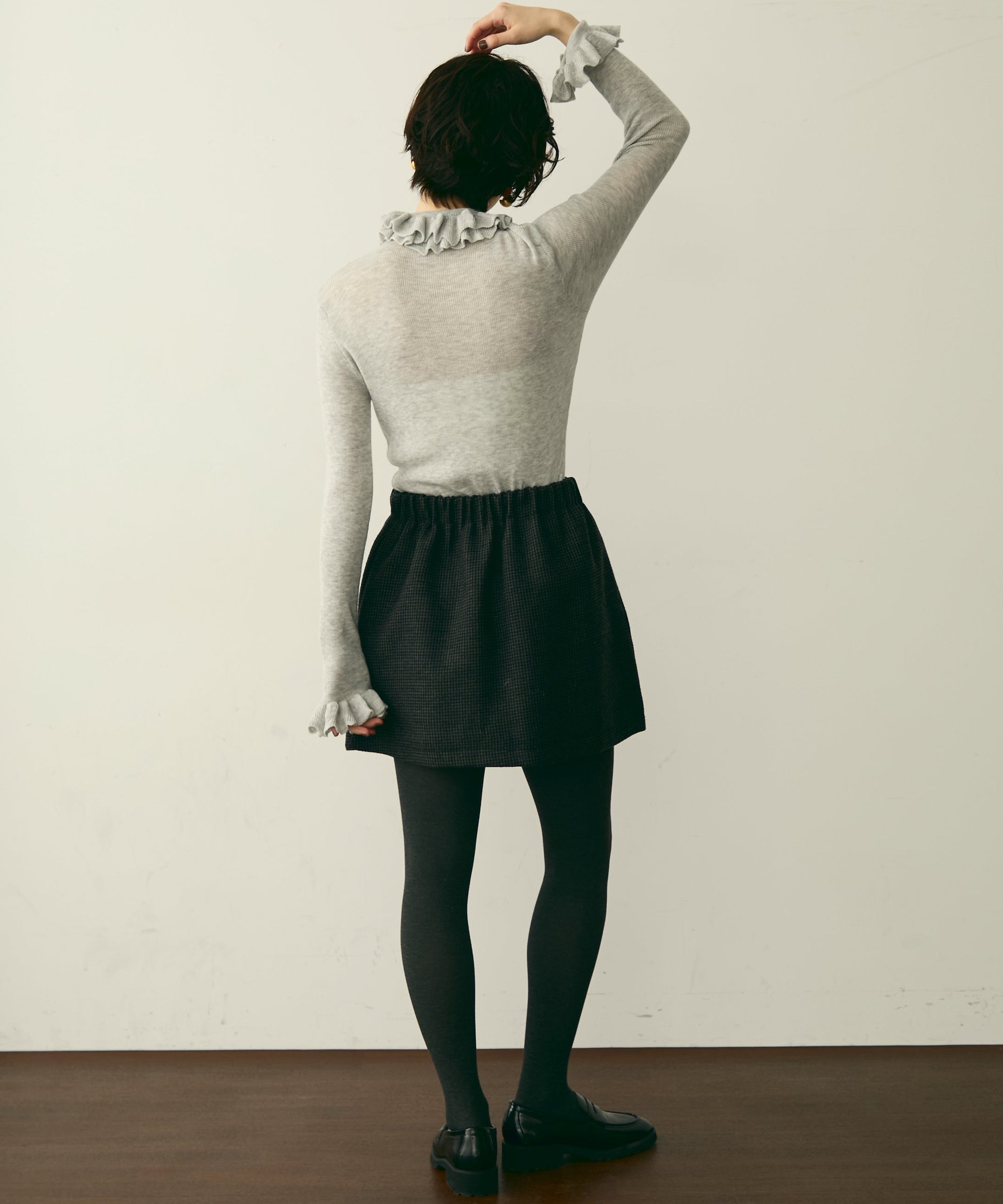 首元のフリルが女性らしさを引き立てる上品なデザインです。
