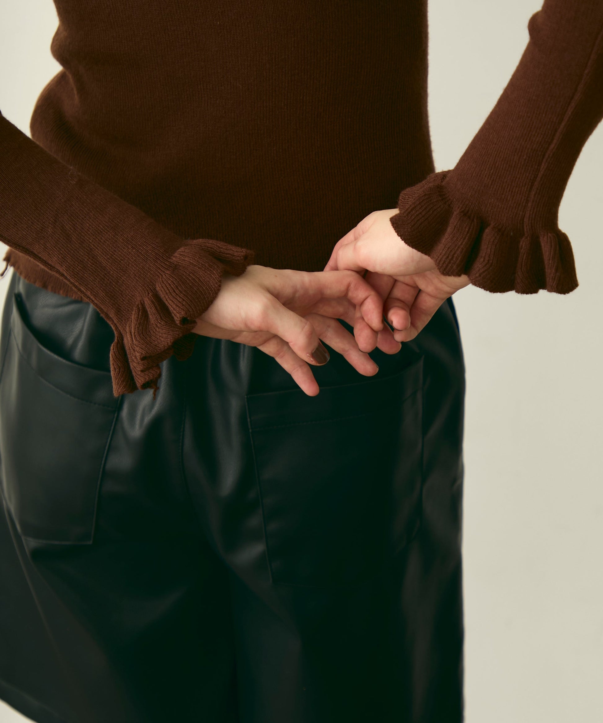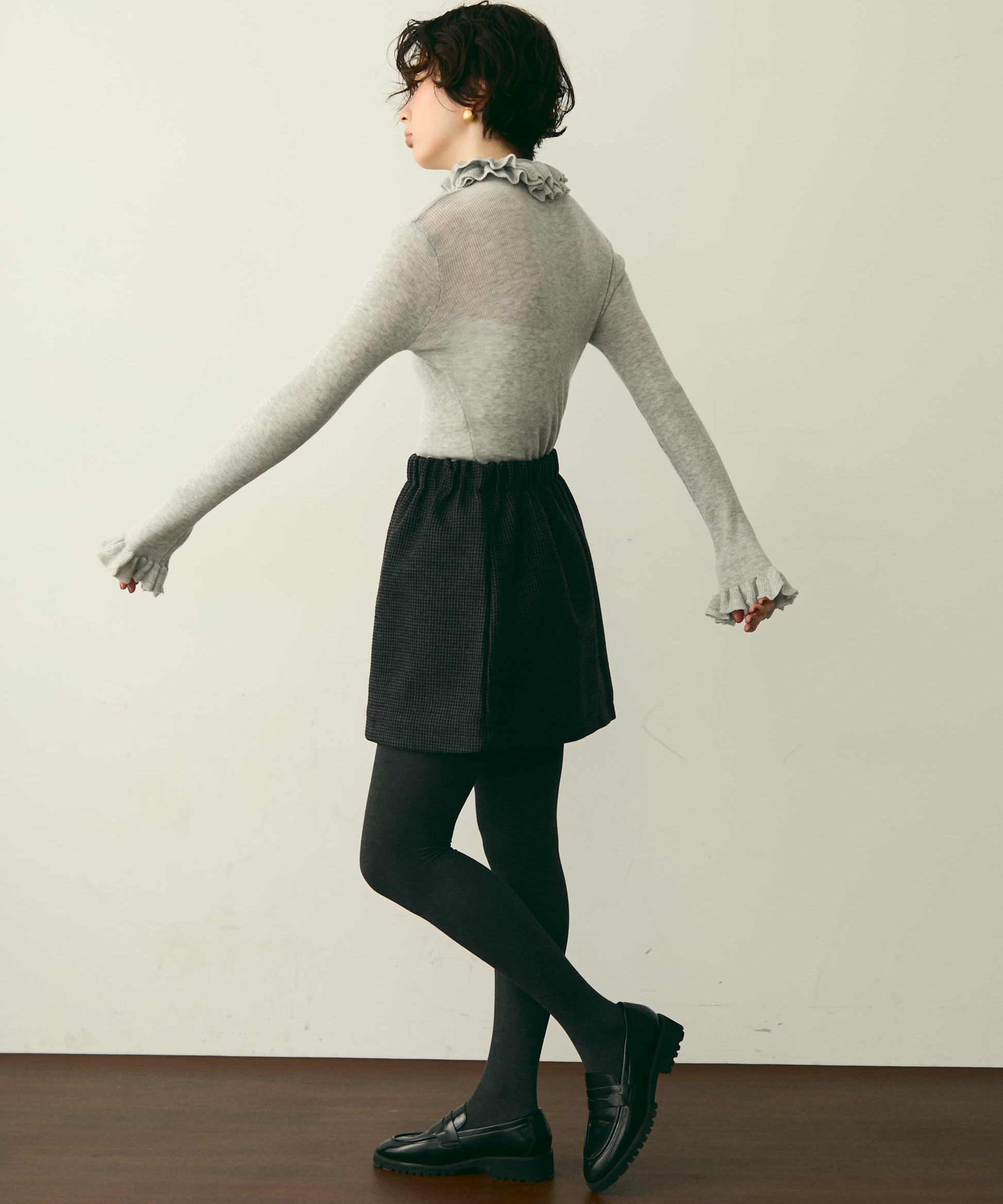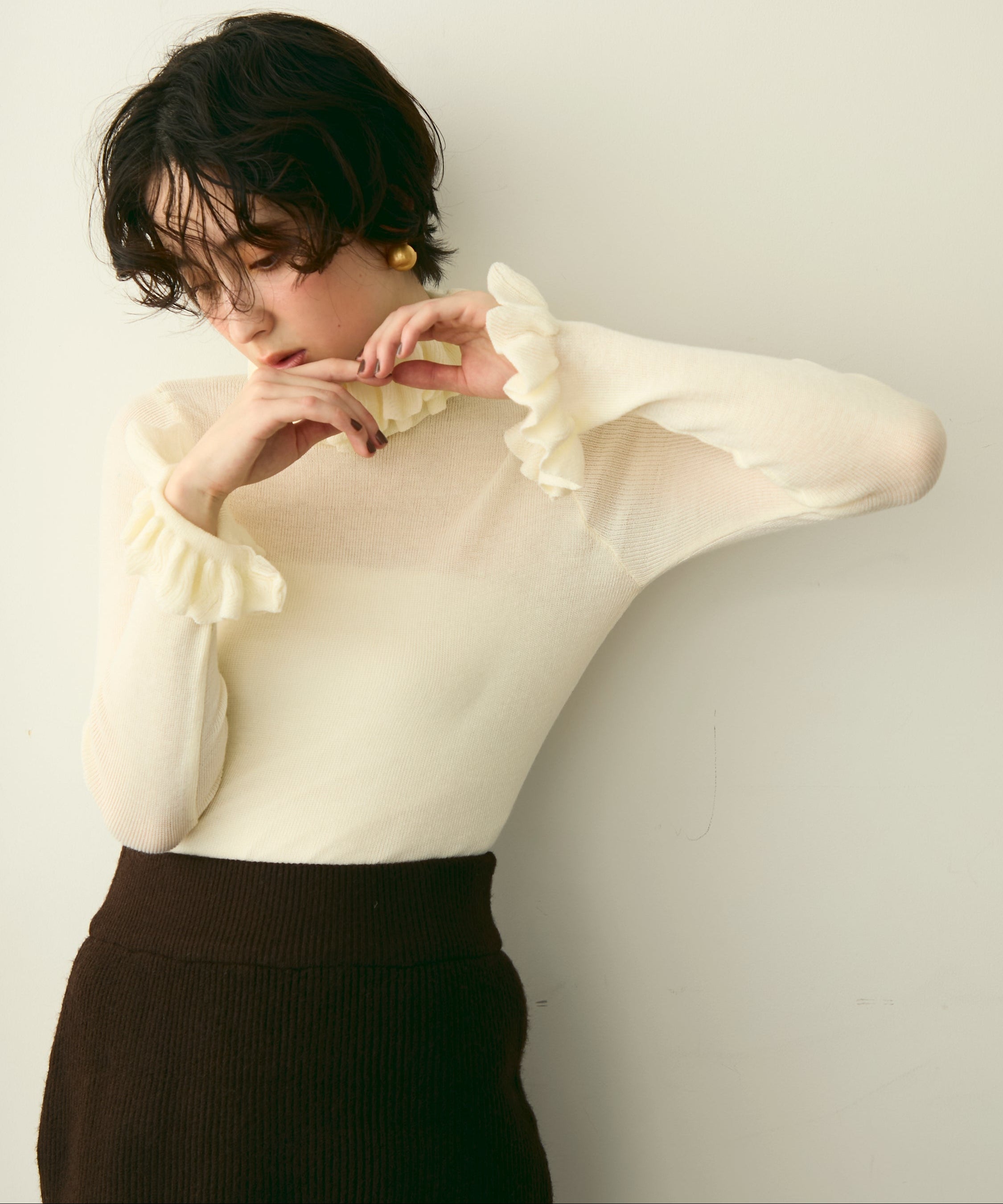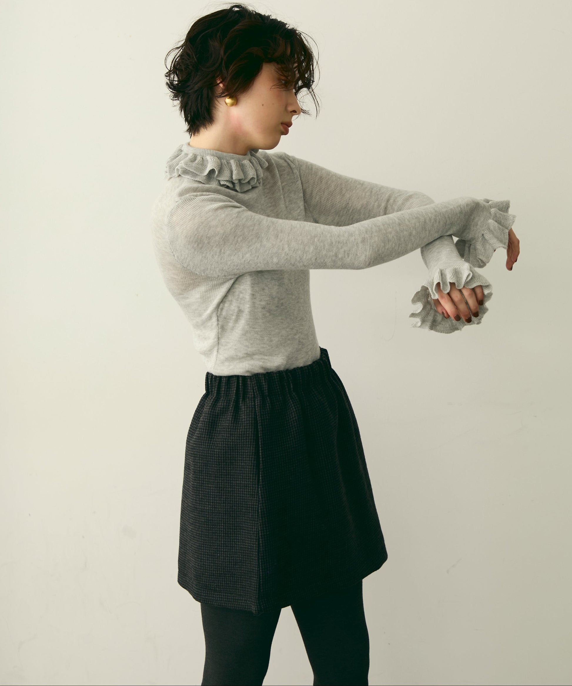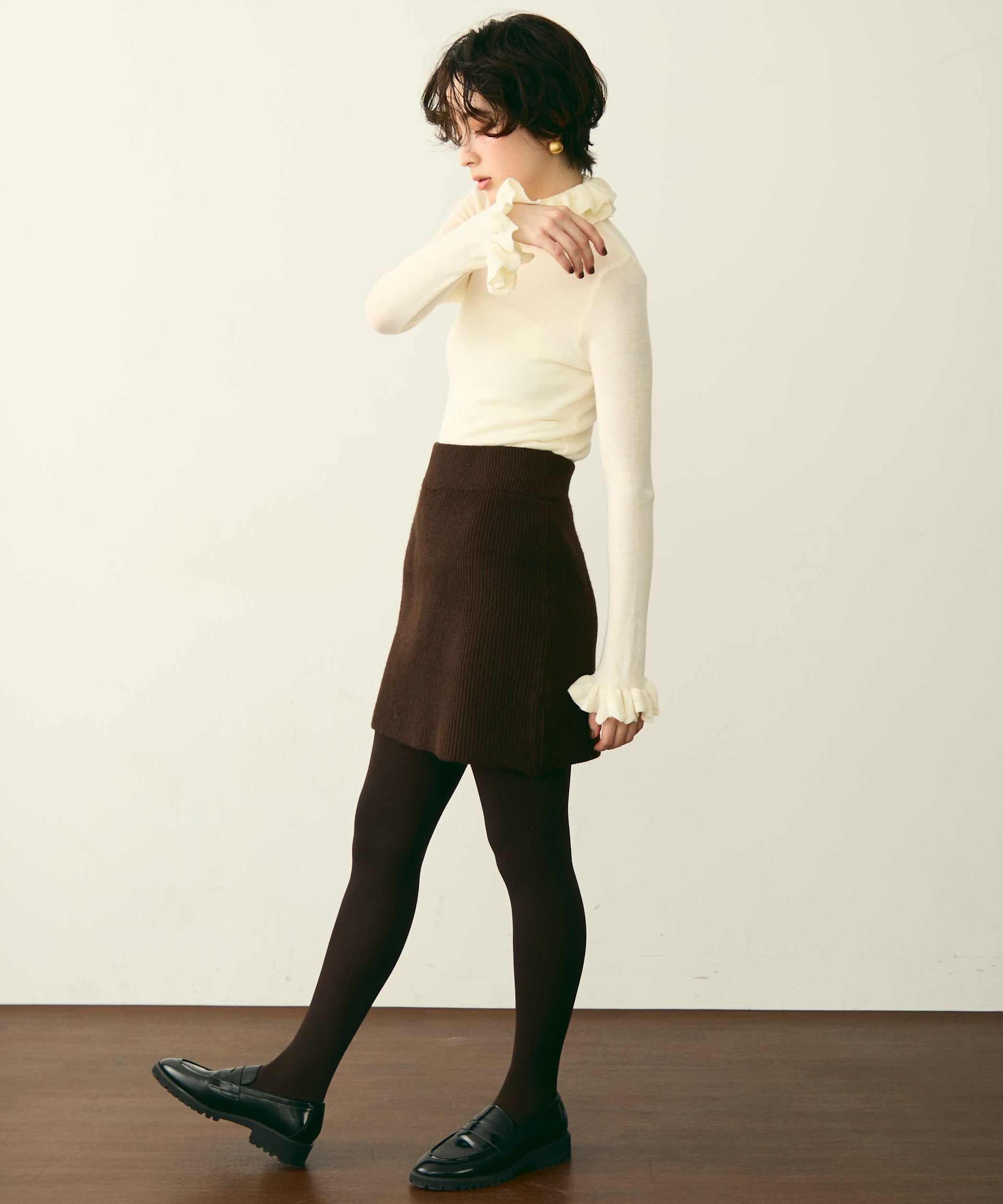 首元のフリルが女性らしさを引き立てる上品なデザインです。