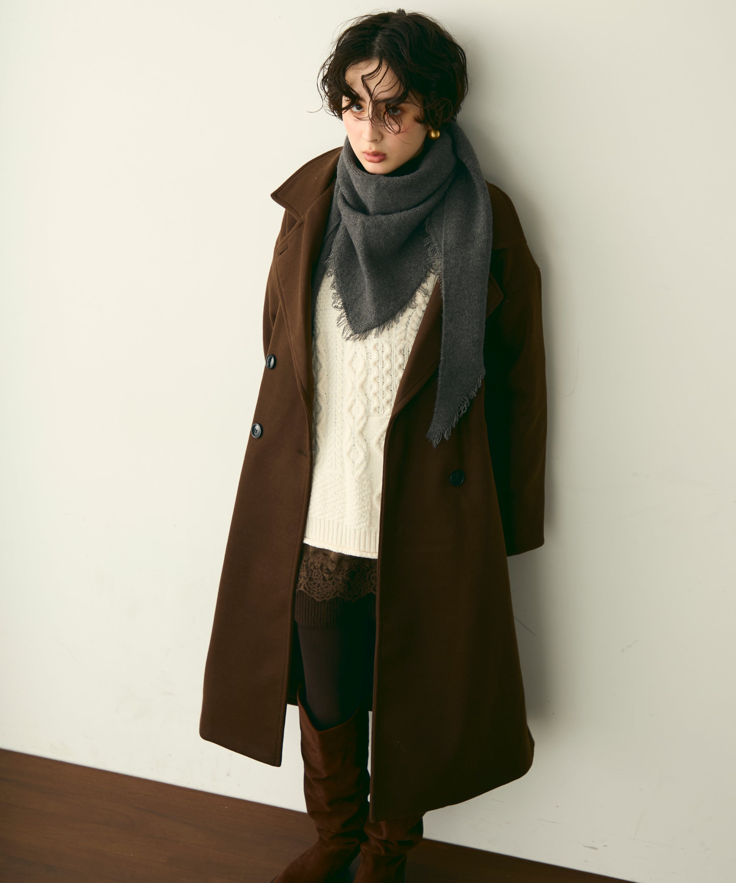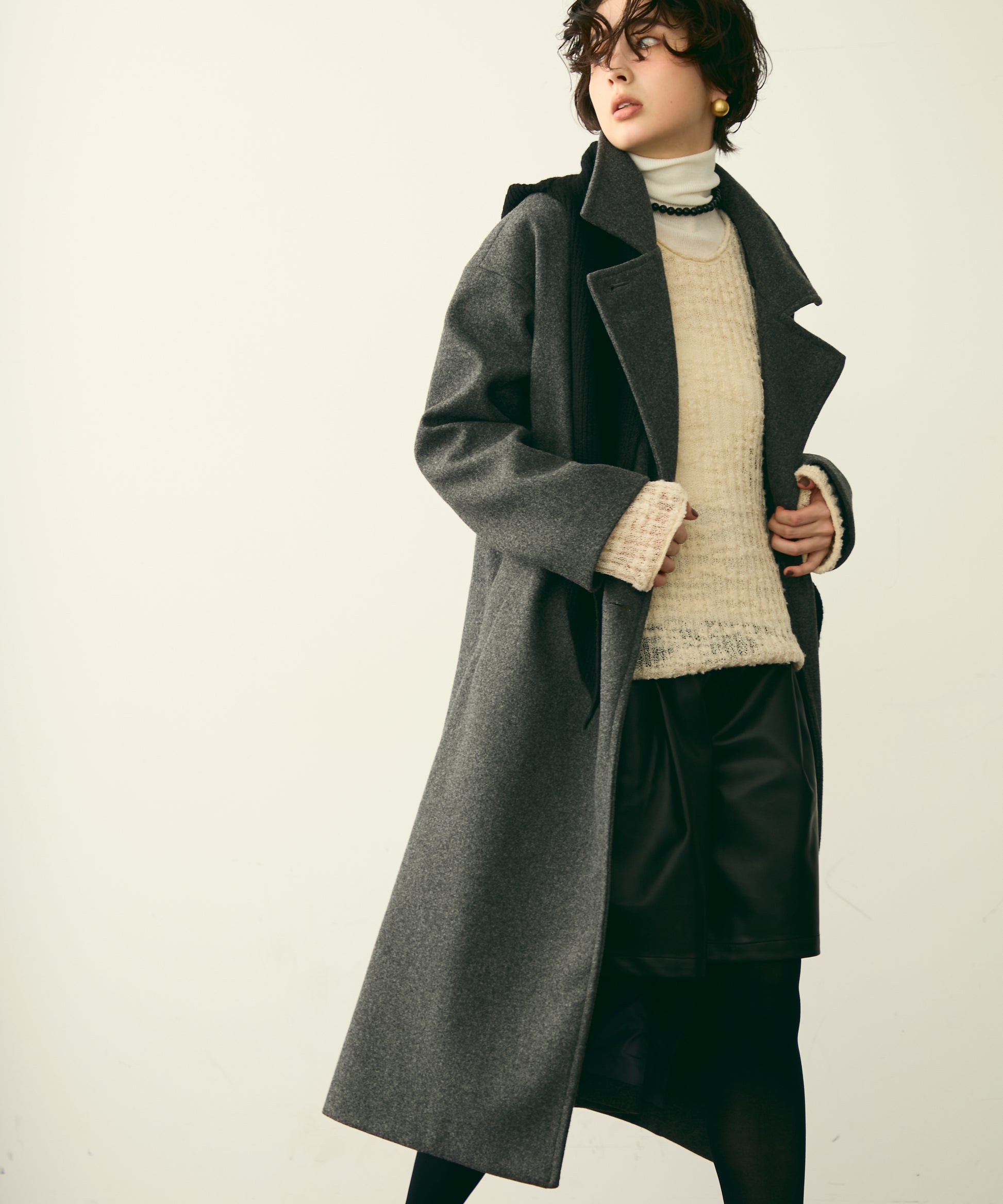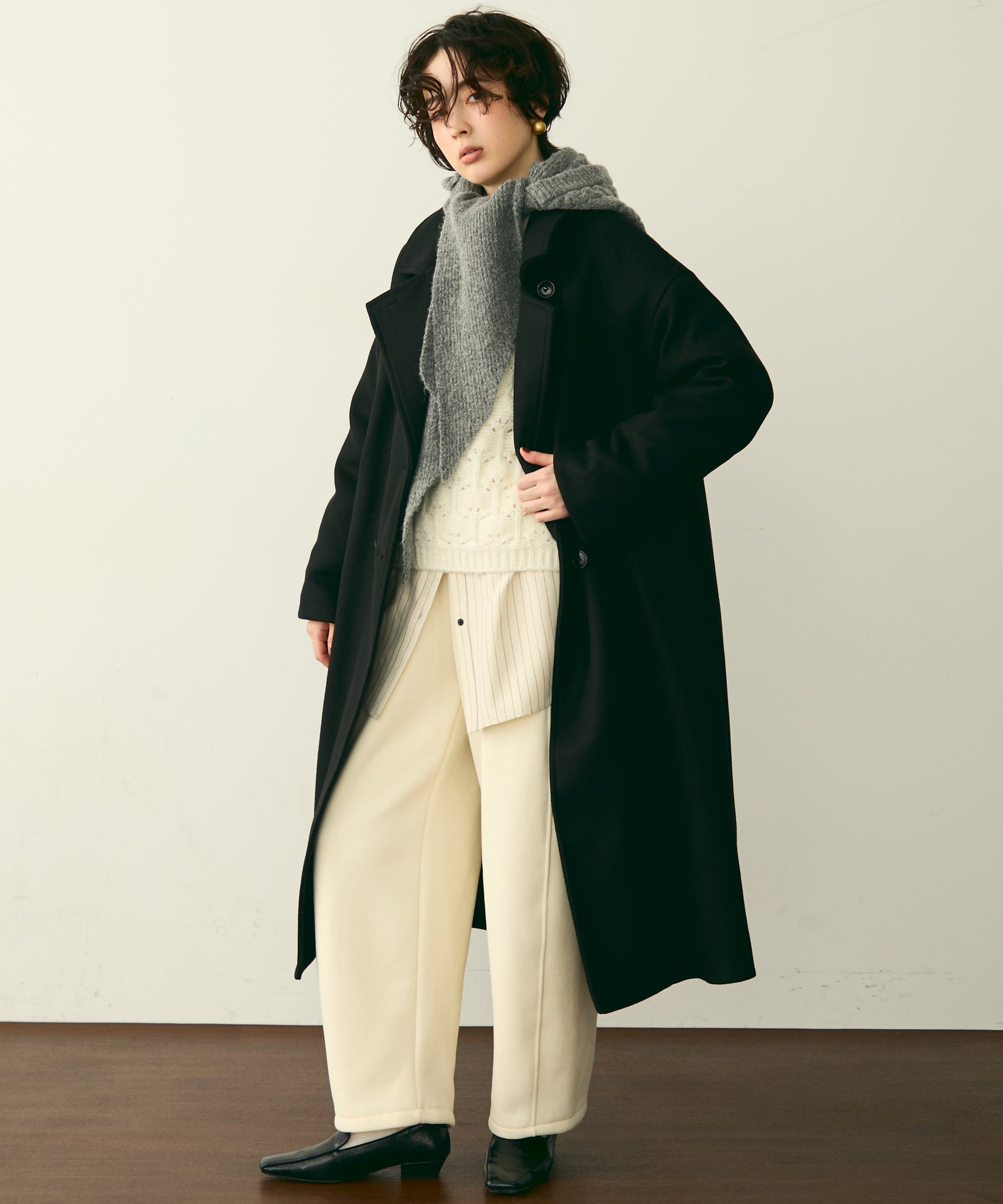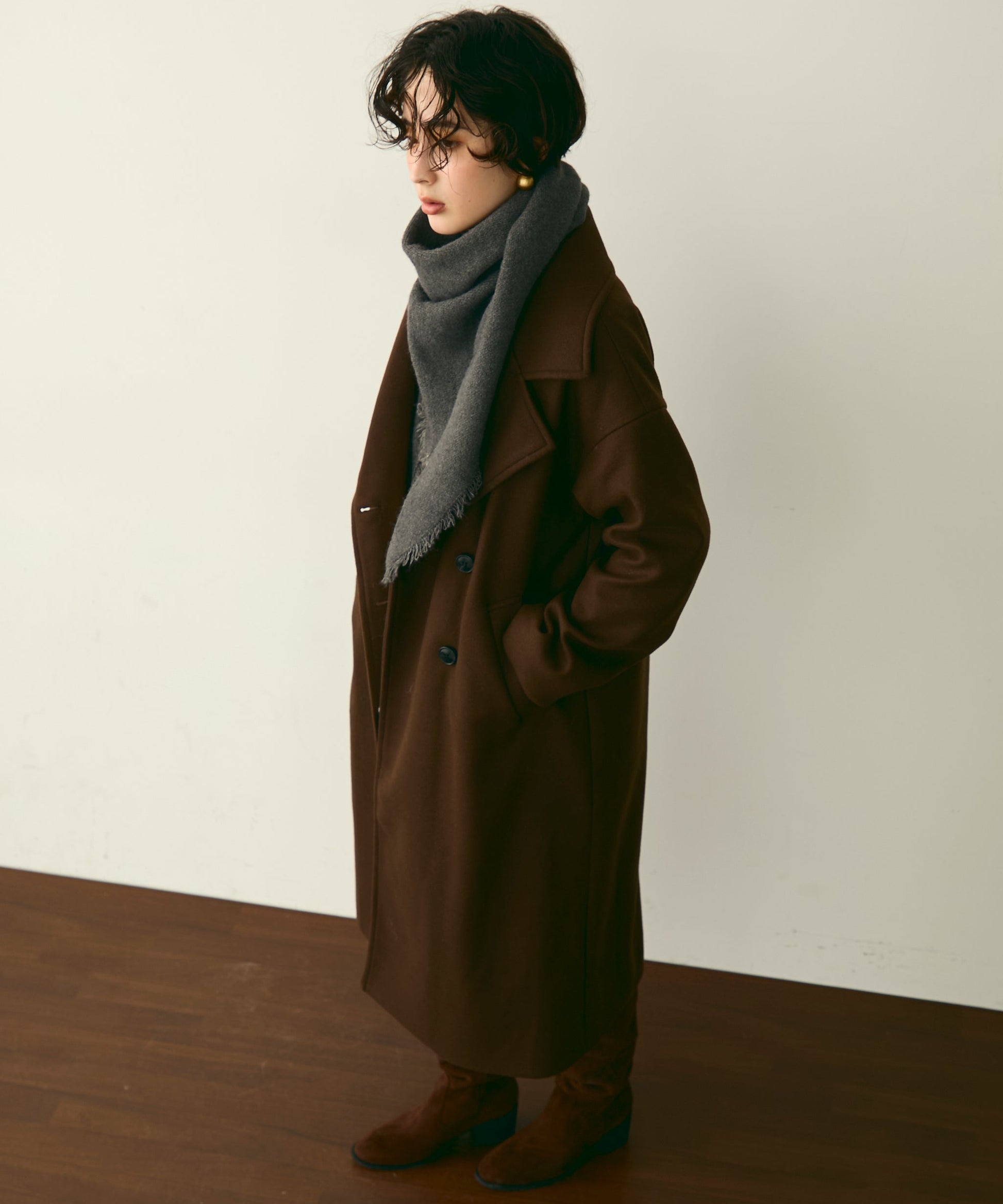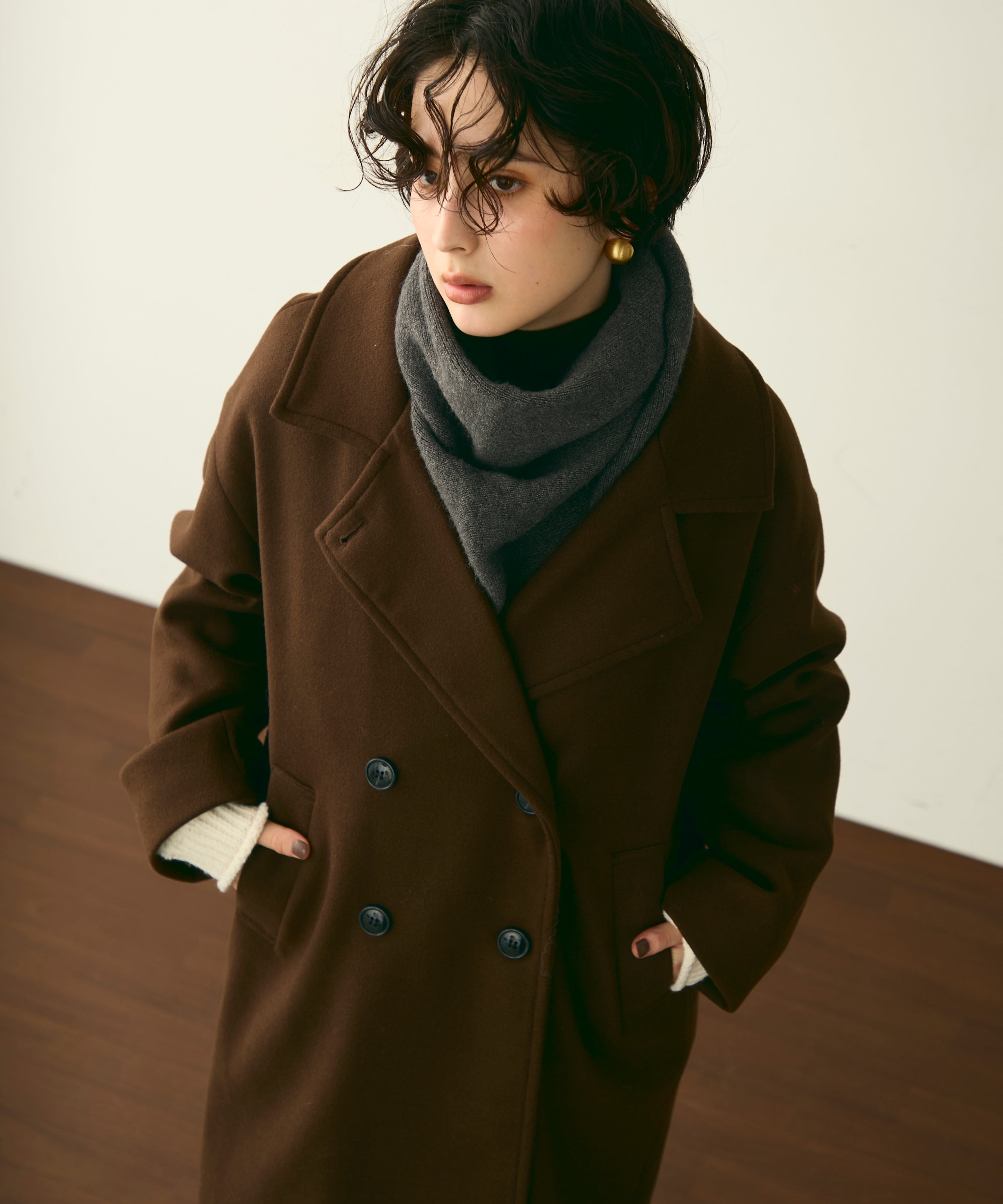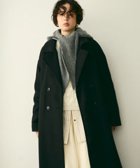 上品なフェイクウール素材を使用した、クラシカルなダブルボタンのロングコート。