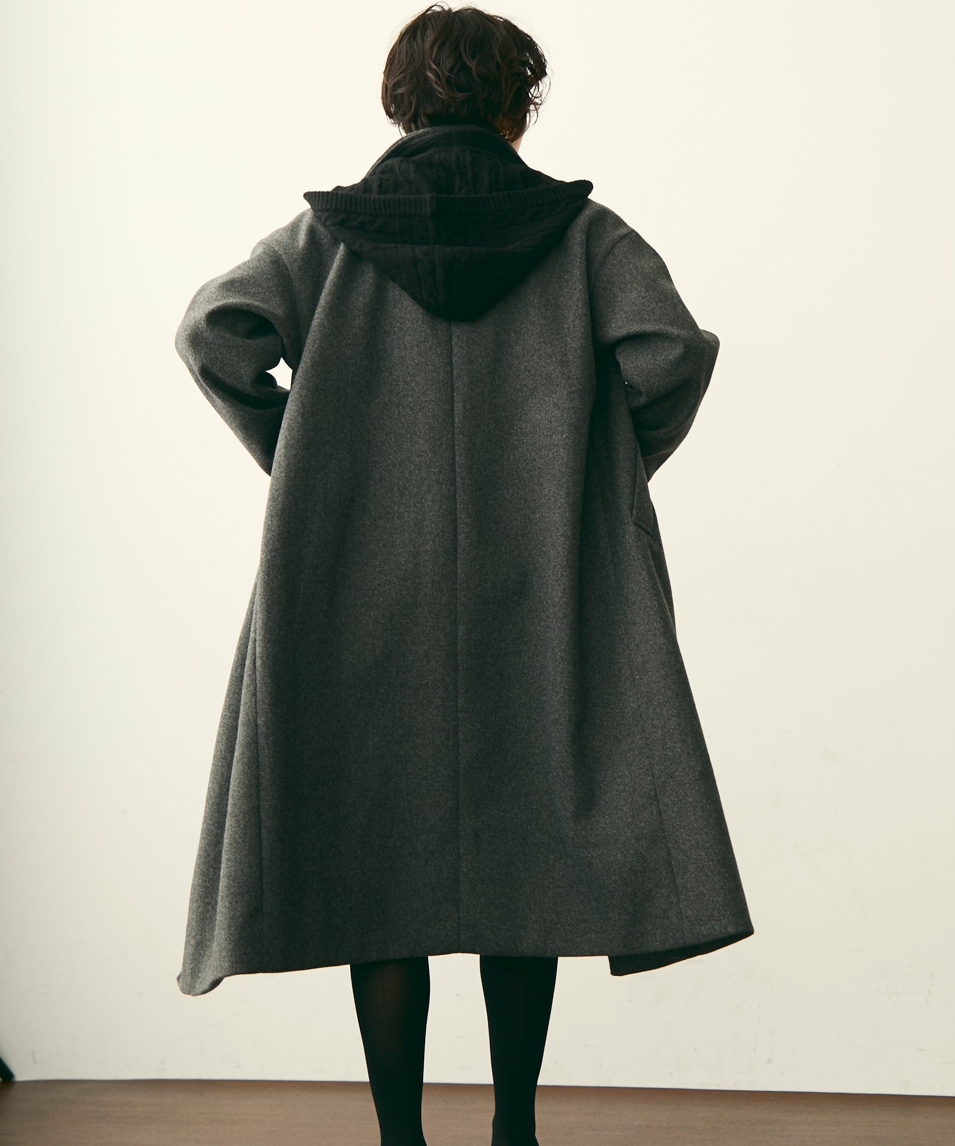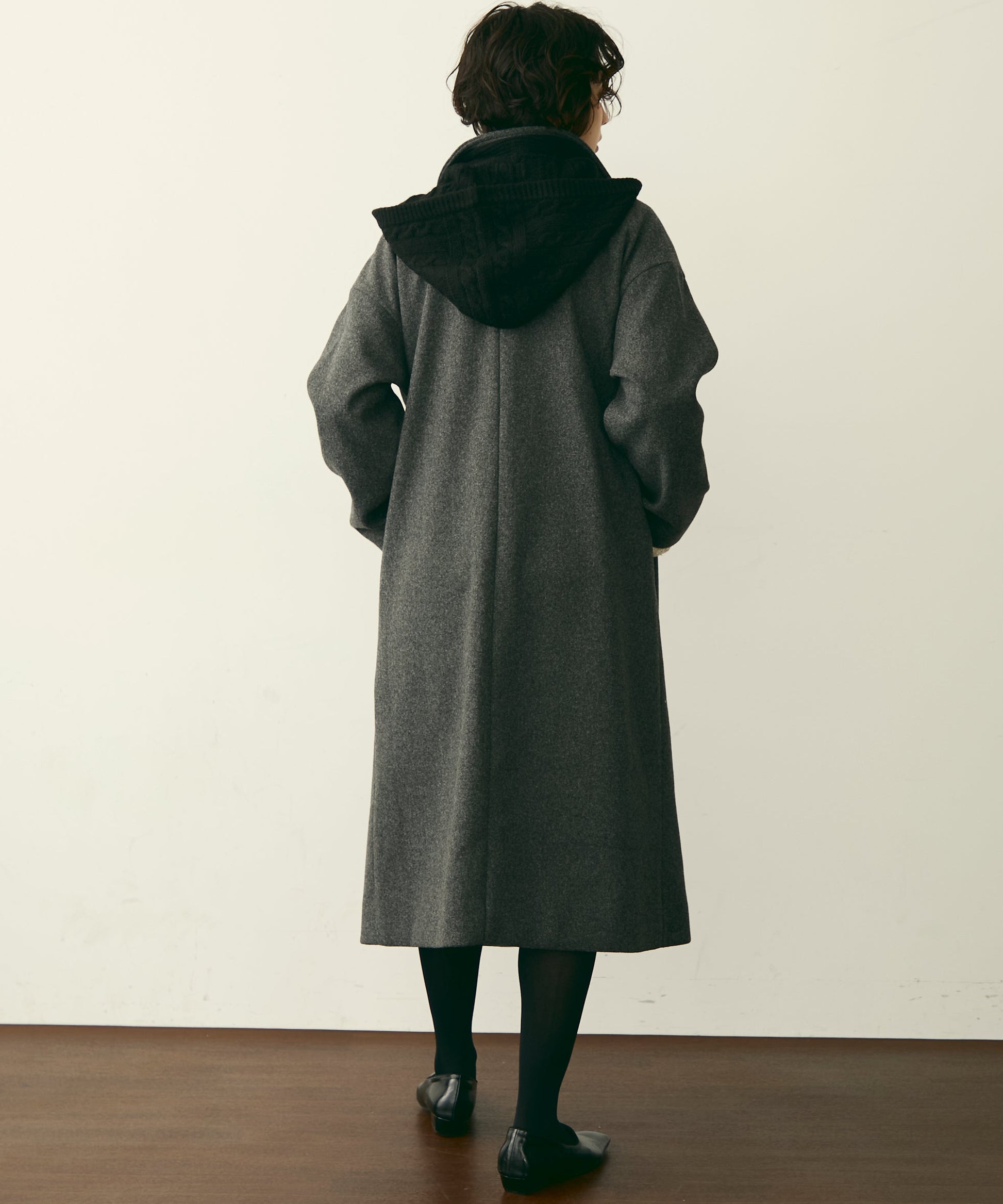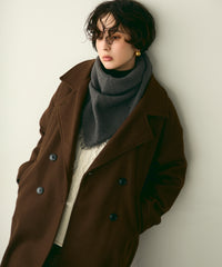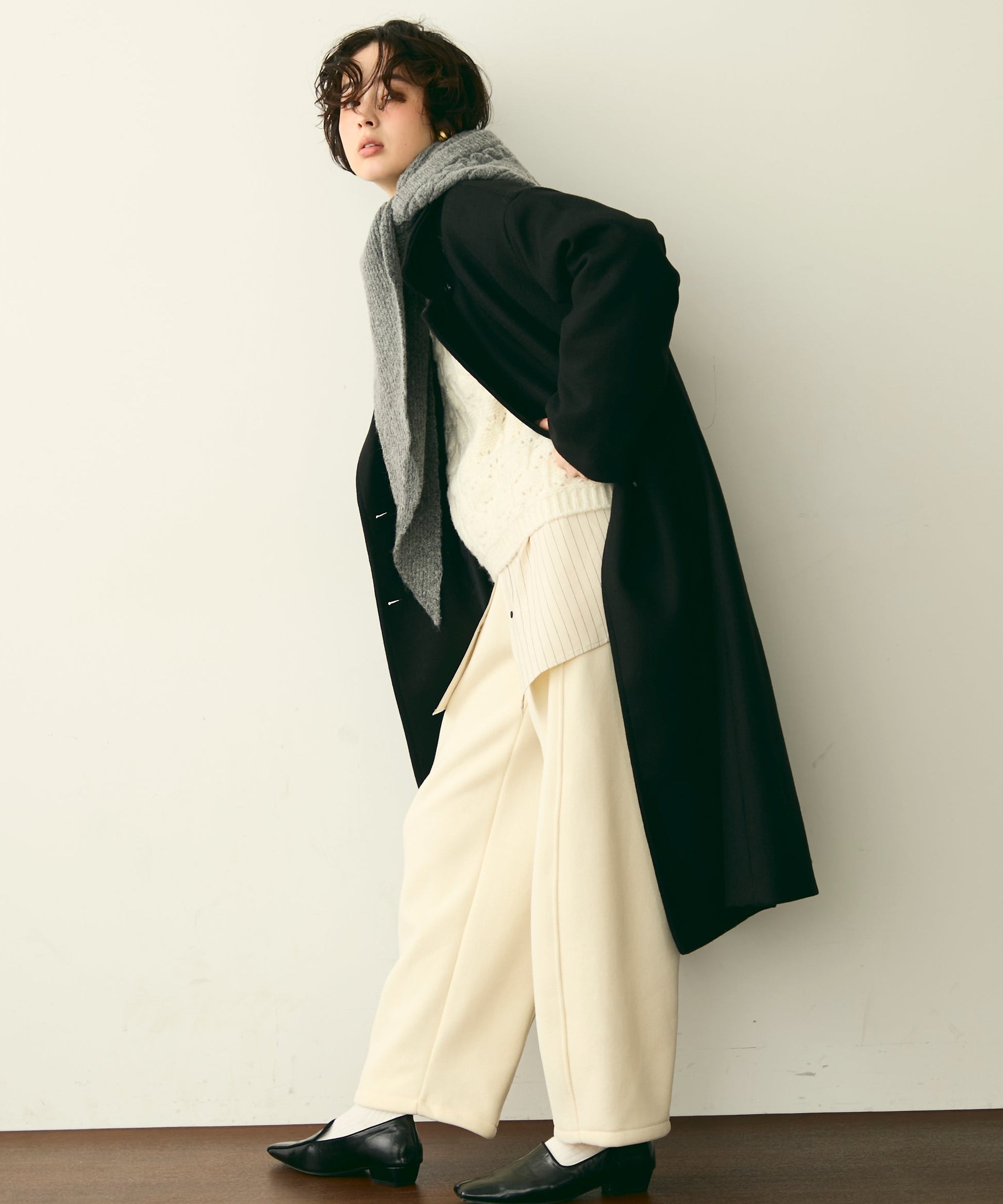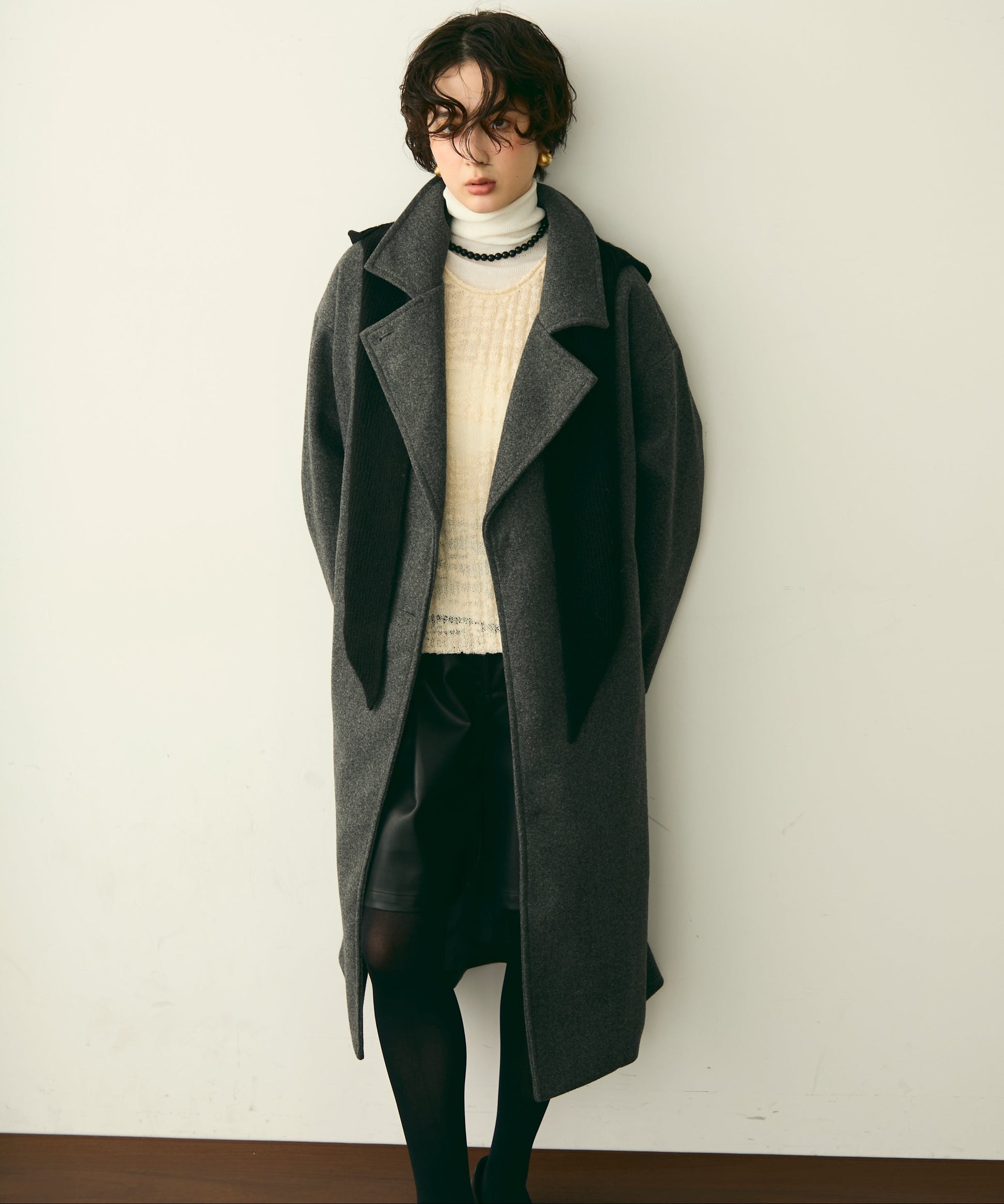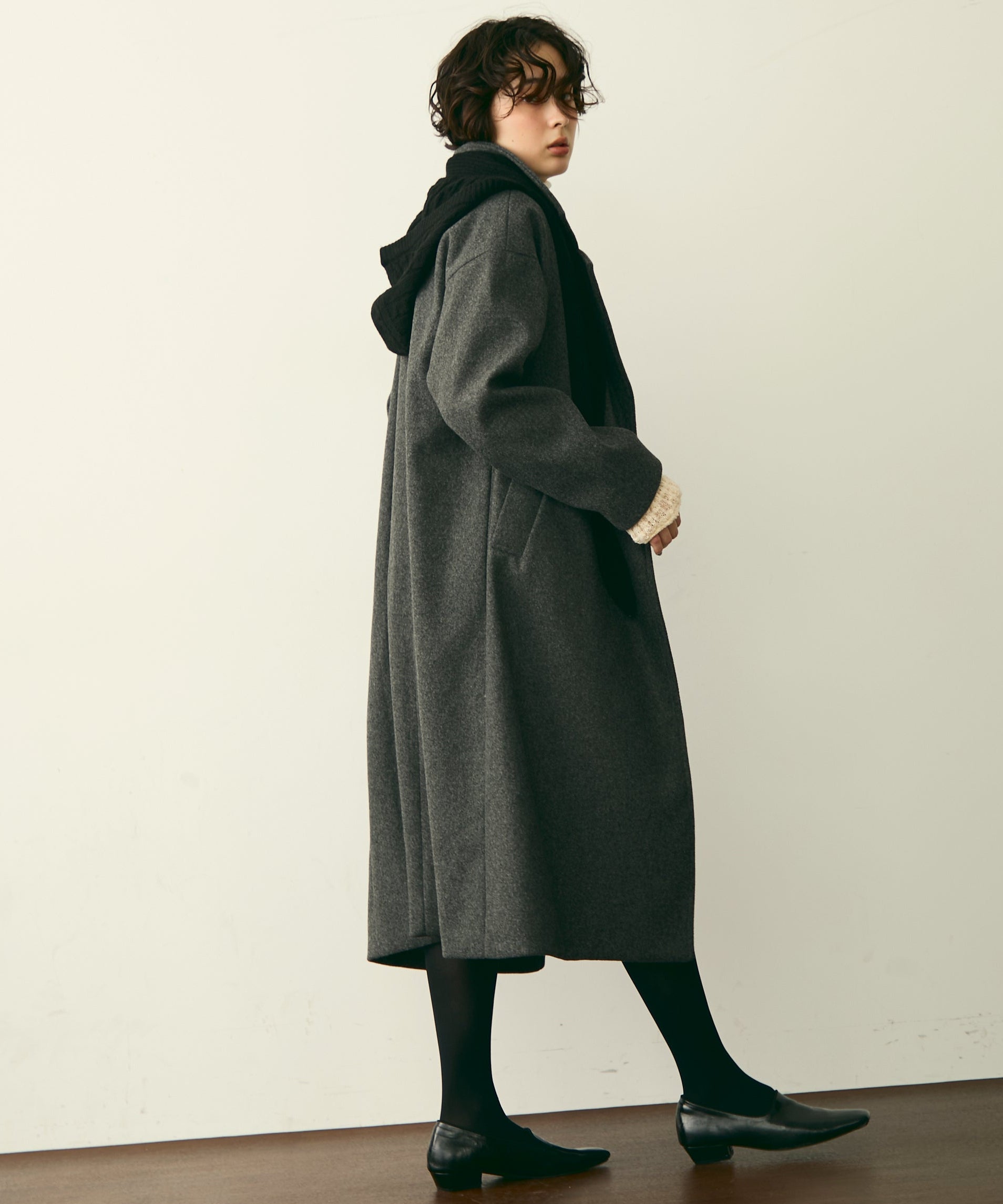上品なフェイクウール素材を使用した、クラシカルなダブルボタンのロングコート。