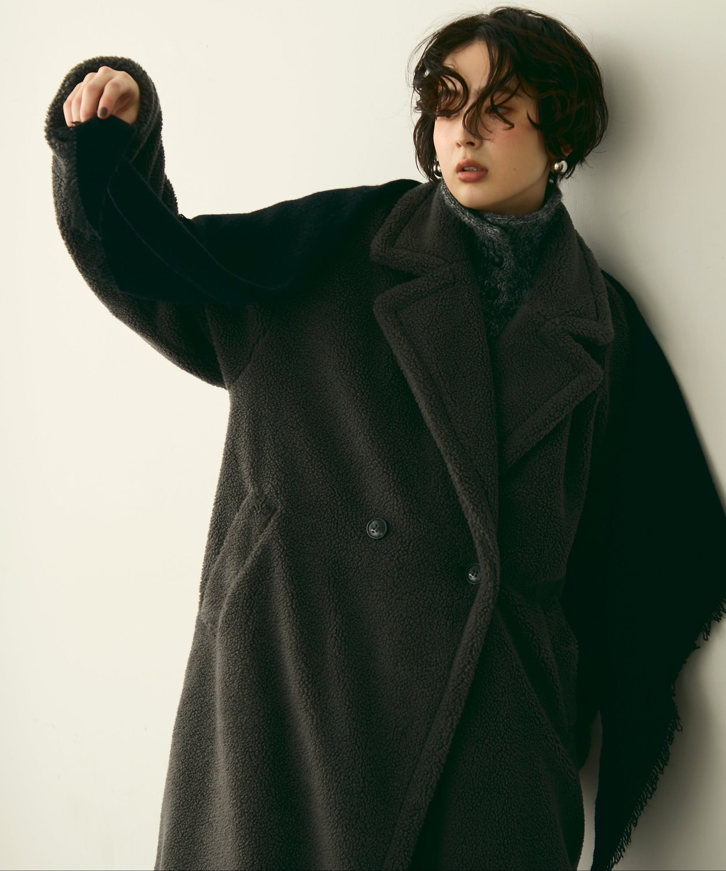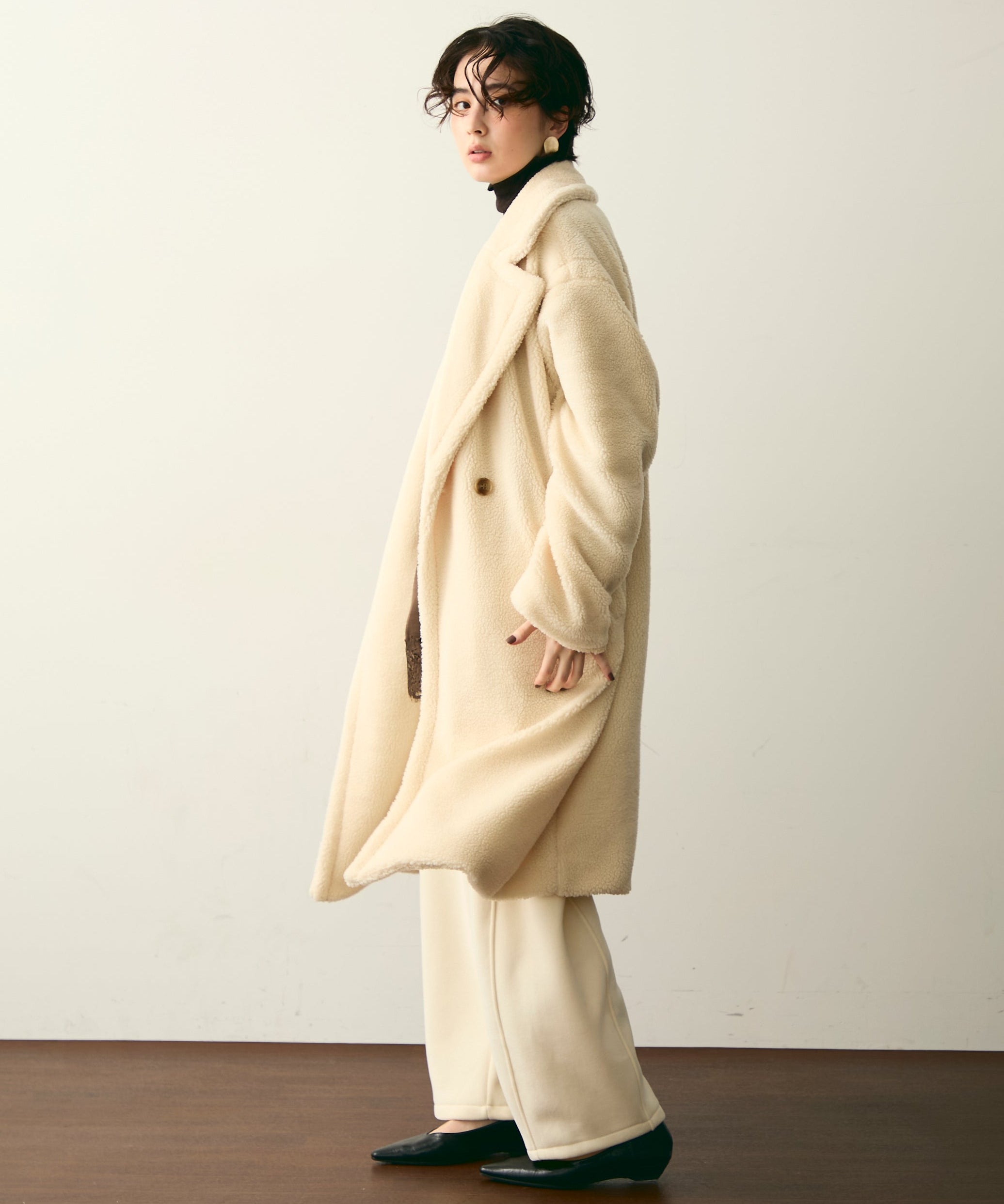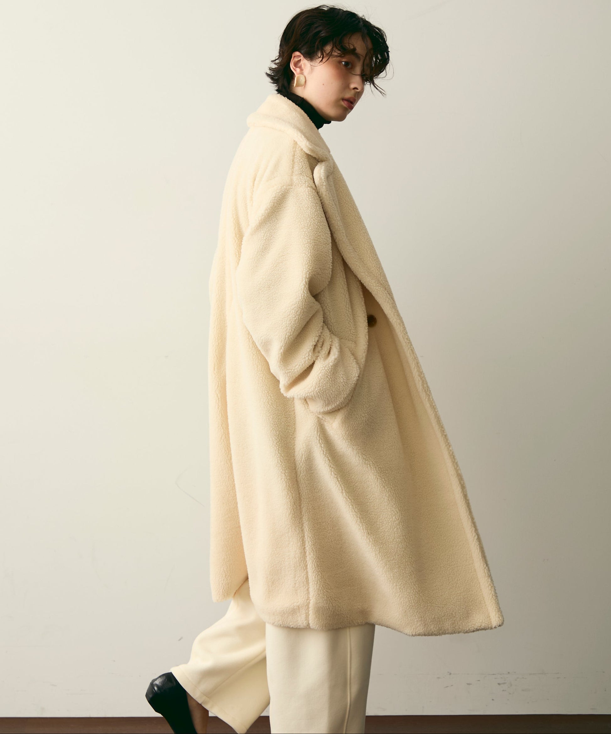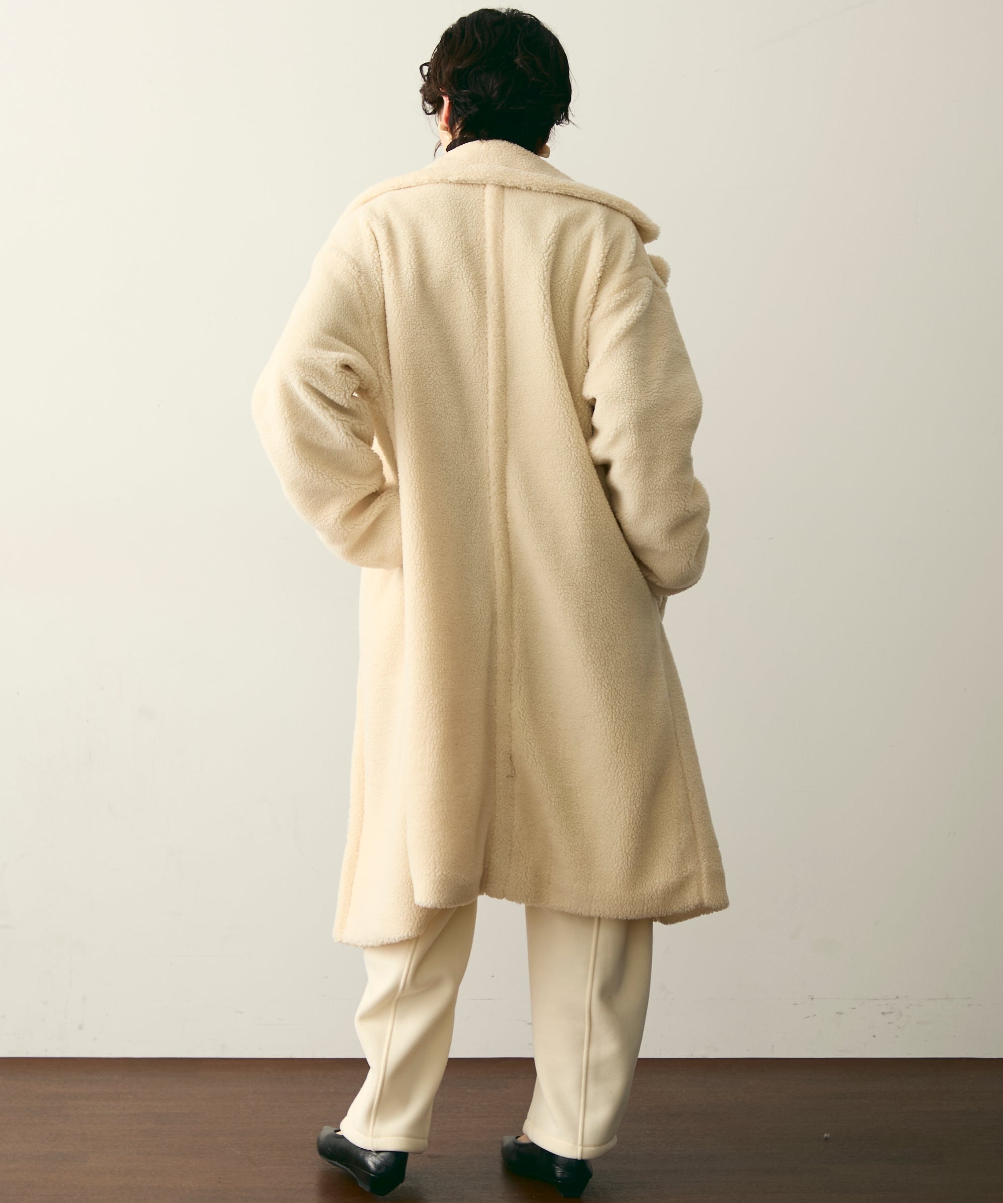 ふんわりとしたボア素材が季節感たっぷりのダブルロングコート。ロング丈ながら軽やかな着心地で、羽織るだけでこなれ感を演出。クラシカルなダブルボタンが上品さをプラスし、カジュアルにもきれいめにもマッチします。ゆったりとしたシルエットで厚手のニットももたつかず、真冬まで活躍。