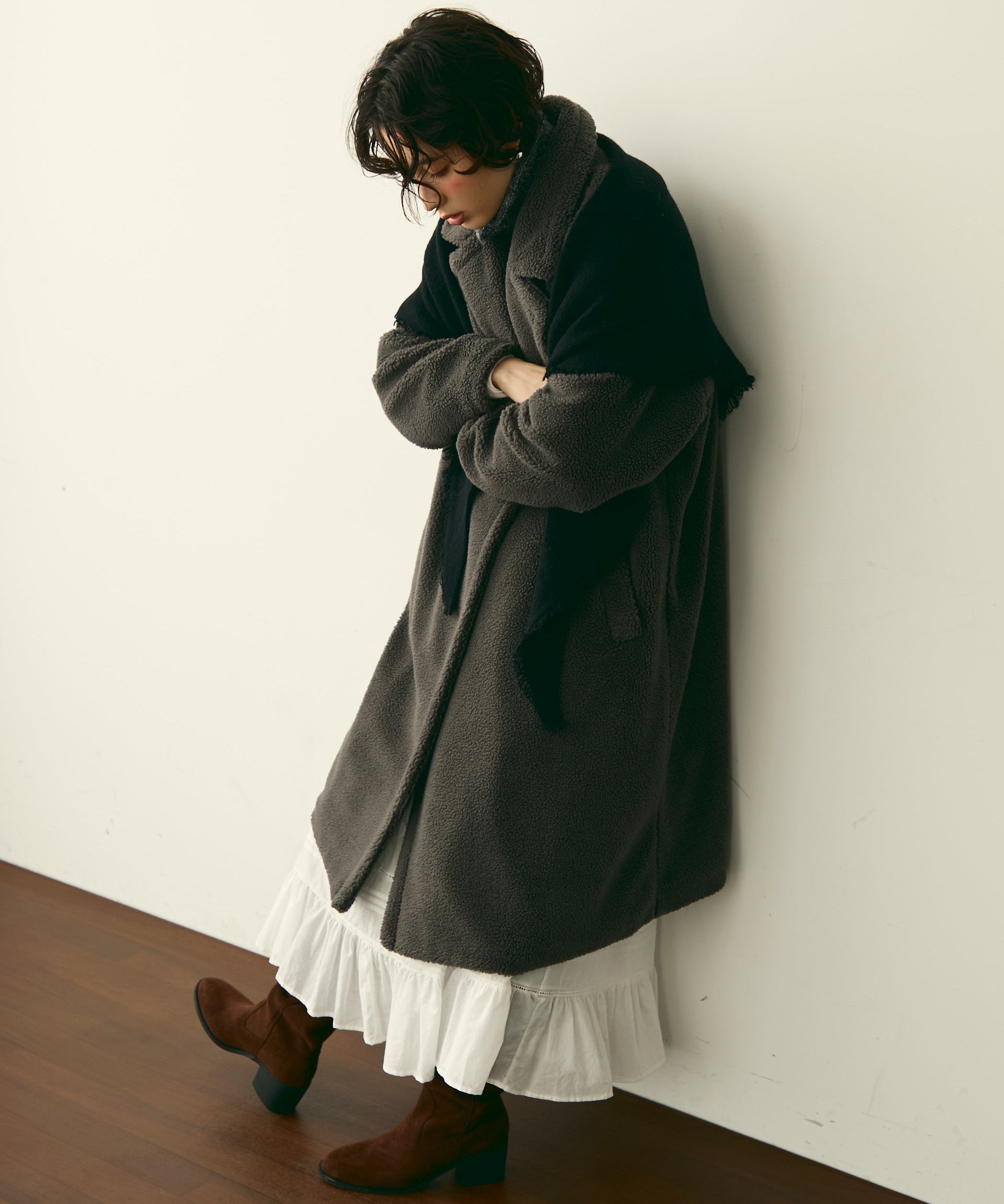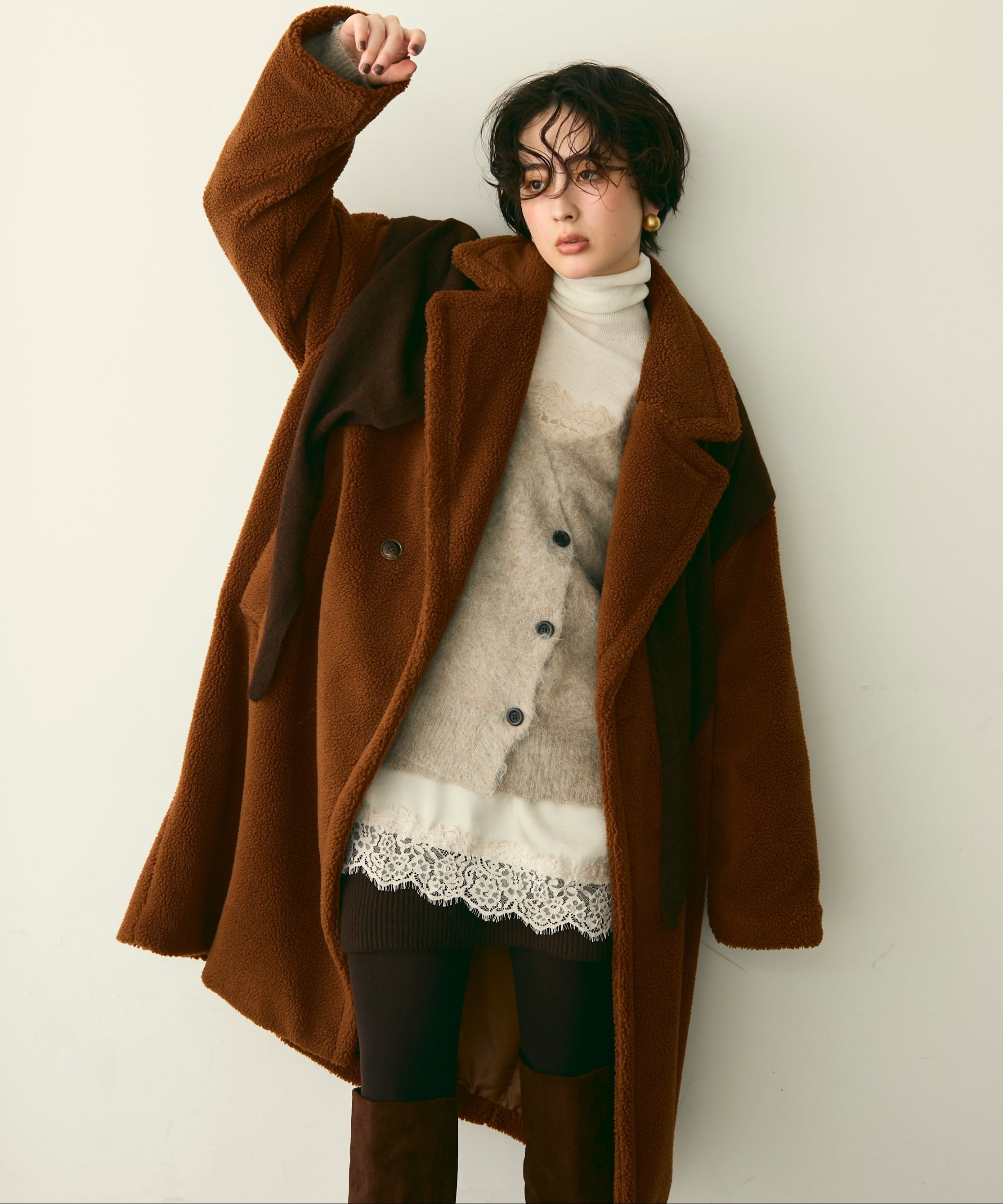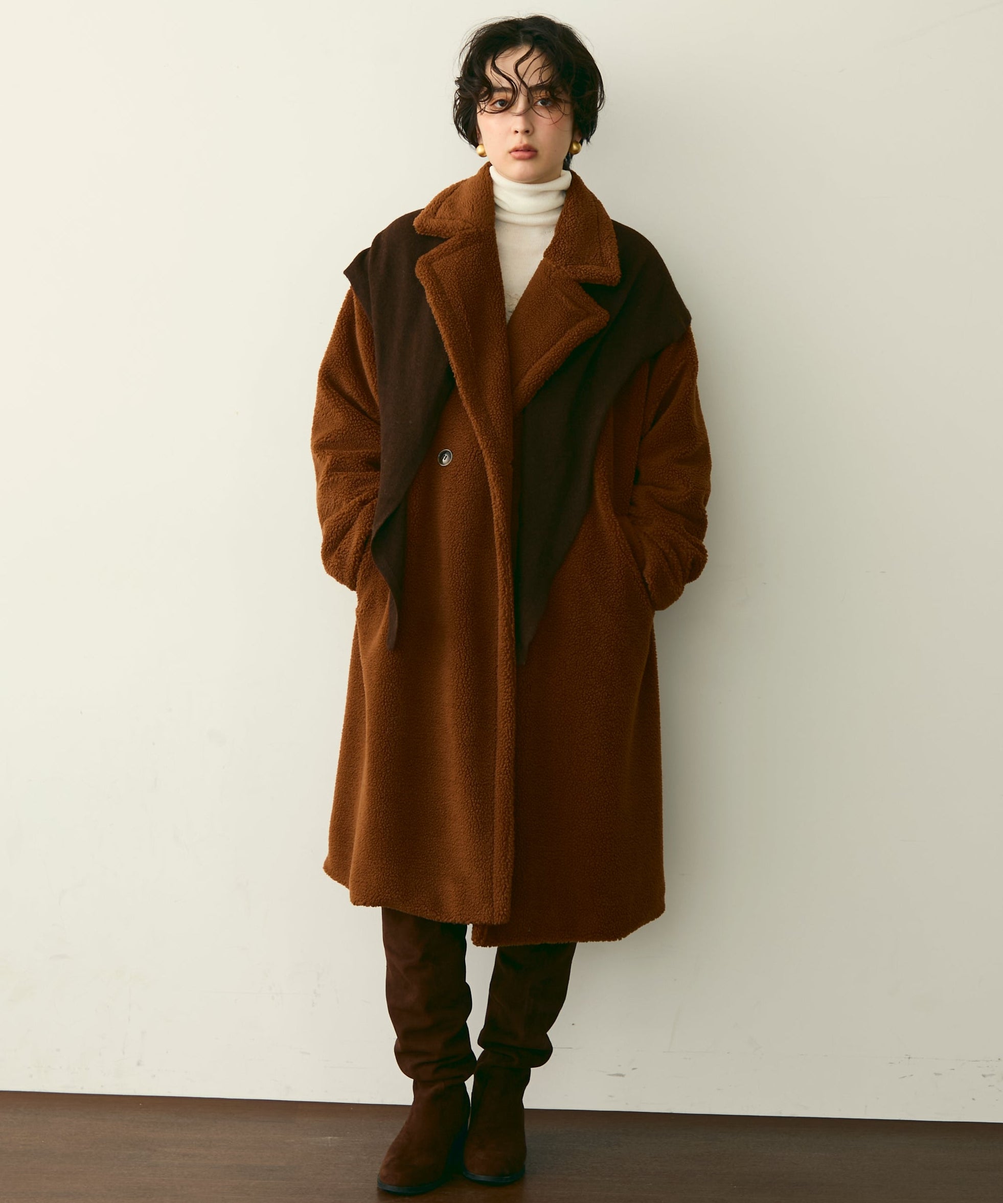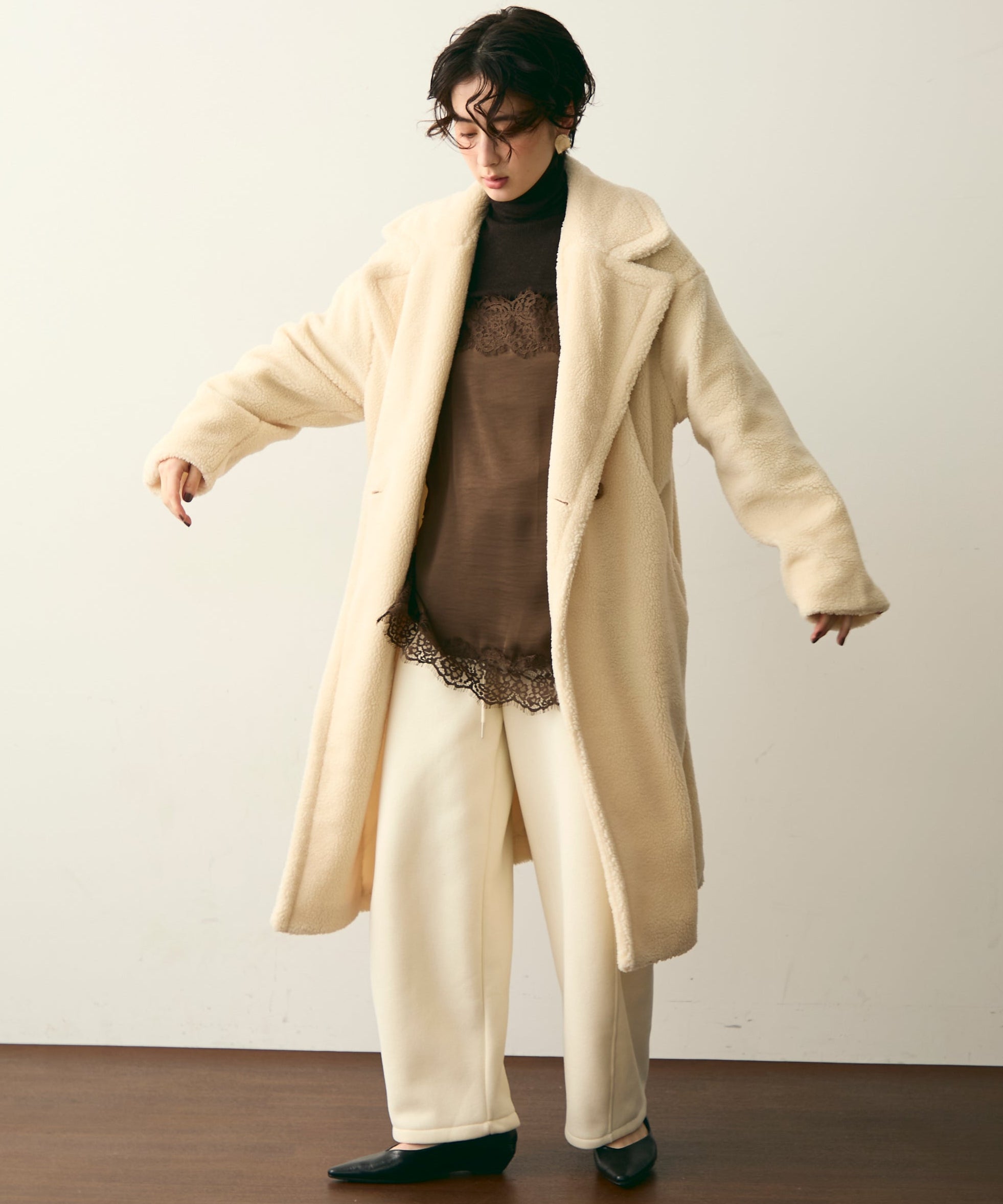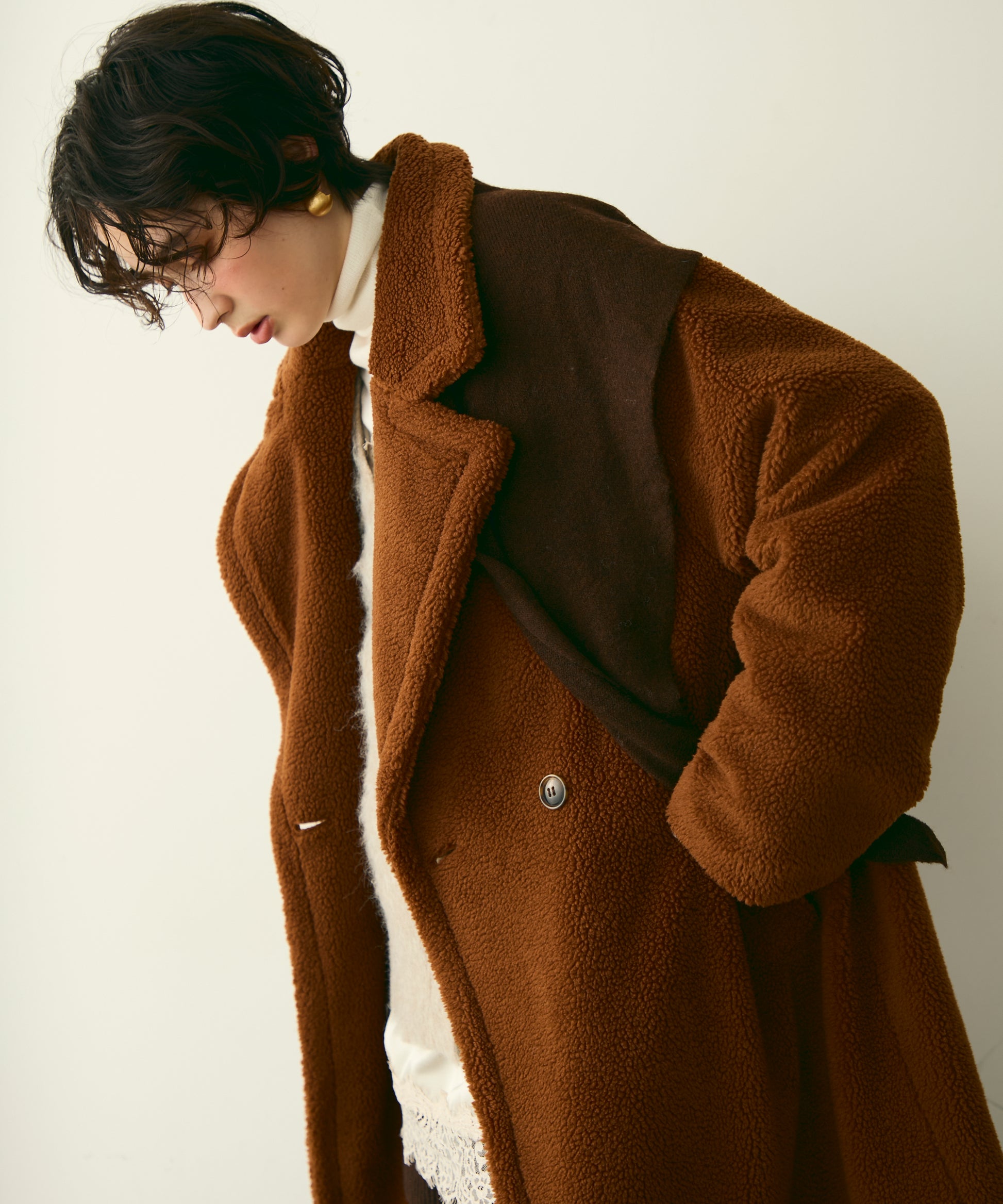 ふんわりとしたボア素材が季節感たっぷりのダブルロングコート。ロング丈ながら軽やかな着心地で、羽織るだけでこなれ感を演出。クラシカルなダブルボタンが上品さをプラスし、カジュアルにもきれいめにもマッチします。ゆったりとしたシルエットで厚手のニットももたつかず、真冬まで活躍。
