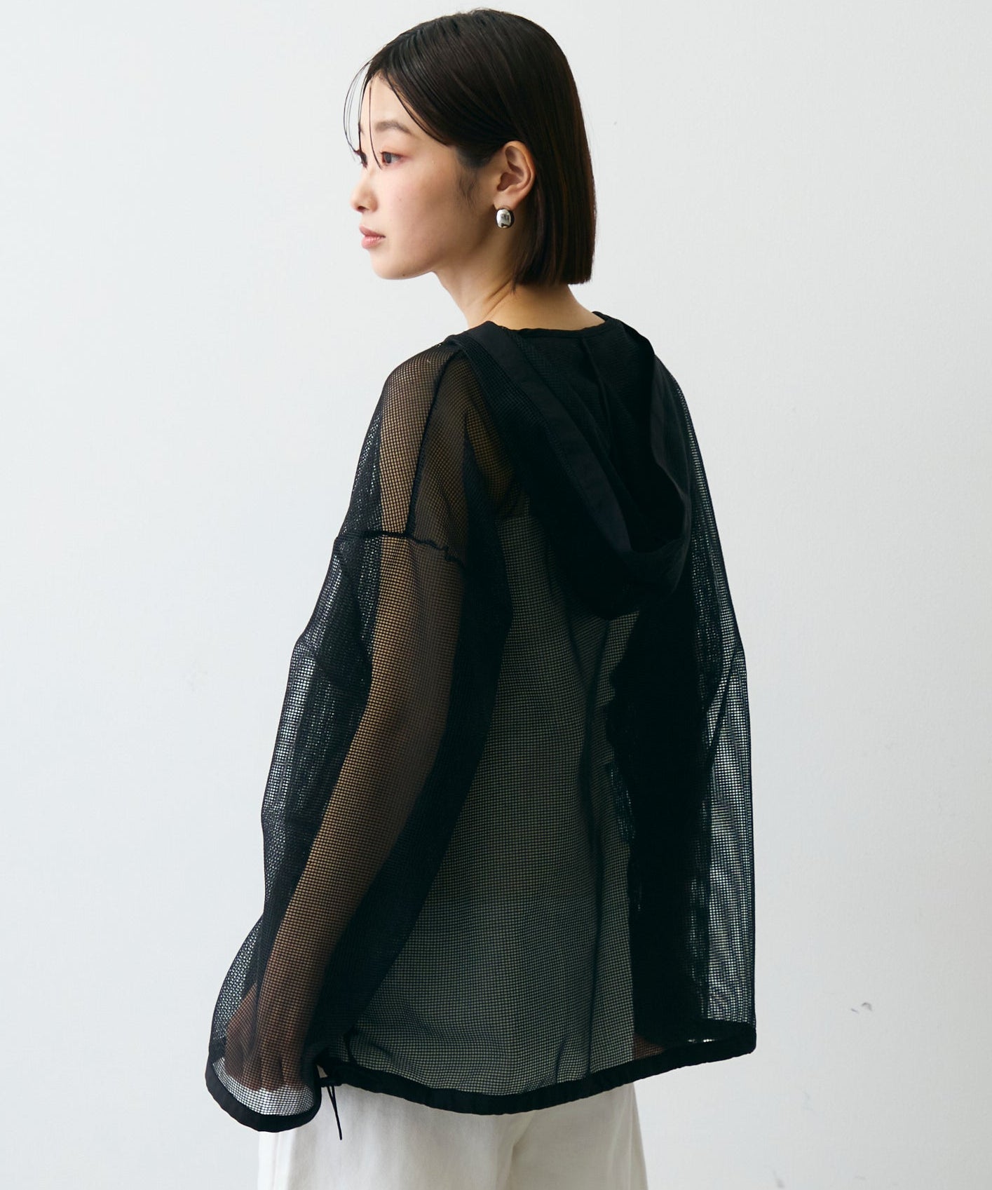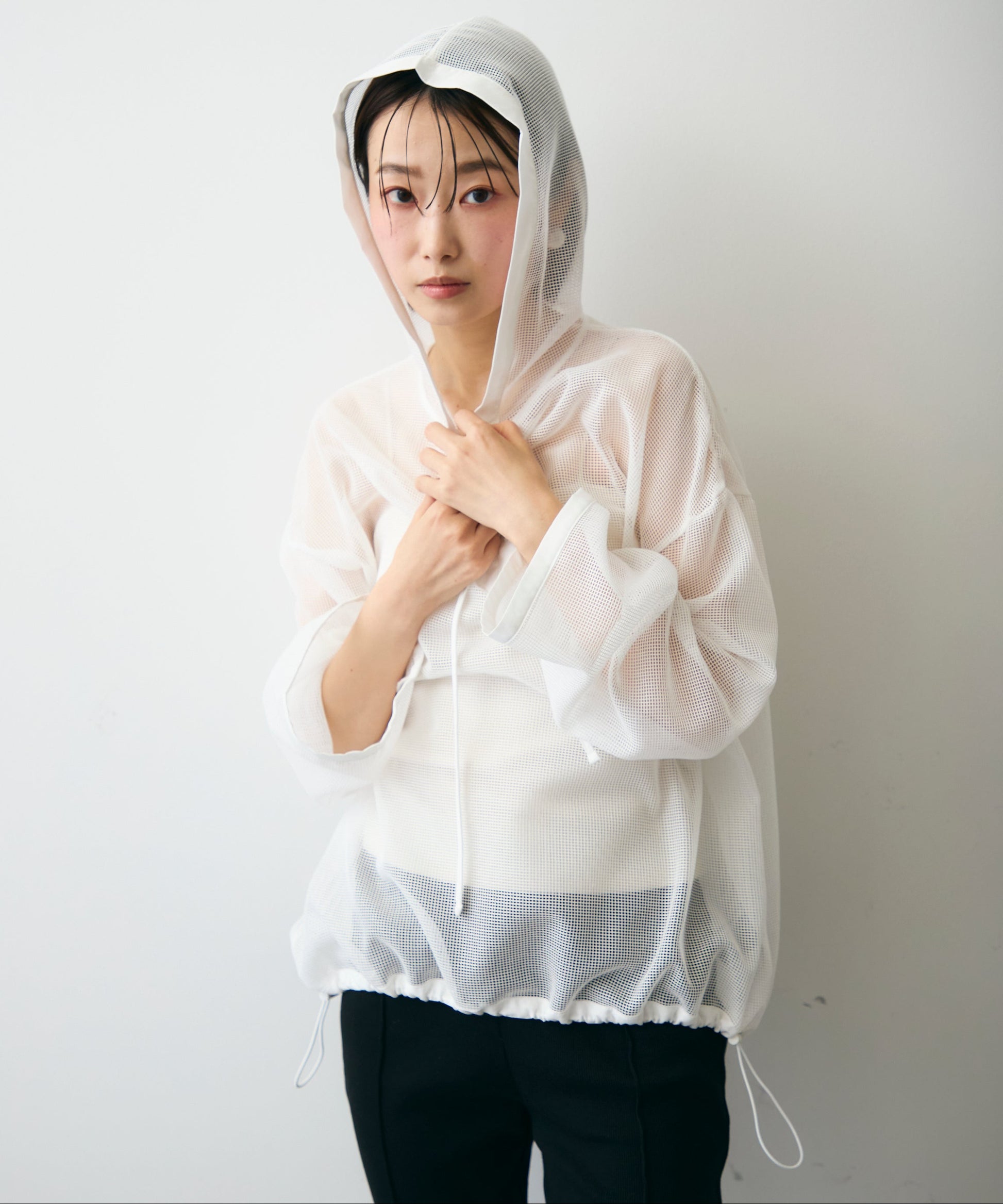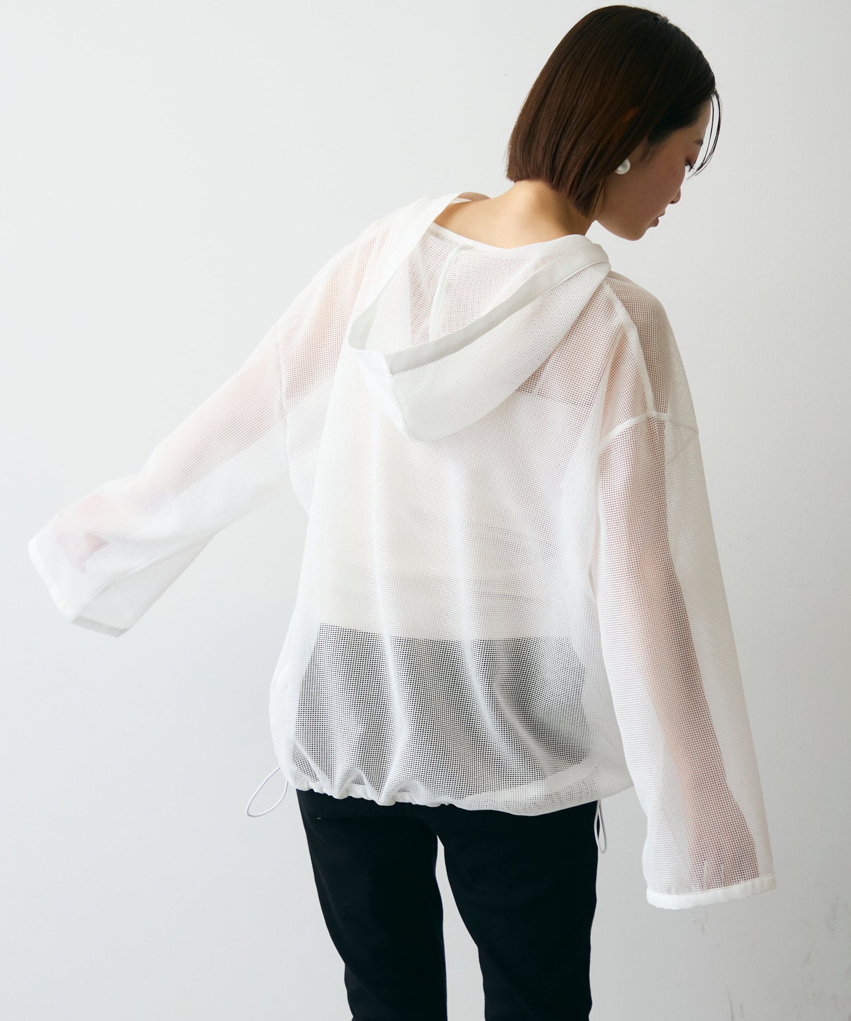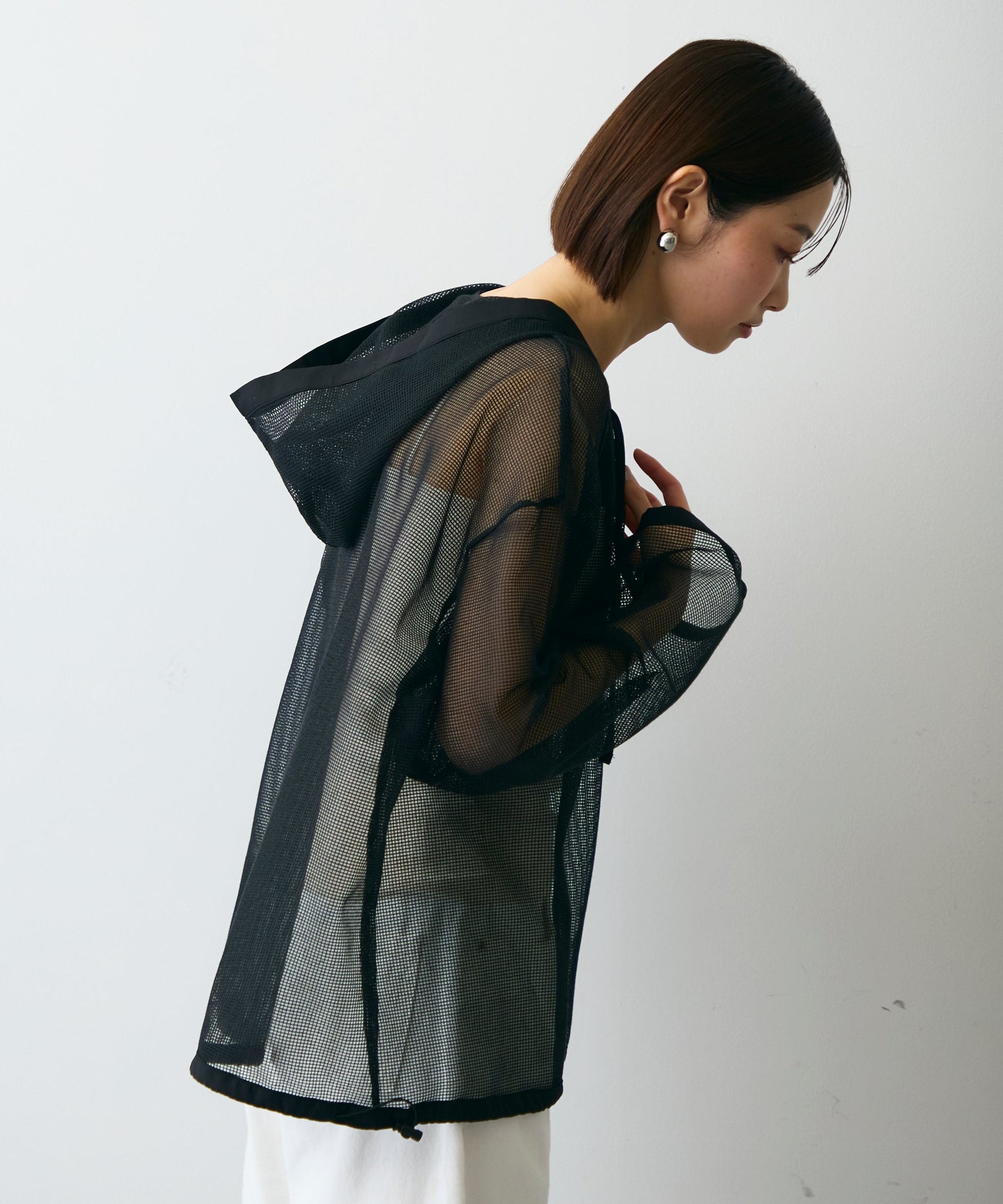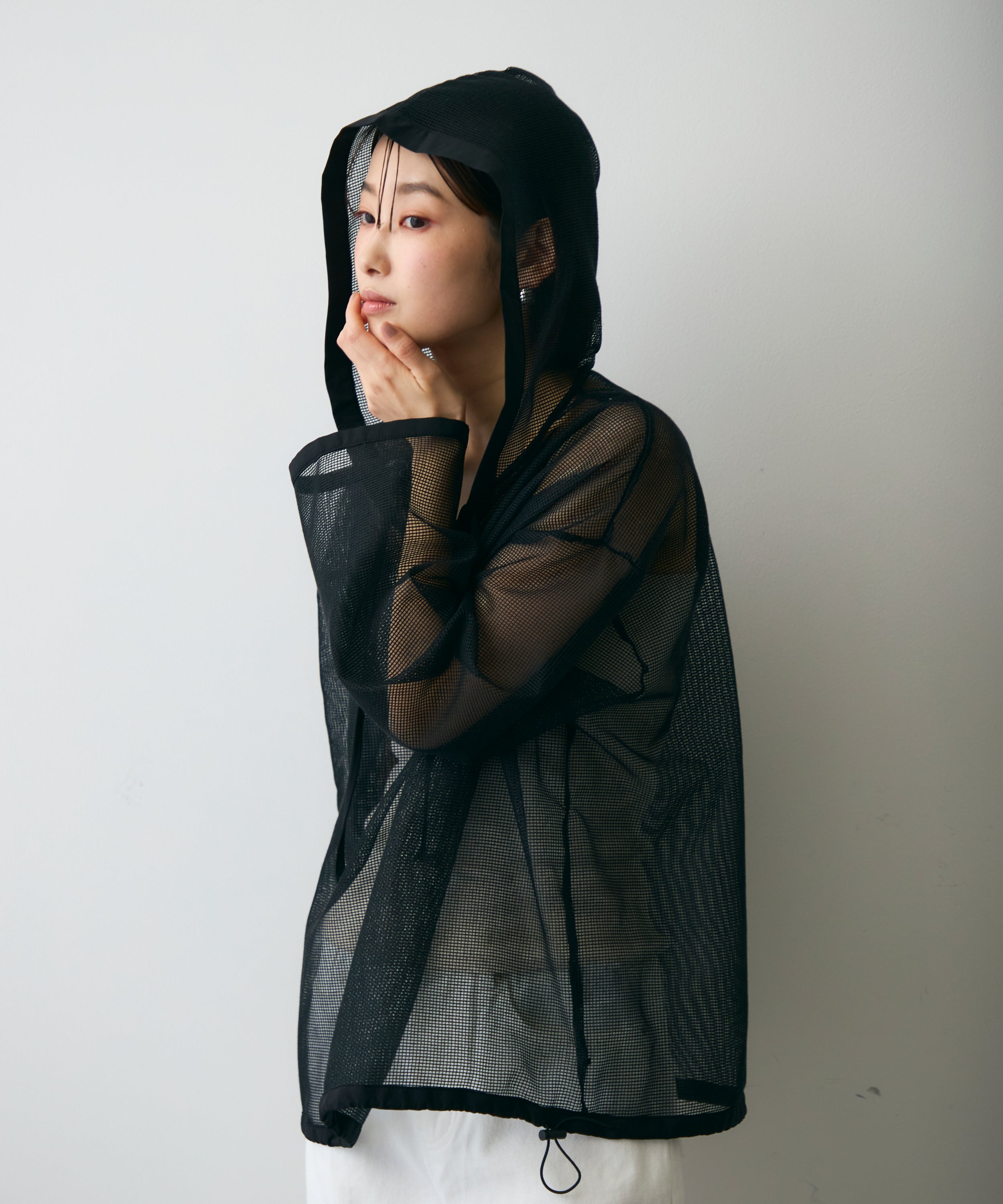 軽やかなメッシュ素材を使用した、抜け感たっぷりのフーディープルオーバー。程よい透け感がスタイリングに立体感をプラスし、レイヤードするだけで旬の雰囲気に。