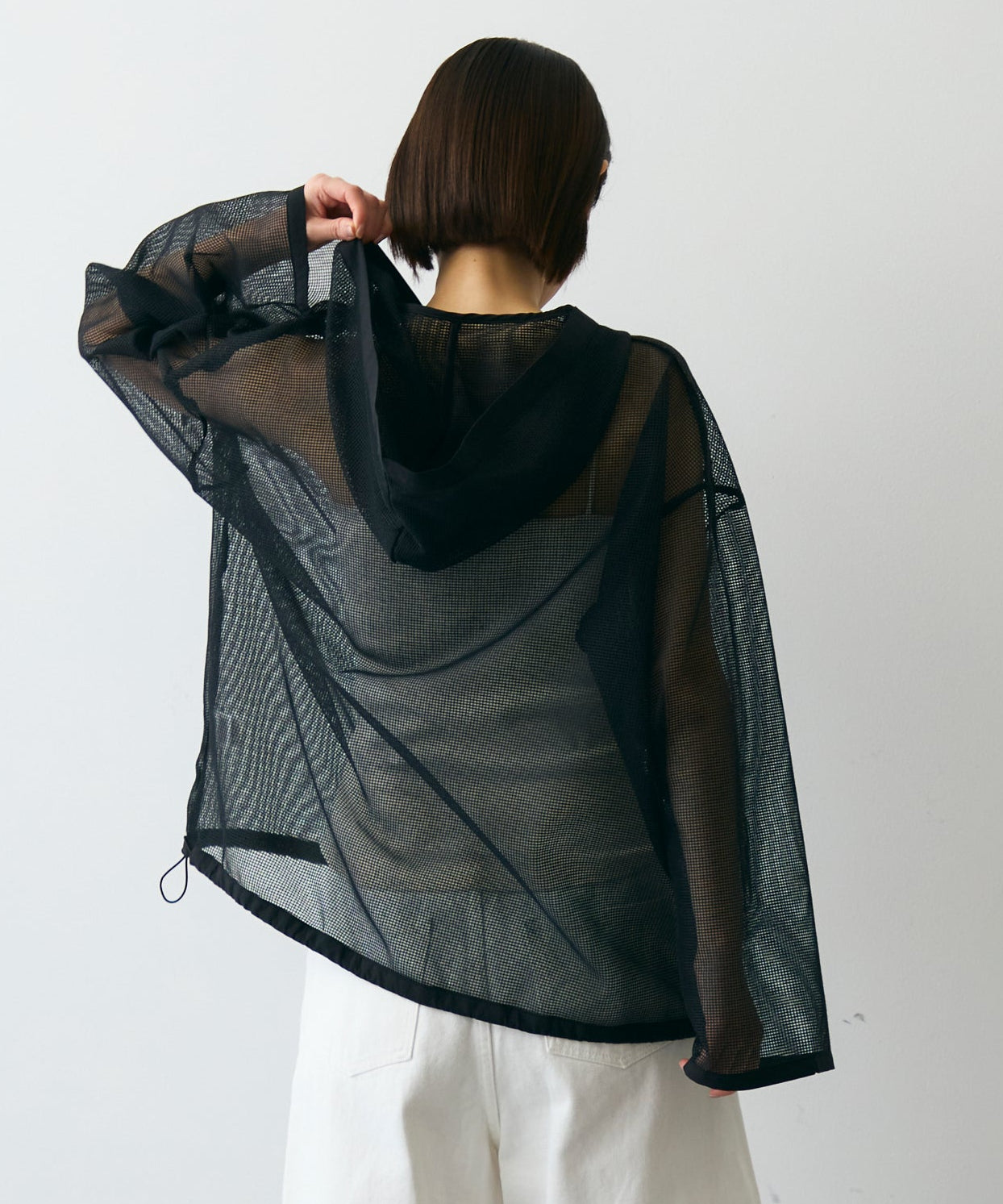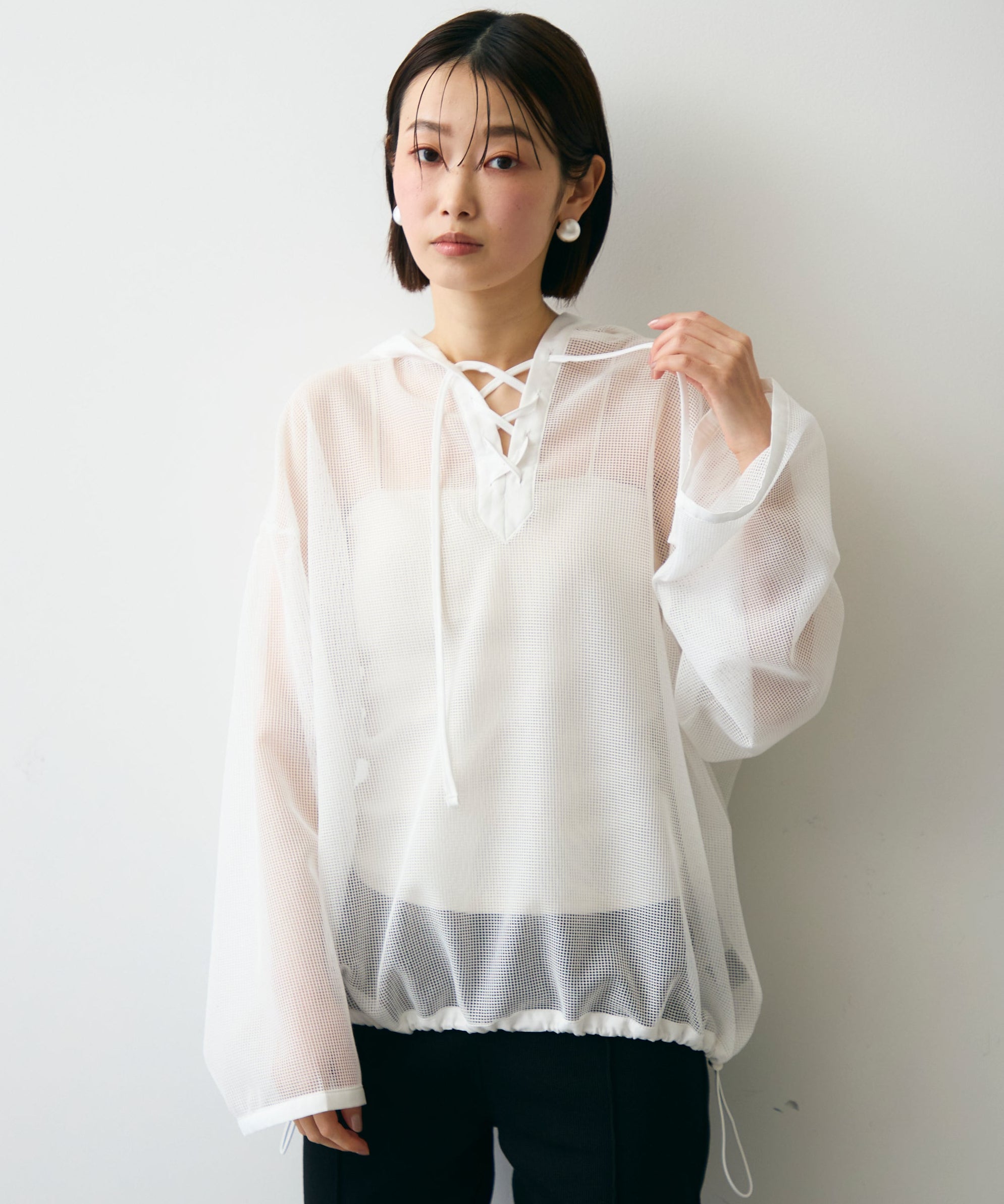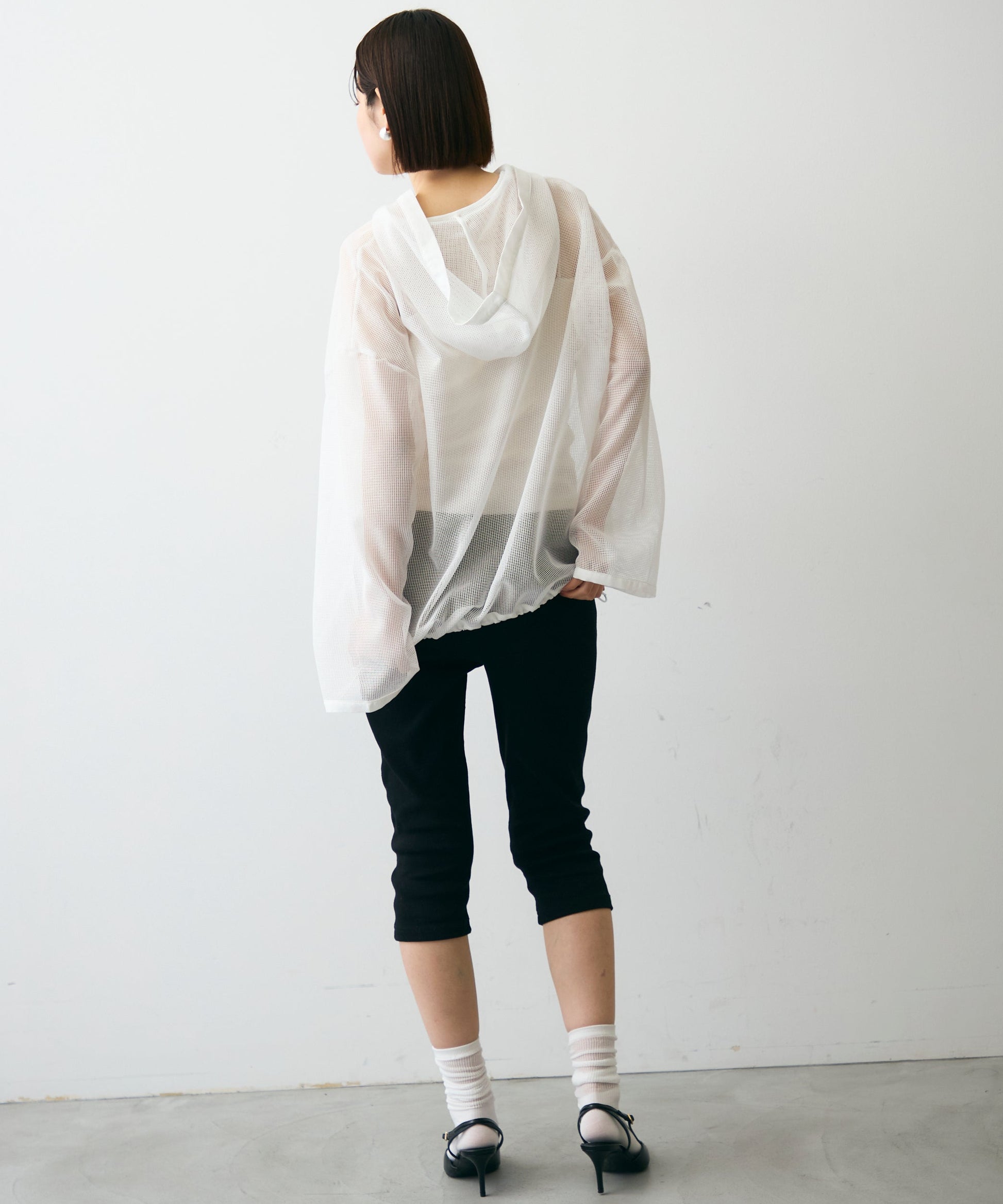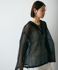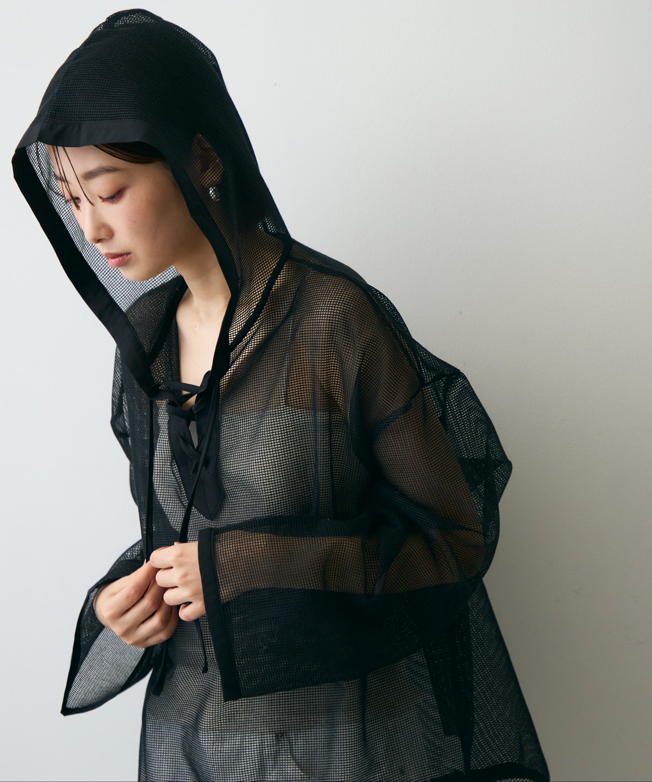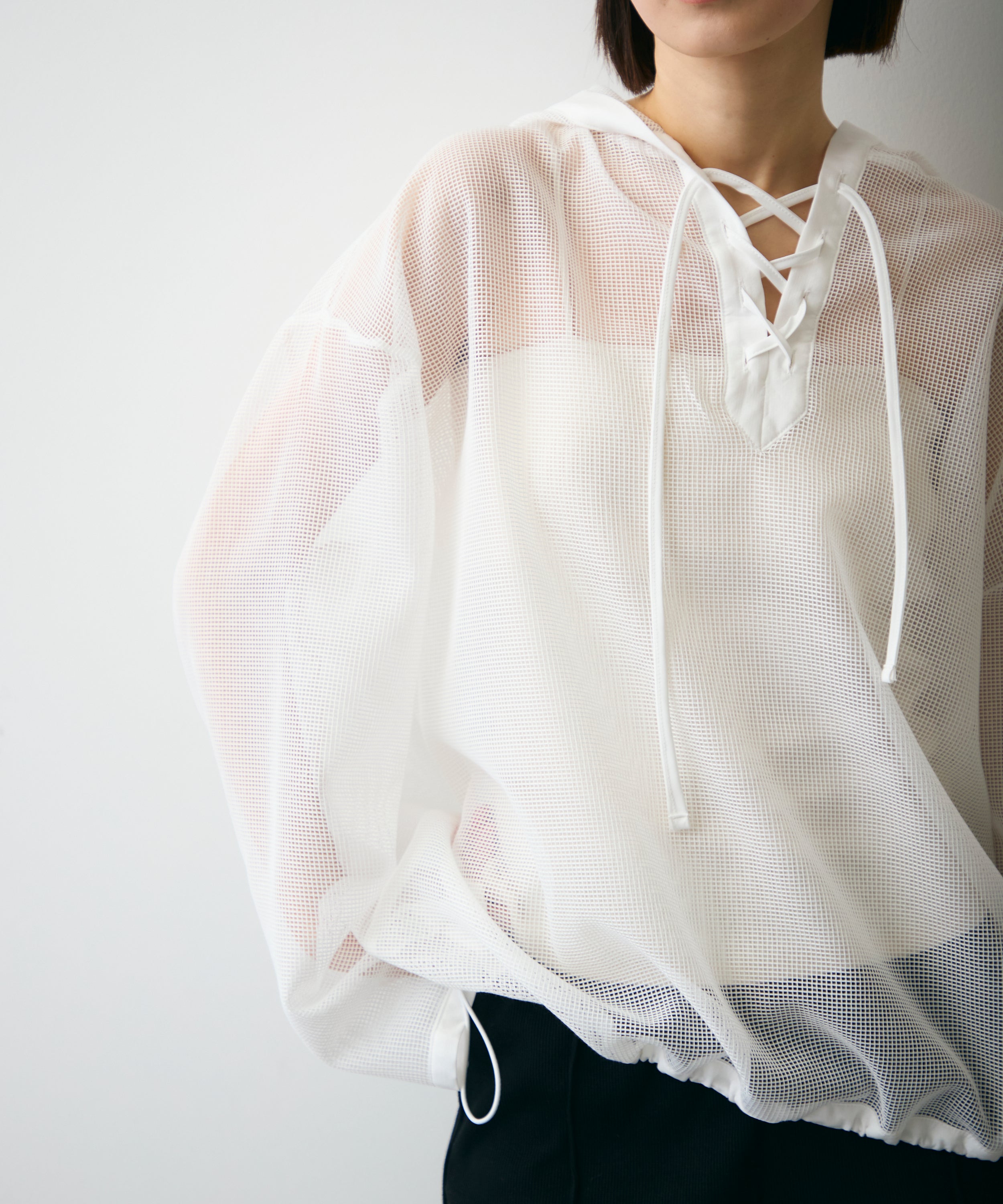 軽やかなメッシュ素材を使用した、抜け感たっぷりのフーディープルオーバー。程よい透け感がスタイリングに立体感をプラスし、レイヤードするだけで旬の雰囲気に。